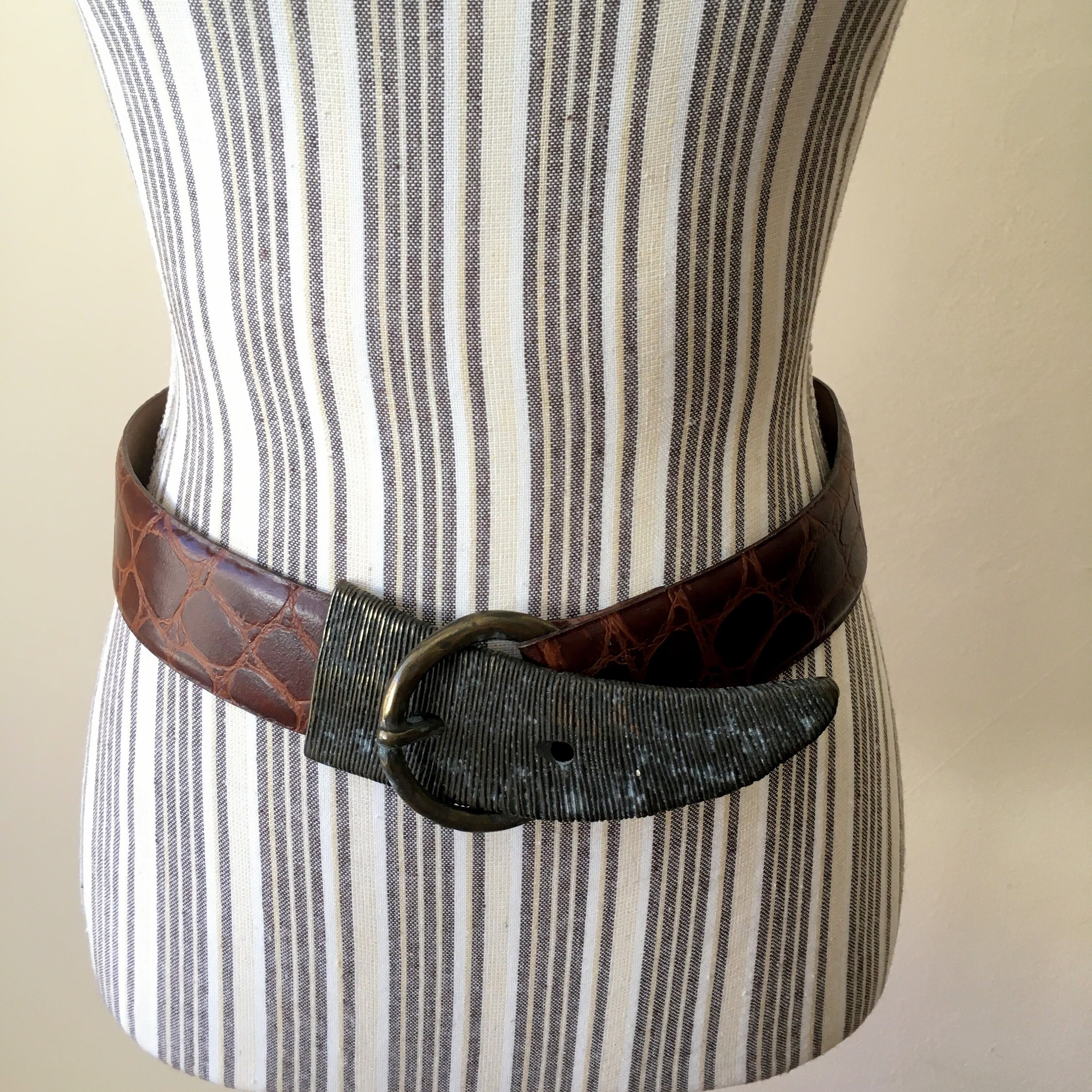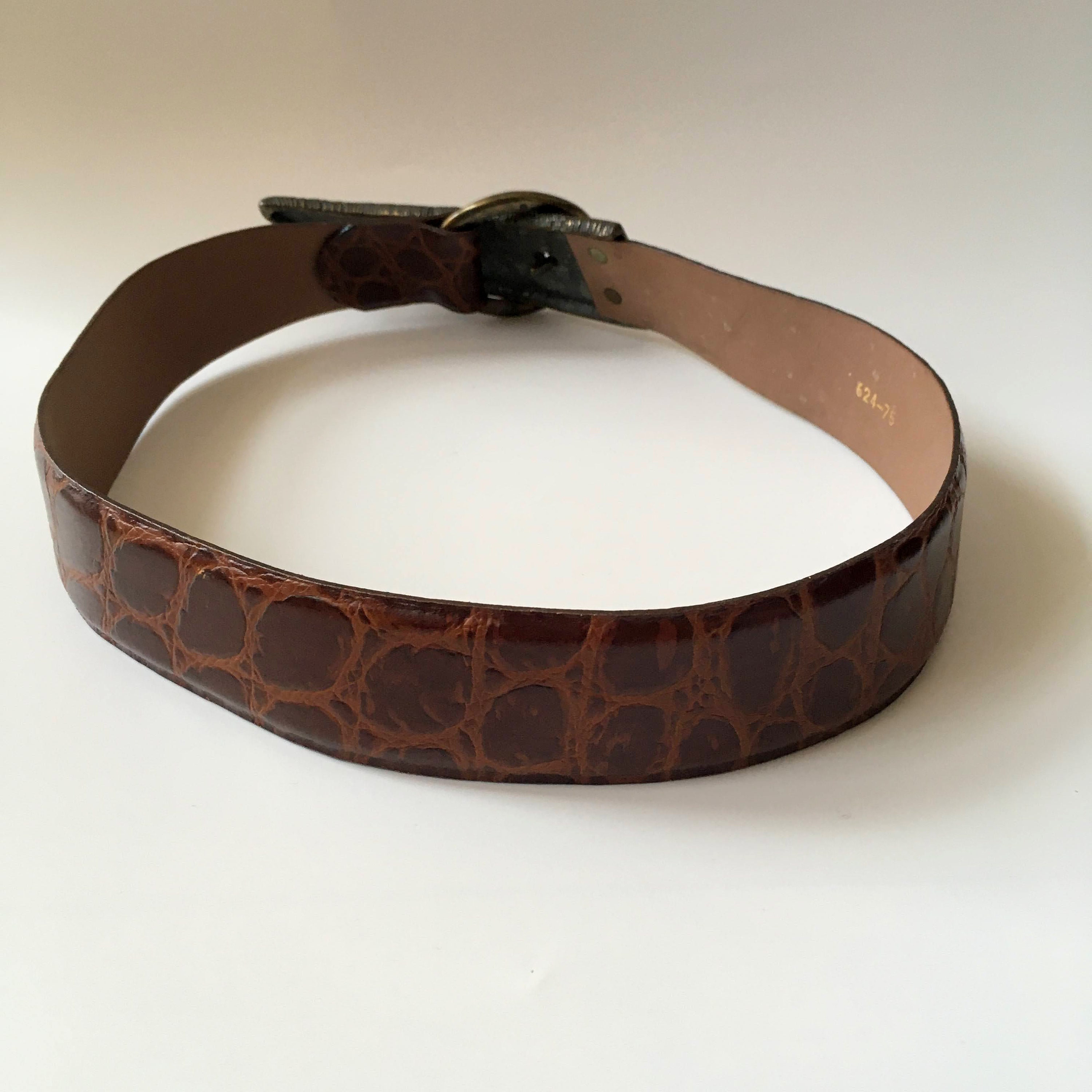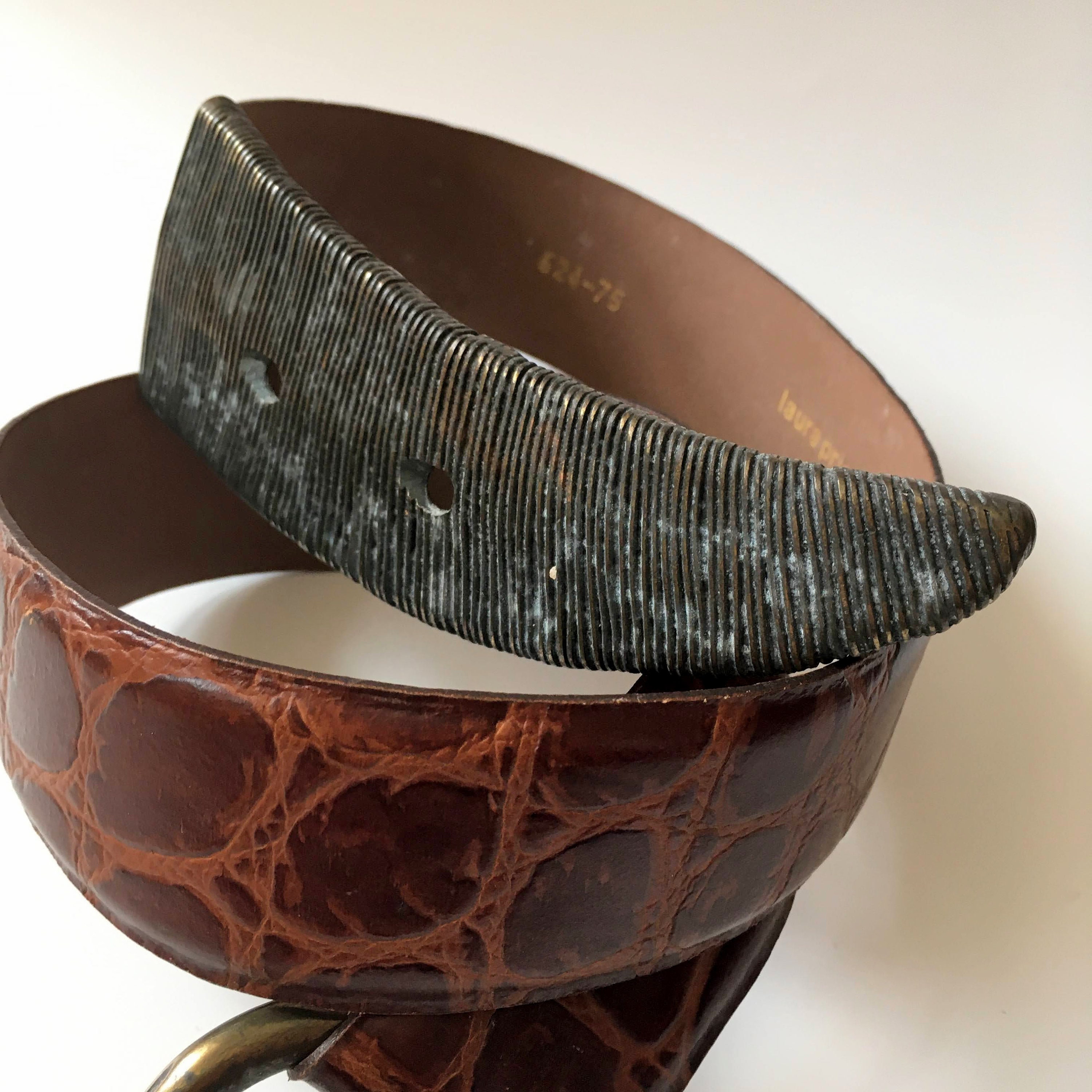 This is stunning vintage brown leather croc belt with brass buckle. This womens leather belt dates back to the 80s. It is by Laura Prisco Milano. This amazing textured leather belt is made of thick genuine leather. It has brass buckle detailing which has beautiful patina. Adorable vintage belt that will get all eyes on you. The size marked on the belt is 29.5" / 75 cm . It can adjust from 29.5" / 75 cm to 31.1" / 79 cm. This cute vintage belt is 1.7" / 4.2 cm wide.