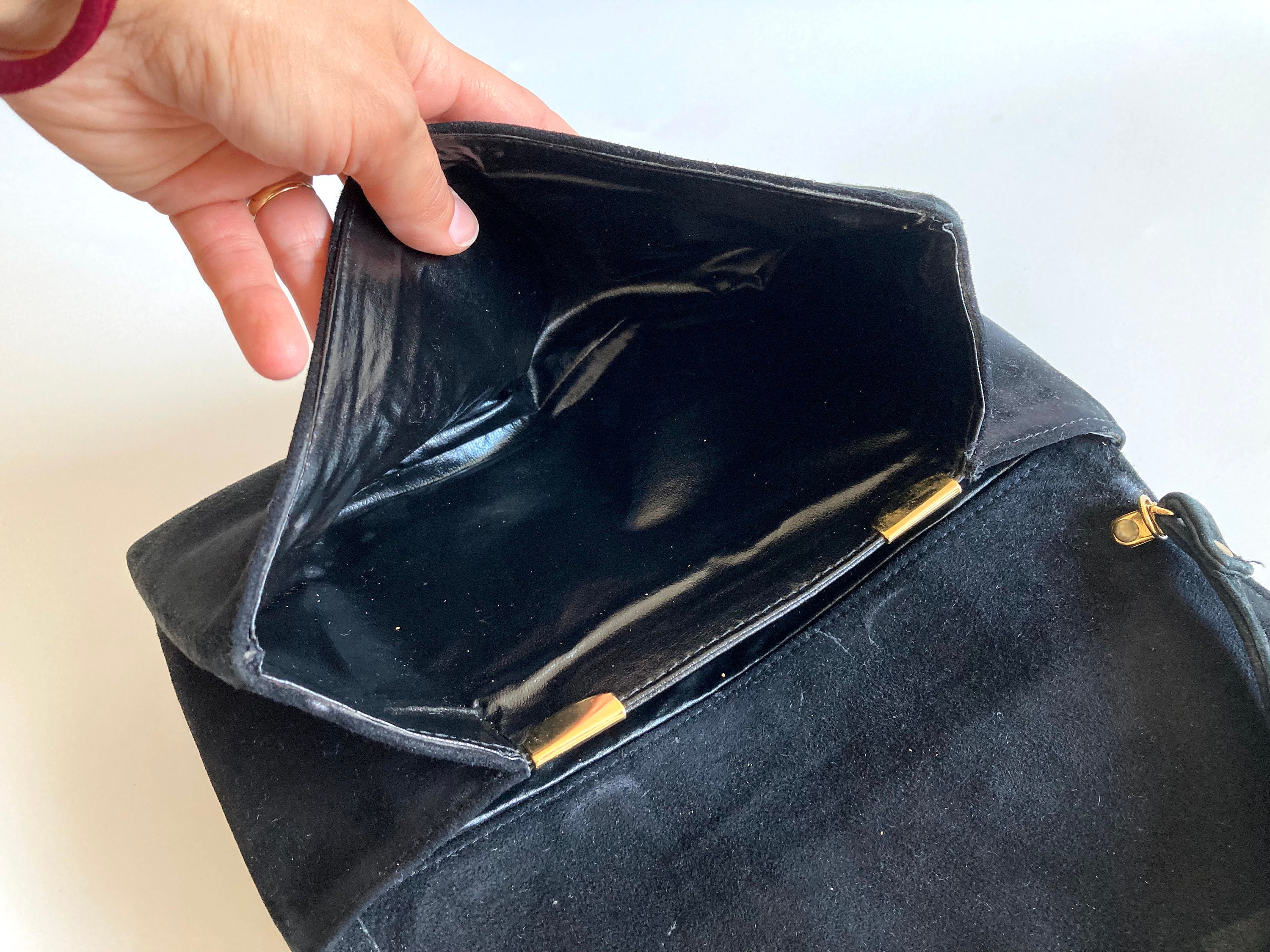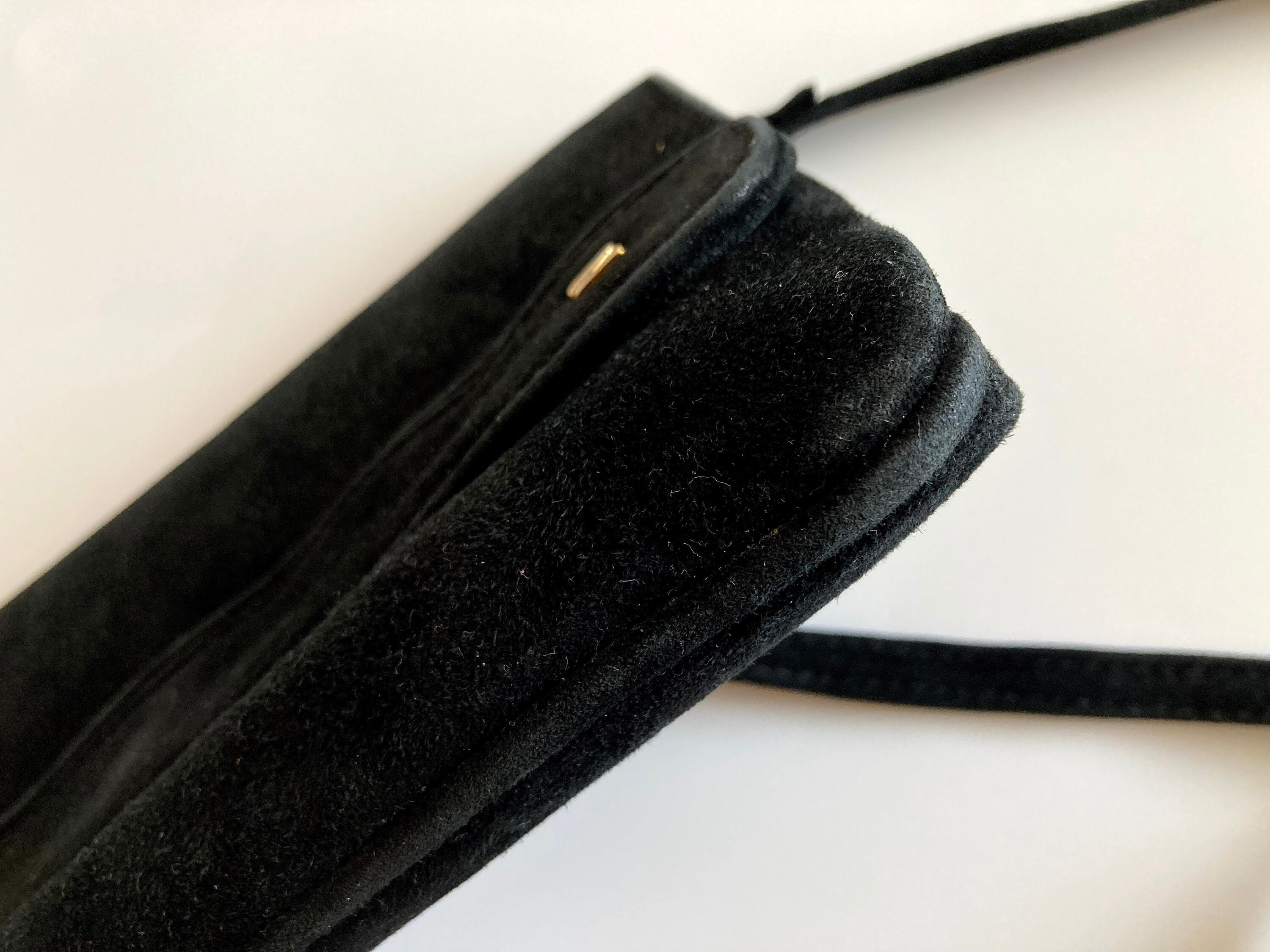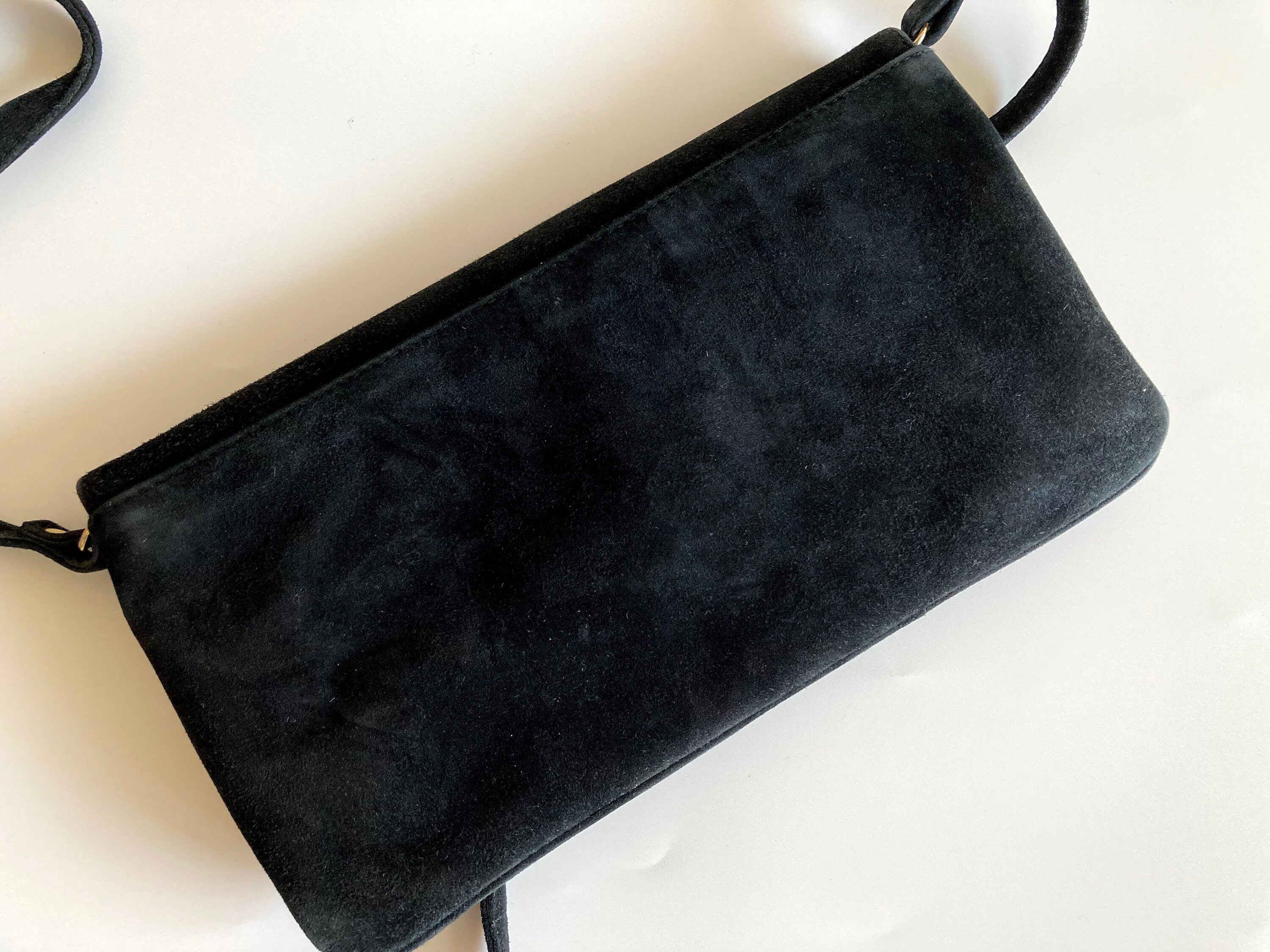 This is a vintage 80s suede leather envelope purse with a long shoulder strap. The strap allows you to wear it s a shoulder or as a crossbody bag. If you tuck it in, you can wear it as a clutch purse. The strap does not detach and can not adjust. This classic purse is made of suede leather which has a distressed look. This purse has two compartments. Very high-quality piece, made with attention to detail.