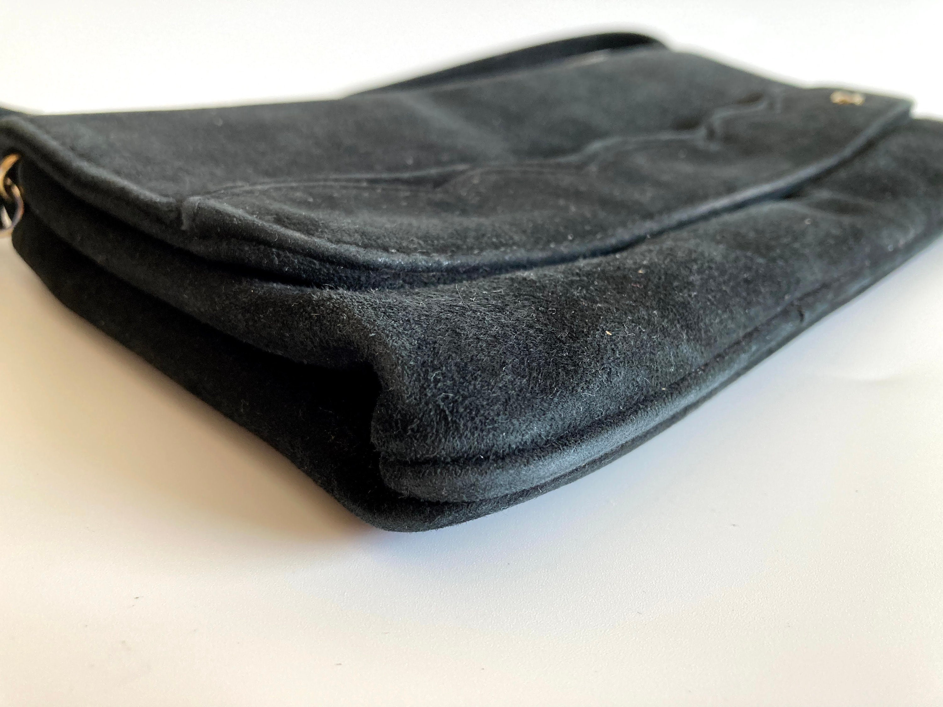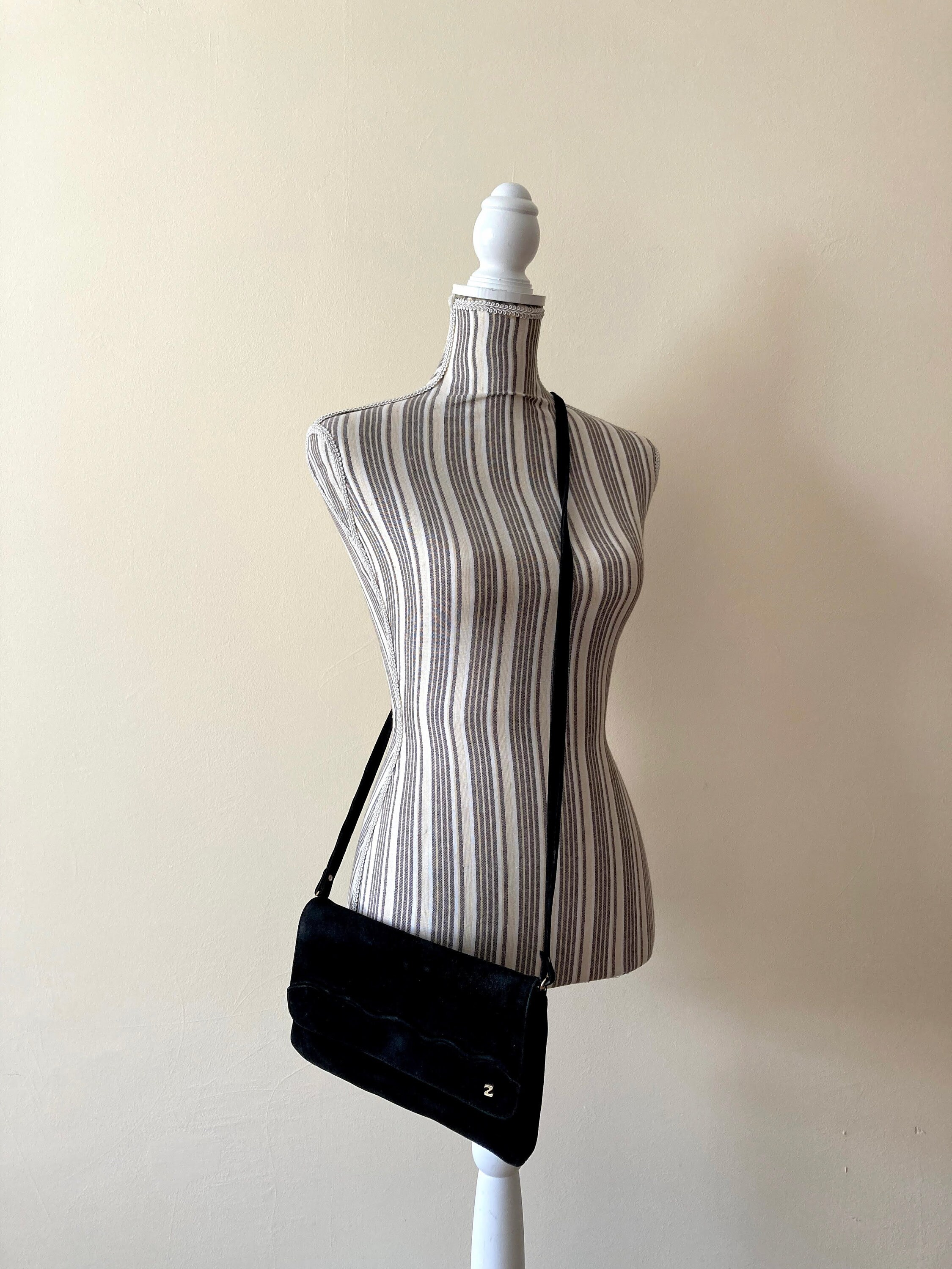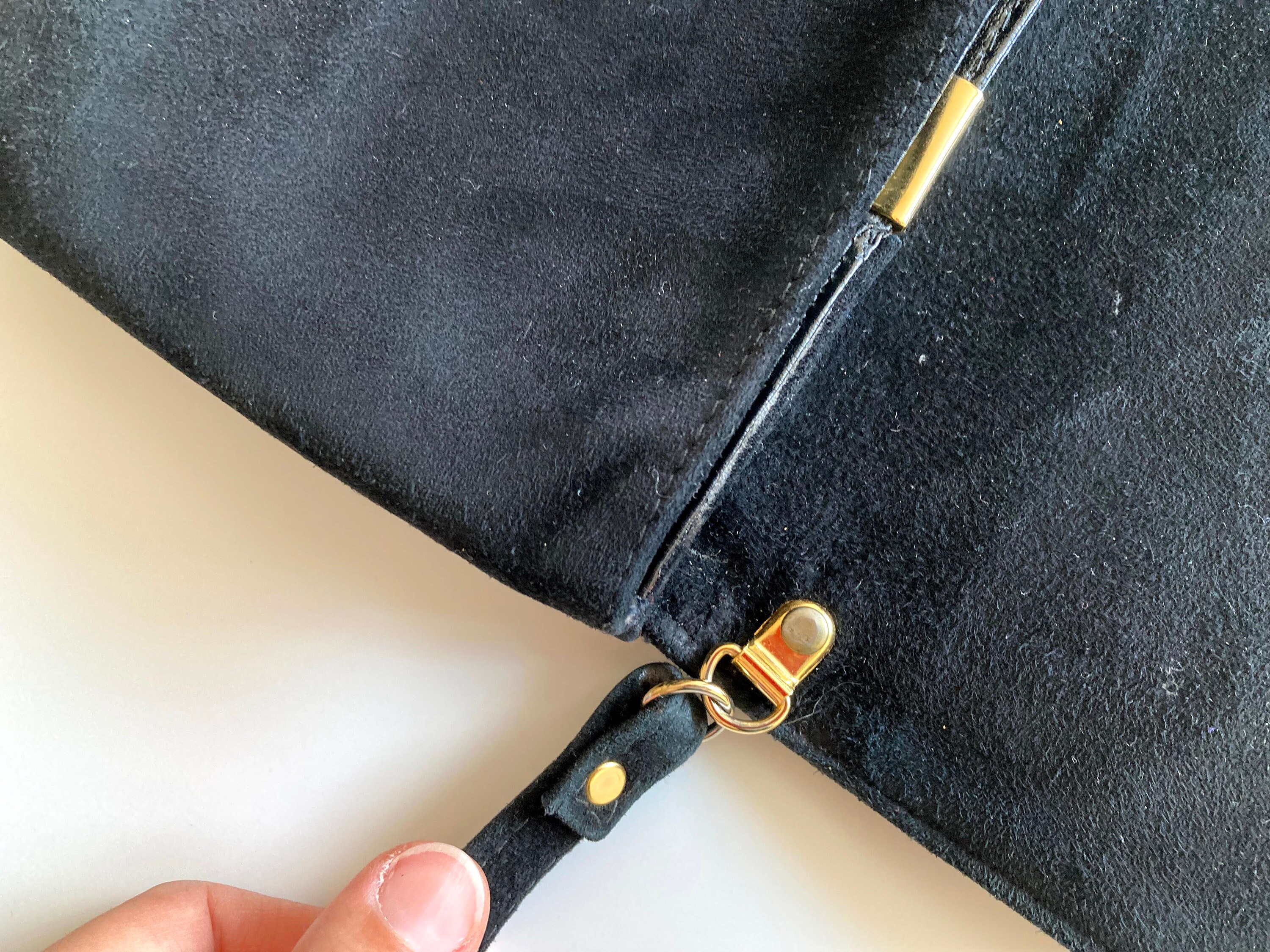 This is a vintage 80s suede leather envelope purse with a long shoulder strap. The strap allows you to wear it s a shoulder or as a crossbody bag. If you tuck it in, you can wear it as a clutch purse. The strap does not detach and can not adjust. This classic purse is made of suede leather which has a distressed look. This purse has two compartments. Very high-quality piece, made with attention to detail.