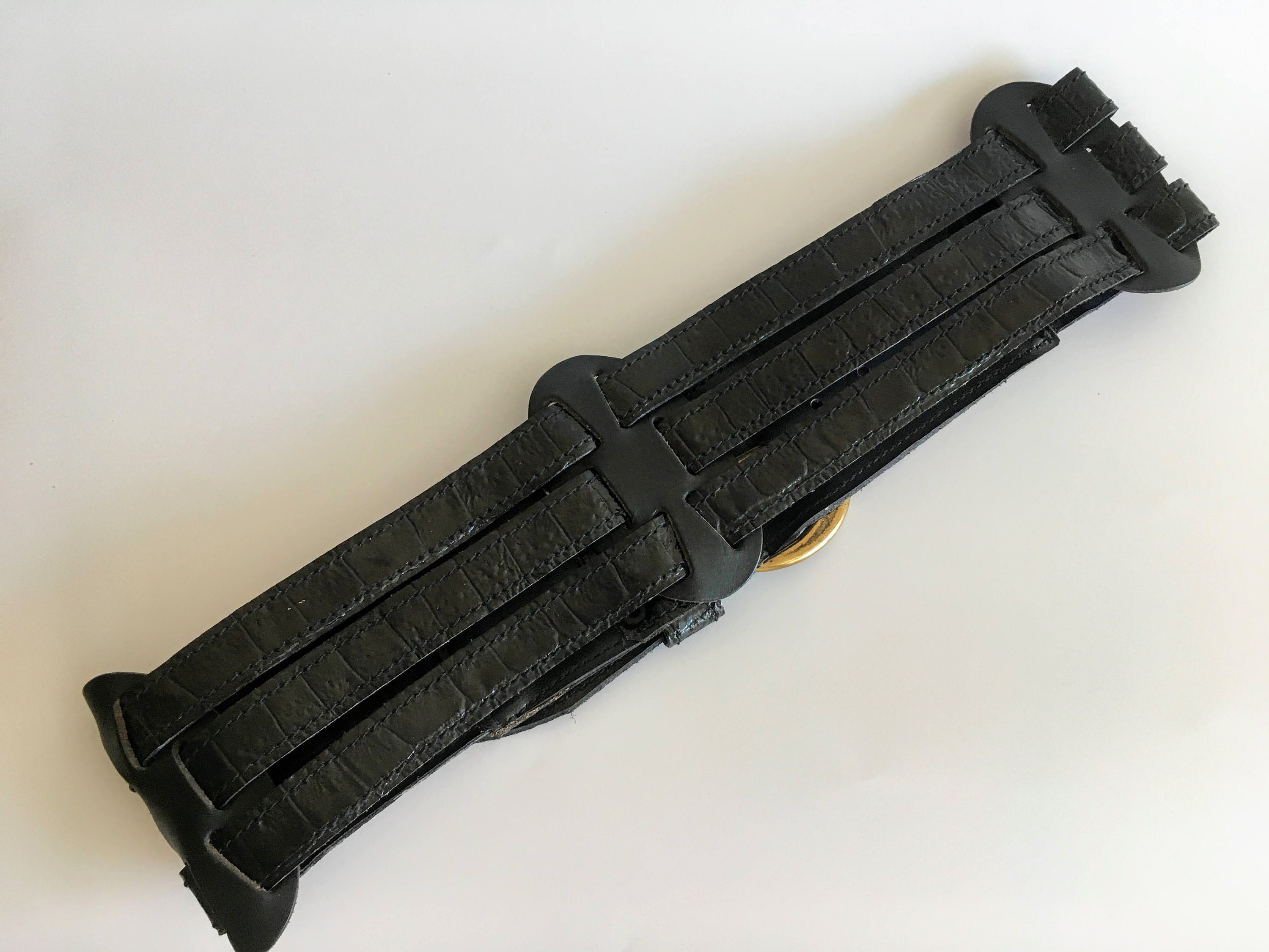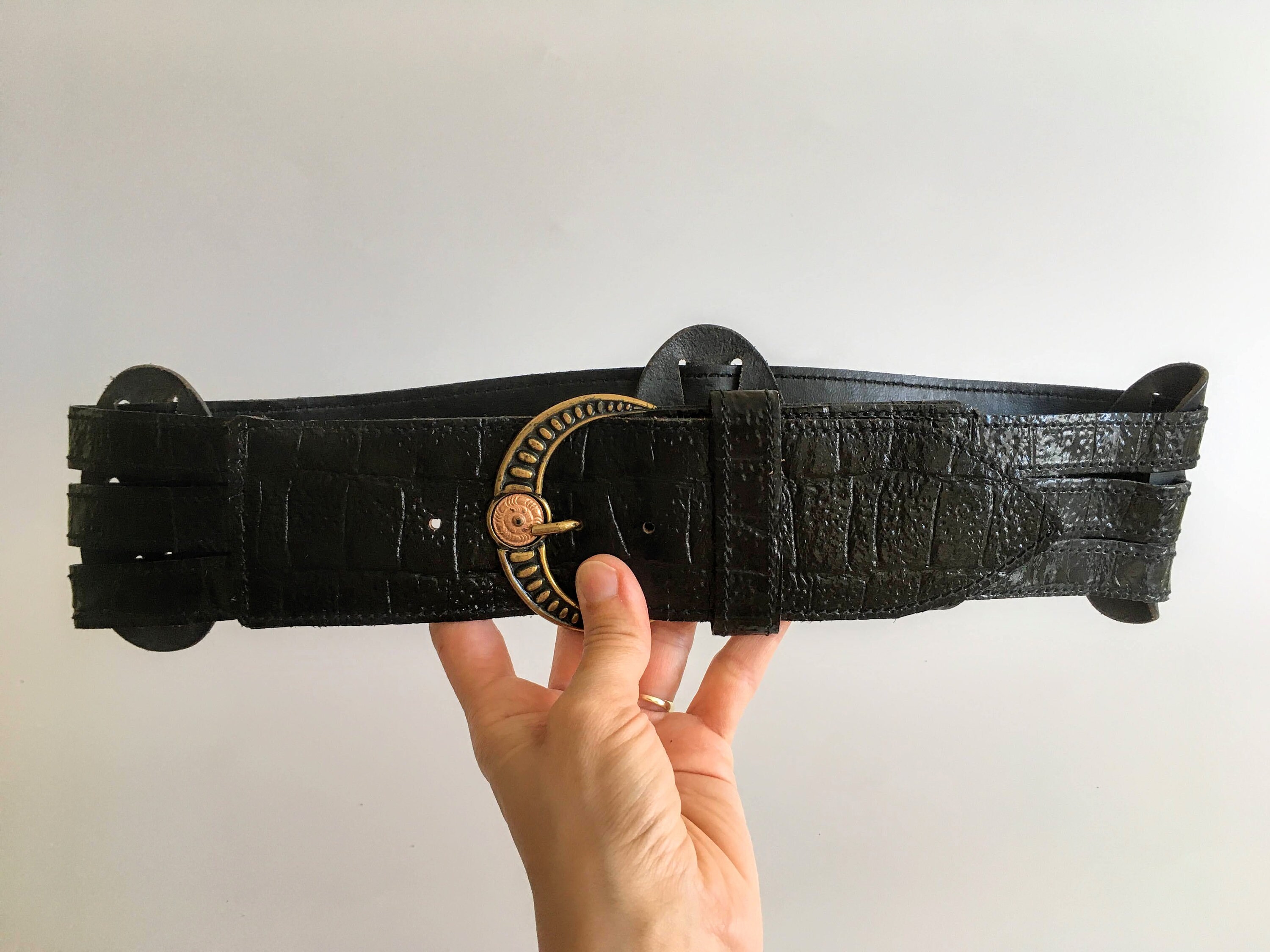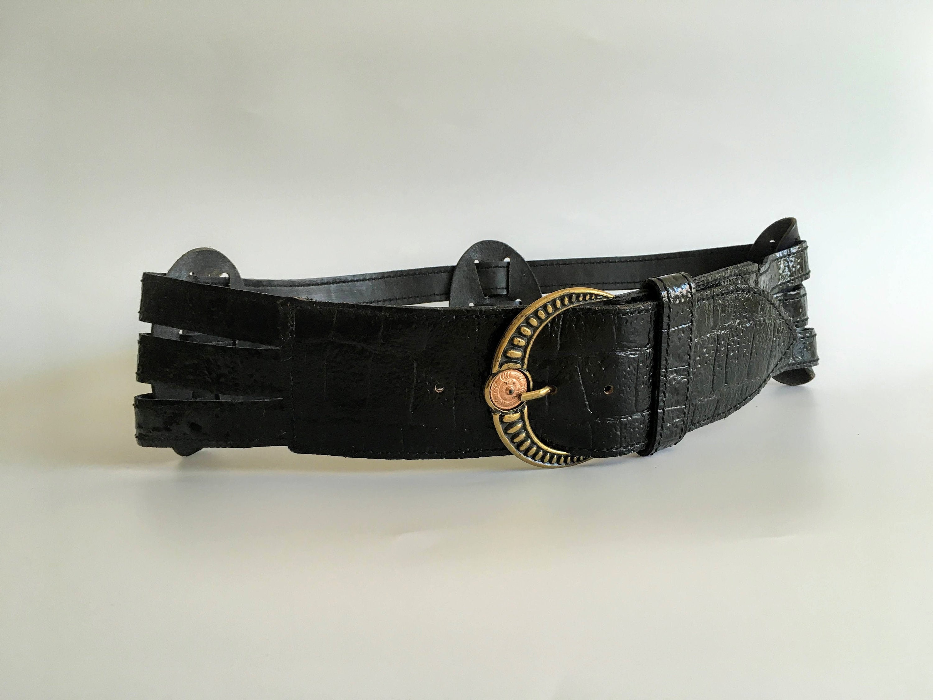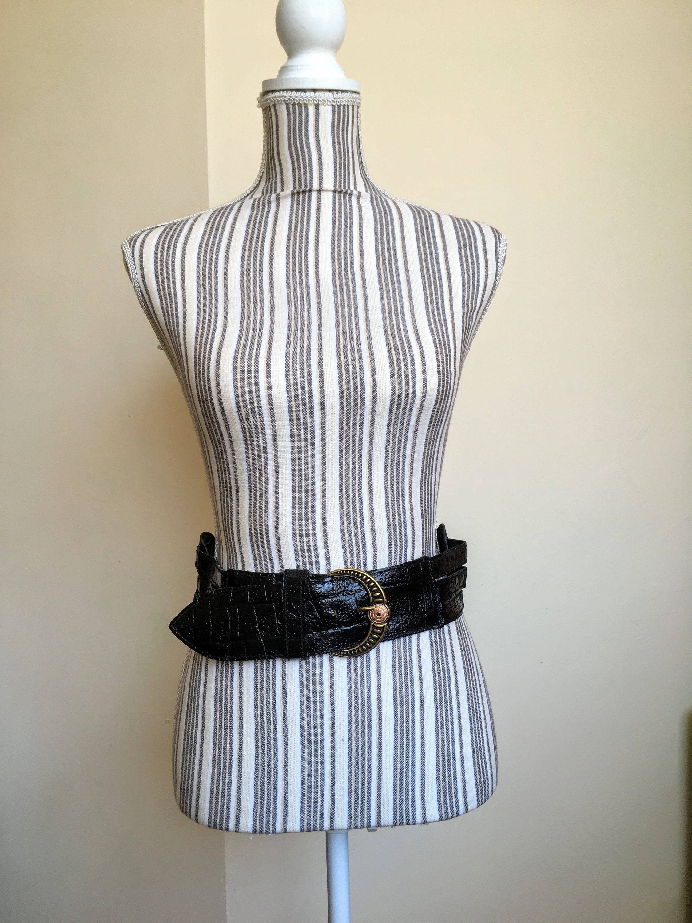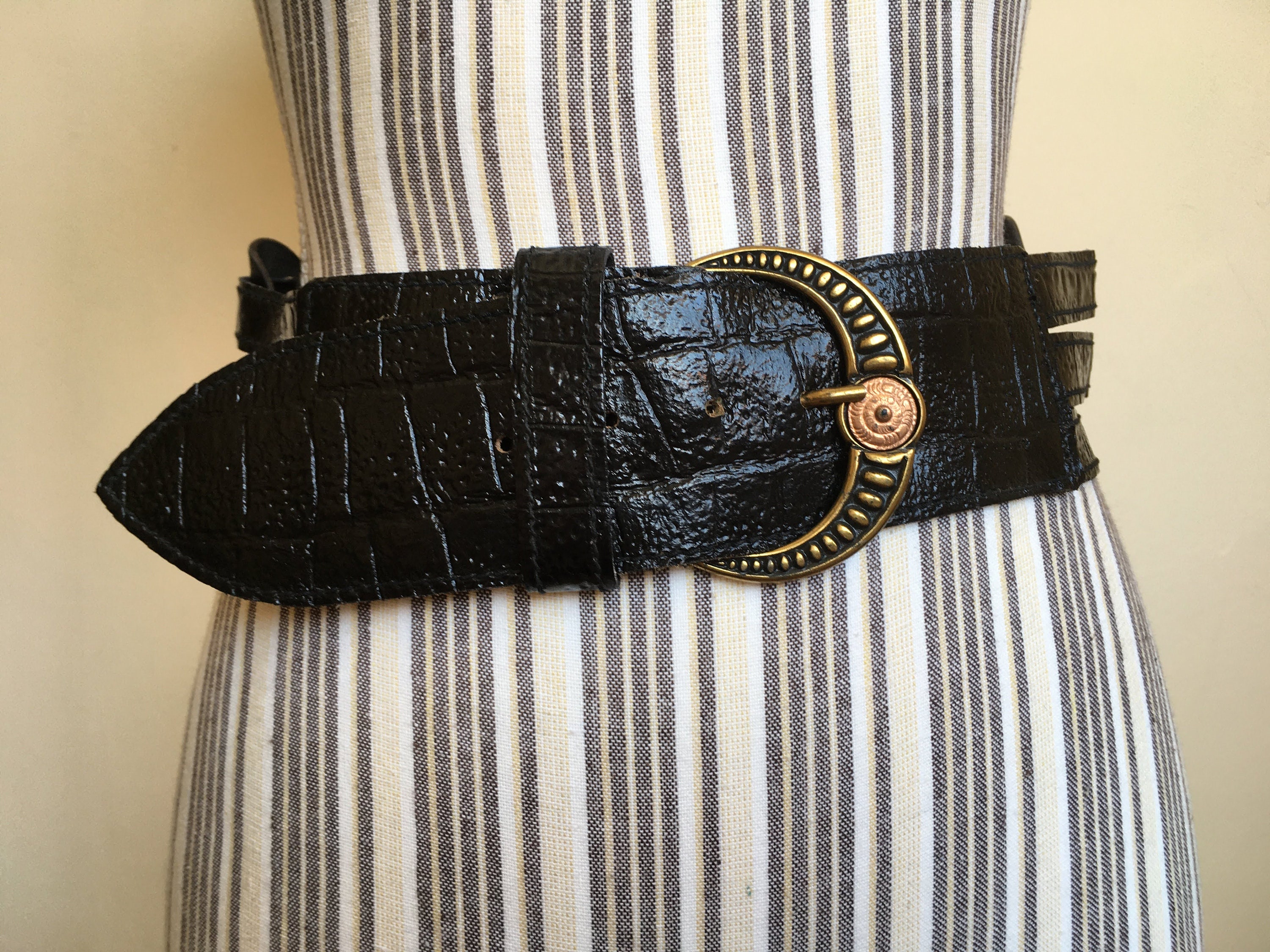 This is a black leather womens waist belt with brass buckle and strappy body. It is made of genuine leather with patent finish and embellished brass buckle. There is no size marked on the belt. It can adjust from 27.2" to 30.7" / 69 cm to 78 cm and it is 2.2" / 6.5 cm wide.