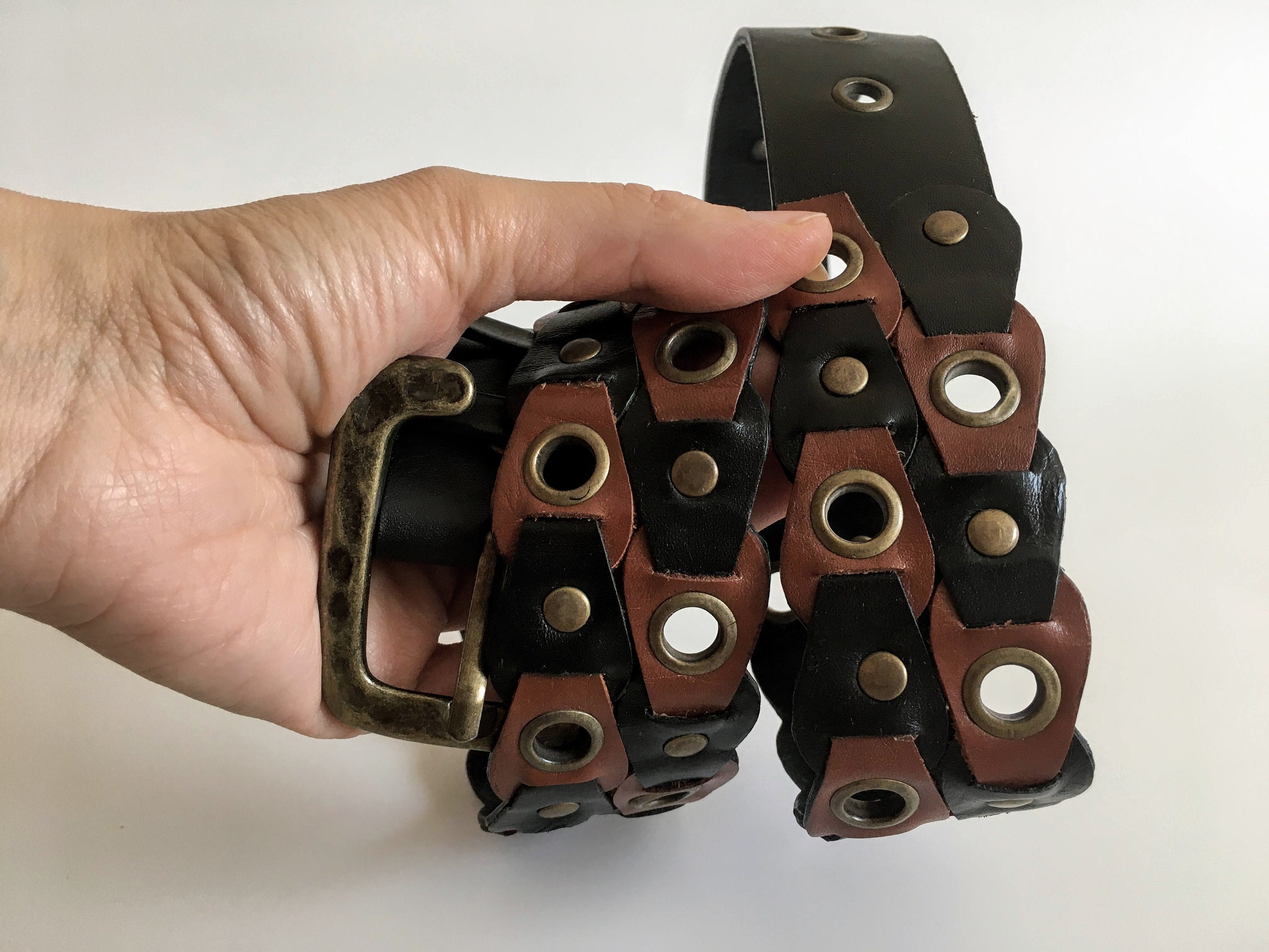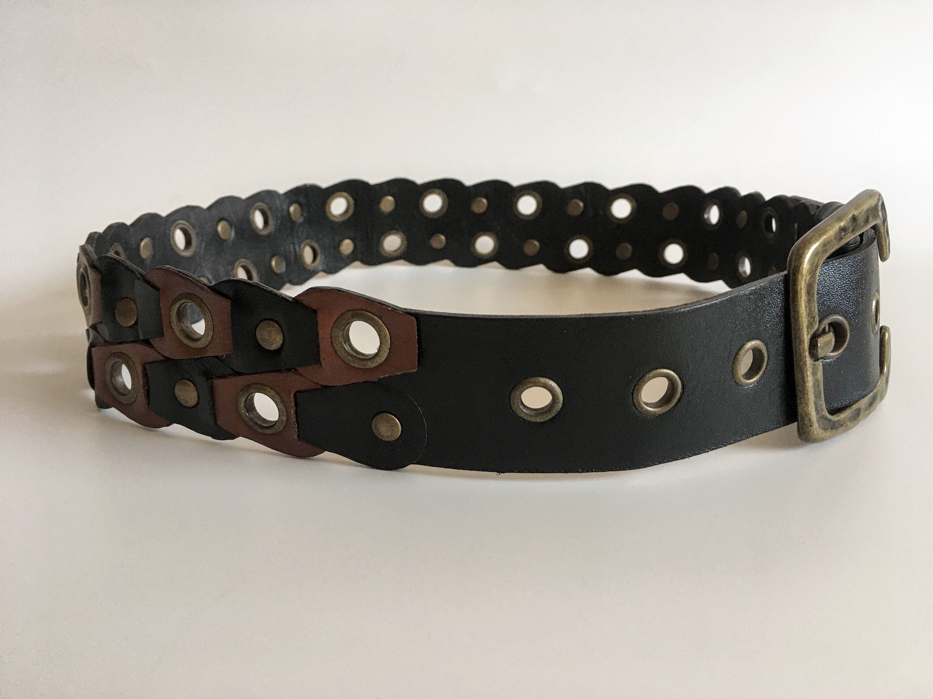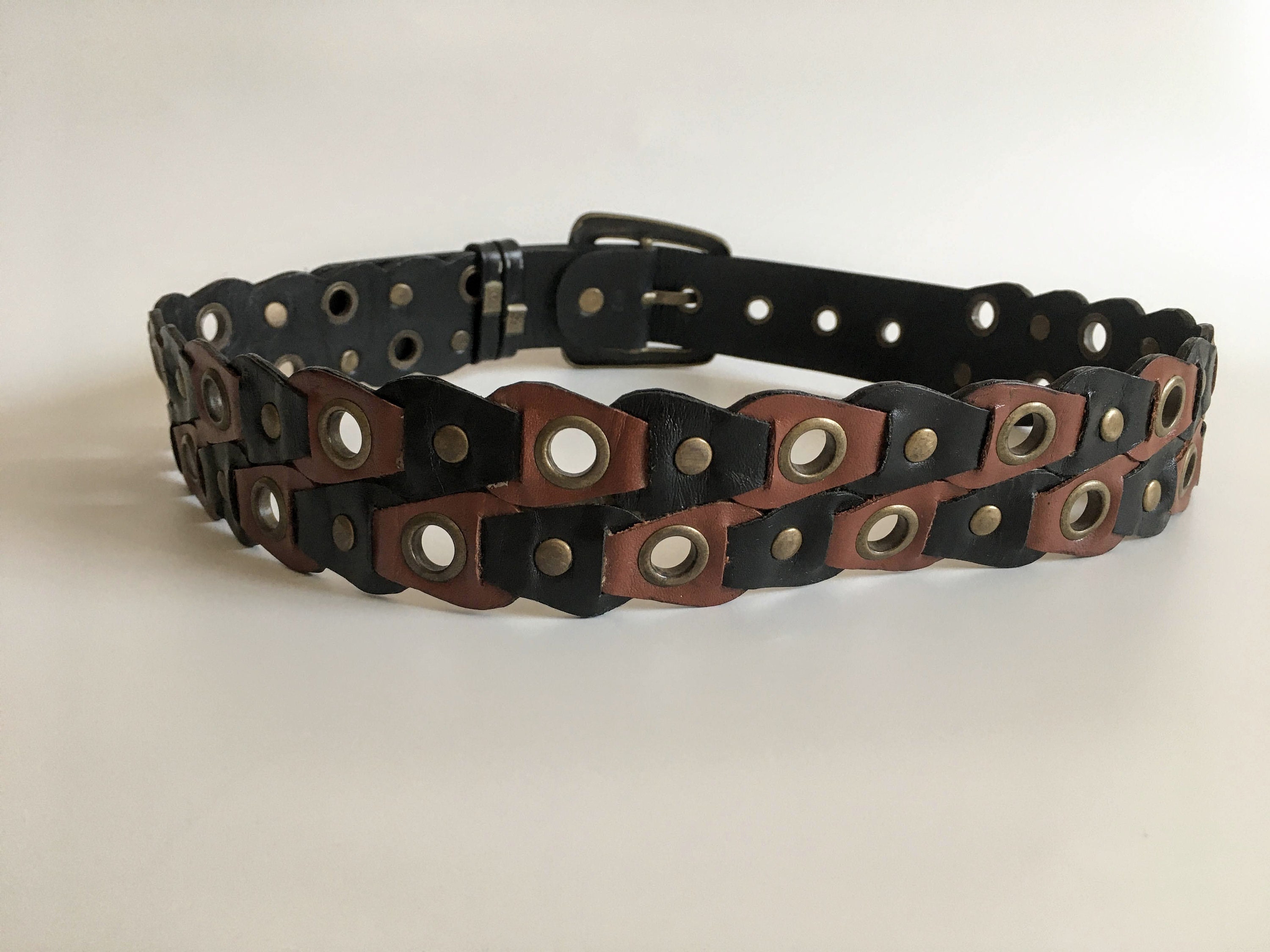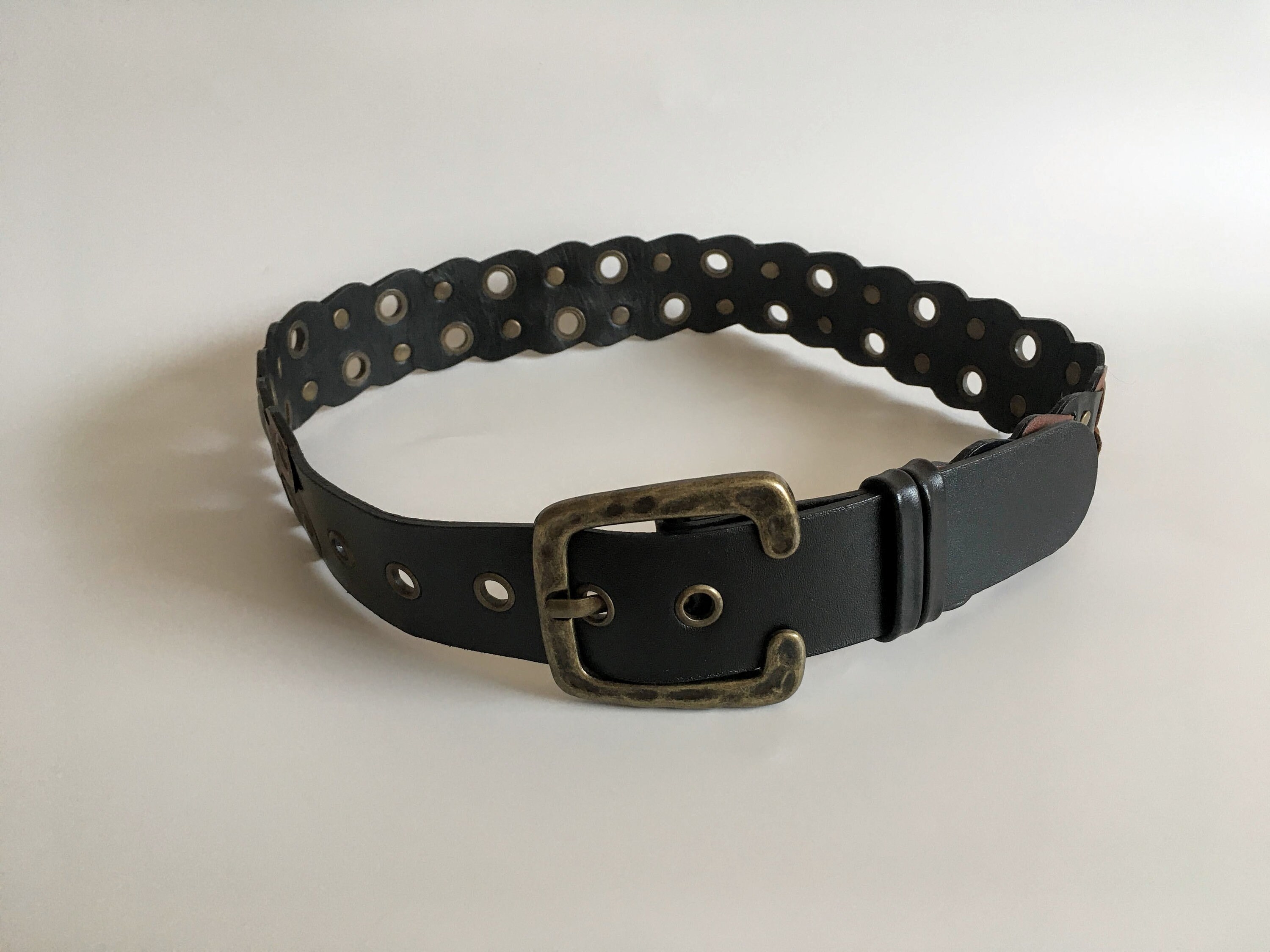 This is a beautiful vintage punched leather belt with brass studs and buckle. This womens leather belt is made of genuine leather in black and brown. It has scalloped edges. This boho belt can adjust from 25.6" to 29.5 " /65 cm to 75 cm. It is 1.6" / 4 cm wide.