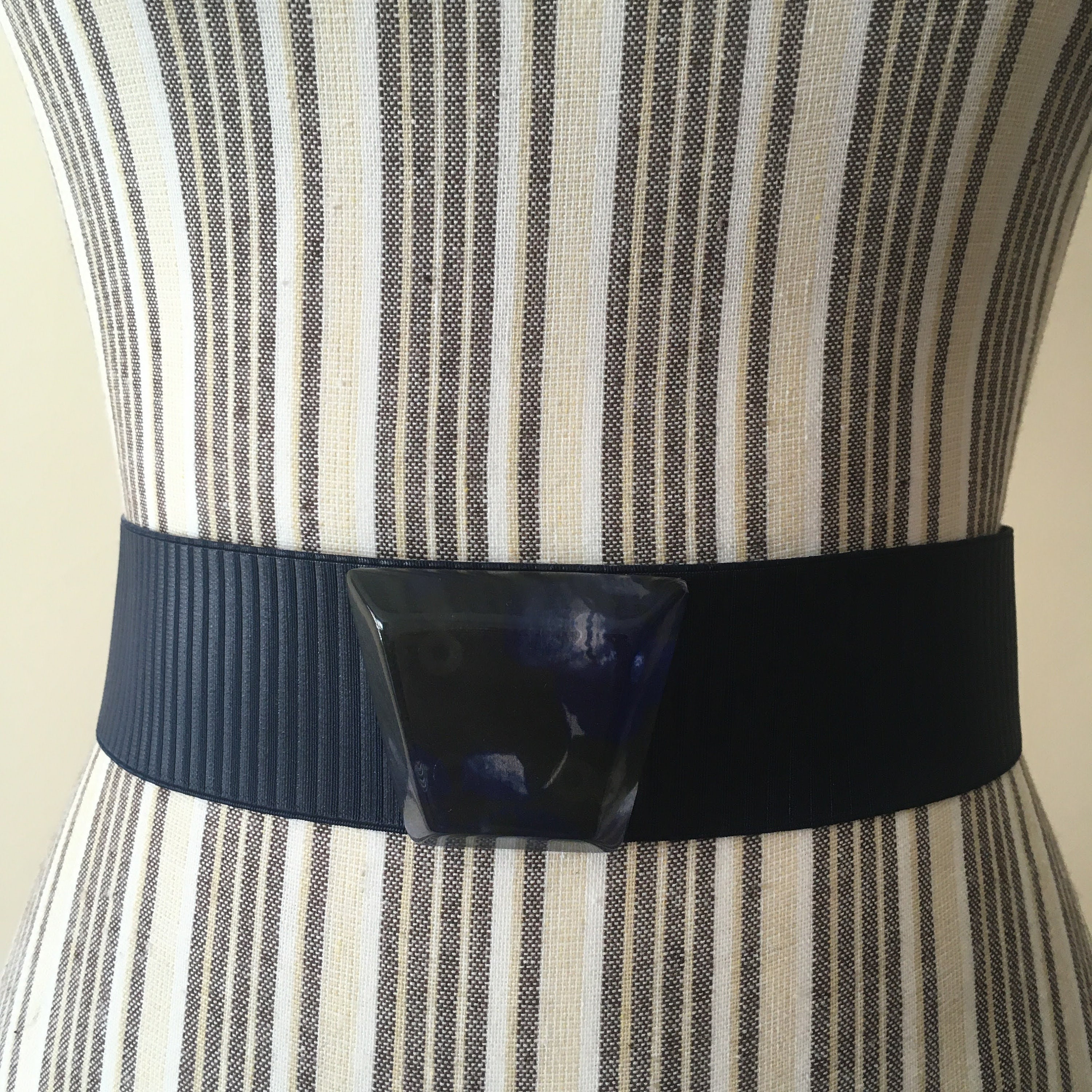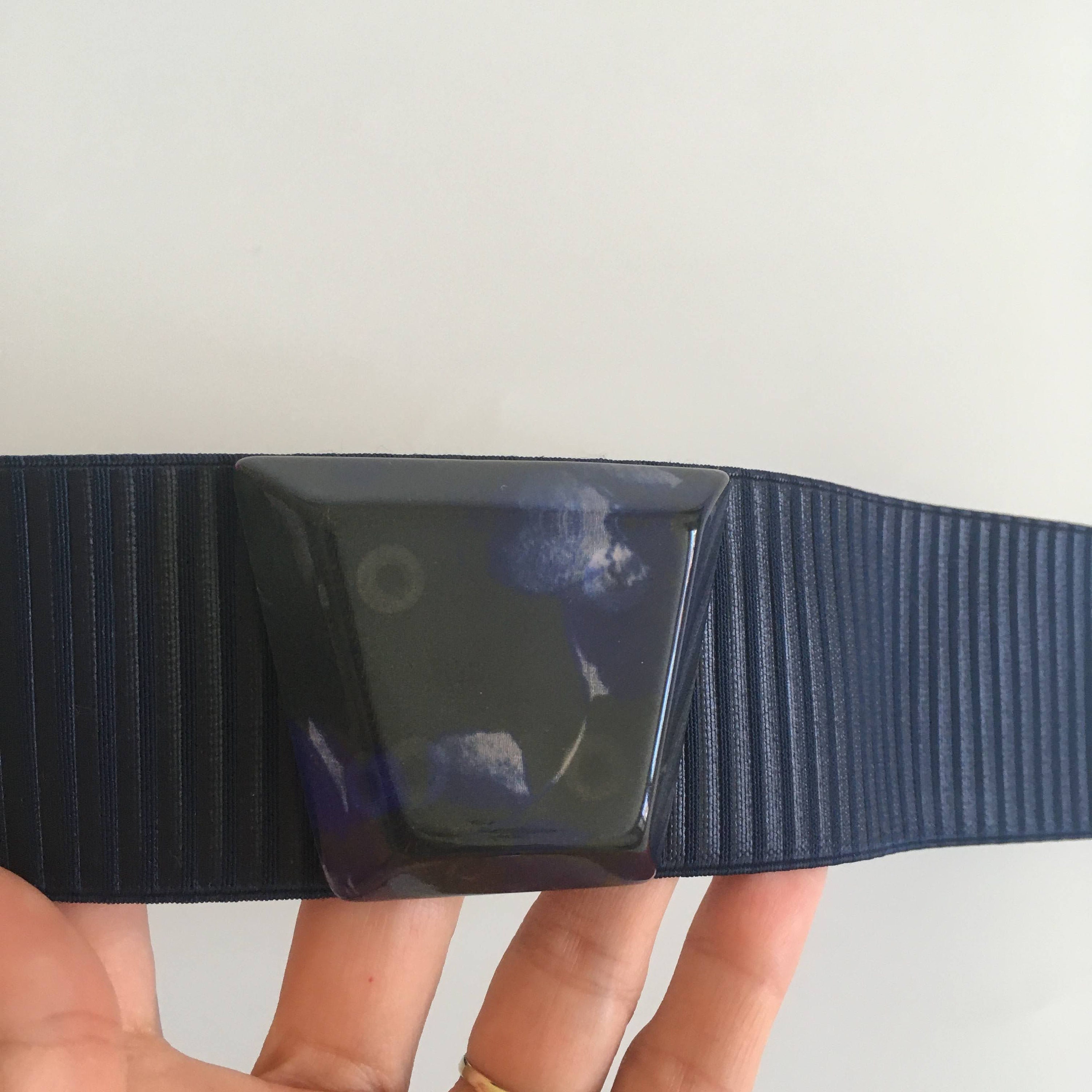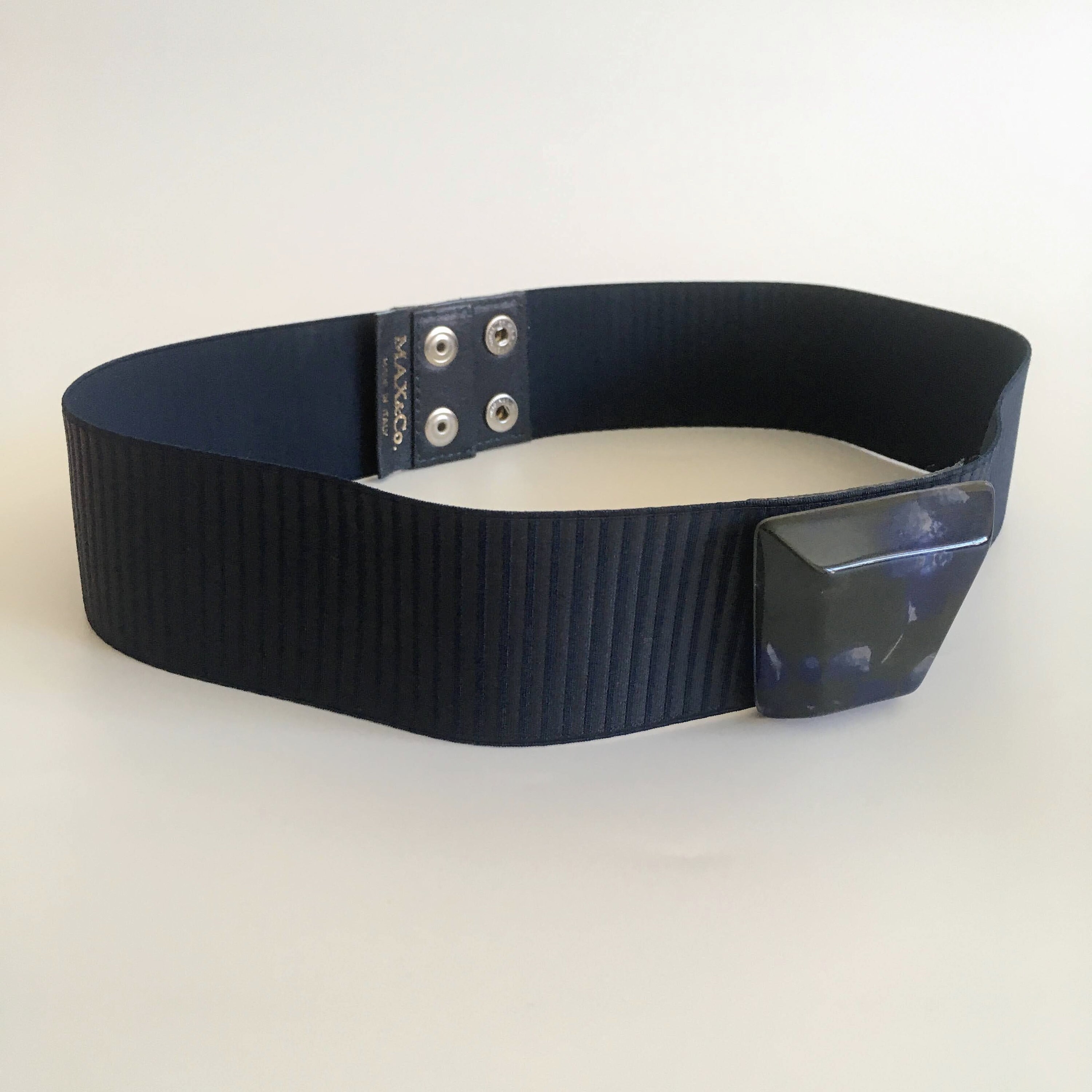 This is a vintage navy blue stretch belt with lucite buckle with snap closure at the back. This minimalist elastic belt will make a wonderful cothing accessory for your outfits. You can pair it with tunics or dresses and get all eyes on you. This deep blue waistband belt is by the brand Max&Co and was manufactured in Italy. It is size S.