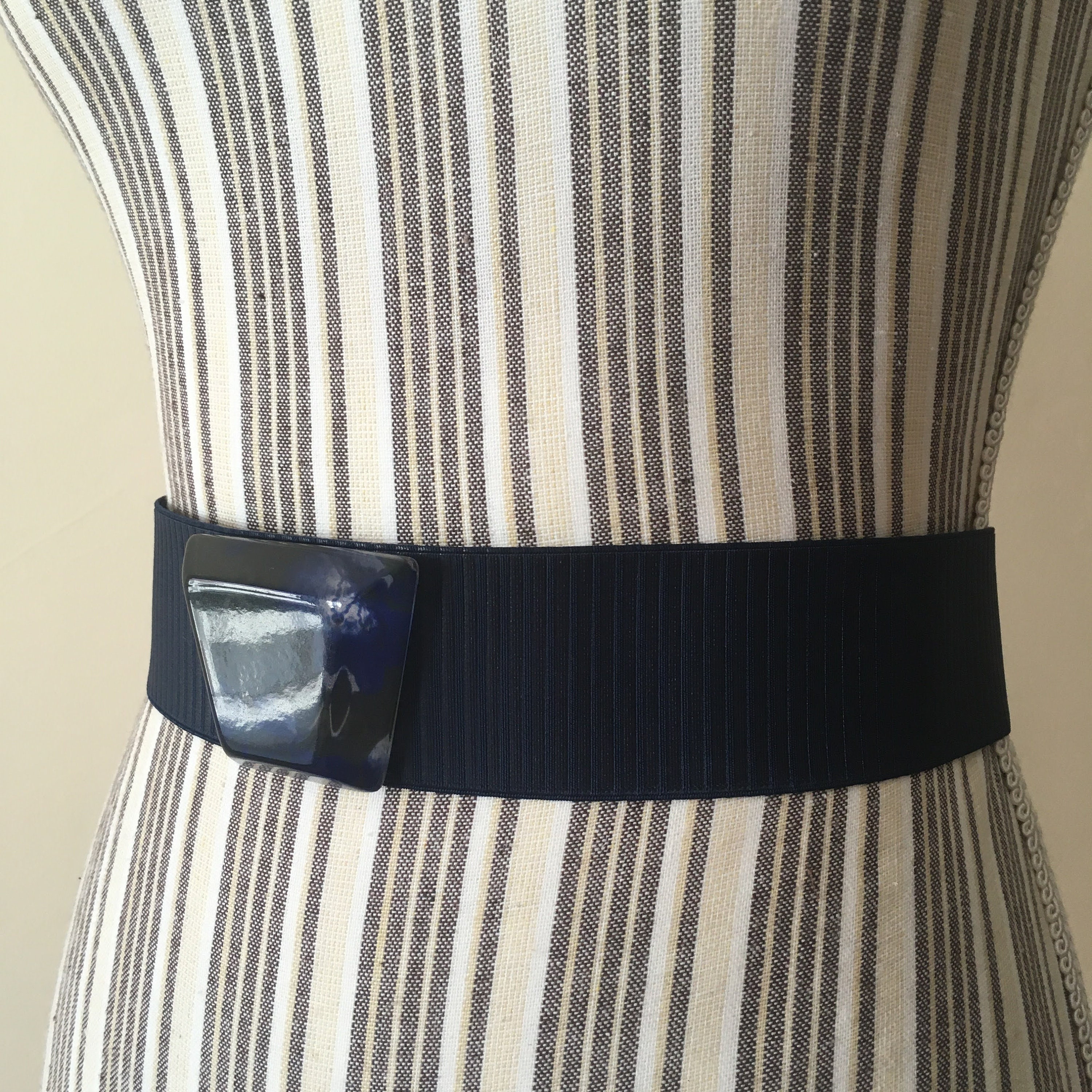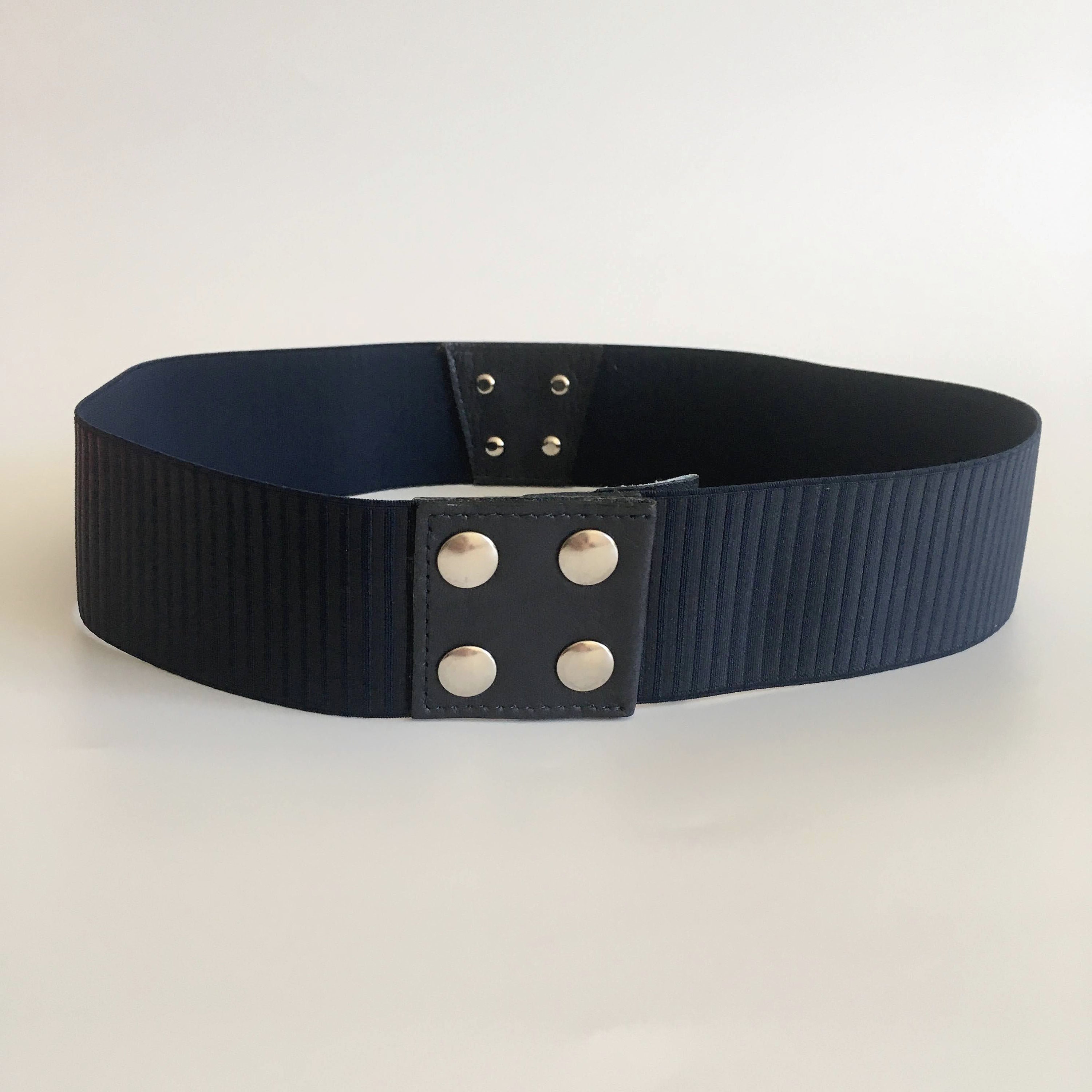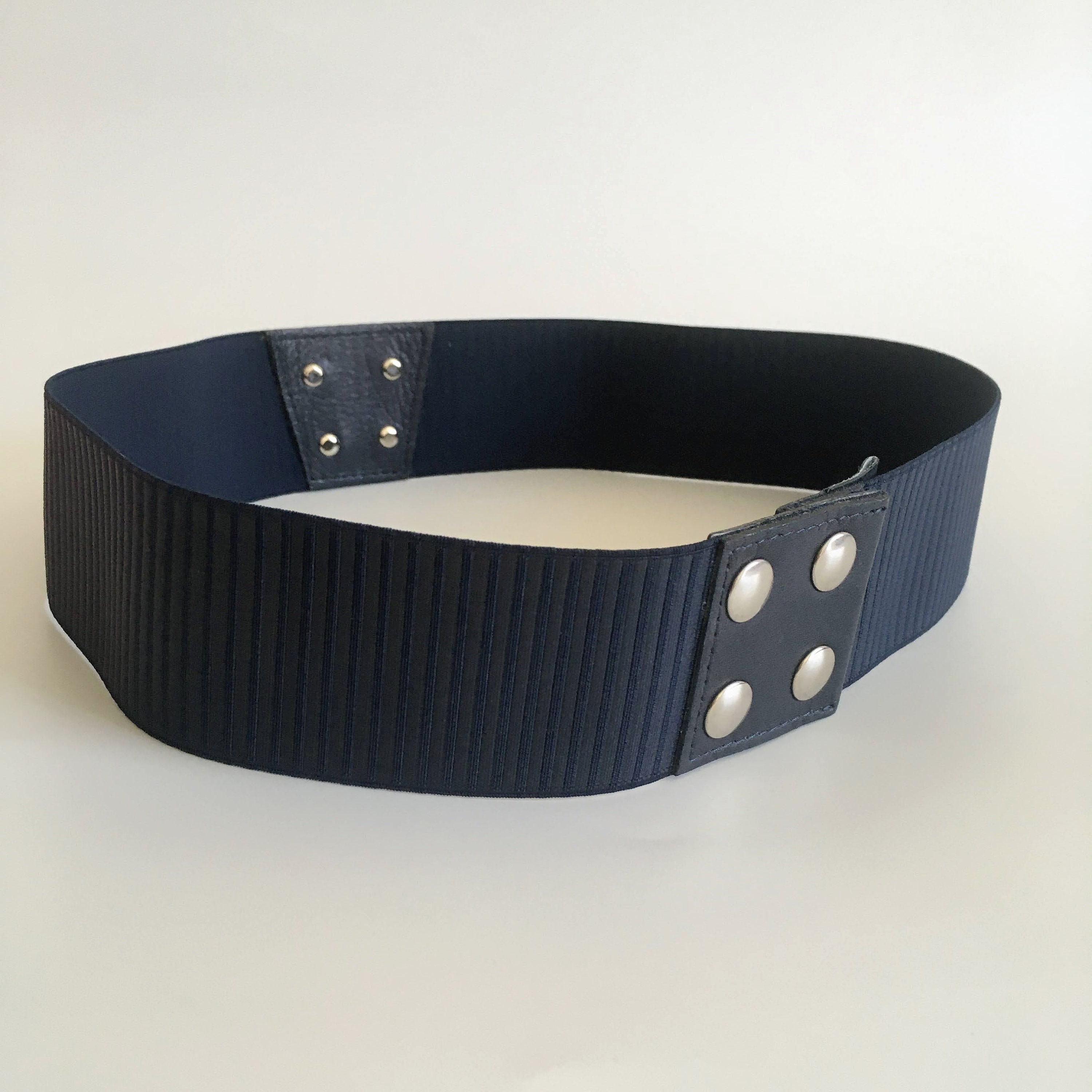 This is a vintage navy blue stretch belt with lucite buckle with snap closure at the back. This minimalist elastic belt will make a wonderful cothing accessory for your outfits. You can pair it with tunics or dresses and get all eyes on you. This deep blue waistband belt is by the brand Max&Co and was manufactured in Italy. It is size S.