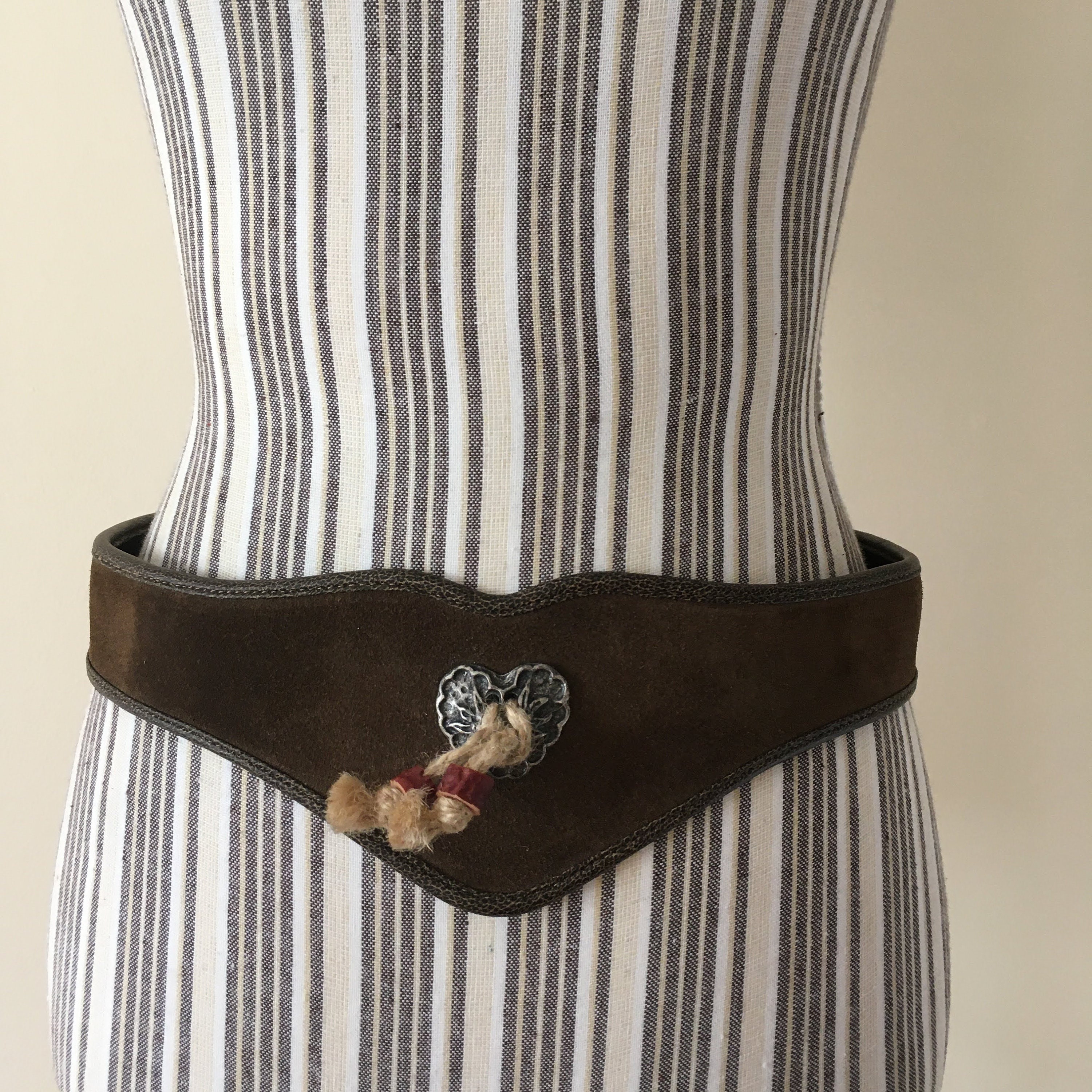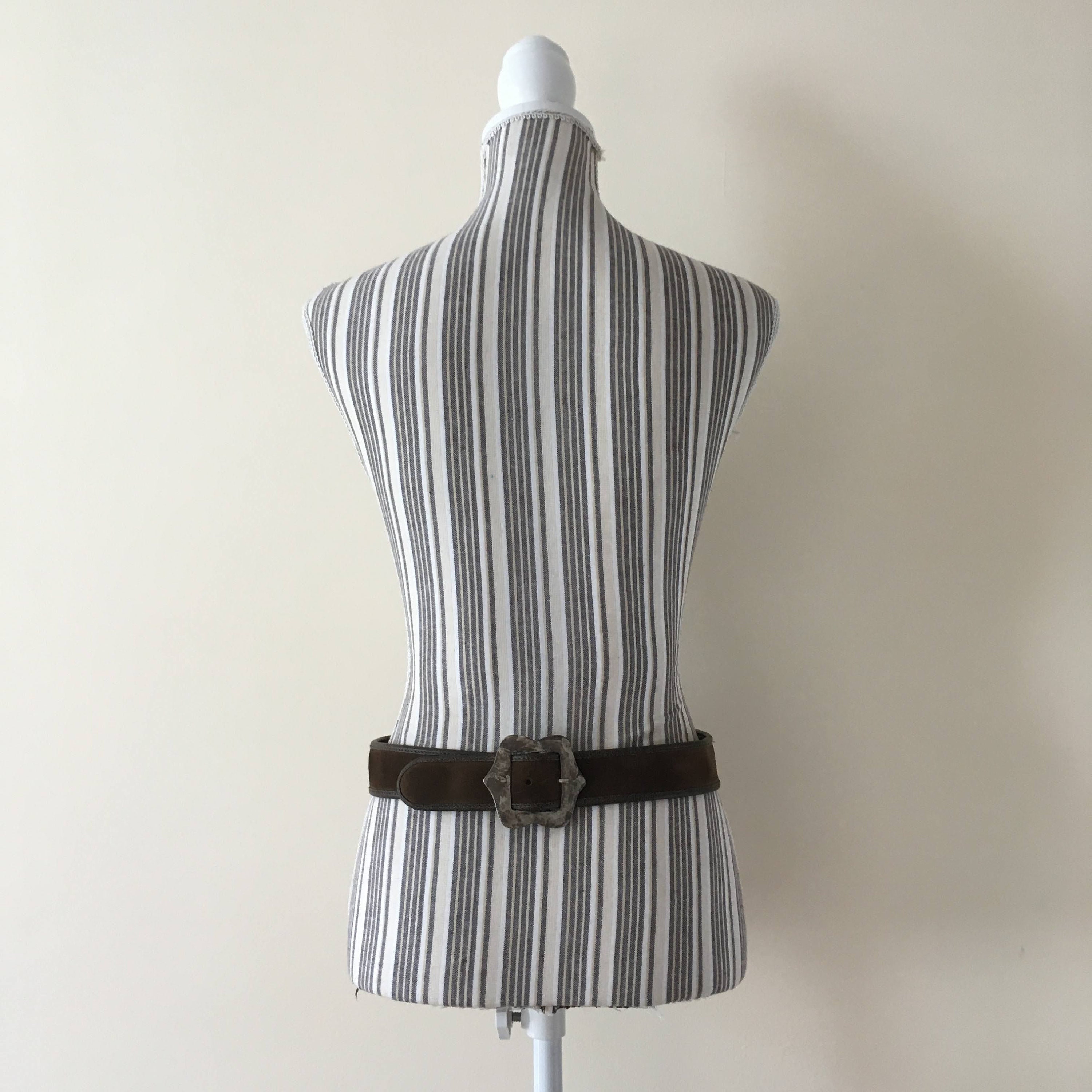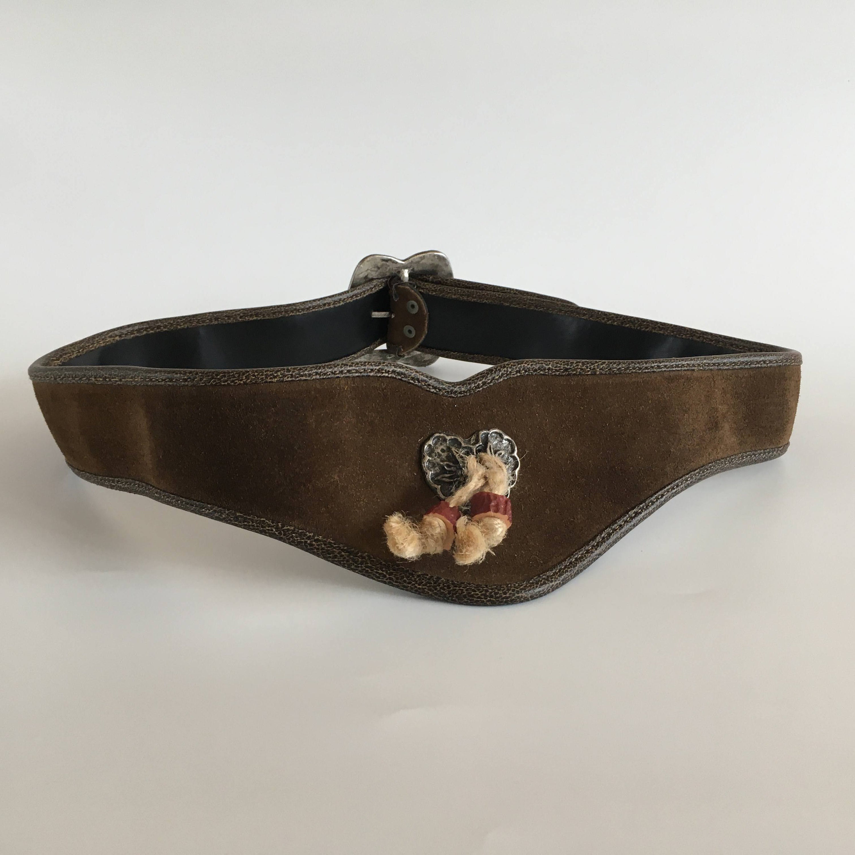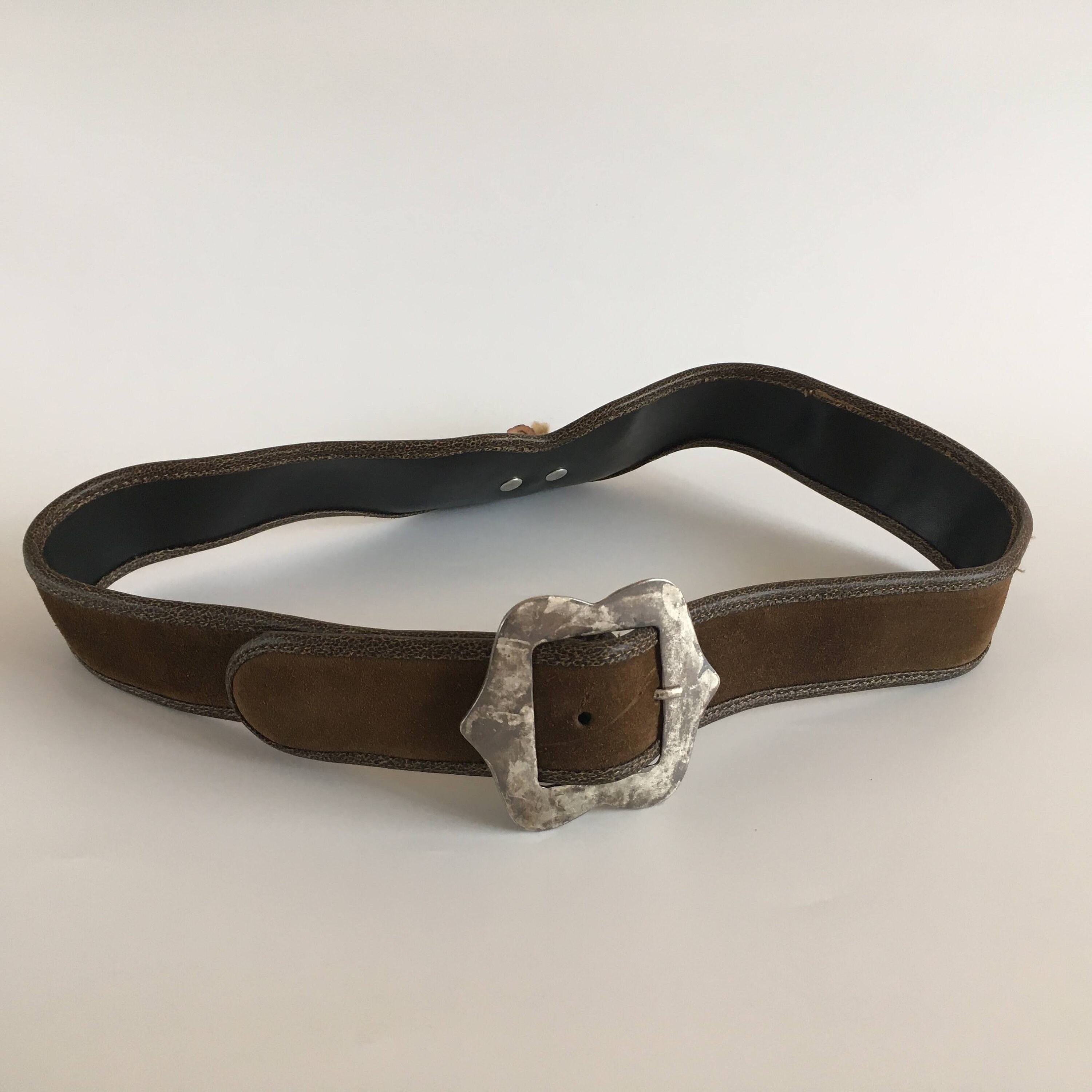 Condition: There are some scratches on the suede leather surface, typical for suede items. The silver tone buckle shows multiple scratches and has a heavily distressed look.