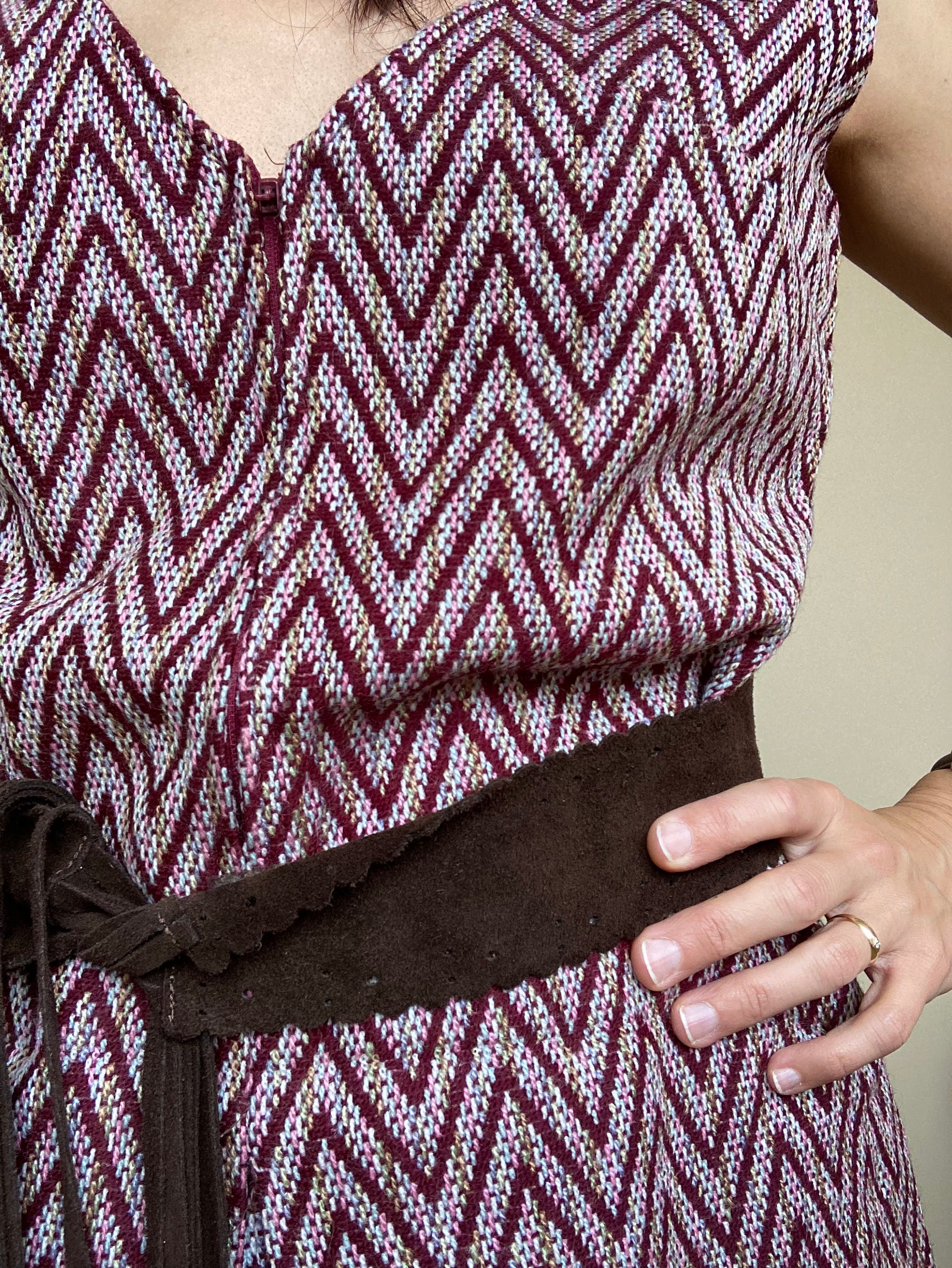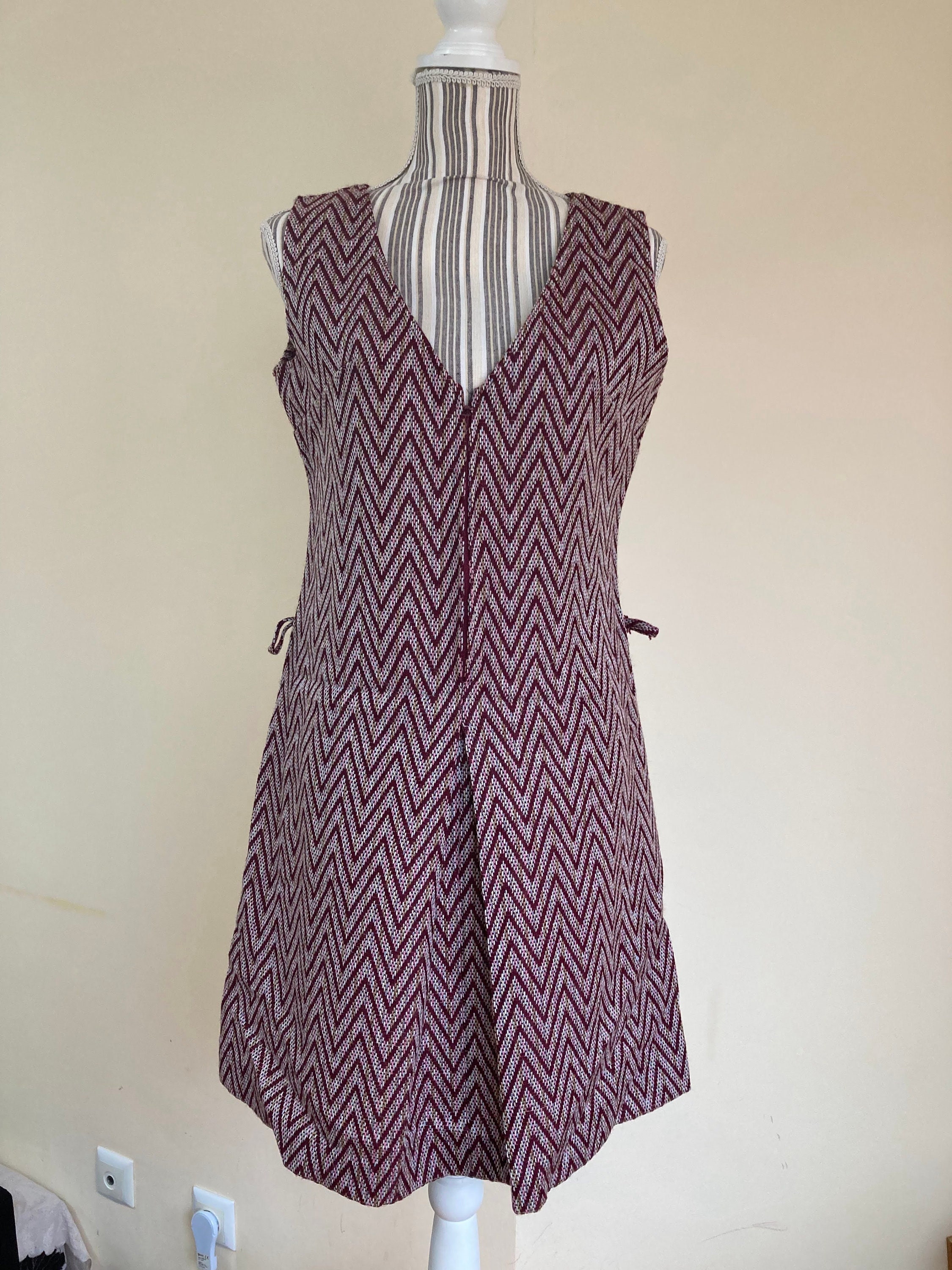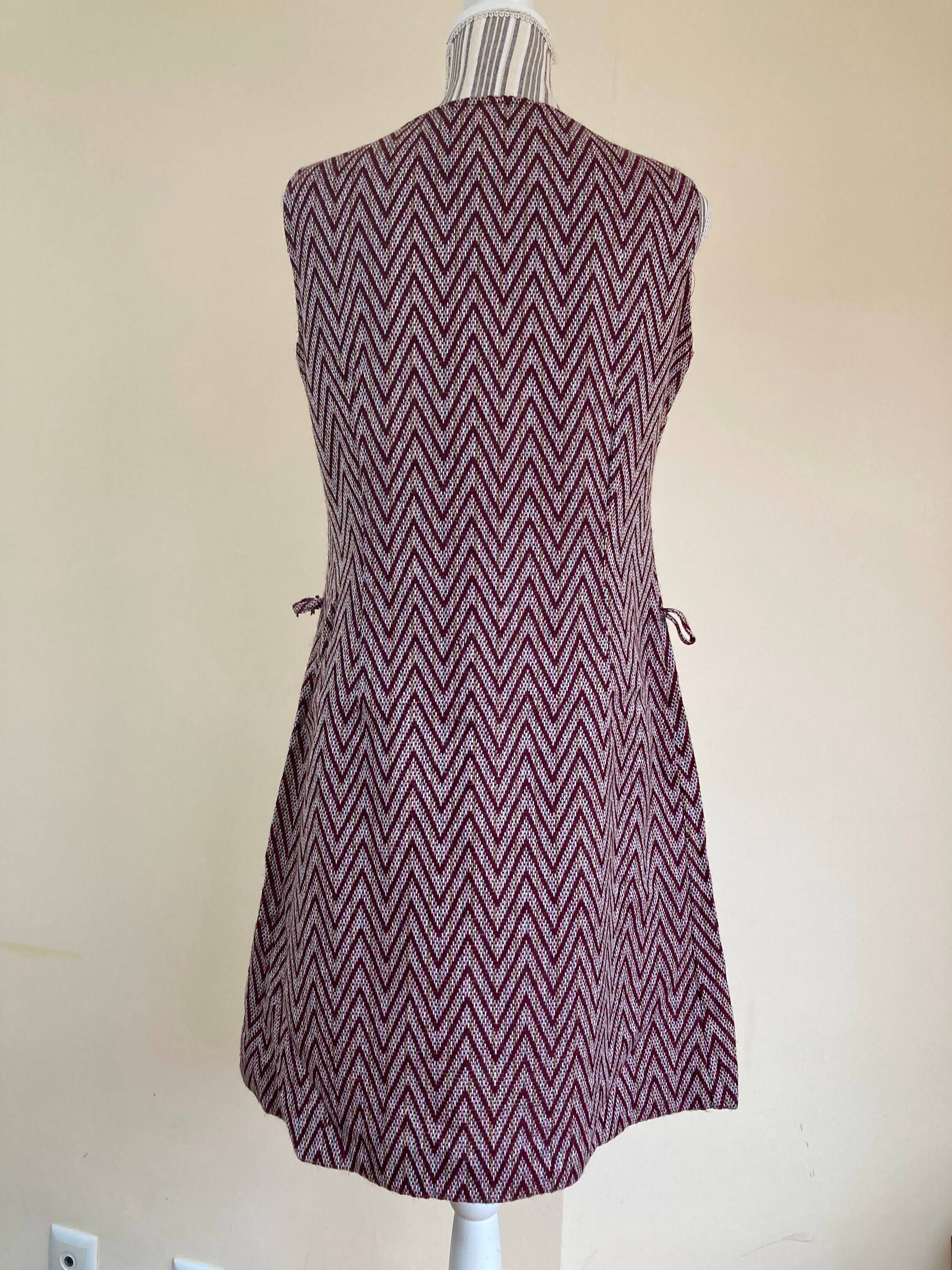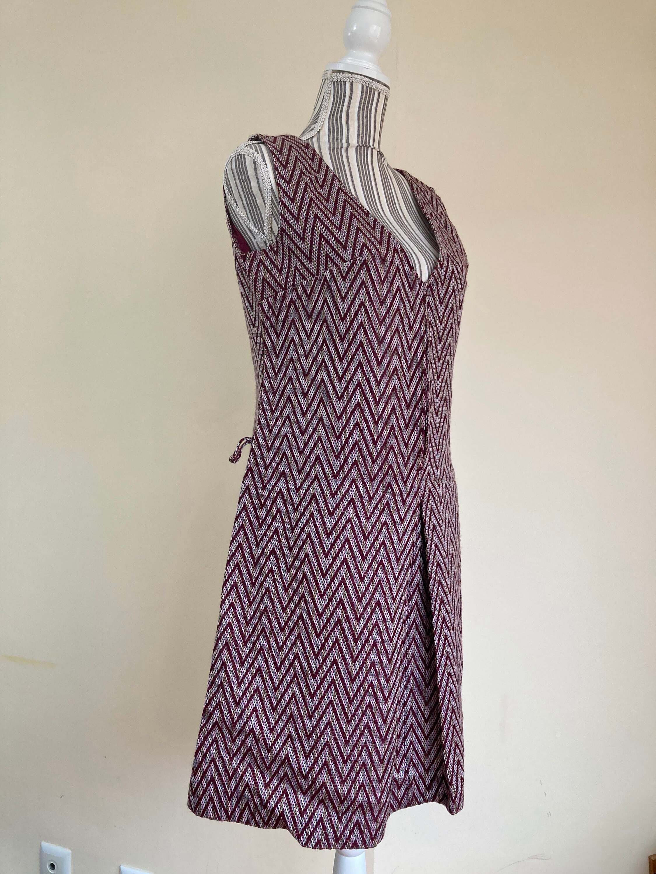 Lovely burgundy chevron dress made of warm woven carpet style fabric. This sleeveless dress has front zip closure. It has no lining (just at the top part of the back). This cute woven dress has A line shape. It has loops for a belt but the belt is missing. In the photo I am modelling the dress with a suede leather belt. It does not come with the dress. It can be purchased here - https://www.etsy.com/listing/1093058356/brown-suede-leather-belt-with-tassels?ref=shop_home_active_21&pro=1