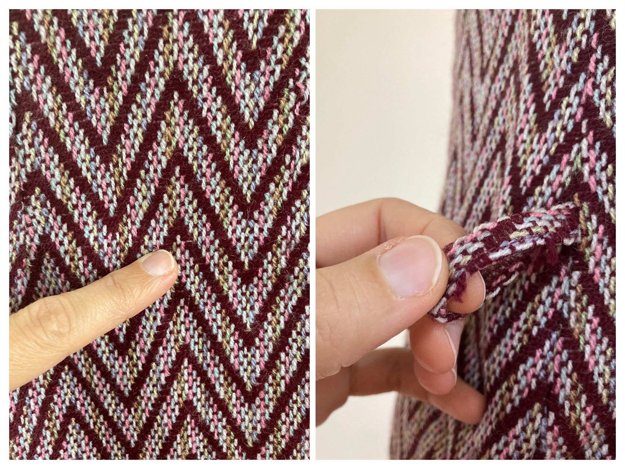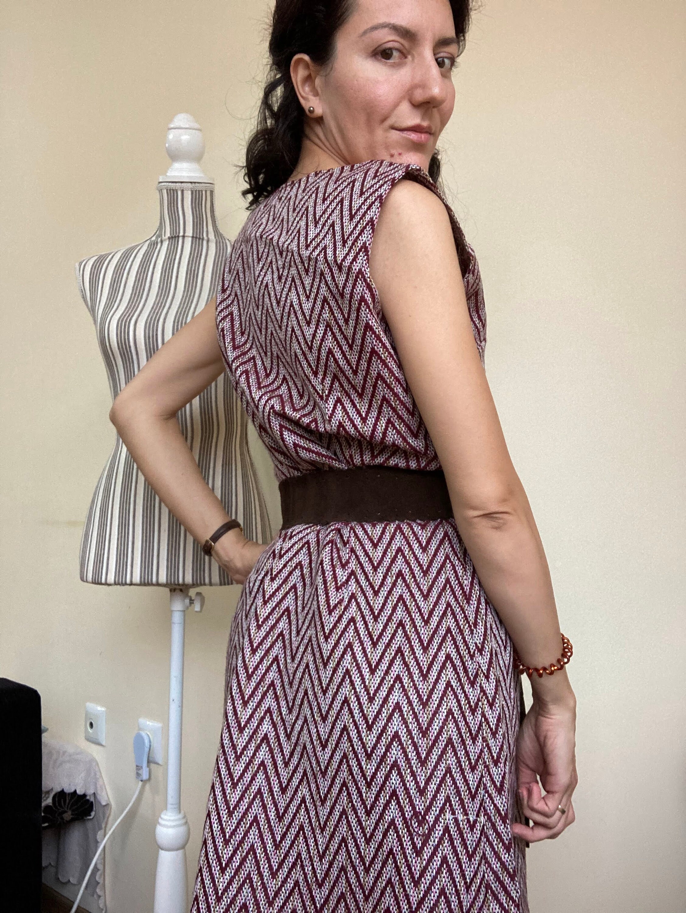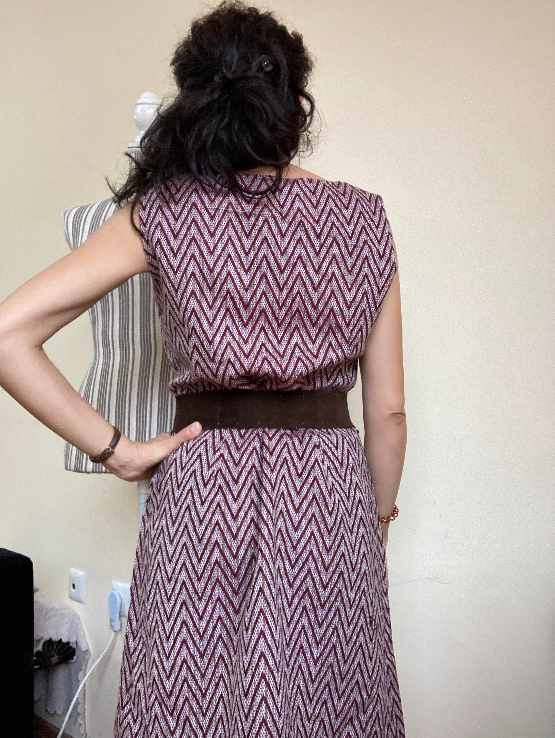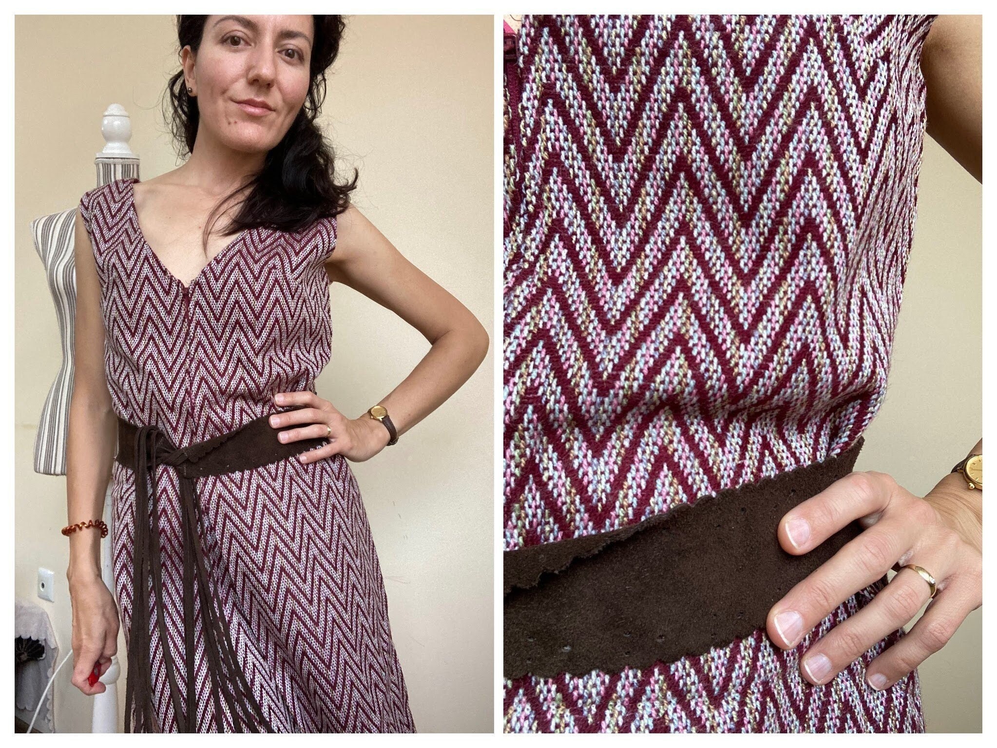 Lovely burgundy chevron dress made of warm woven carpet style fabric. This sleeveless dress has front zip closure. It has no lining (just at the top part of the back). This cute woven dress has A line shape. It has loops for a belt but the belt is missing. In the photo I am modelling the dress with a suede leather belt. It does not come with the dress. It can be purchased here - https://www.etsy.com/listing/1093058356/brown-suede-leather-belt-with-tassels?ref=shop_home_active_21&pro=1