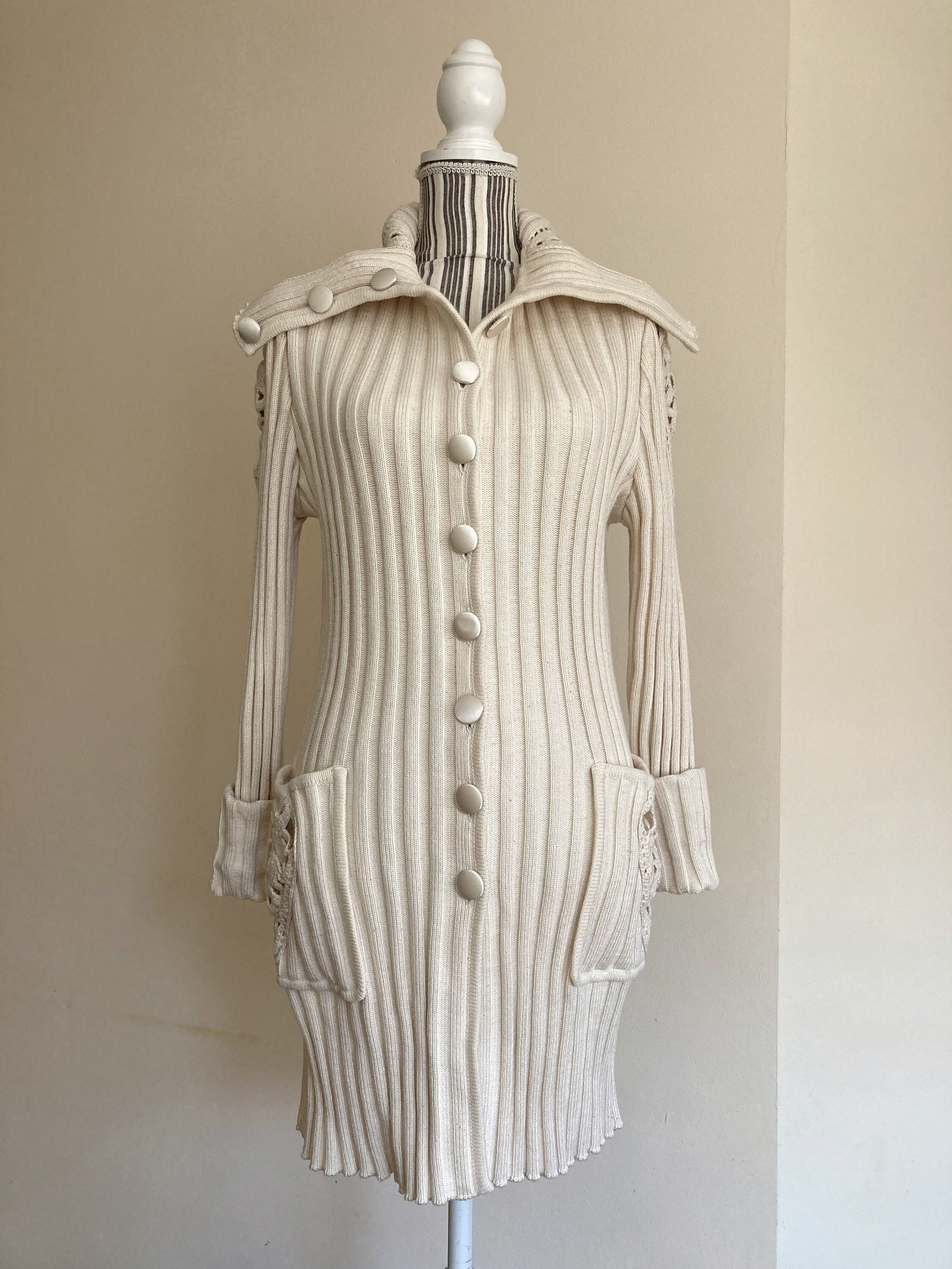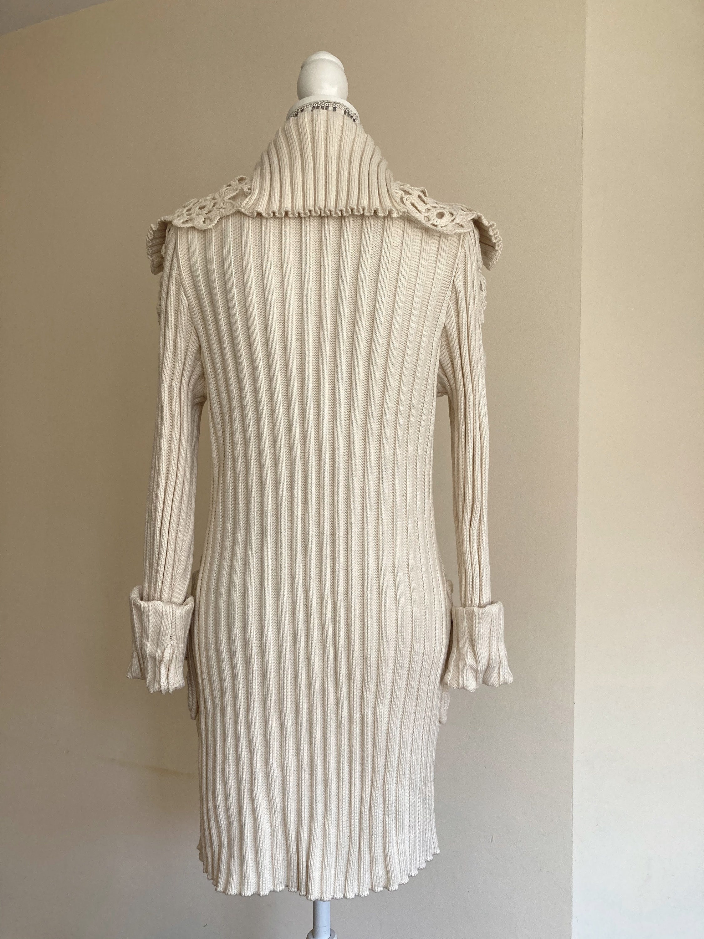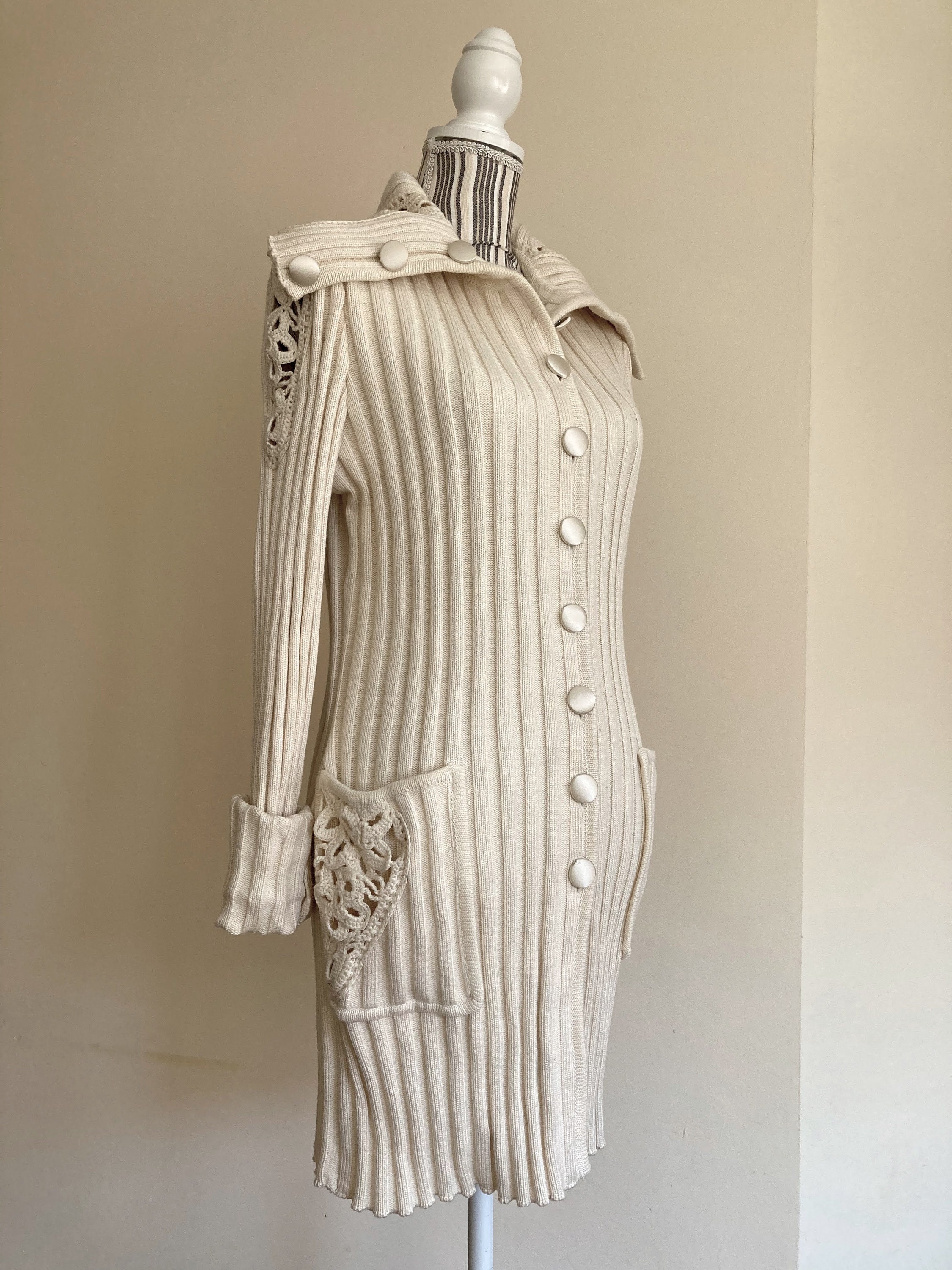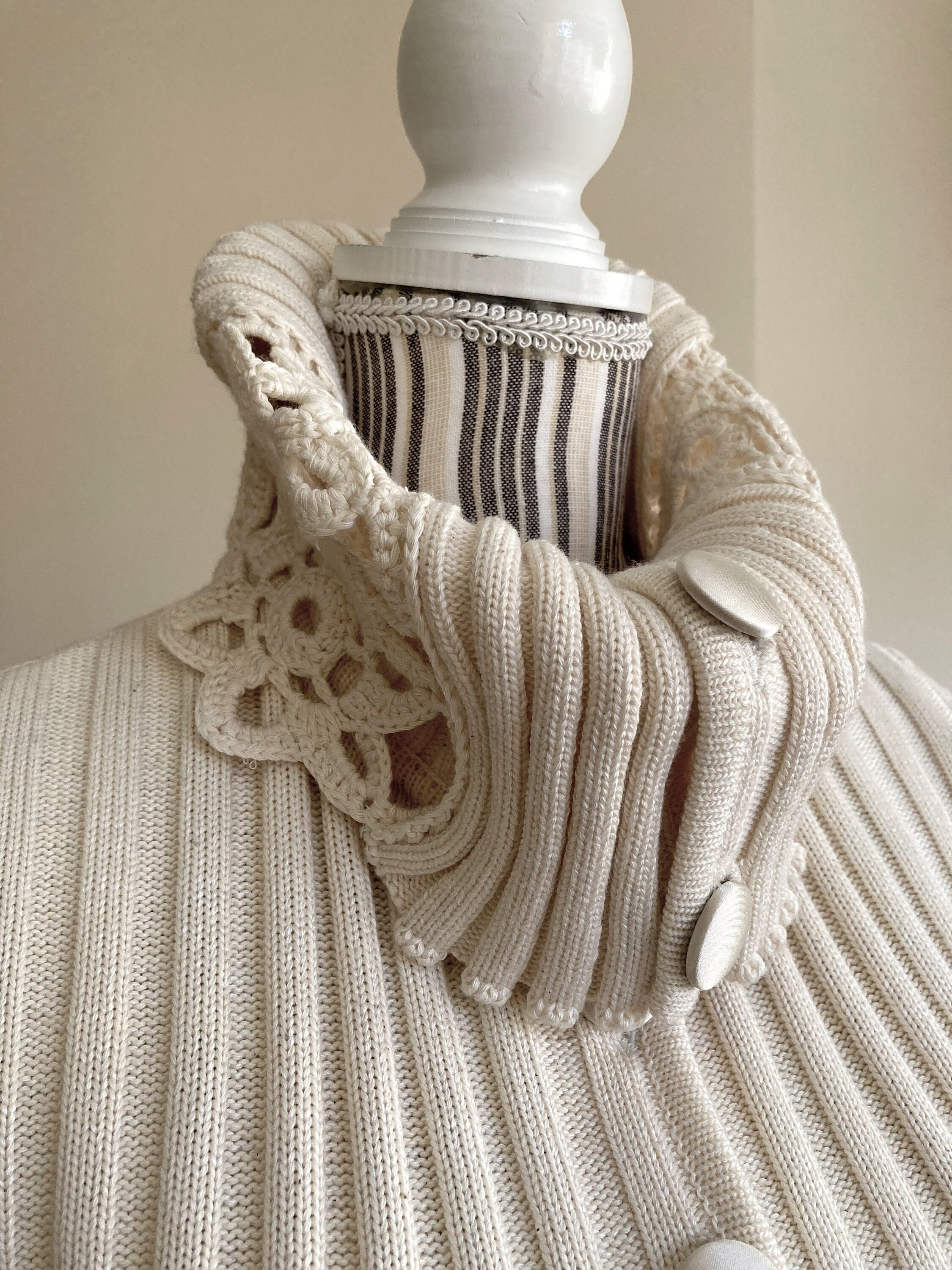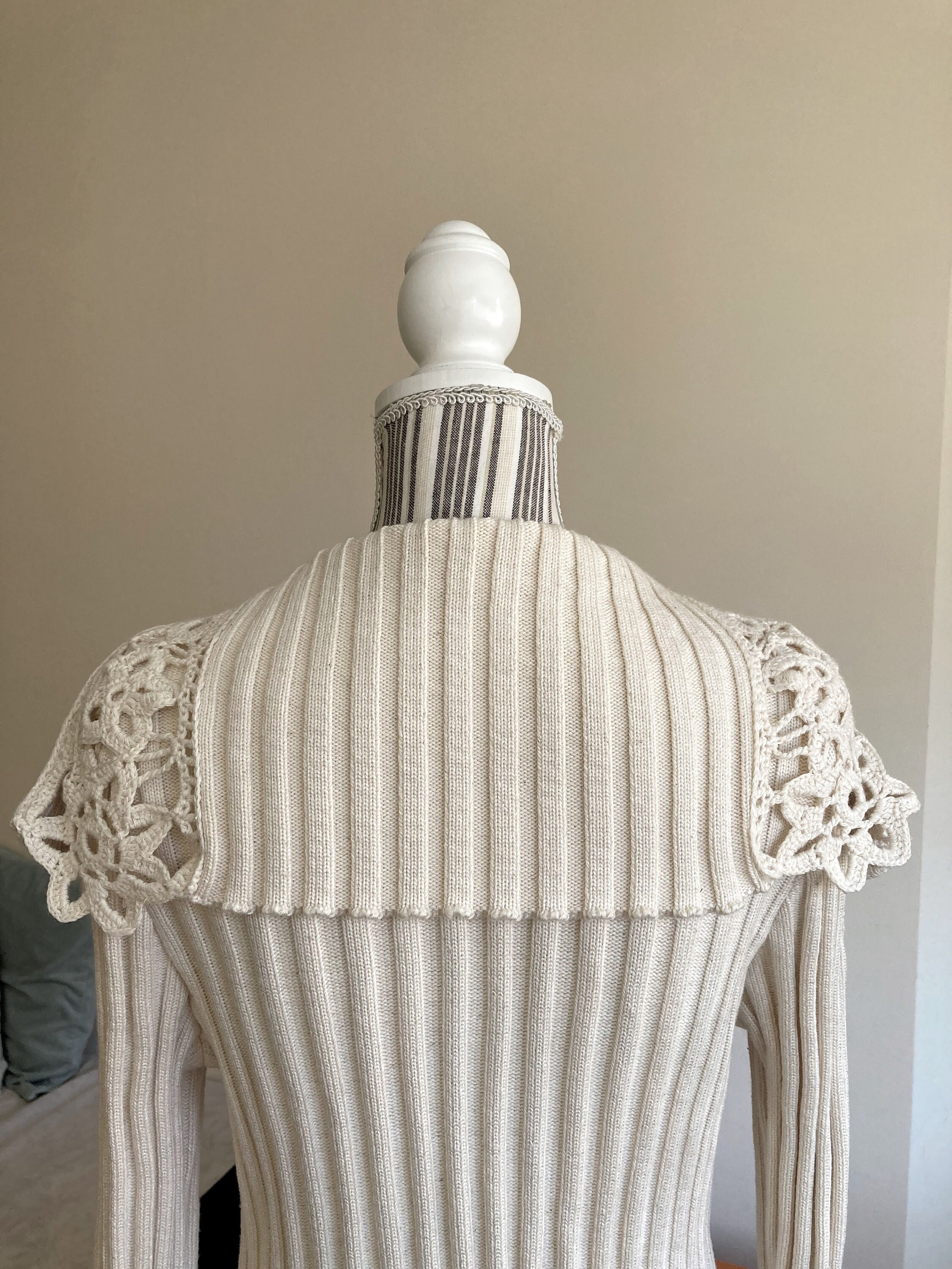 This is a lovely lace vintage cardigan in cream off white color. This ribbed knit sweater has side pockets. There are beautiful crochet inserts on the collar shoulders and pockets. This sweater cardigan has long sleeves and buttoned closure. There is no label therefore the size and materials are not marked. But this boho sweater fits like size S/M. It is made of heavy ribbed knit fabric, I believe its acrylic wool blend.
