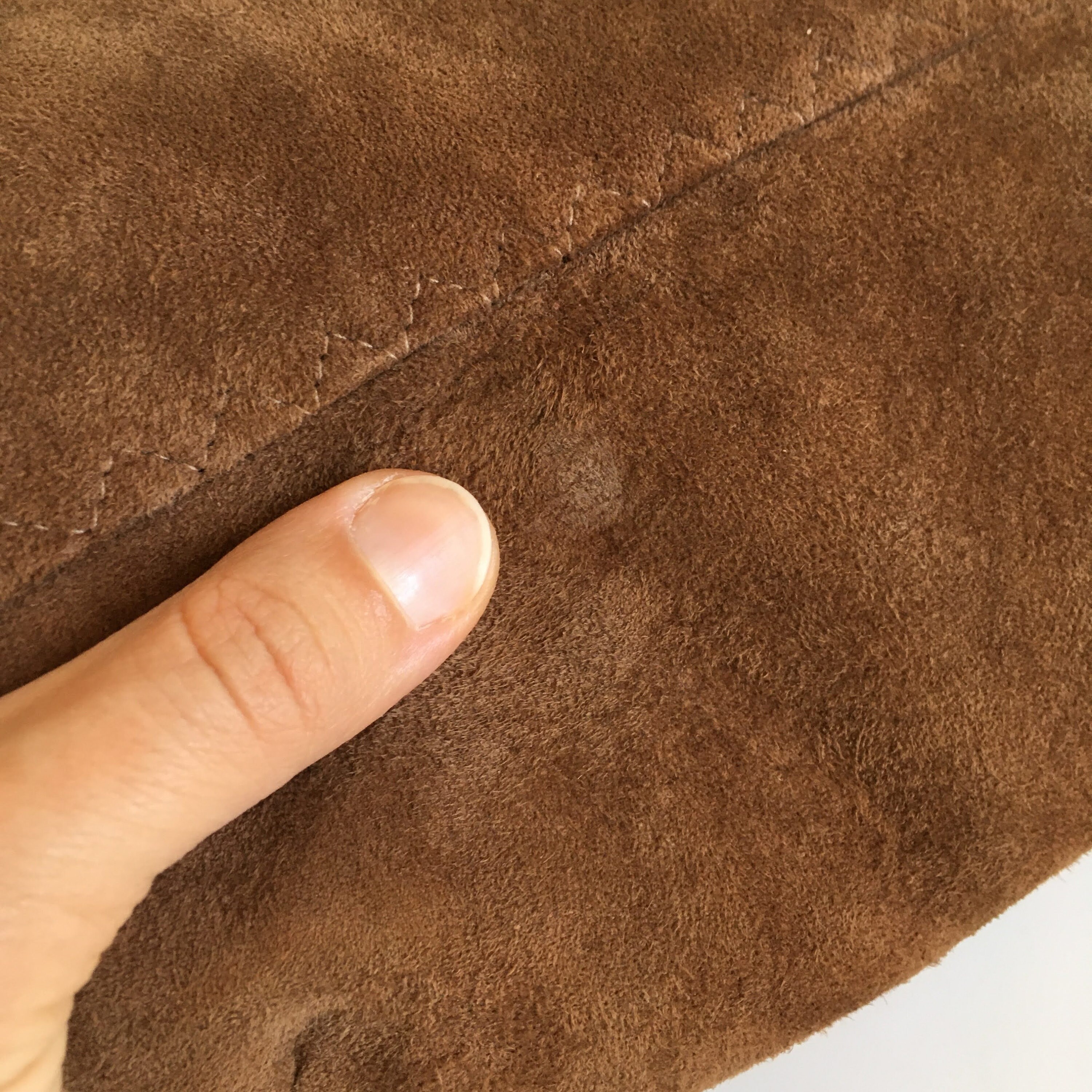 Condition: There are some signs of wear typical for suede leather items - there are some scratches and marks on the suede leather and a spot at the back. There are some untrimmed threads the top.