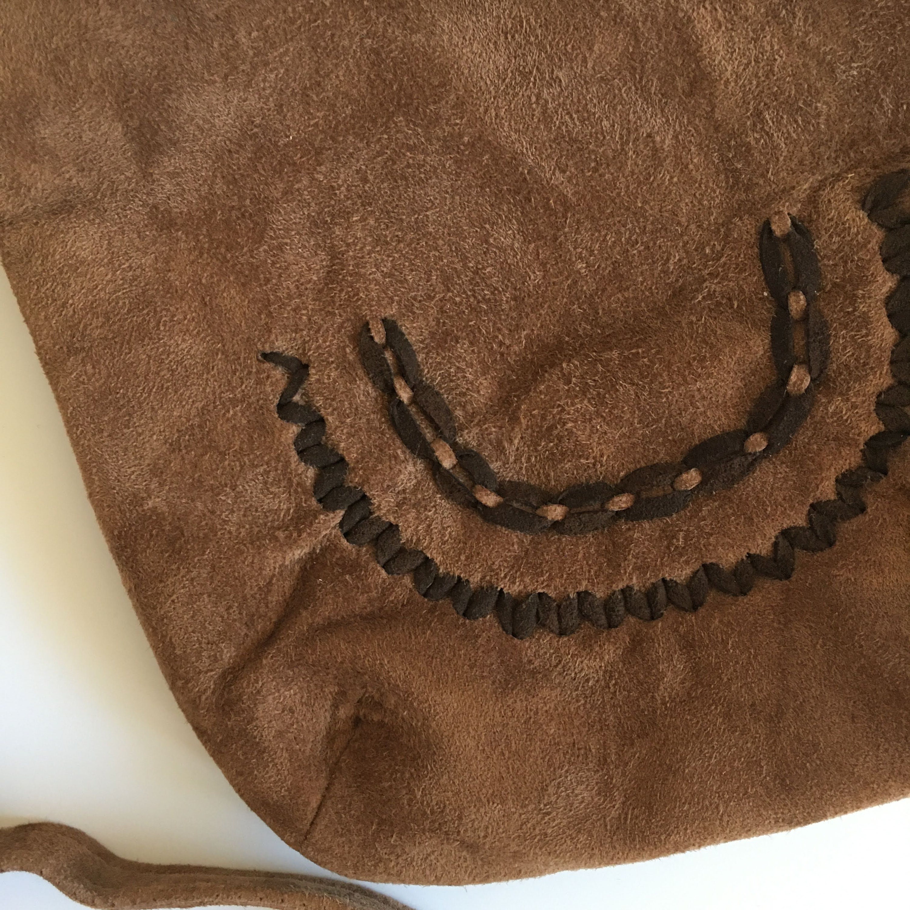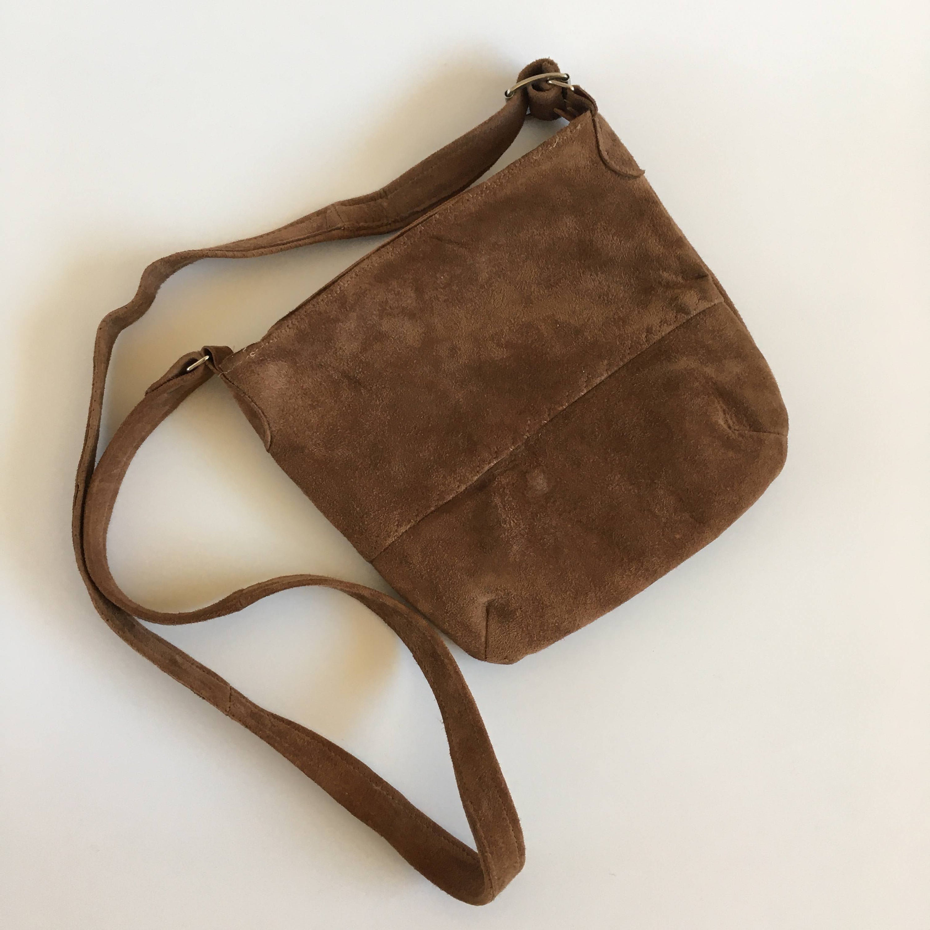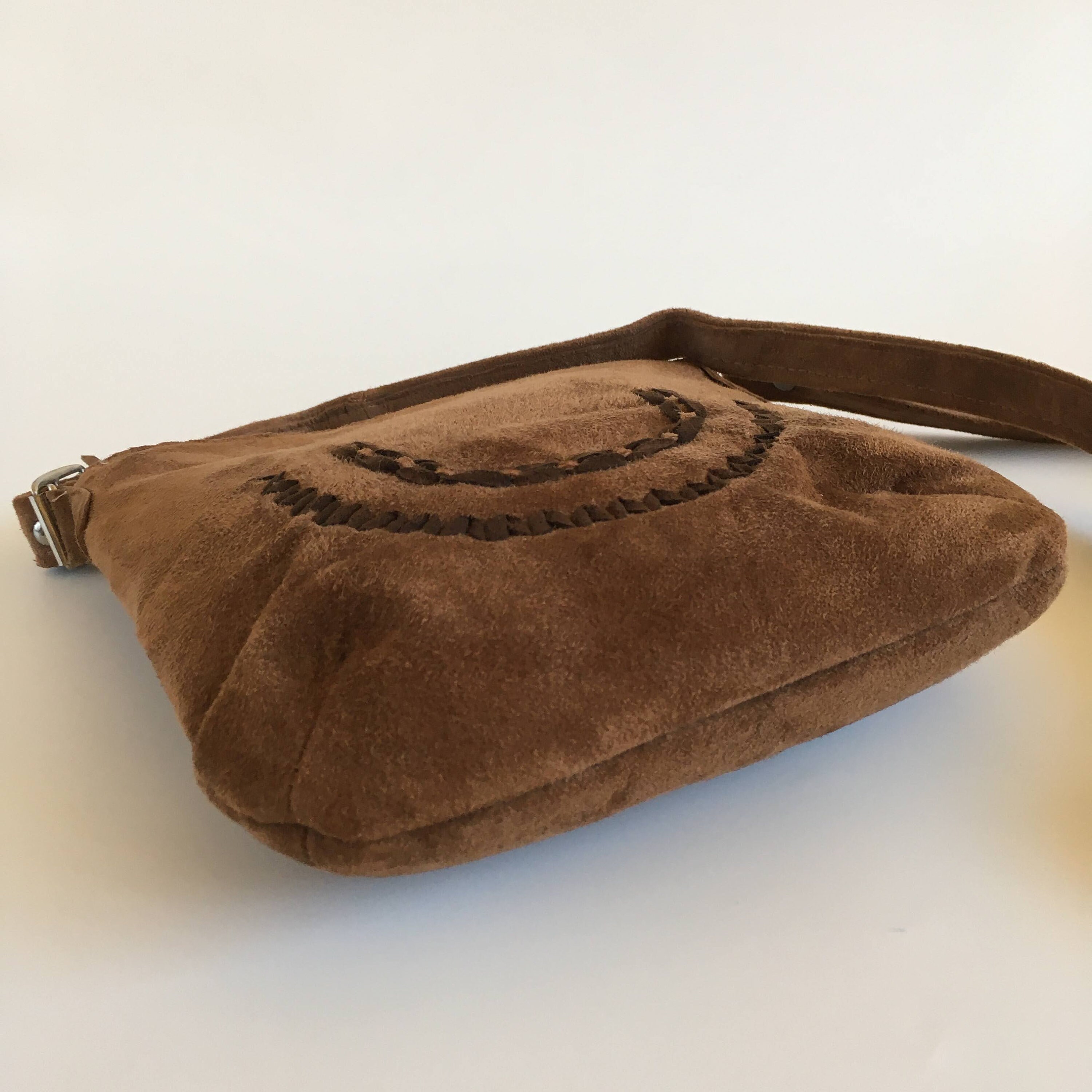 This is a soft and lightweight suede leather shoulder purse in camel brown color with dark brown leather decoration. This vintage shoulder bag has a beautiful boho look. This purse can be worn as a shoulder or as a crossbody bag, although the strap is not very long, depending on how you like to wear crossbody bags. It has top zip closure. There is one compartment and two slip pockets inside. The interior is lined in brown polyester fabric