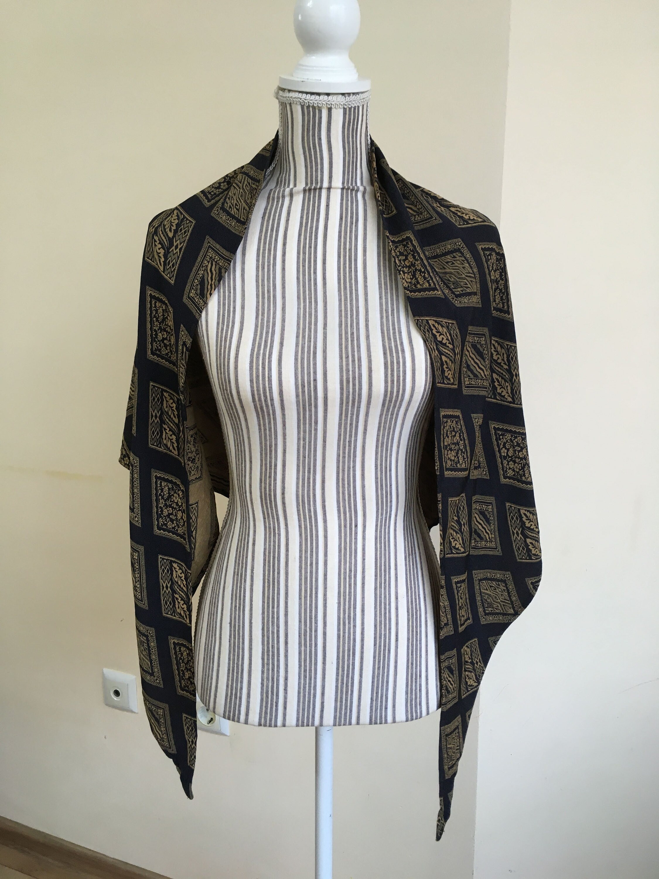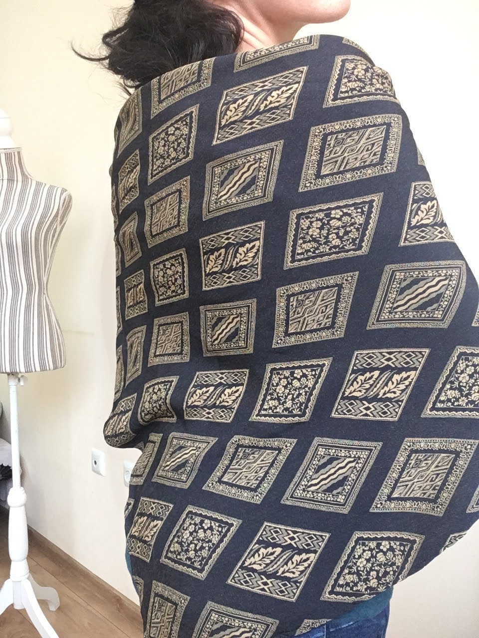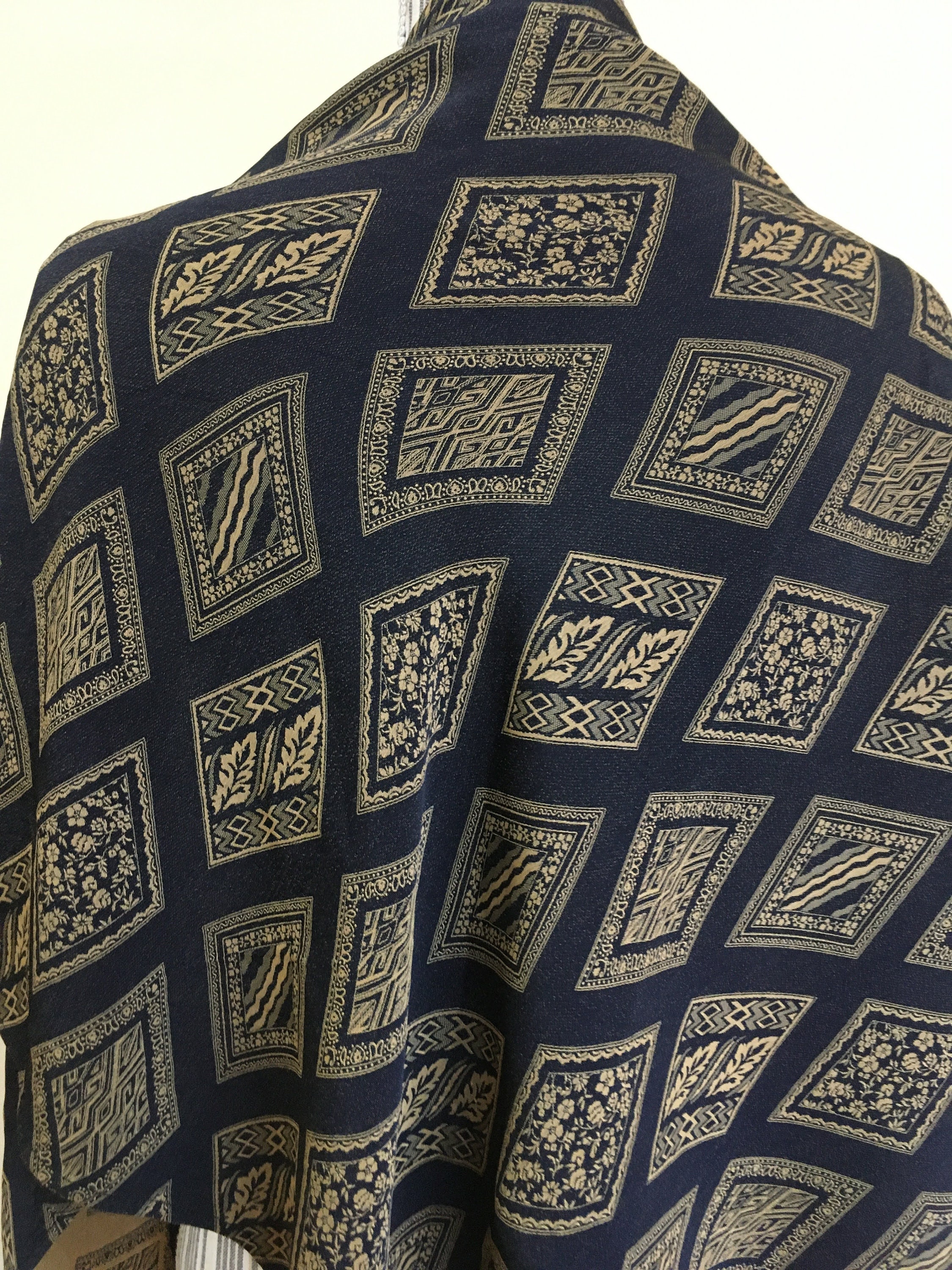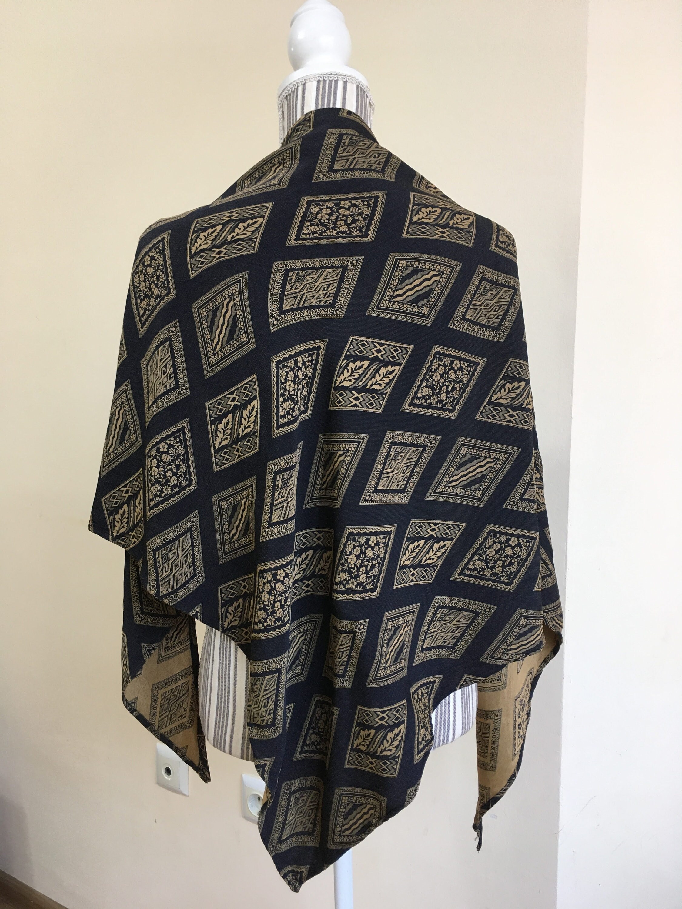 This is a vintage jacquard shawl in black and mustard yellow color. The front side is the black one, although you could wear it with the gold tone/ mustard yellow side too if you don't mind the rolled ends. Beautiful geometric rhombus print will add a pop of art deco feel to your outfit.