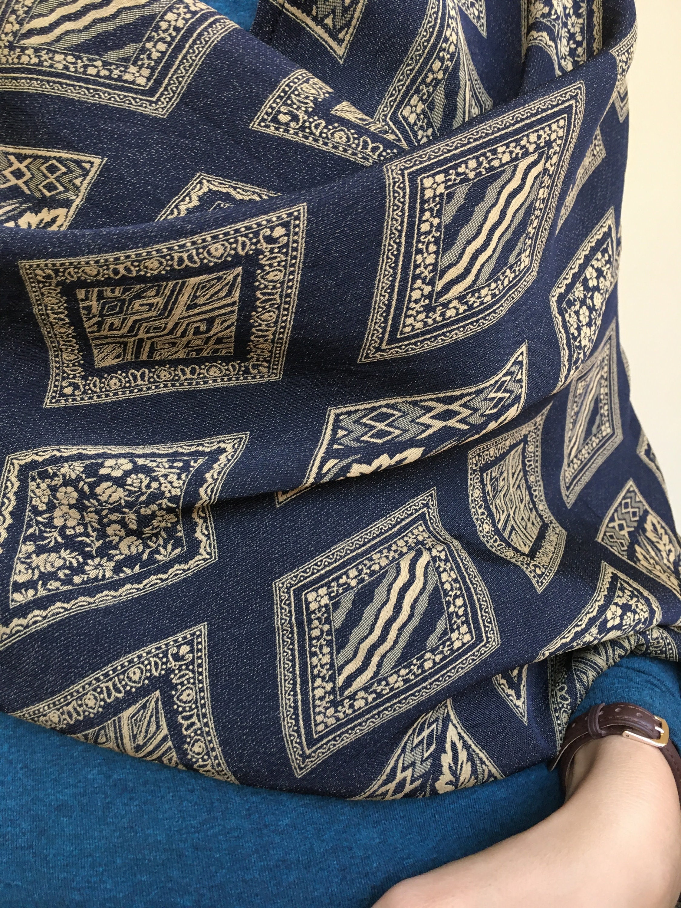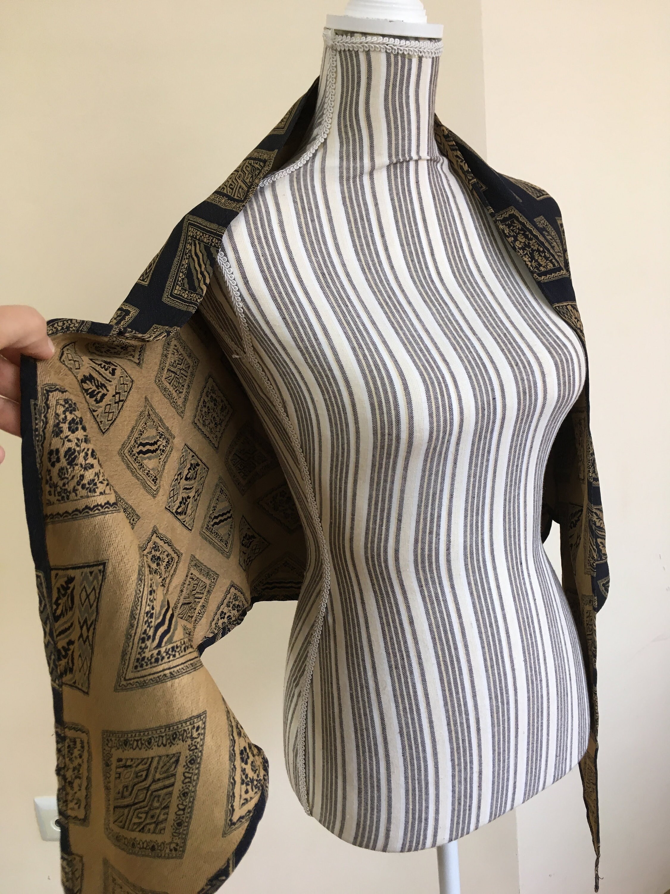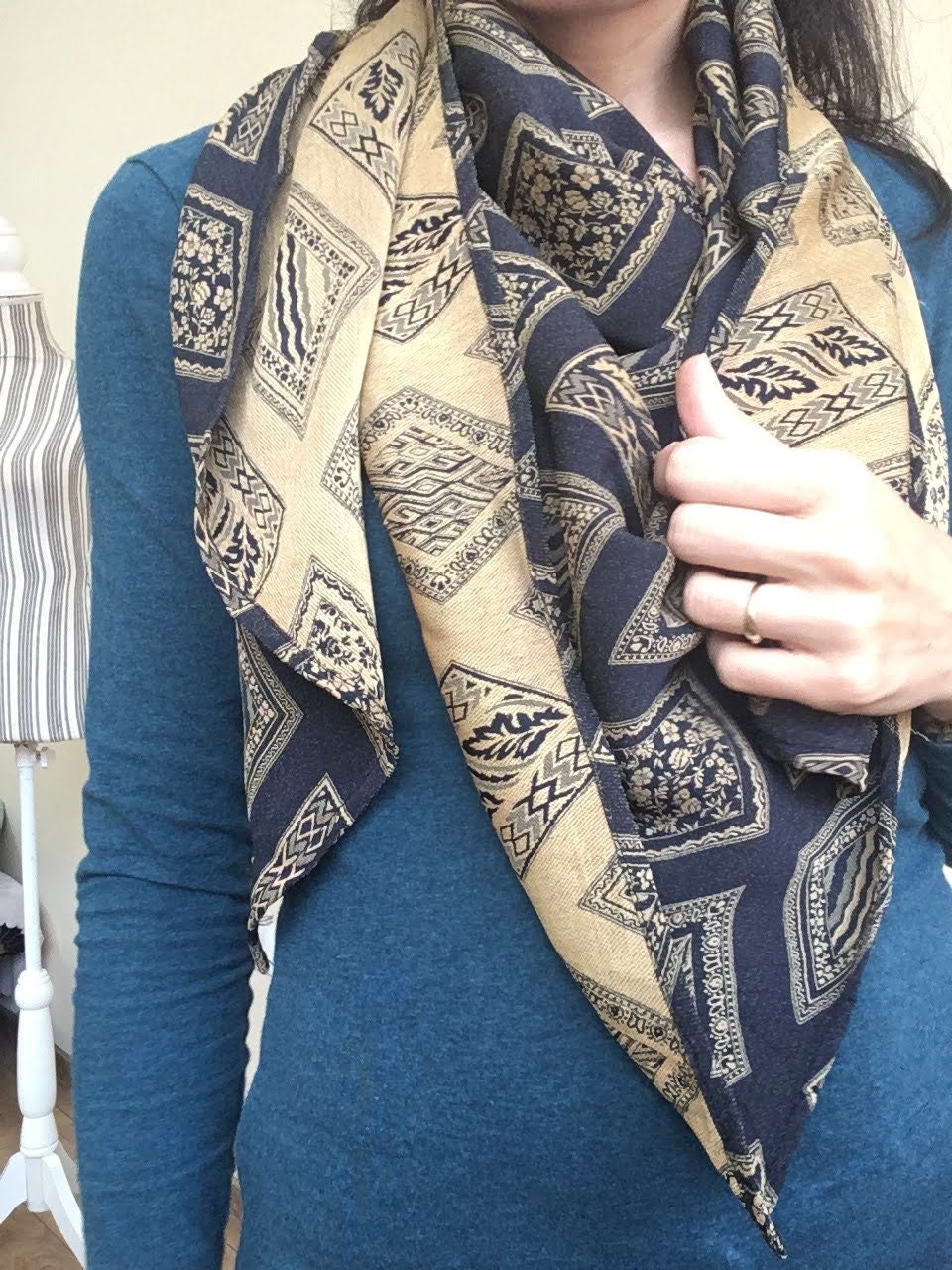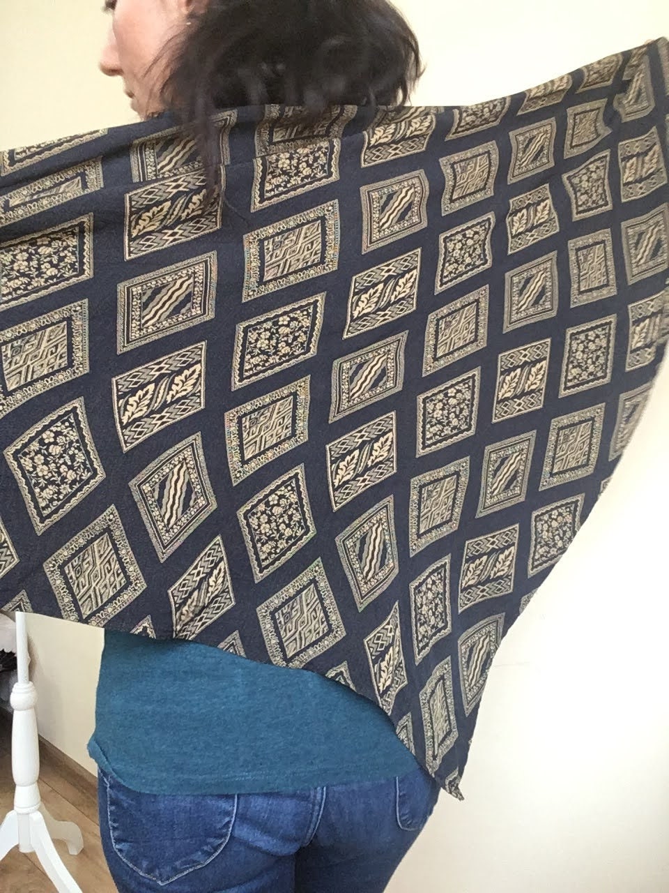 This is a vintage jacquard shawl in black and mustard yellow color. The front side is the black one, although you could wear it with the gold tone/ mustard yellow side too if you don't mind the rolled ends. Beautiful geometric rhombus print will add a pop of art deco feel to your outfit.