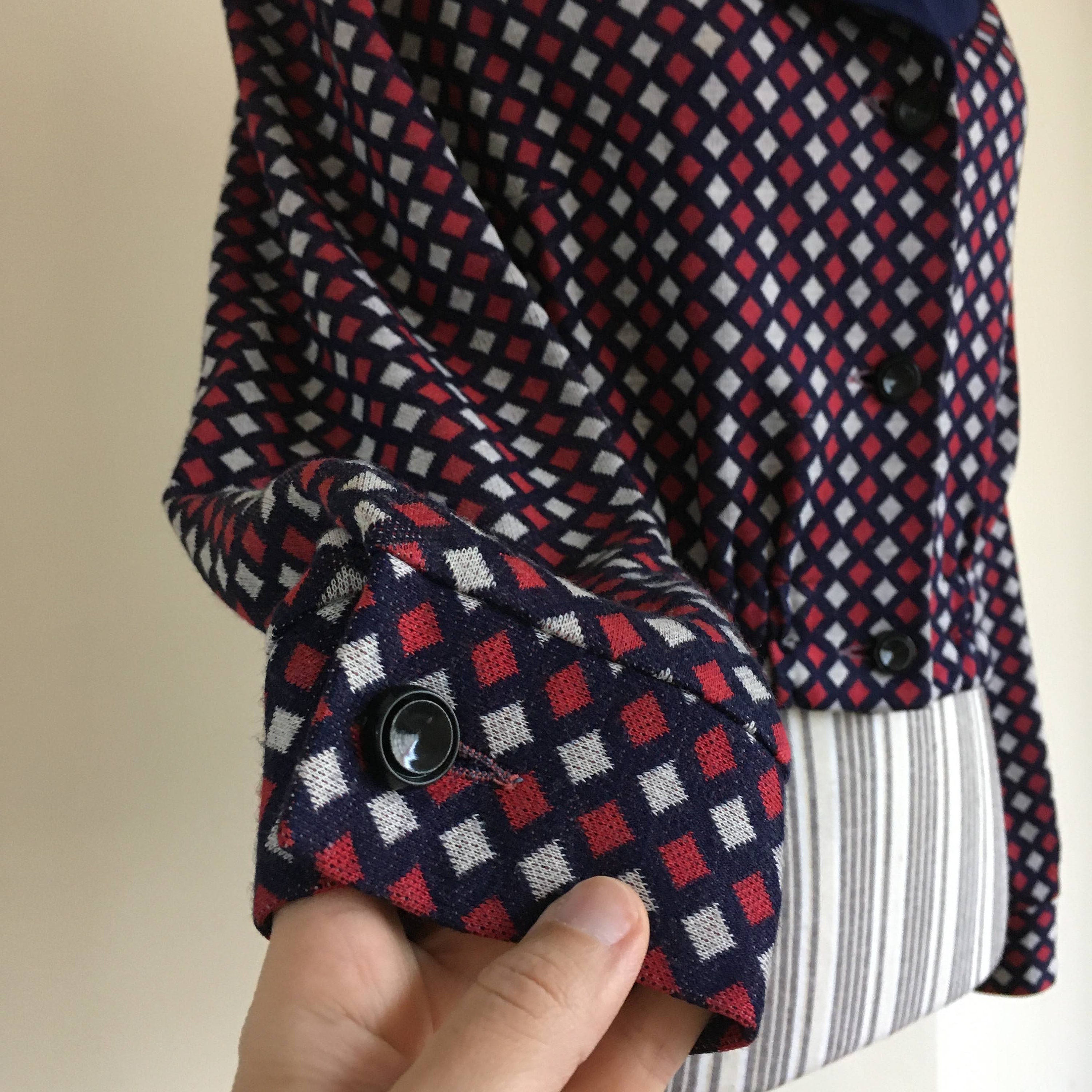 Condition: There are some horizontal lines that go across the blazer, it seems that the fabric is like this, as I only spotted one tiny pulled thread close to the collar on the left side.