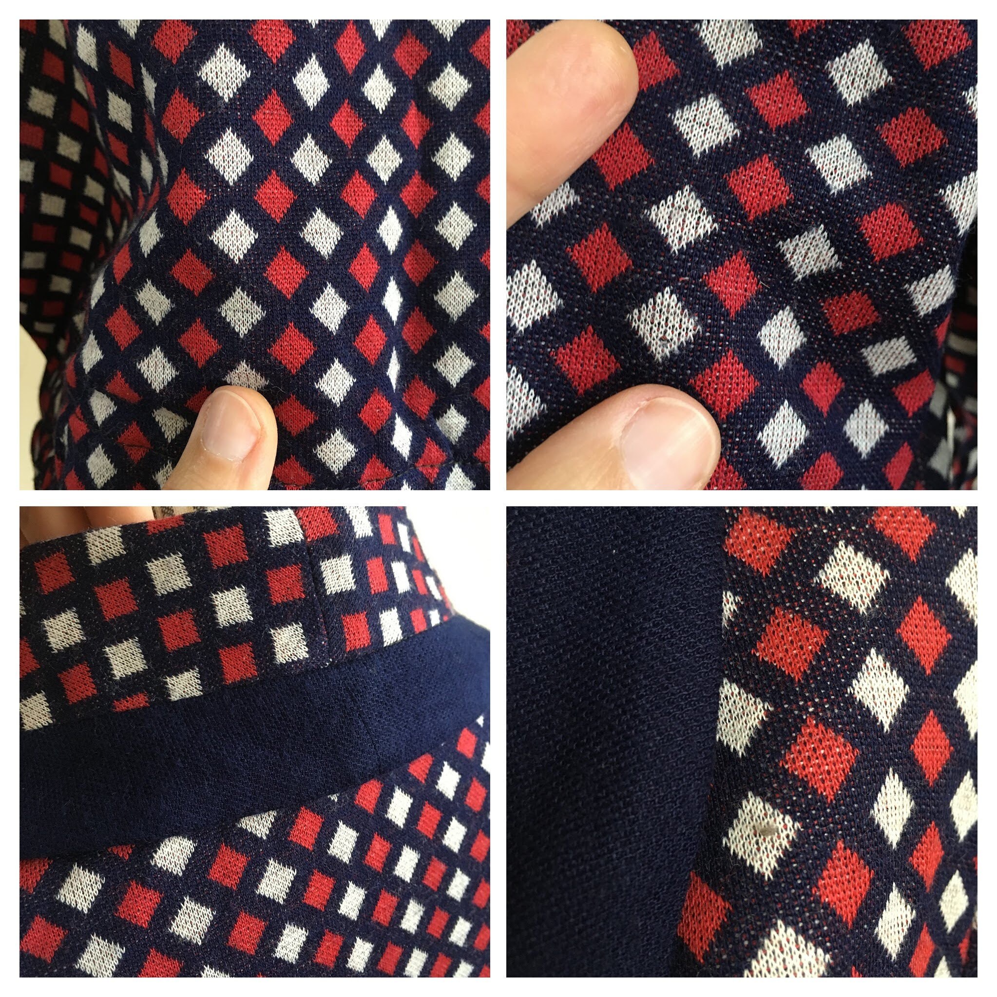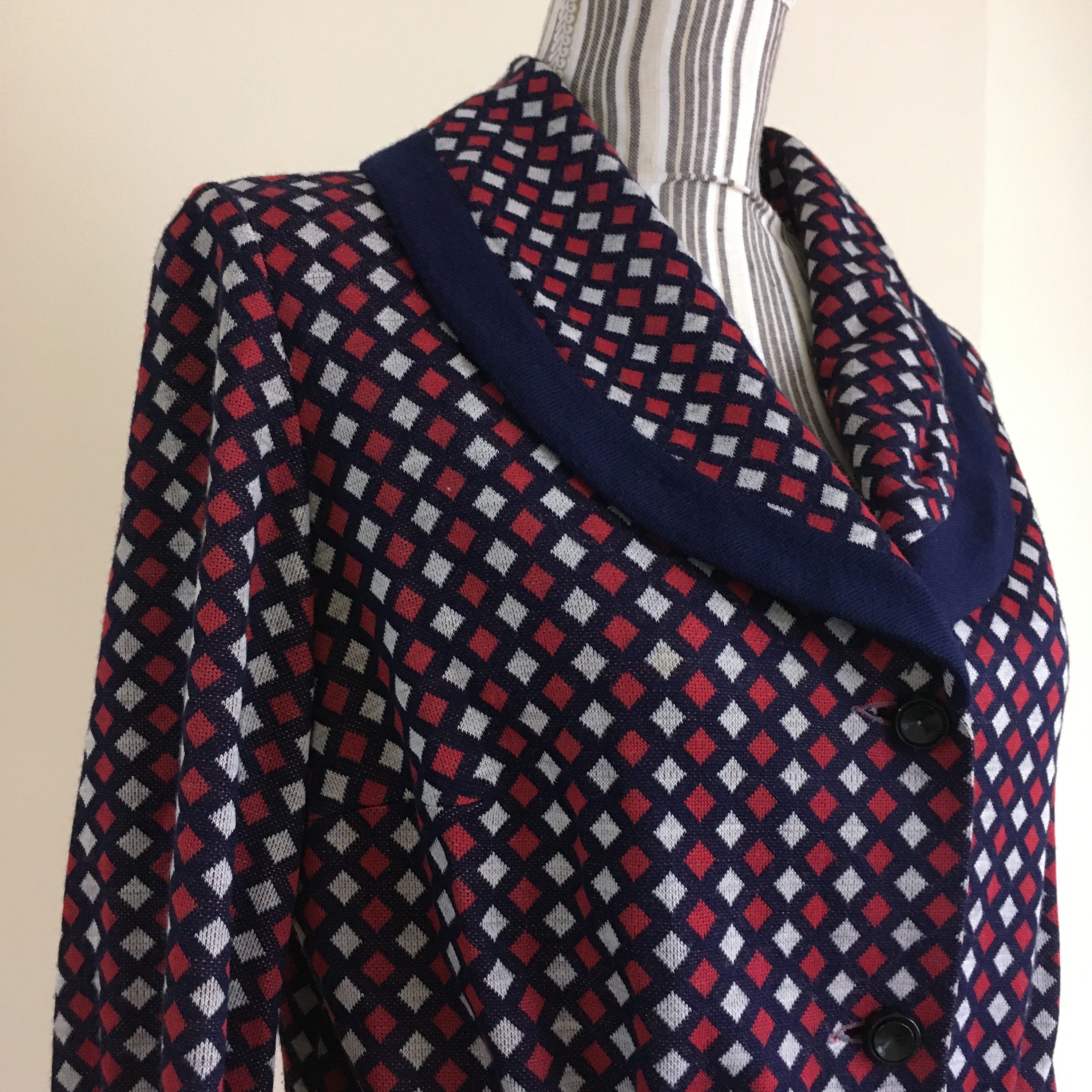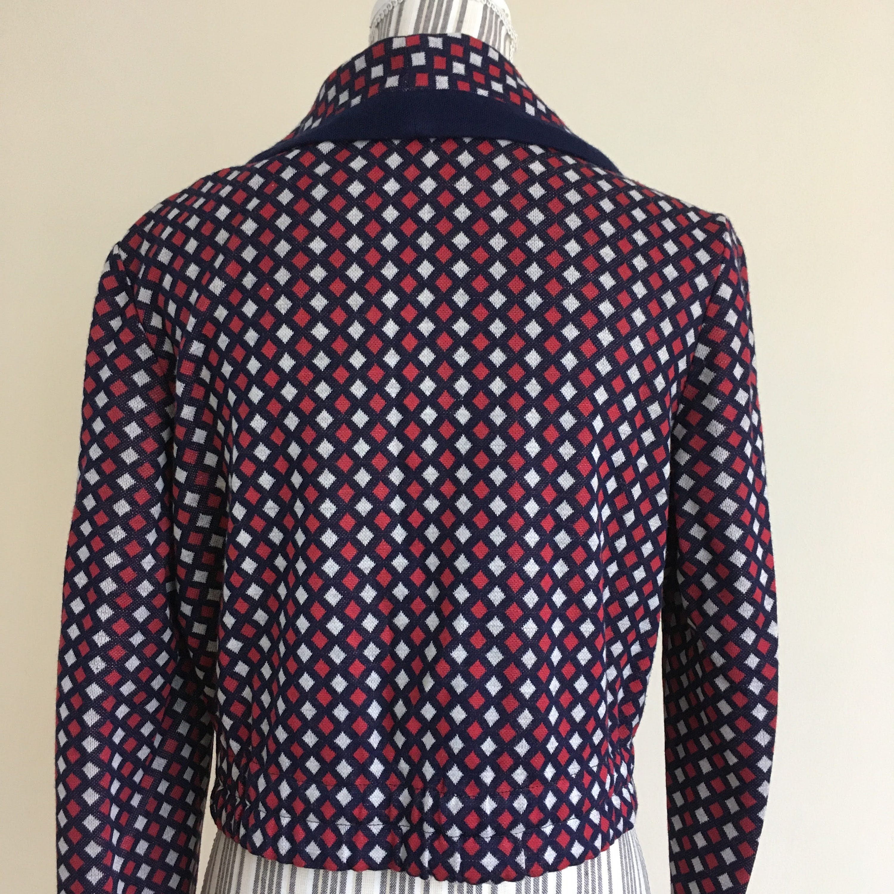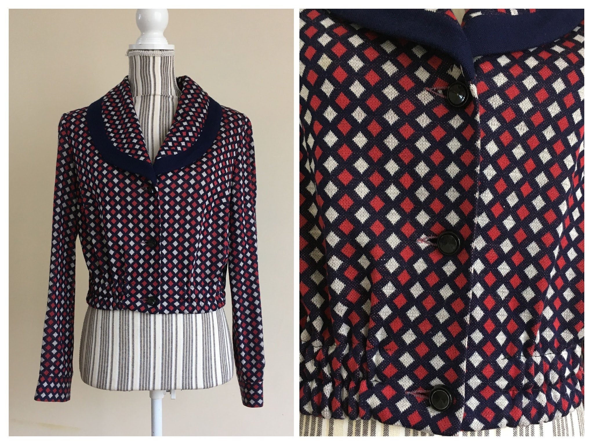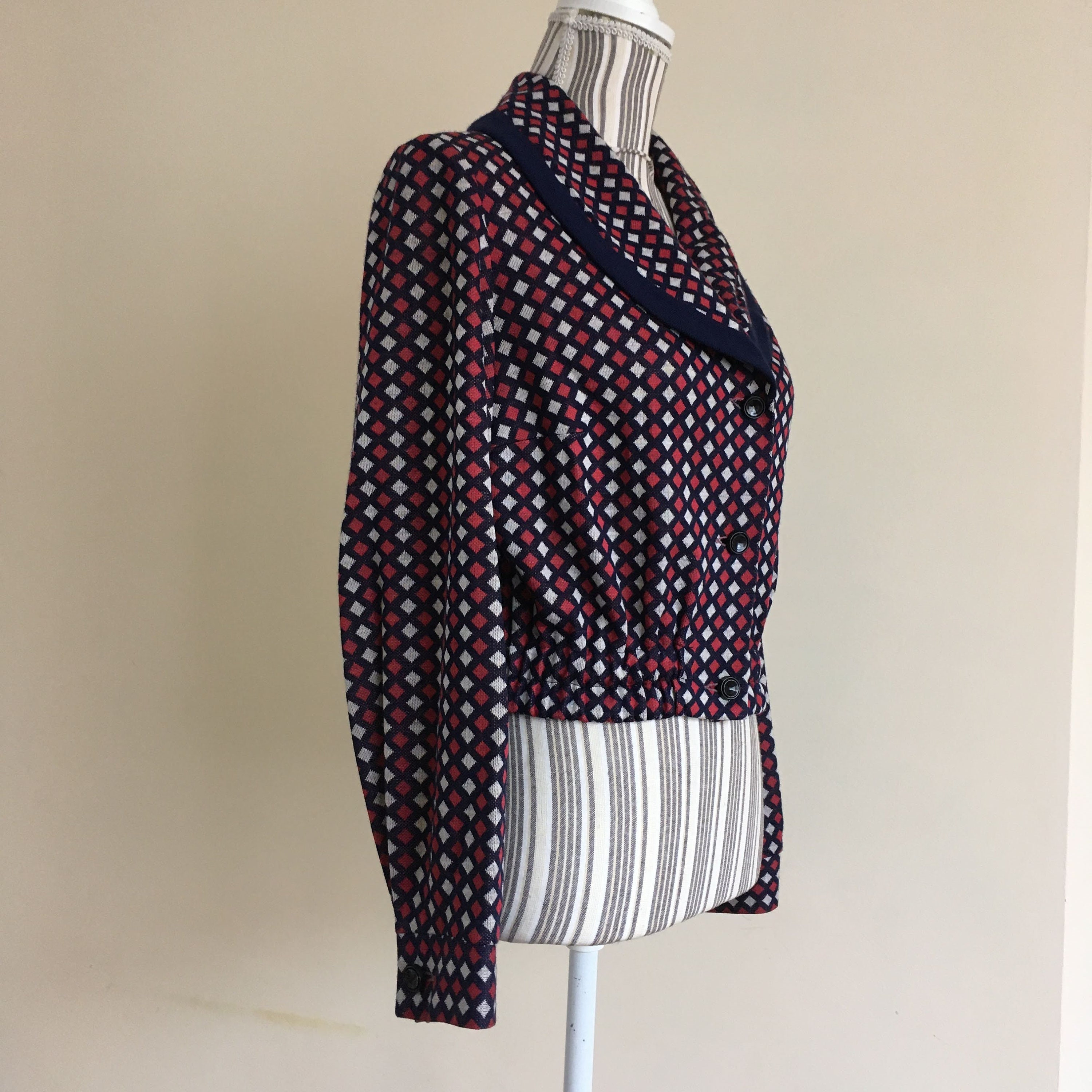 This is a vintage 80s geometric print unlined button up blazer for women. It is made of synthetic fabric with no lining underneath. This button down coat was made in Bulgaria by the brand Boriana. The size marked is 46, but in fact it fits like size small. Please check the measurements below.