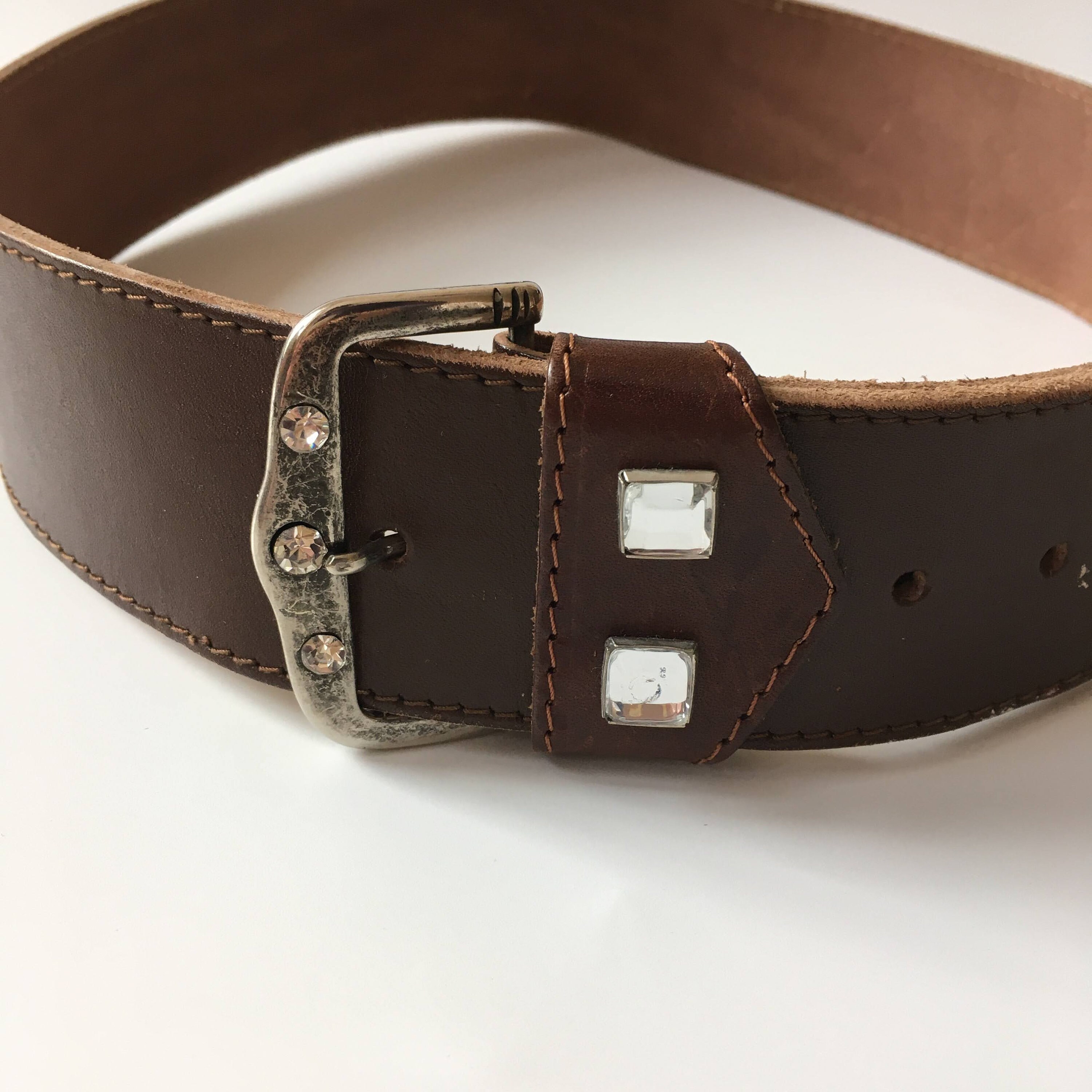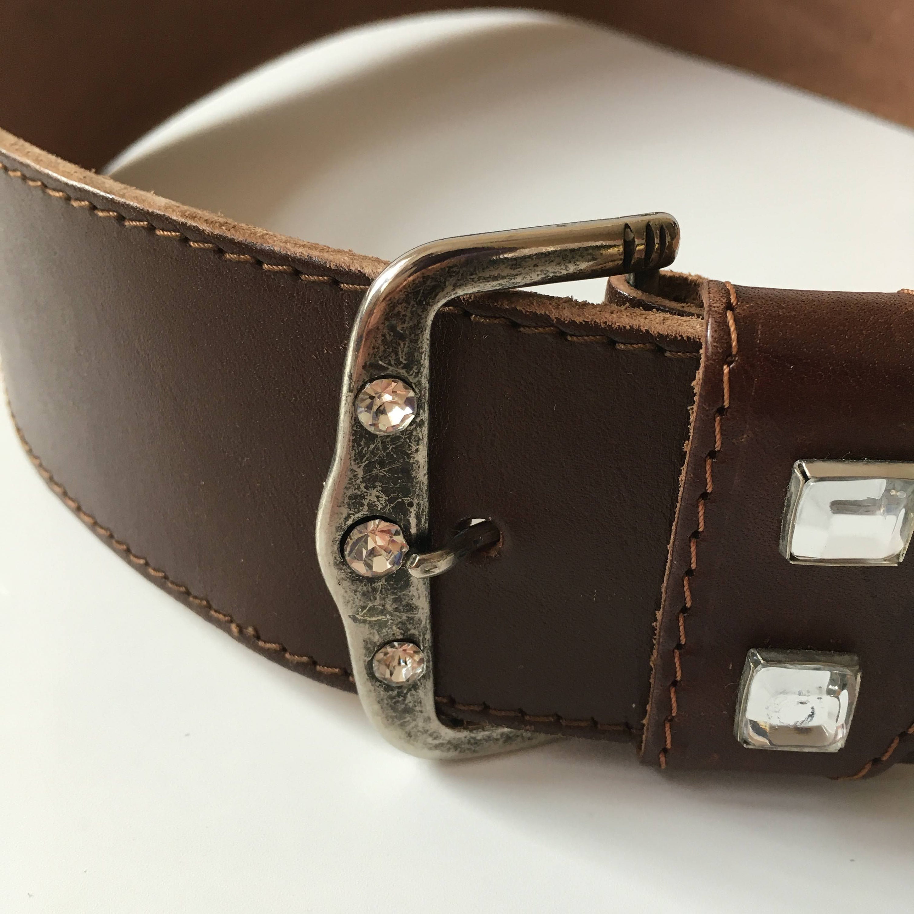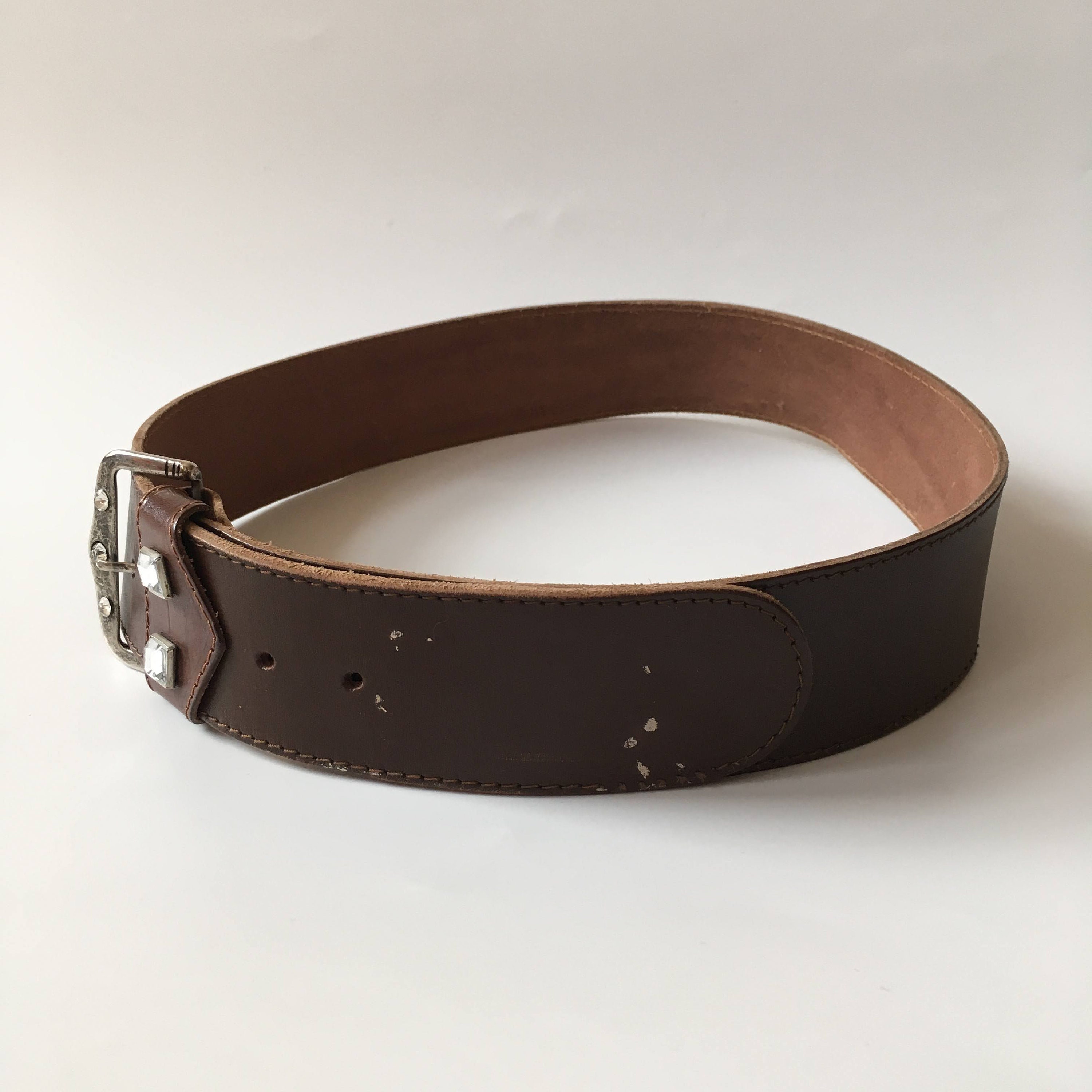 This is a vintage 90s brown leather belt with embellished silver tone buckle. This wide waist belt is made of natural leather and silver tone jewelled buckle. There is no size marked on the belt. It can adjust from 28.7" / 73 cm to 32.3" / 82 cm. It is 2" / 5 cm wide.