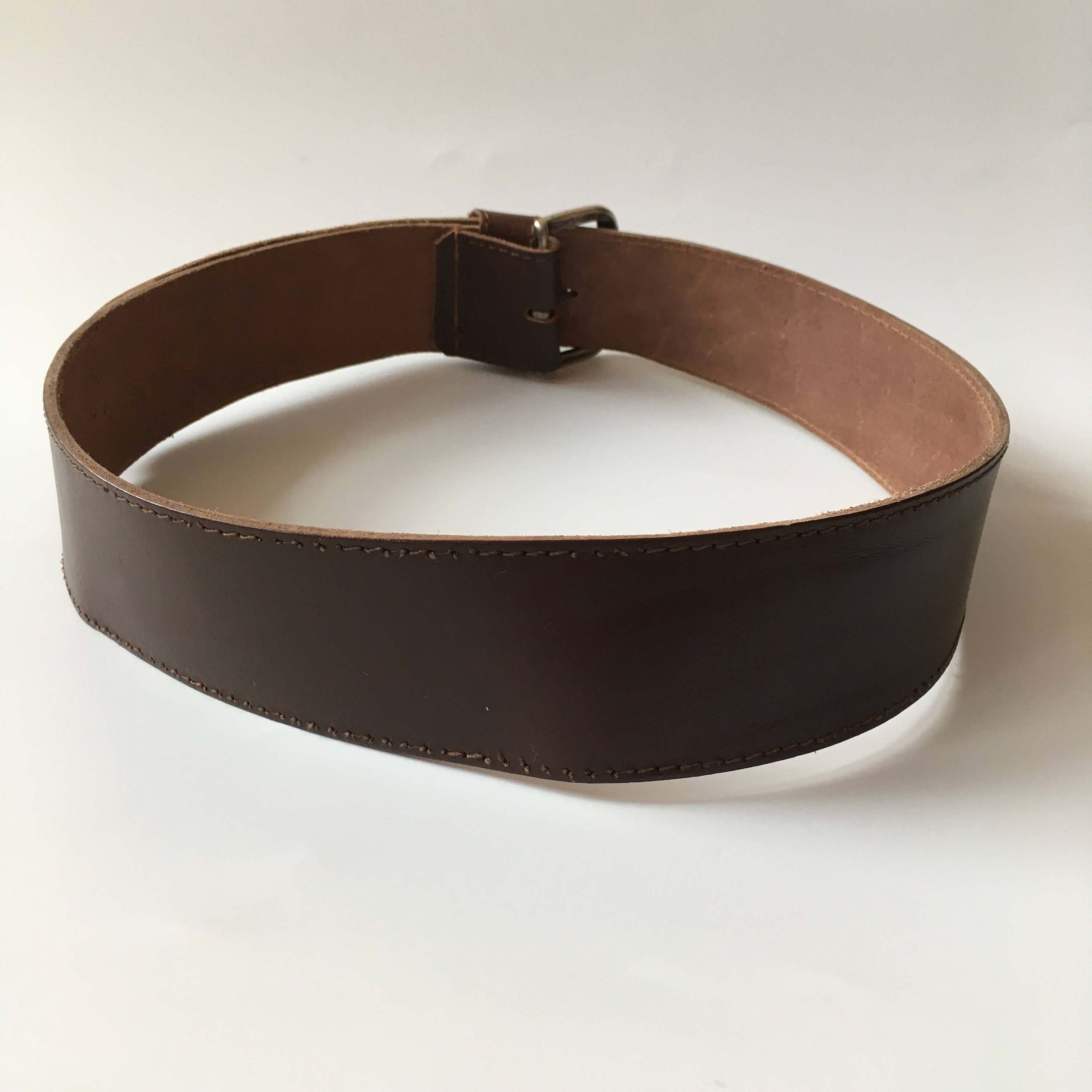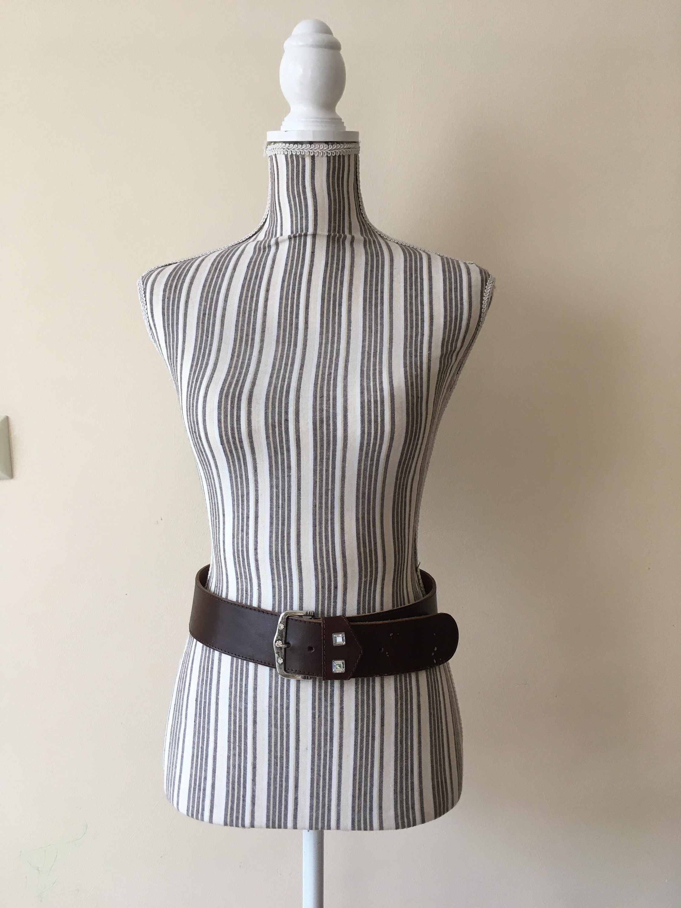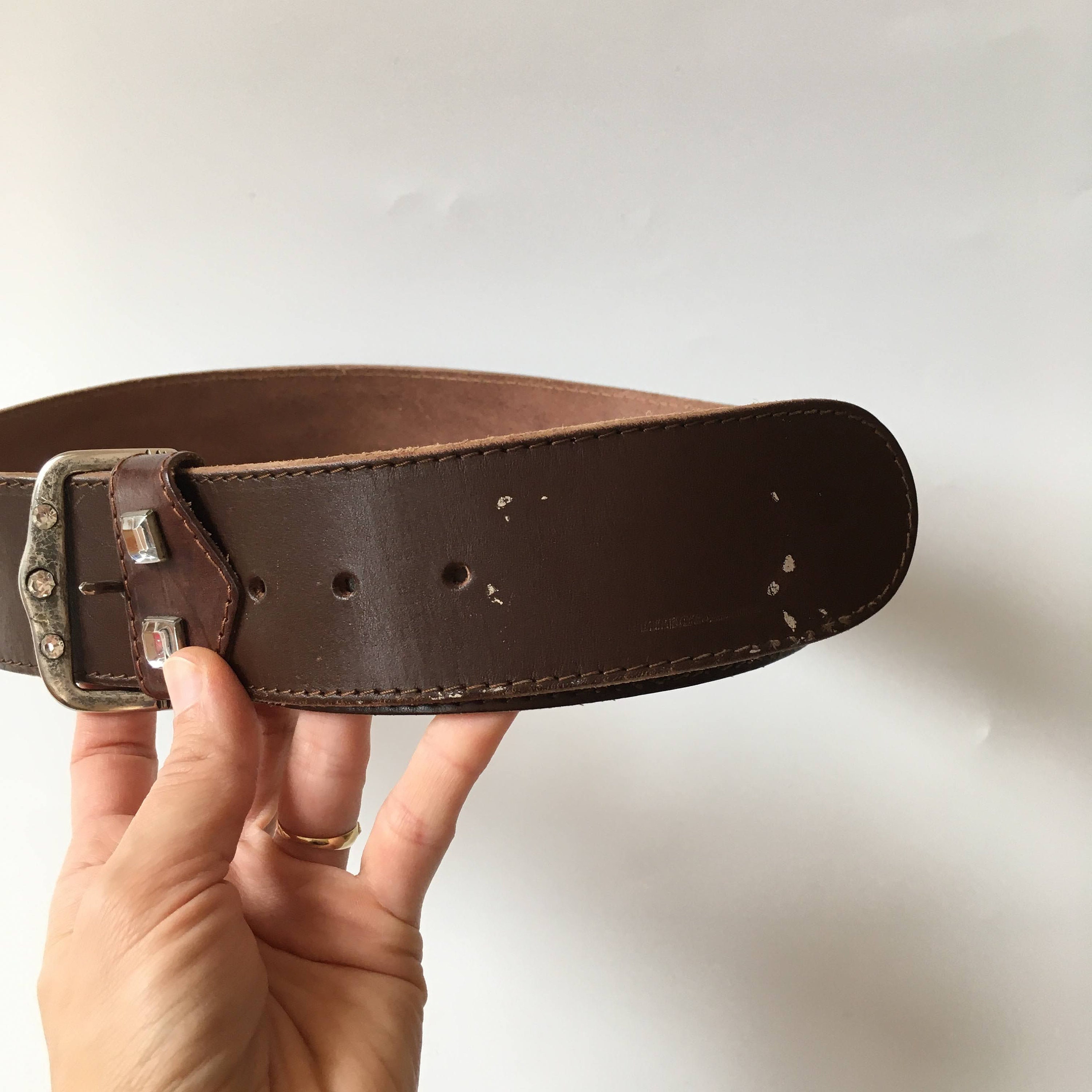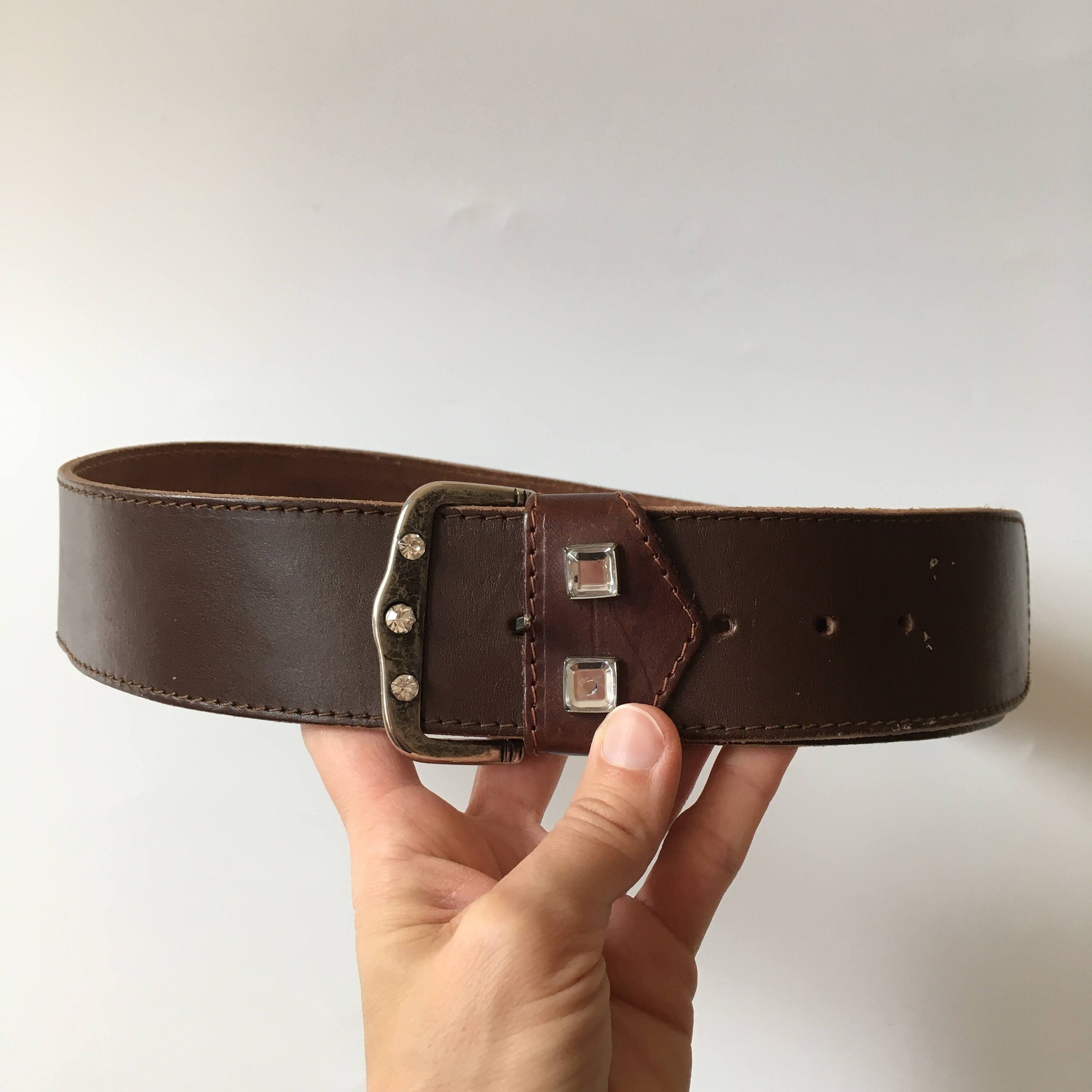 This is a vintage 90s brown leather belt with embellished silver tone buckle. This wide waist belt is made of natural leather and silver tone jewelled buckle. There is no size marked on the belt. It can adjust from 28.7" / 73 cm to 32.3" / 82 cm. It is 2" / 5 cm wide.