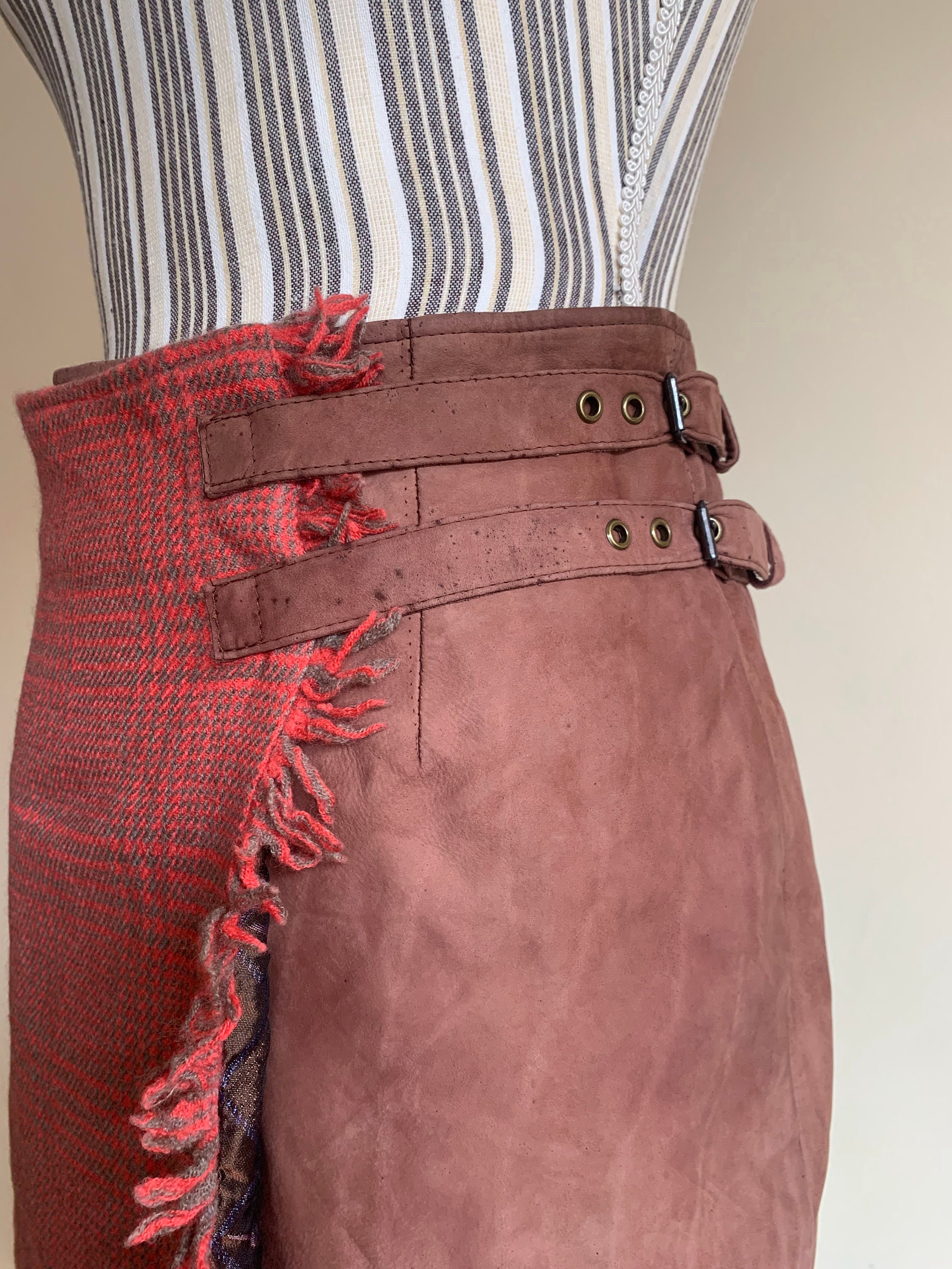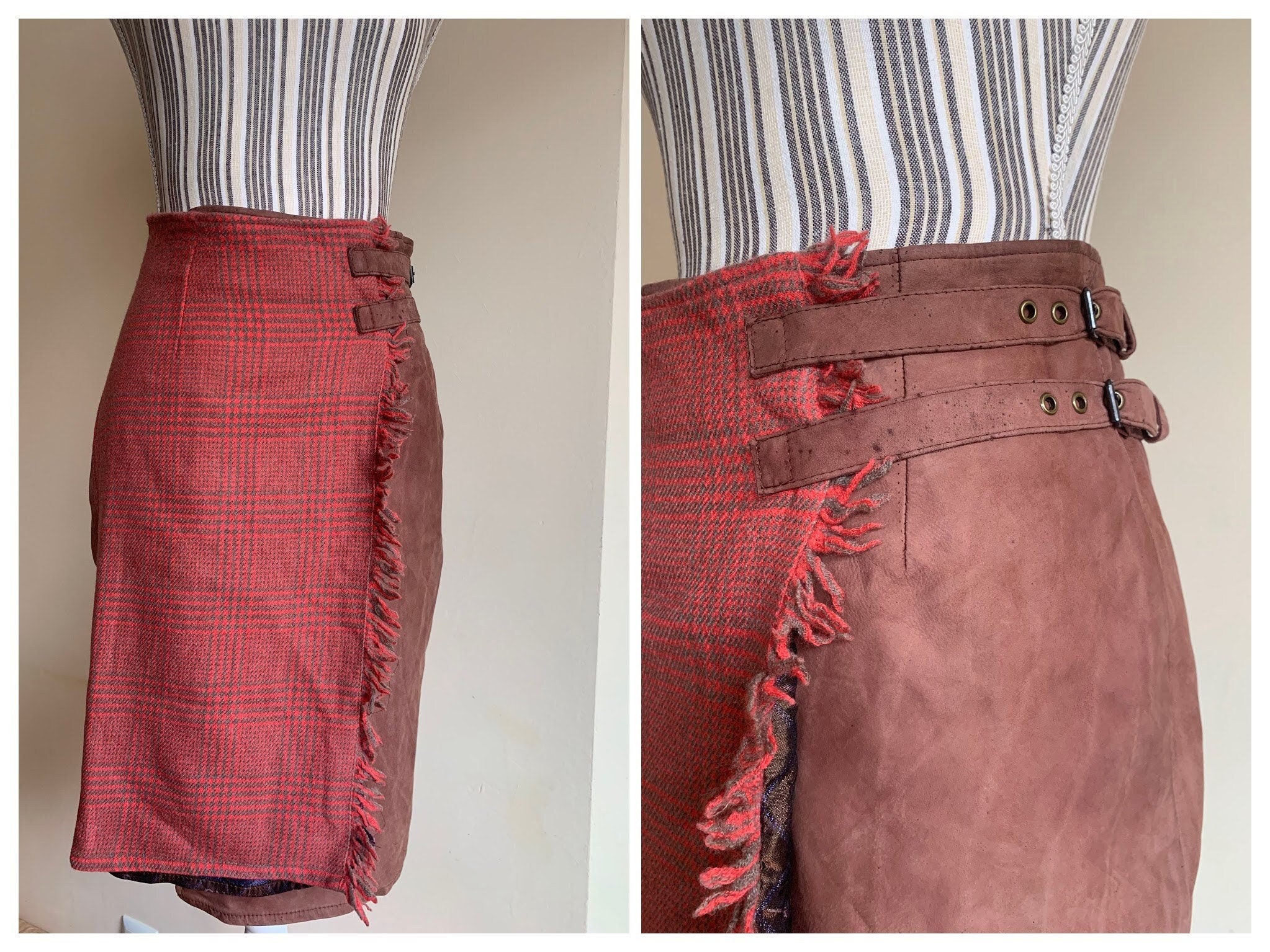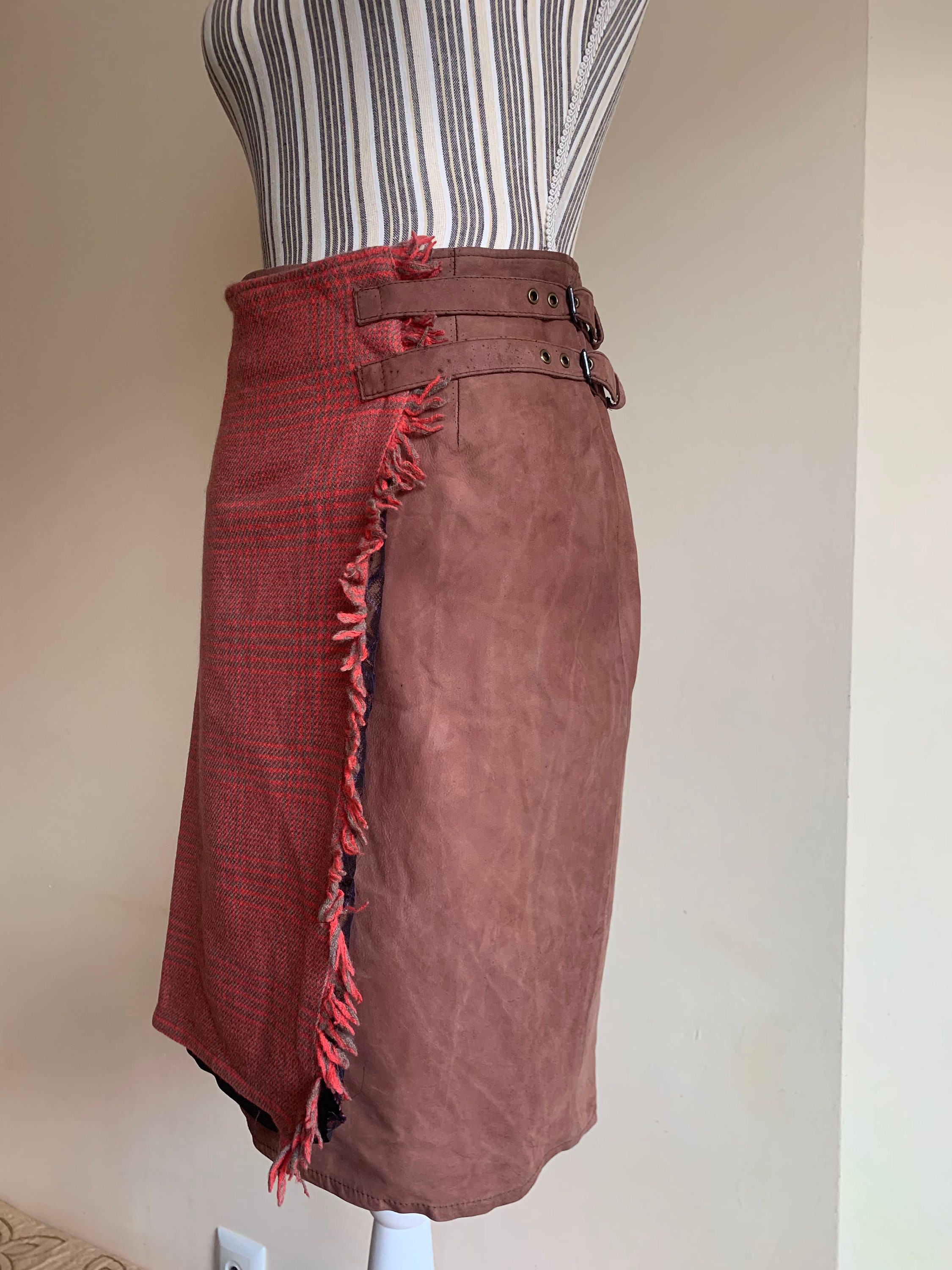 This is a vintage 80s wrap skirt with side buckles by the Italian brand Nazareno Gabrielli. This vintage pencil skirt has no label to specify the materials or the size. This buckle skirt fits like size S/M, please check the measurements below. It is made of genuine leather in brown color and wool front with plaid houndstooth pattern. This knee length skirt has satin like monogramed lining which feels like polyester.