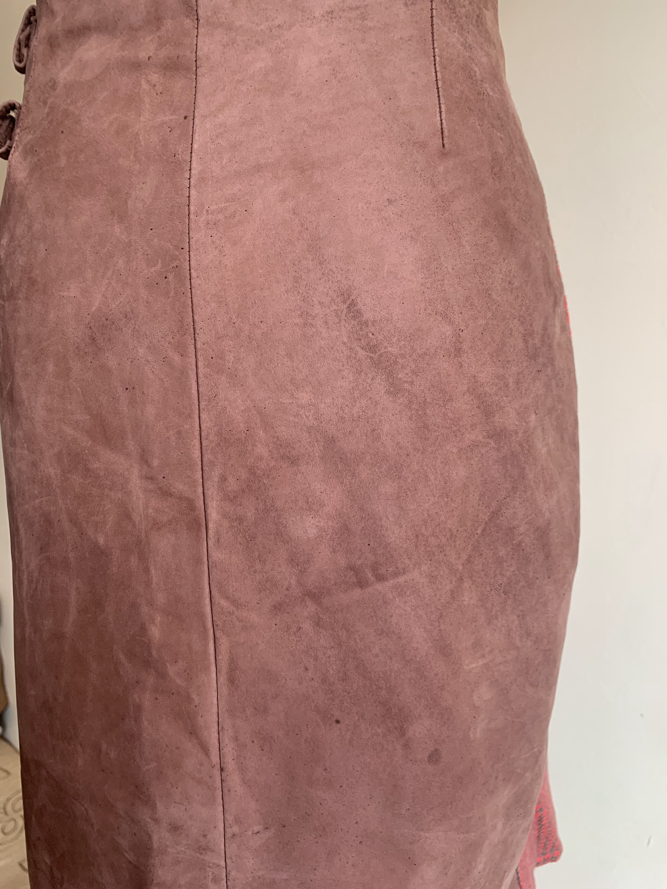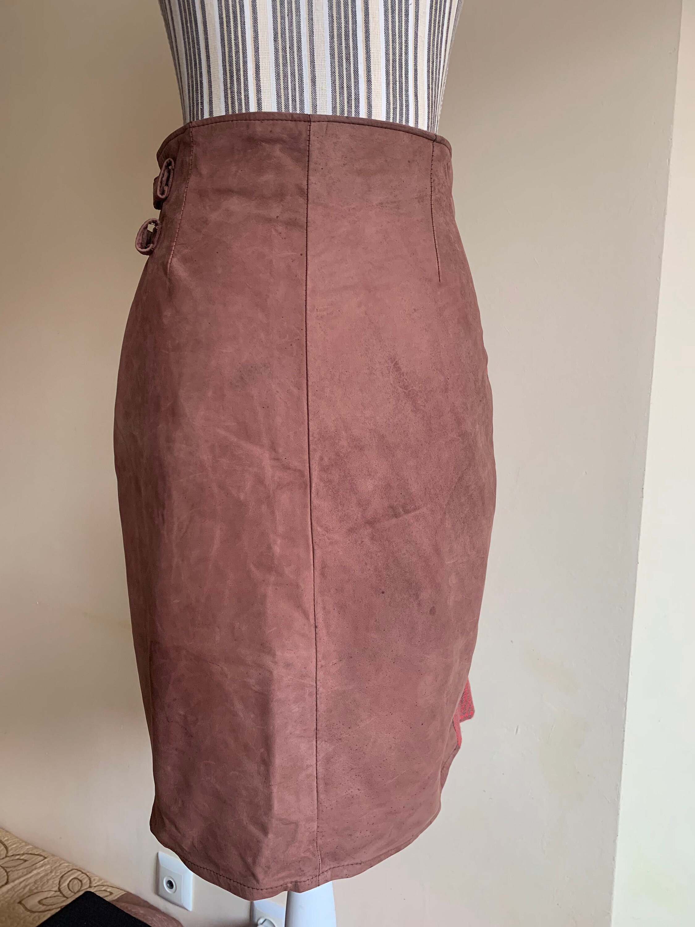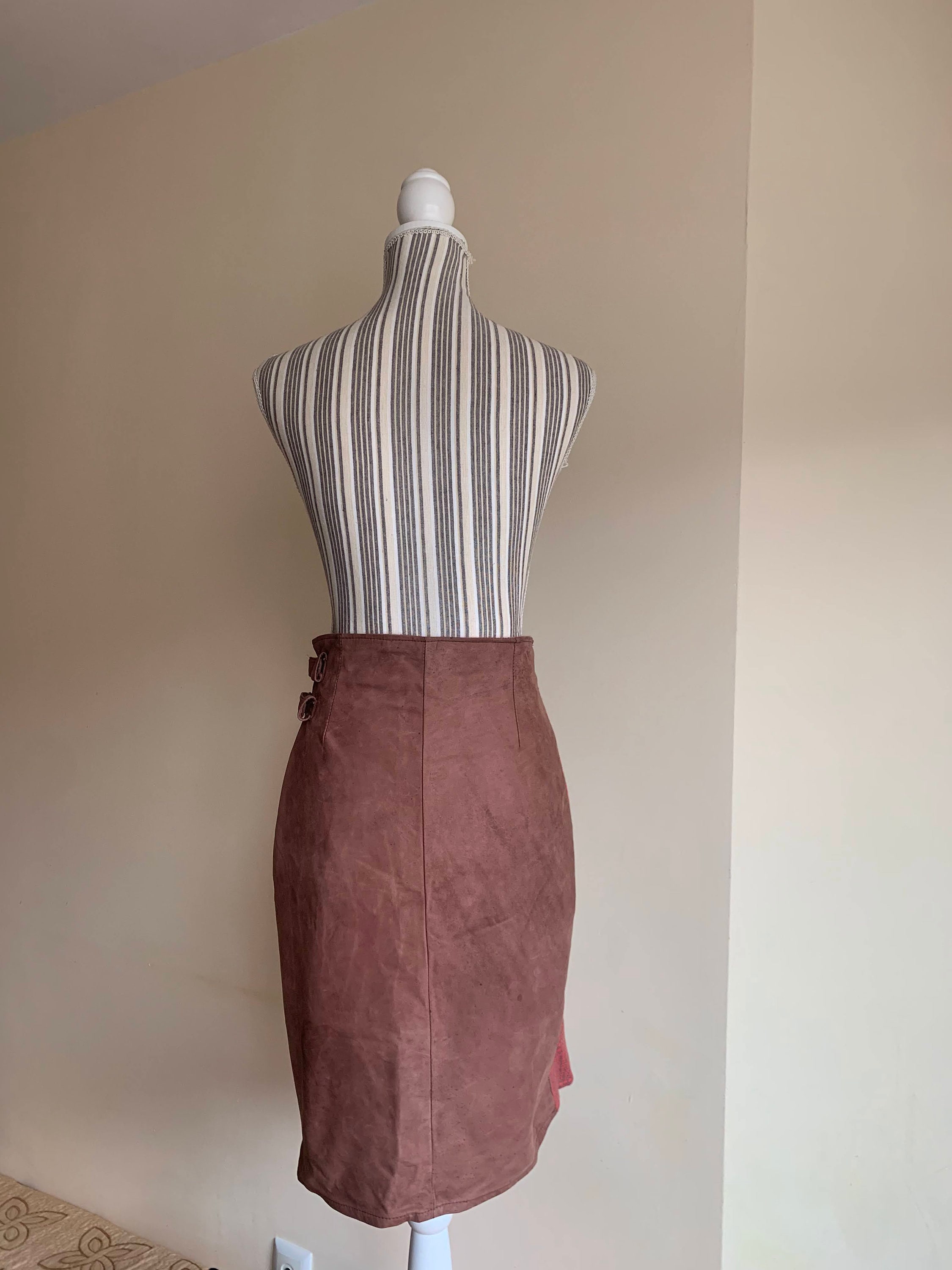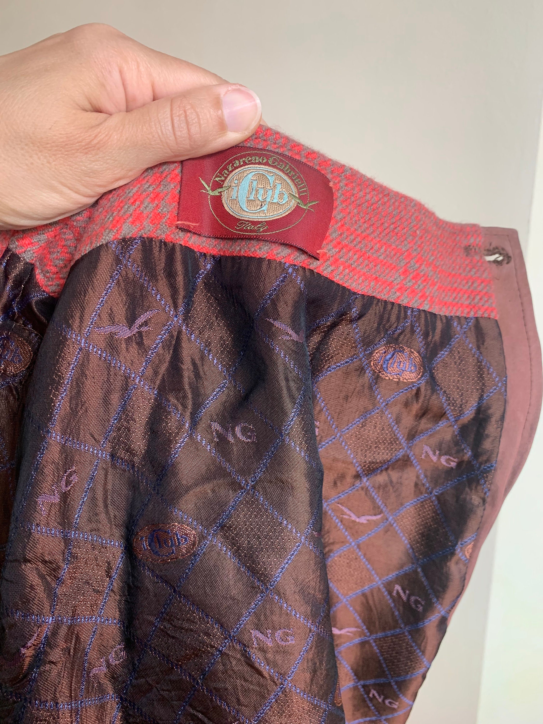 This is a vintage 80s wrap skirt with side buckles by the Italian brand Nazareno Gabrielli. This vintage pencil skirt has no label to specify the materials or the size. This buckle skirt fits like size S/M, please check the measurements below. It is made of genuine leather in brown color and wool front with plaid houndstooth pattern. This knee length skirt has satin like monogramed lining which feels like polyester.