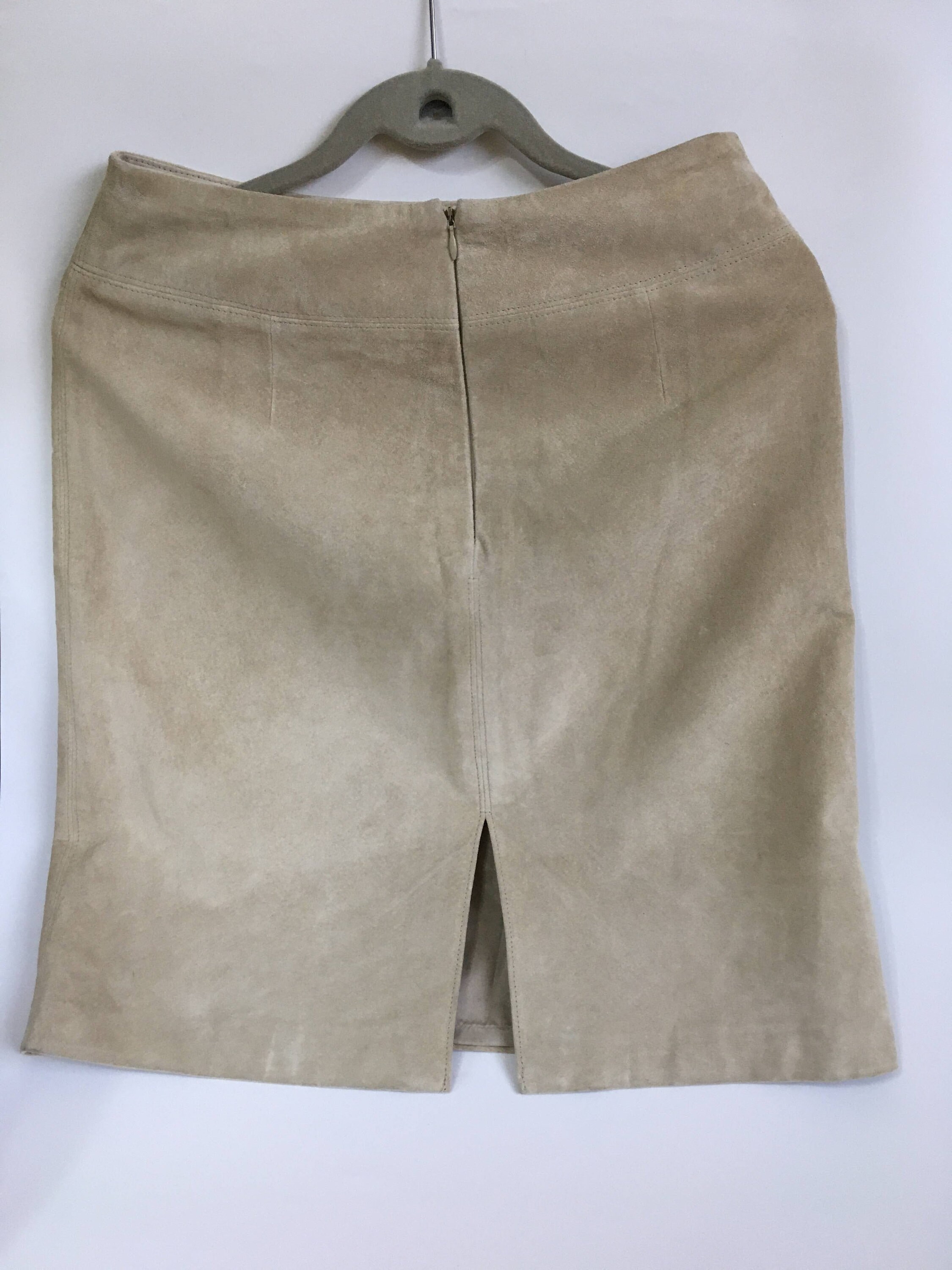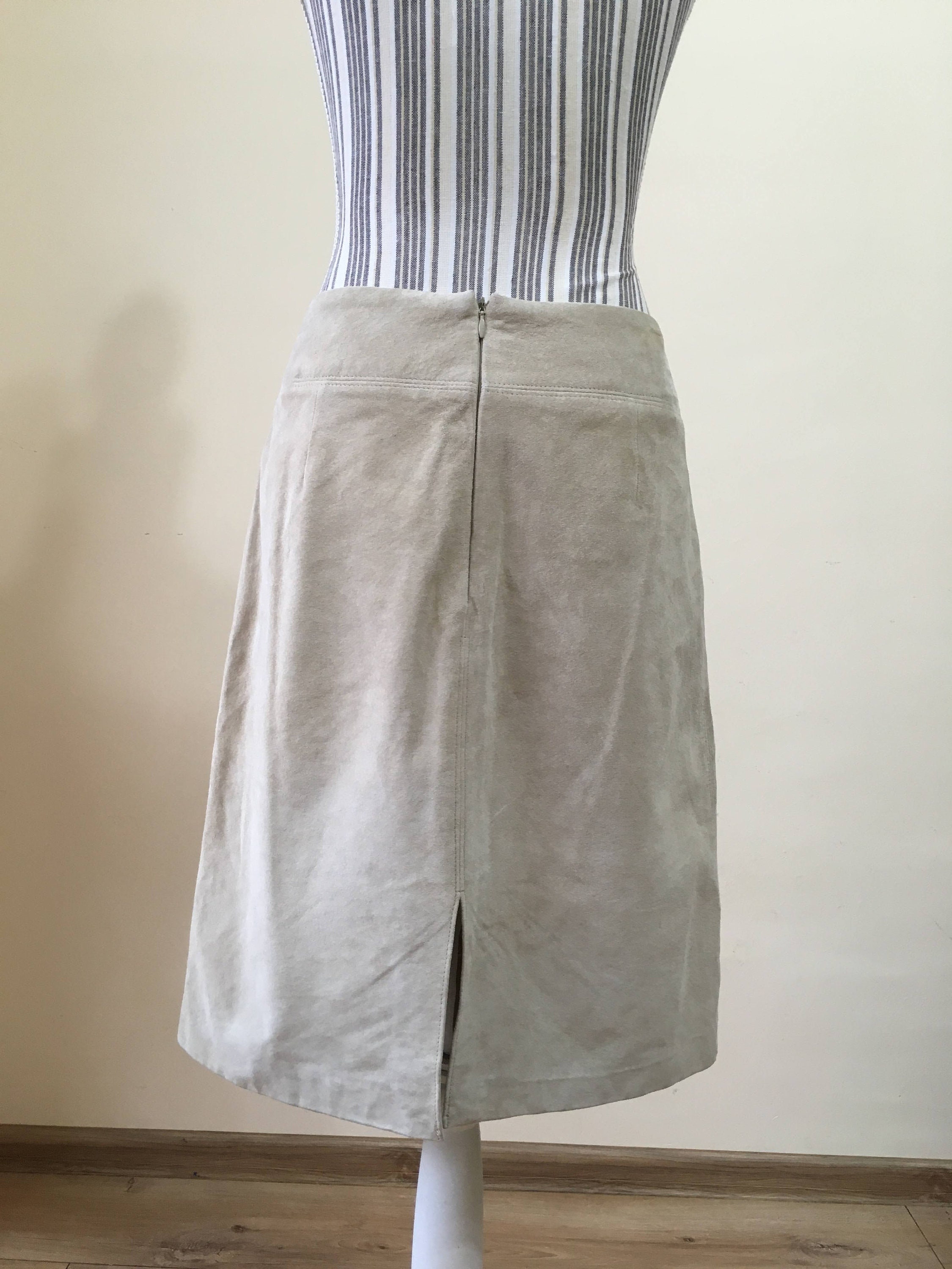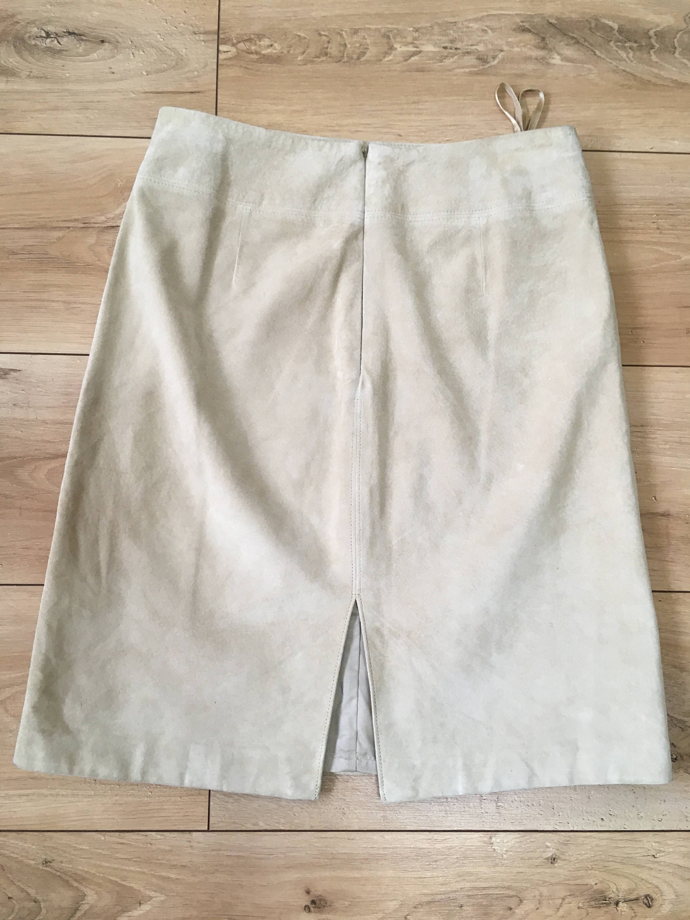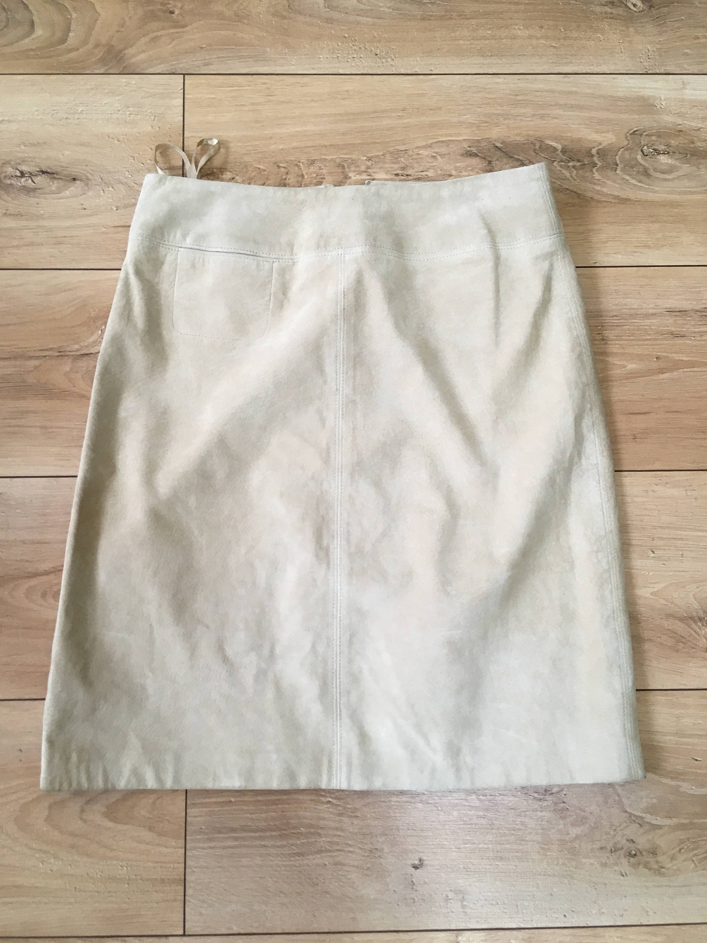 This is a soft suede leather skirt in tan beige color by Esprit. This straight skirt has a back zip closure. This genuine leather pencil skirt falls above the knee. This boho chic suede skirt has a polyester lining underneath and a slip pocket on the front. This festival bohemian skirt is perfect for daily wear. You can pair it with a simple white t-shirt or an elegant flowy shirt, it will look amazing anyway you decide to pair it. The size marked on the label is EUR 38, US 8, GB 12. It corresponds to size S/M. Please check the measurements below