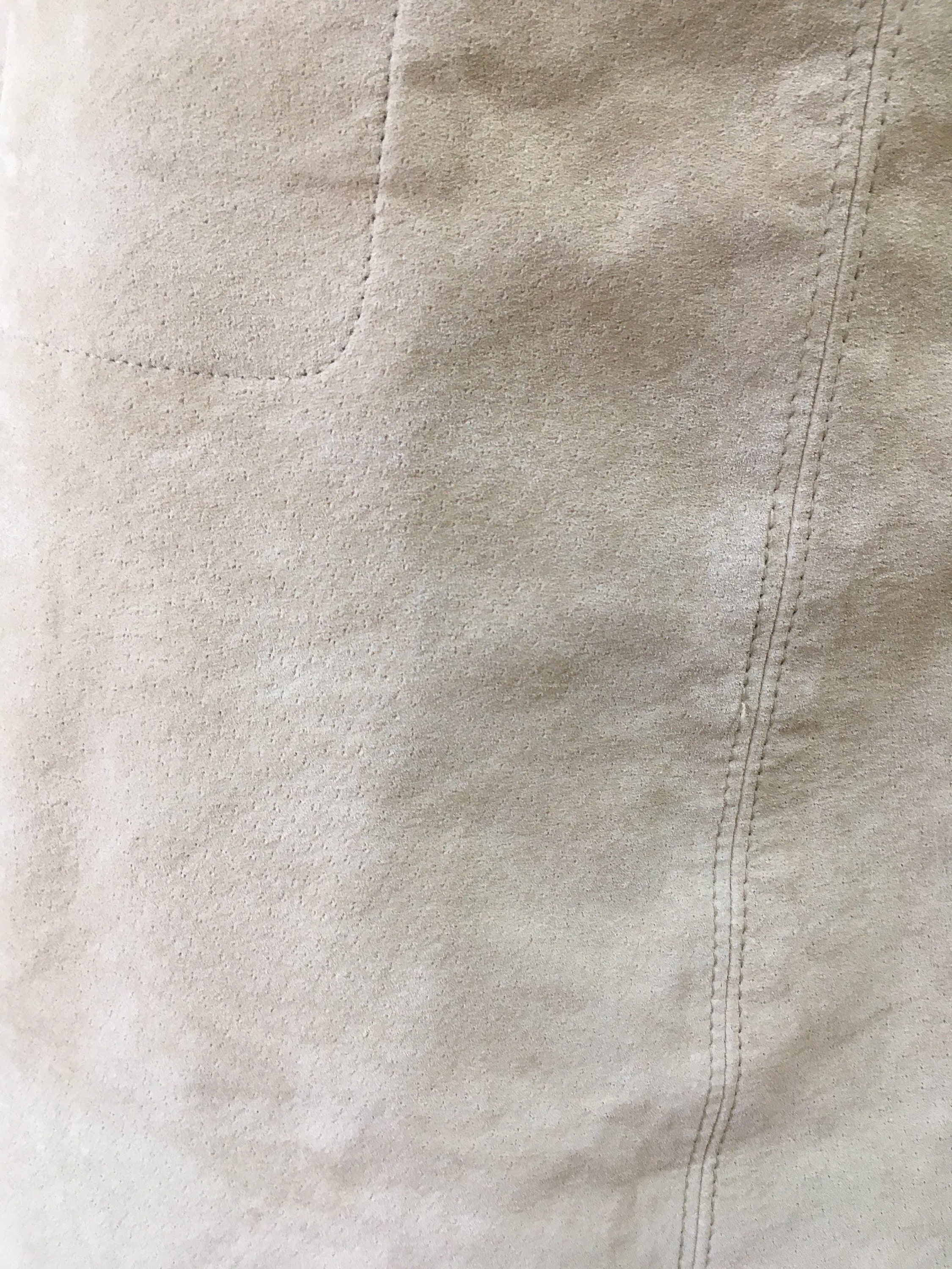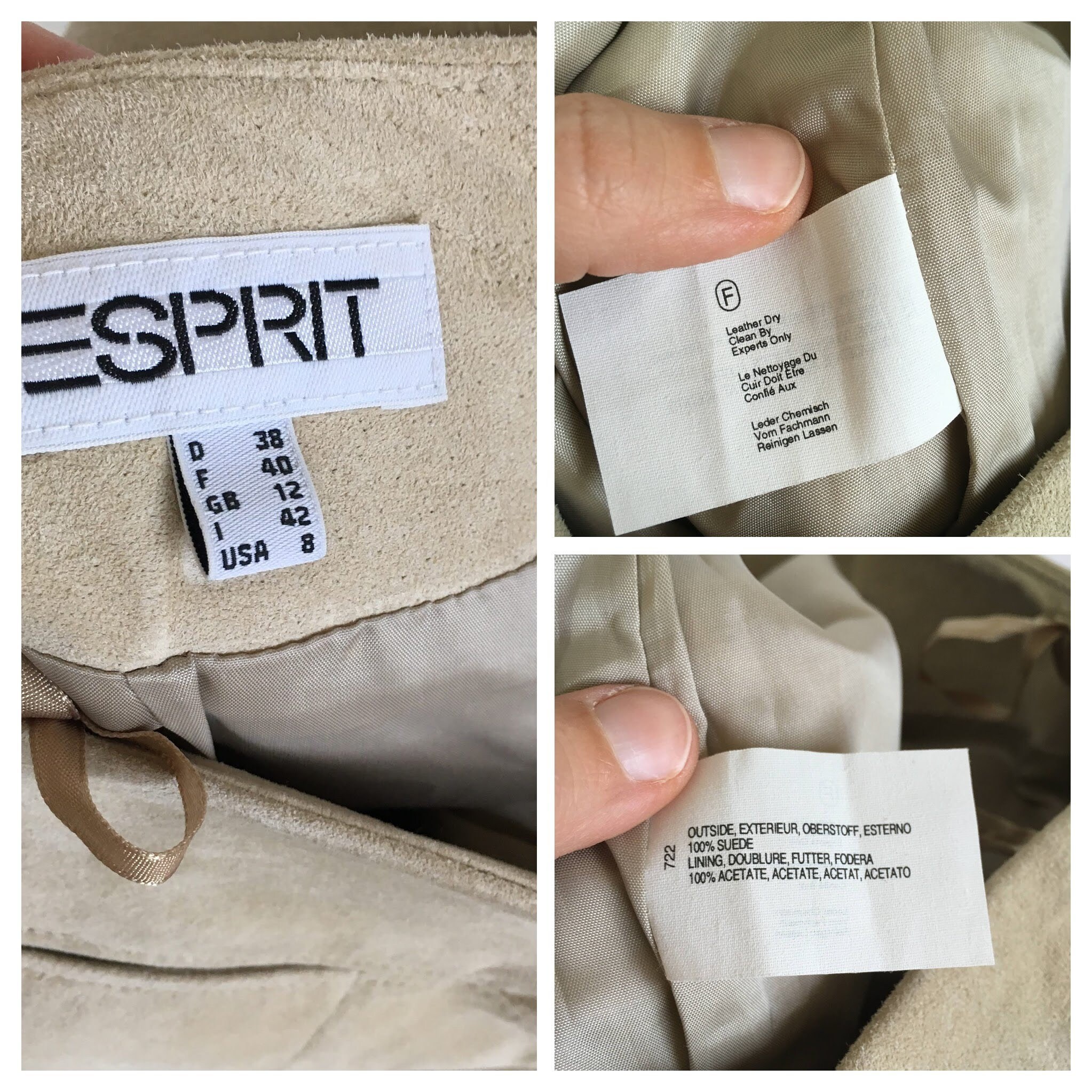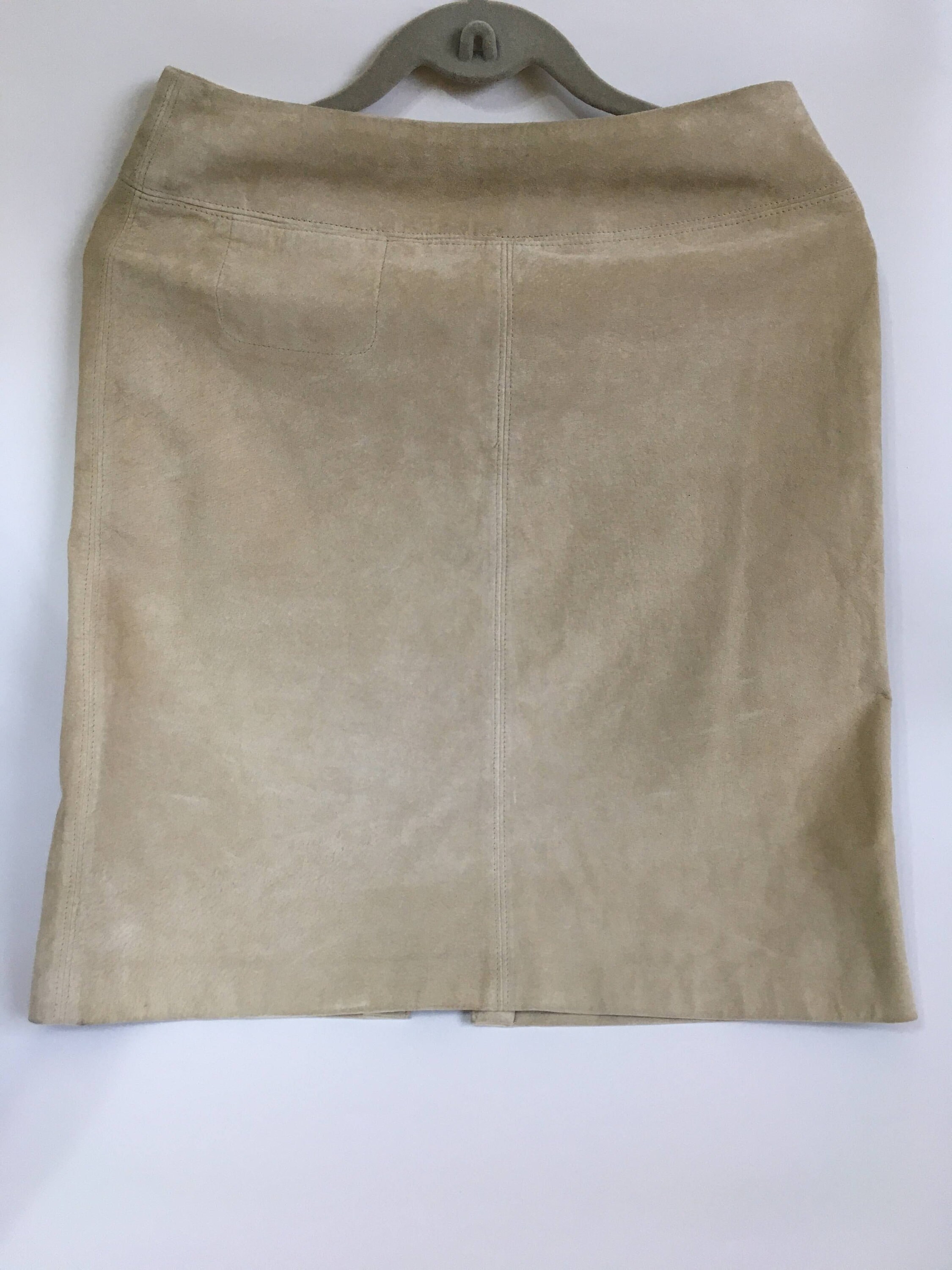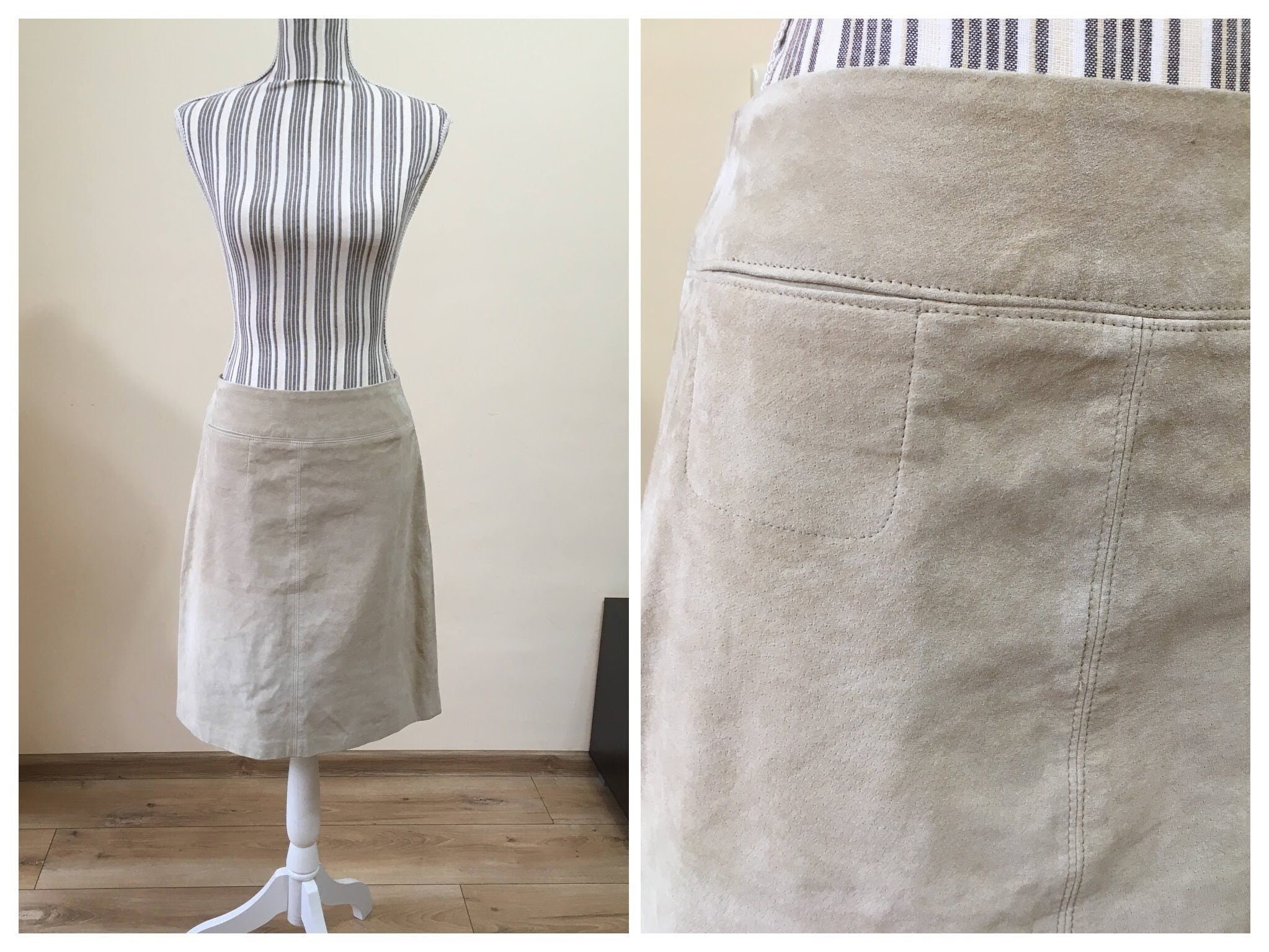 This is a soft suede leather skirt in tan beige color by Esprit. This straight skirt has a back zip closure. This genuine leather pencil skirt falls above the knee. This boho chic suede skirt has a polyester lining underneath and a slip pocket on the front. This festival bohemian skirt is perfect for daily wear. You can pair it with a simple white t-shirt or an elegant flowy shirt, it will look amazing anyway you decide to pair it. The size marked on the label is EUR 38, US 8, GB 12. It corresponds to size S/M. Please check the measurements below