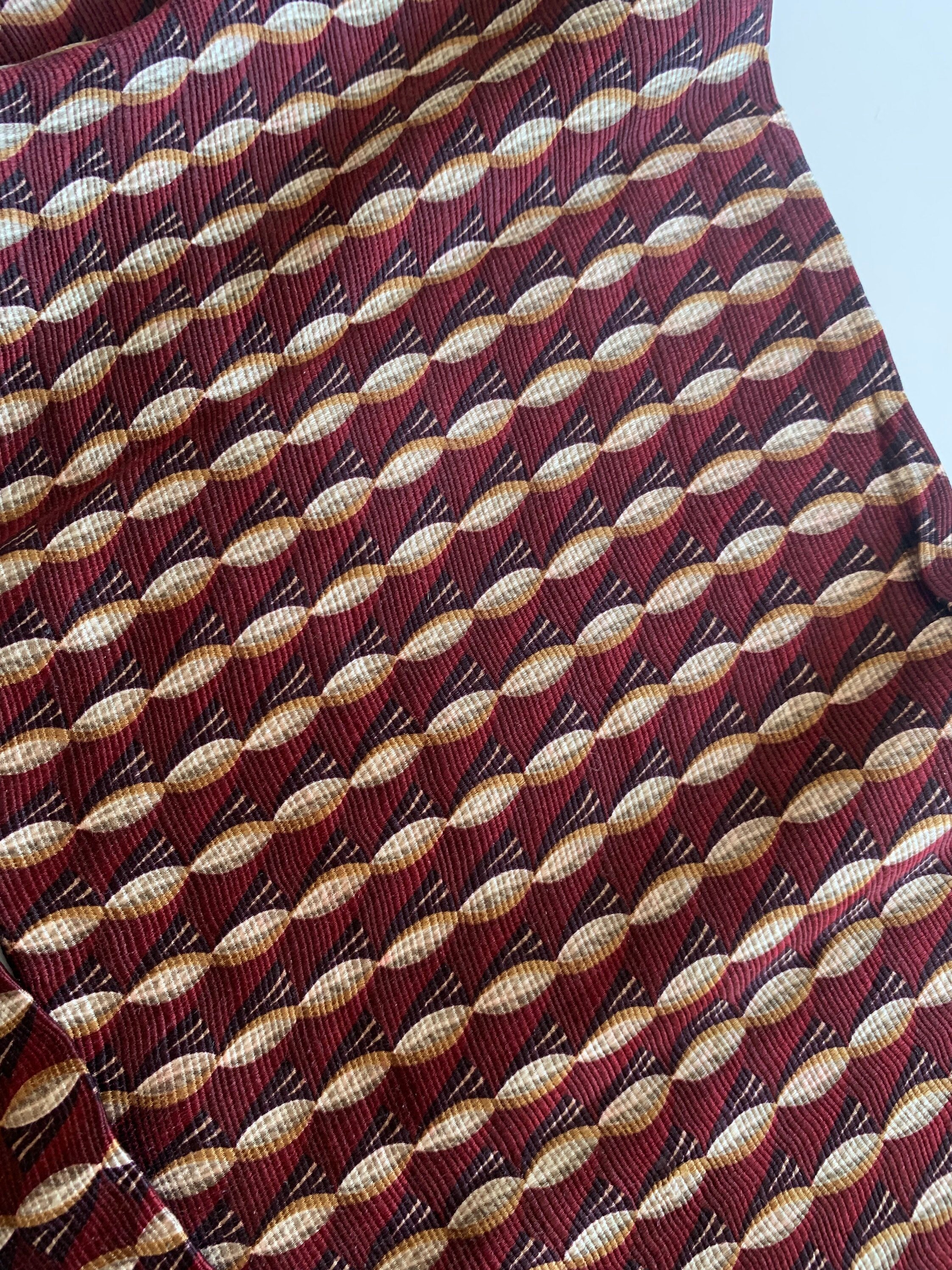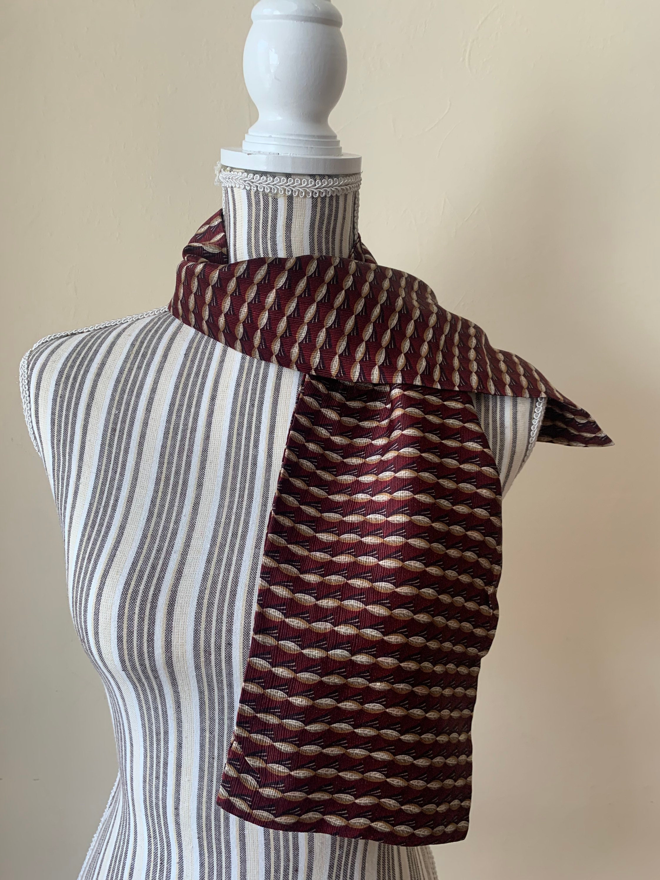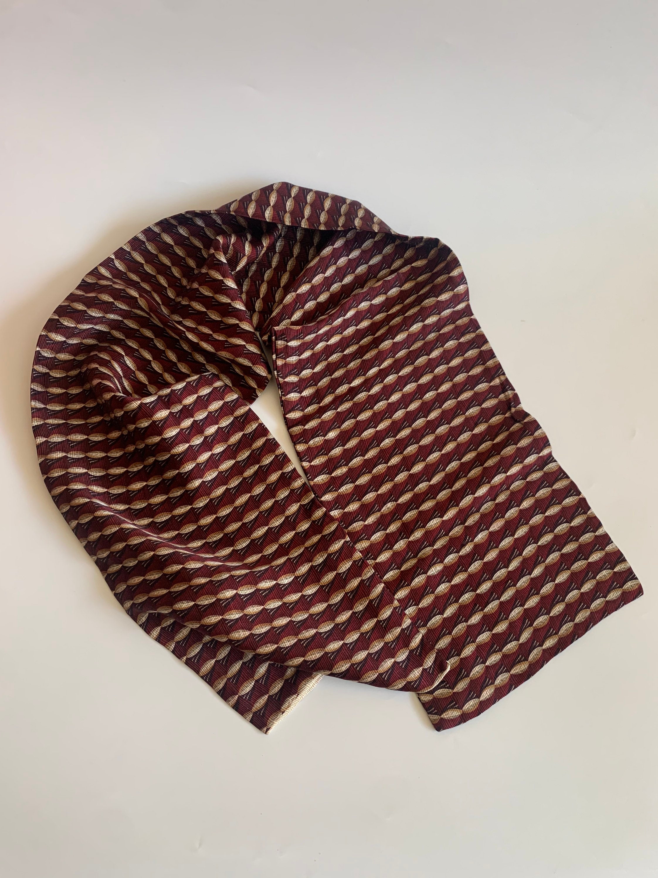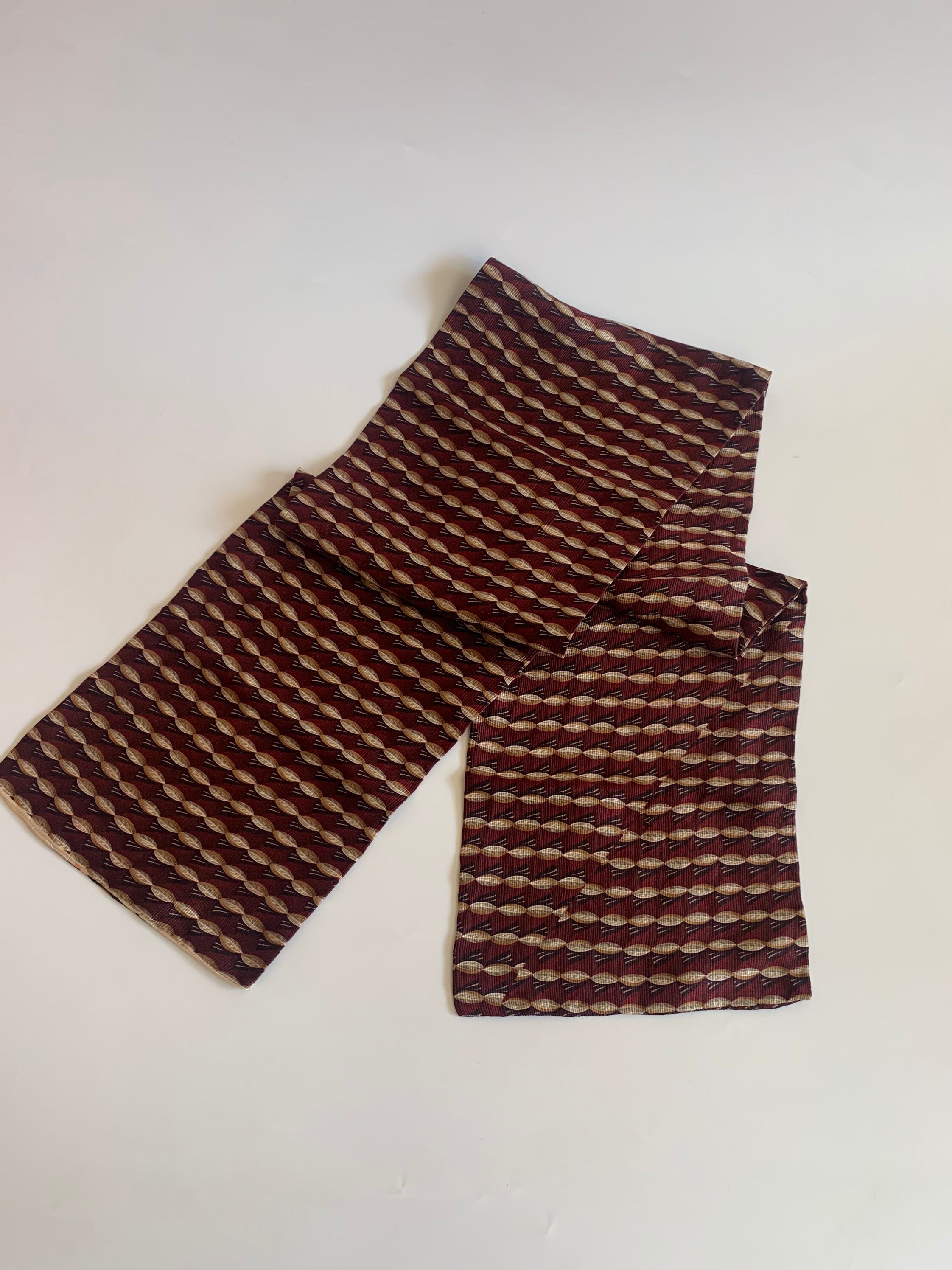 Beautiful vintage neck scarf in shades of burgundy and brown. The fabric feels like synthetic, it has a nice silky shine. This women’s scarf is double sided, both sides are identical.