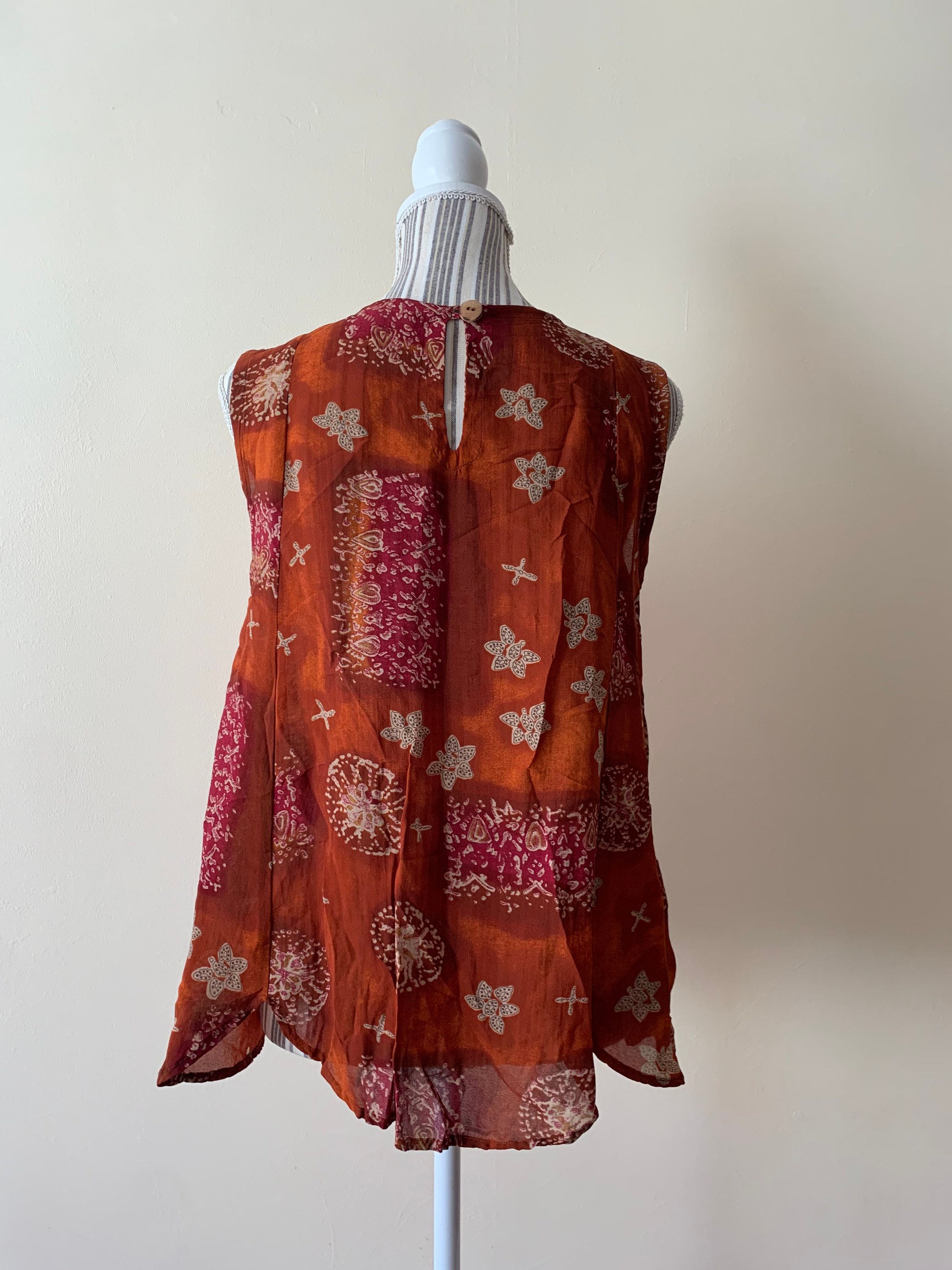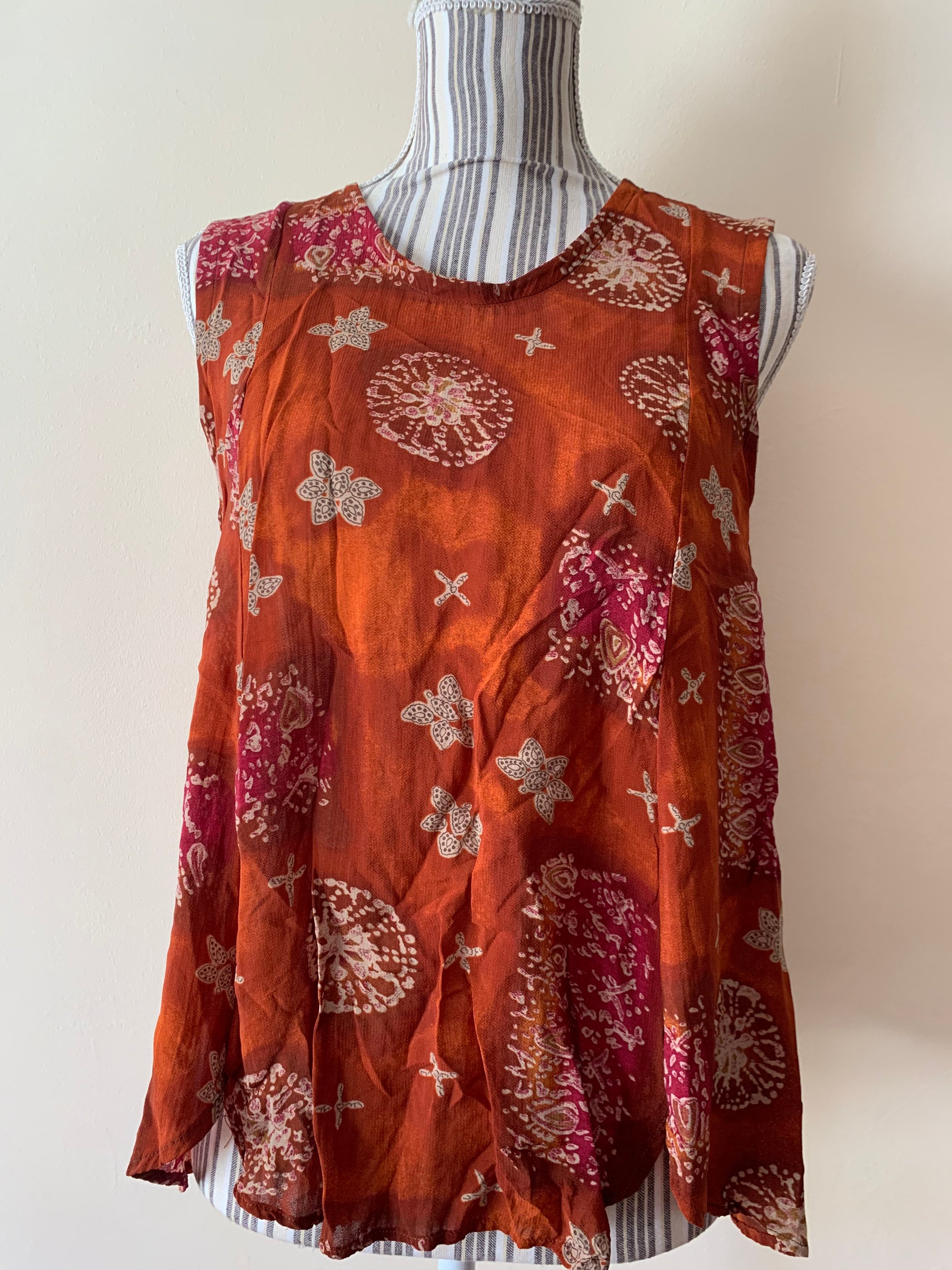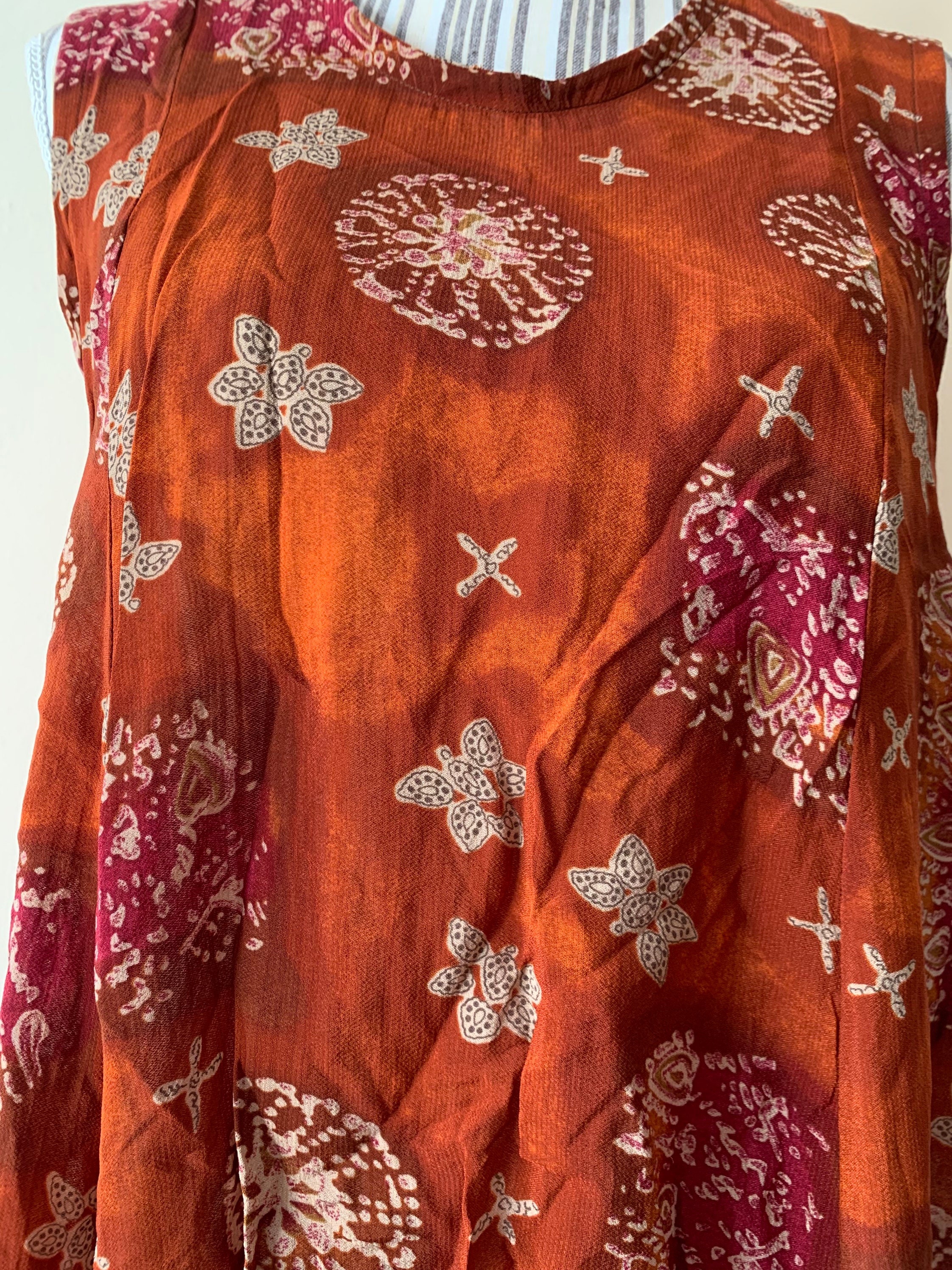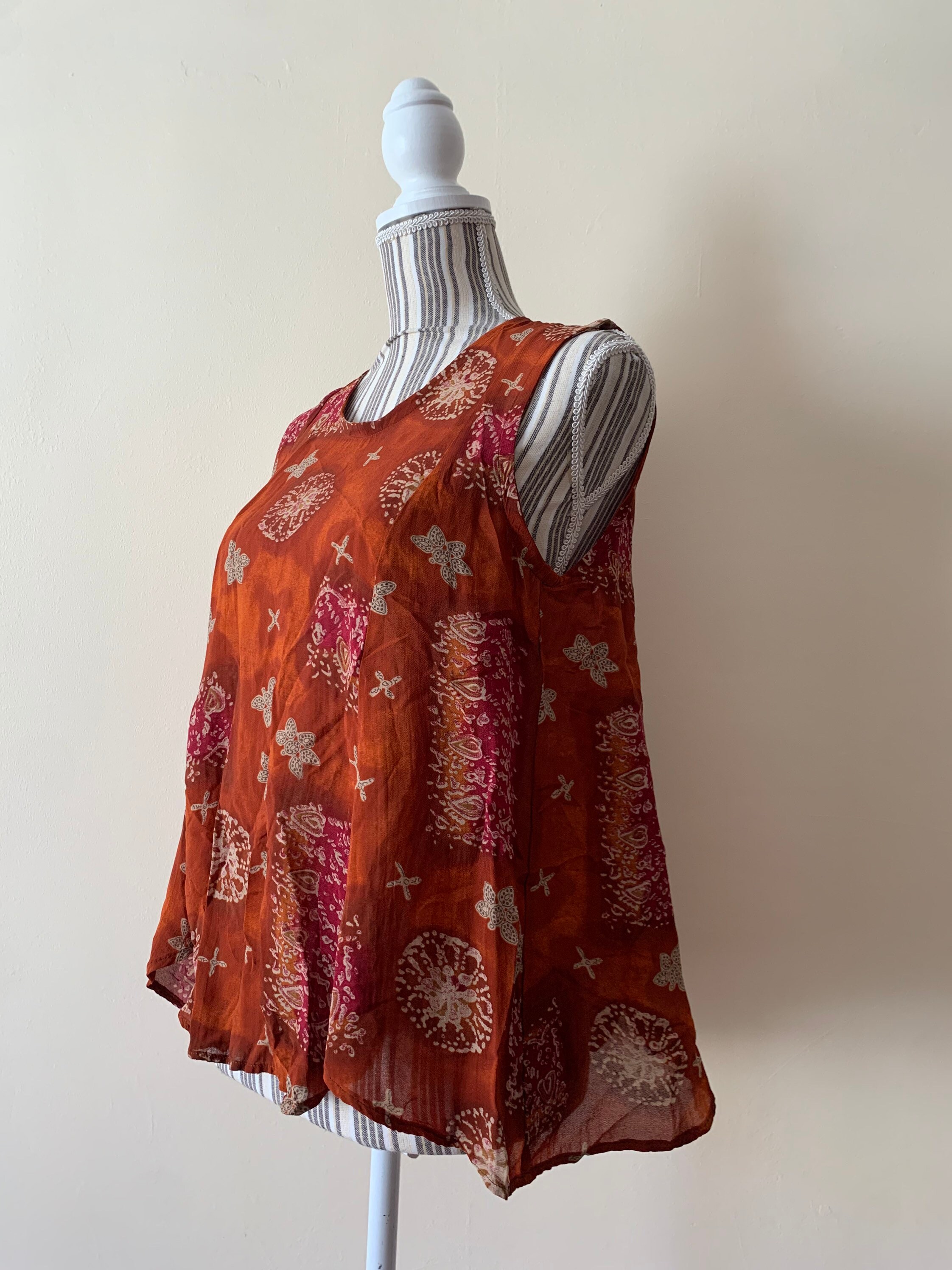 Beautiful flowy loose fit summer top with abstract paisley print. This semi-sheer viscose top fits like size S/M. The size marked on the garment is 44. It is made of 100% viscose fabric. Perfect sleeveless top for the summer.