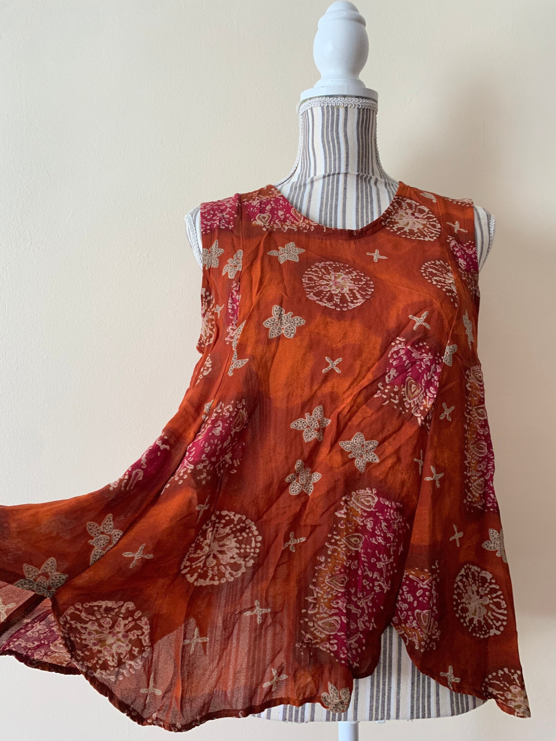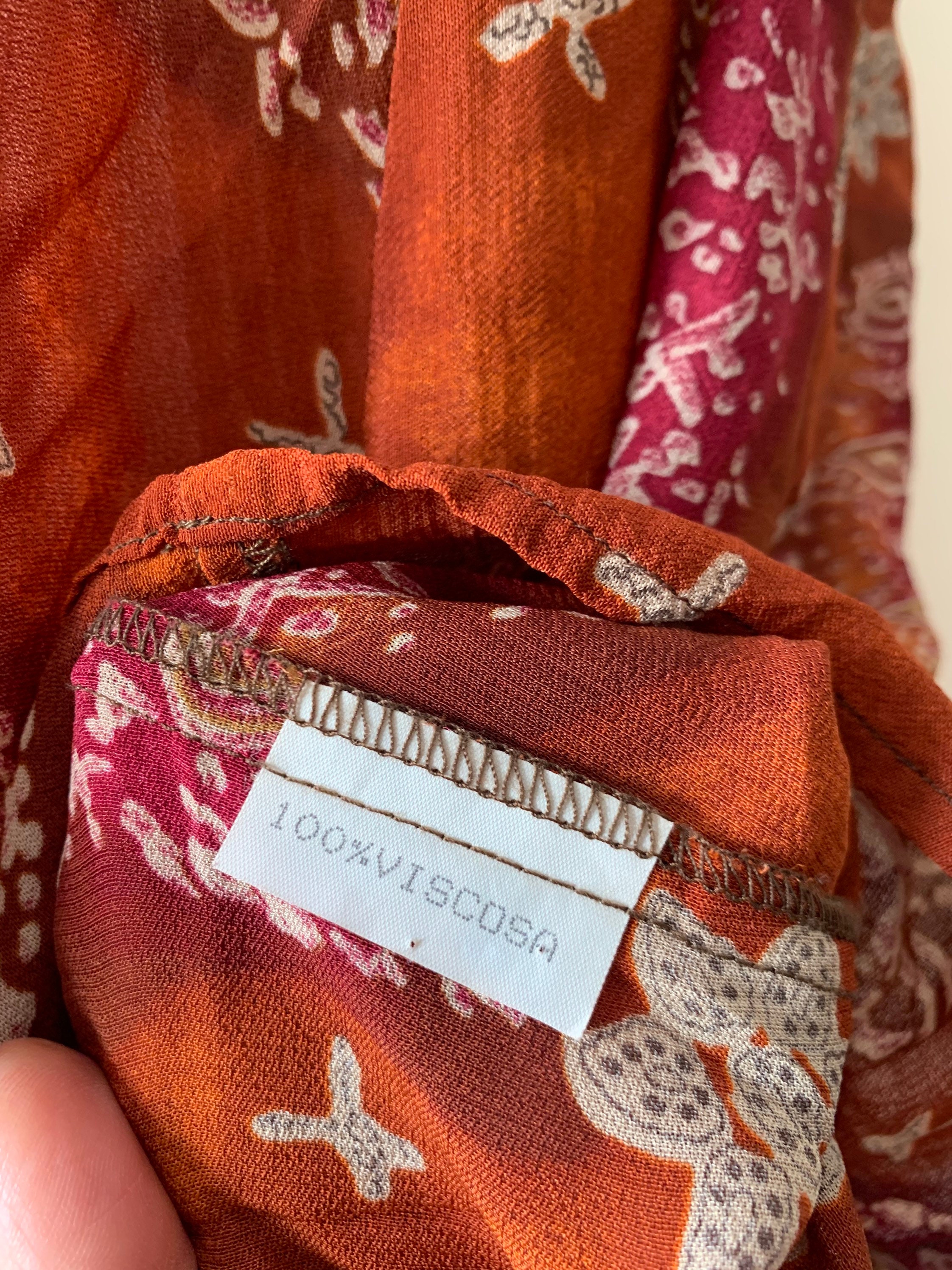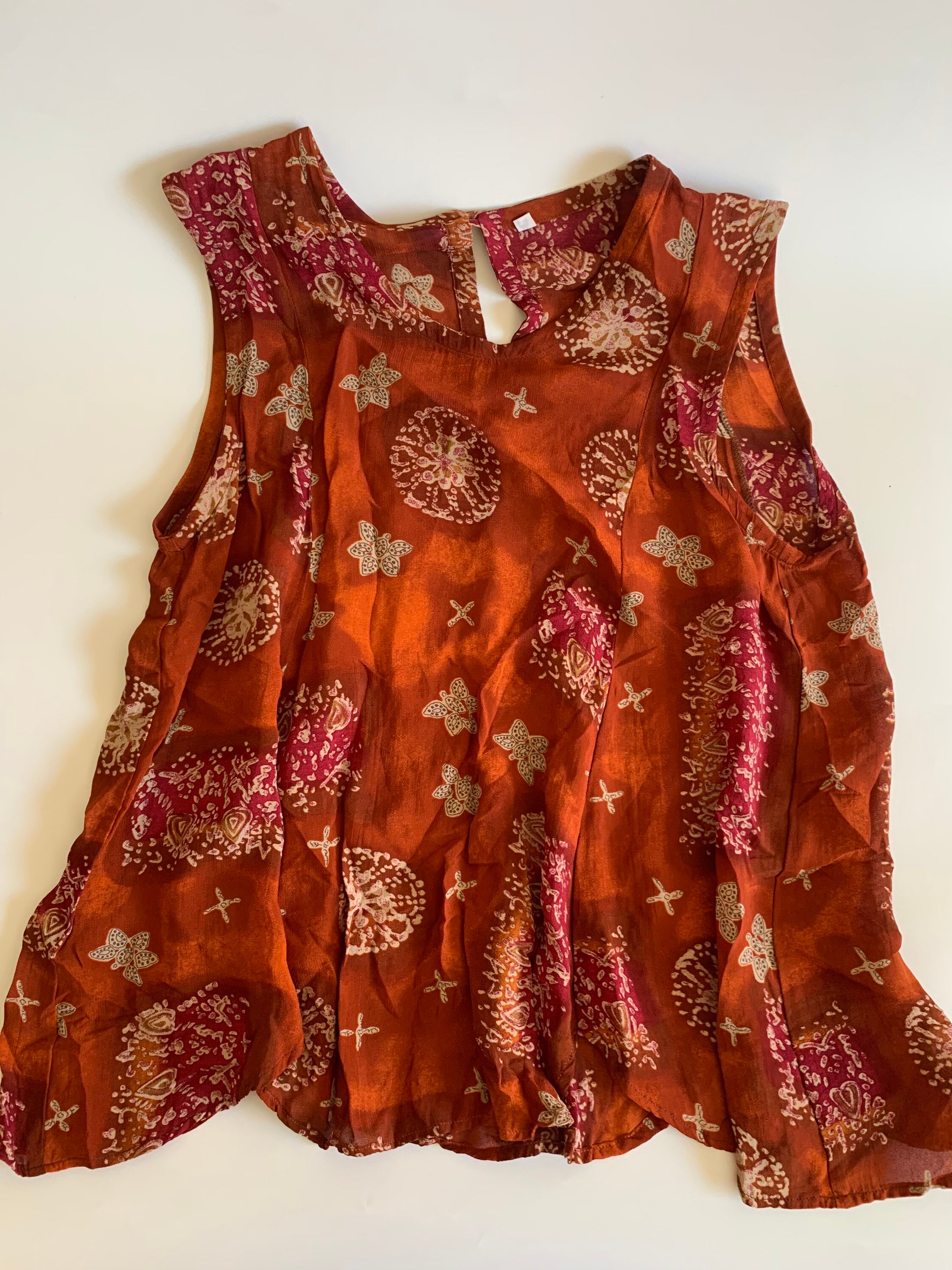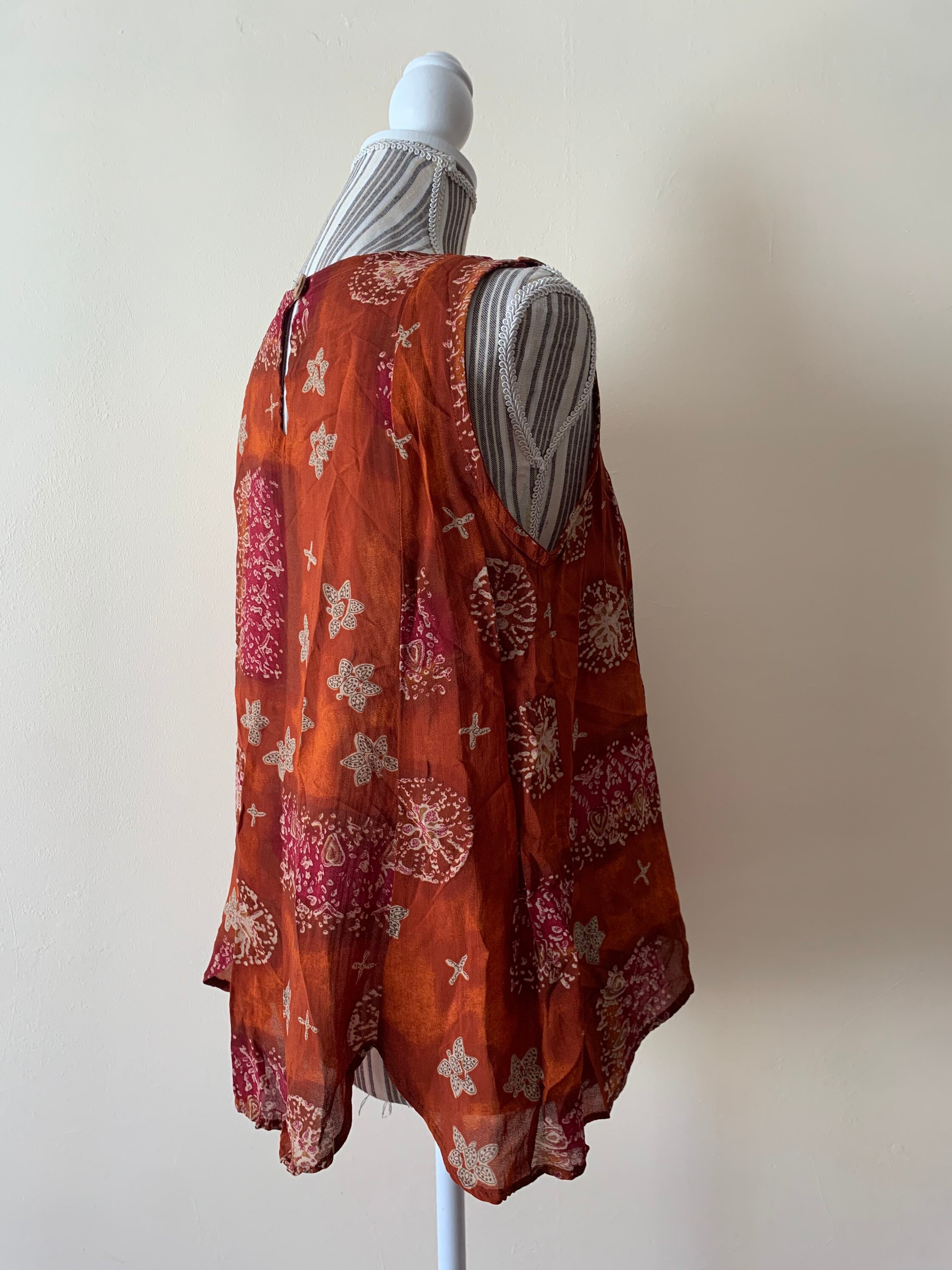 Beautiful flowy loose fit summer top with abstract paisley print. This semi-sheer viscose top fits like size S/M. The size marked on the garment is 44. It is made of 100% viscose fabric. Perfect sleeveless top for the summer.