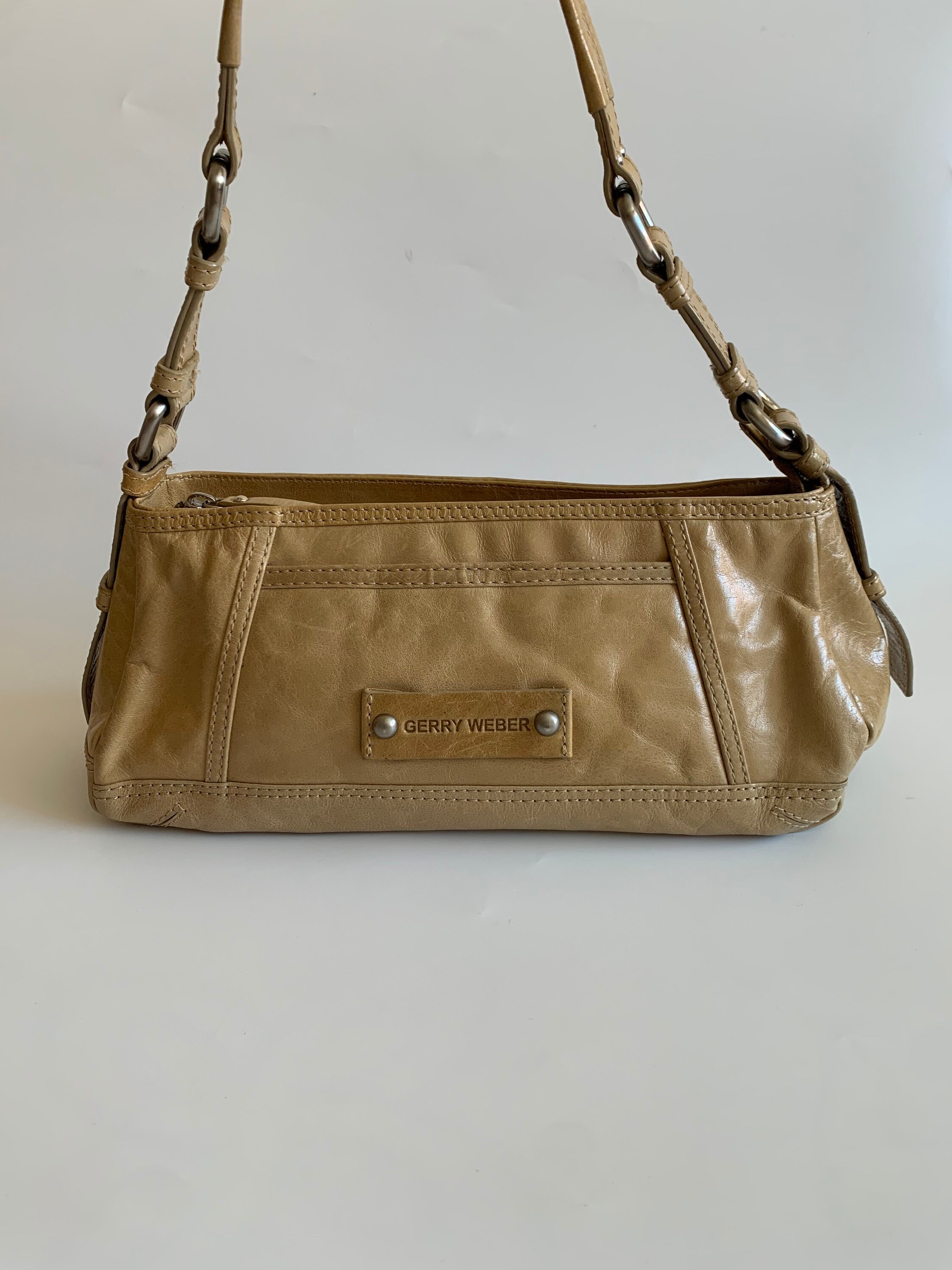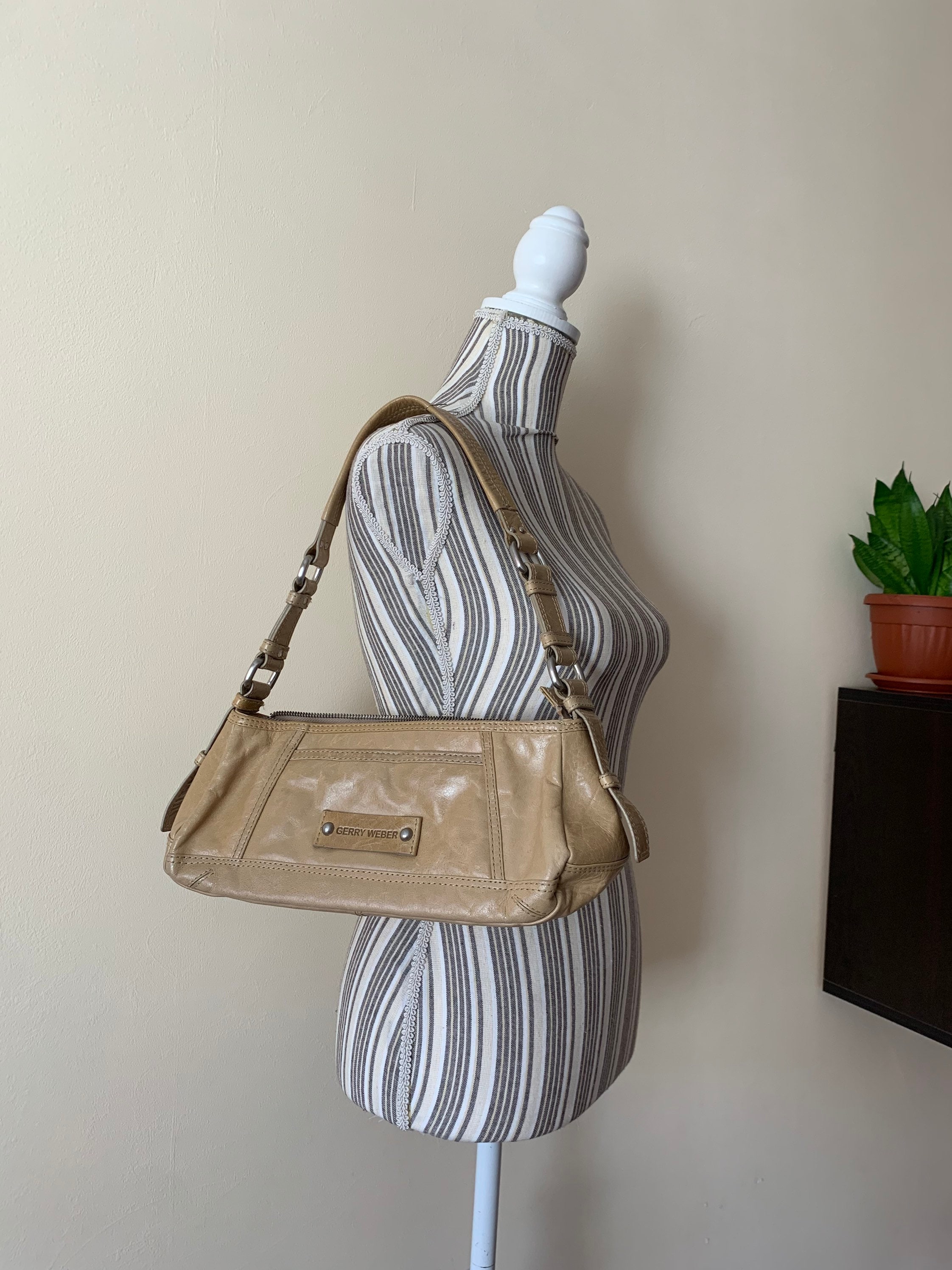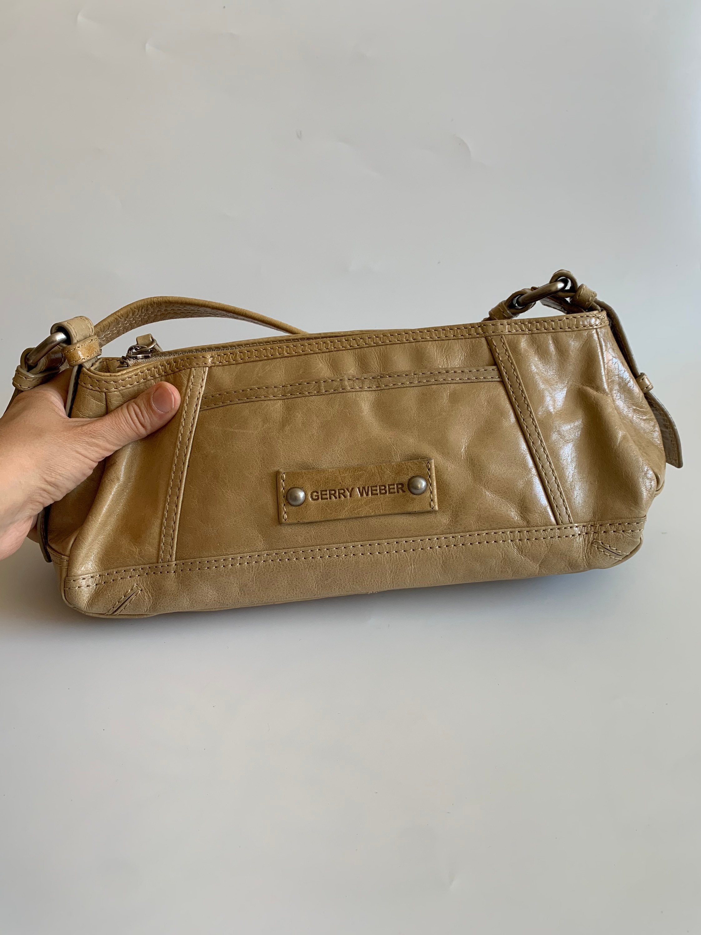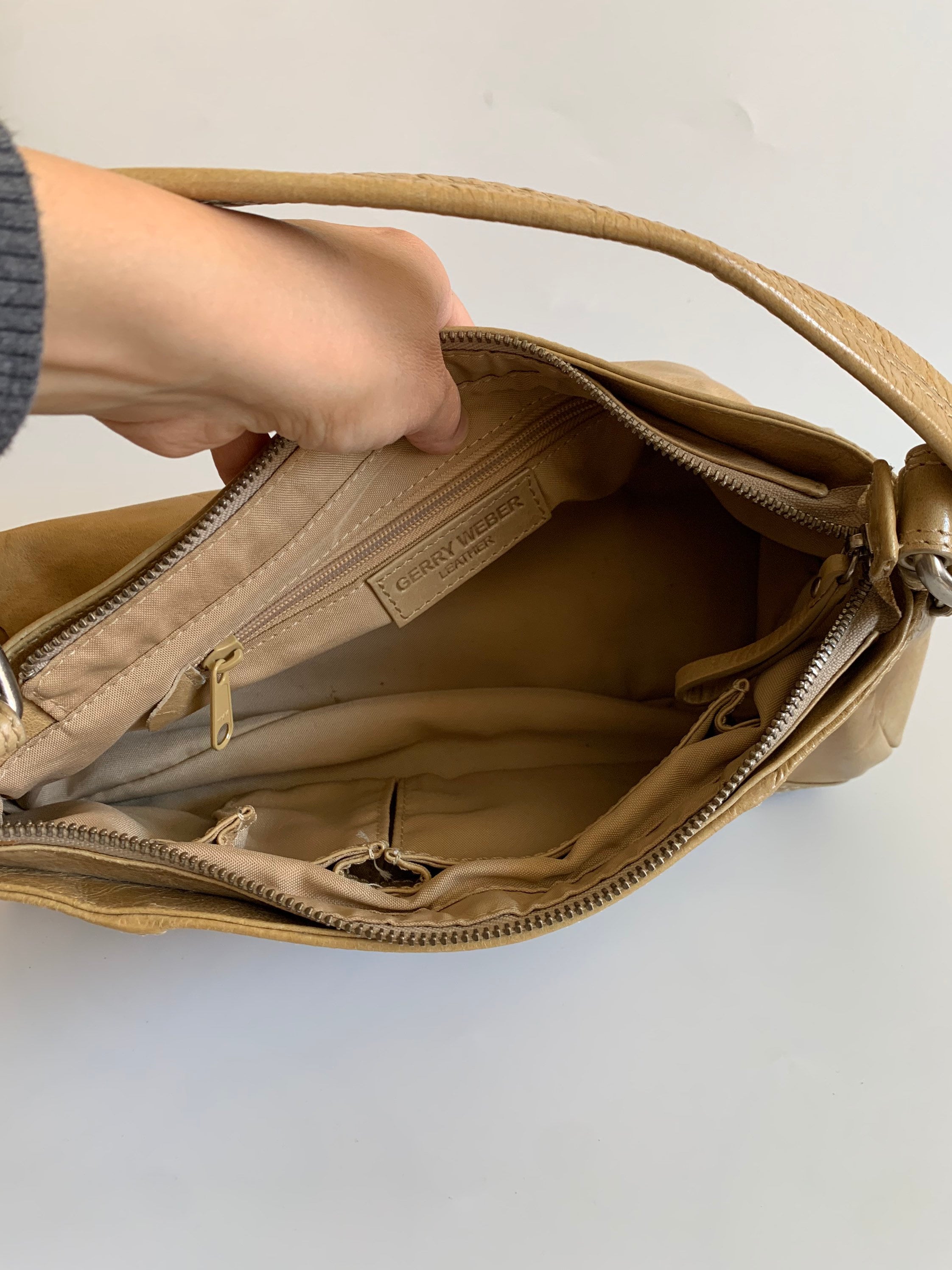 This is a vintage distressed beige leather shoulder bag for women by Garry Weber. It is made of genuine leather in tan beige color. This baguette bag has one slip pocket with magnetic closure at the front. It has top zip closure. The interior is lined in beige cotton fabric. There is one compartment, two slip pockets and one pocket with zip closure inside. Great everyday work purse that will help you neatly organize all your things.