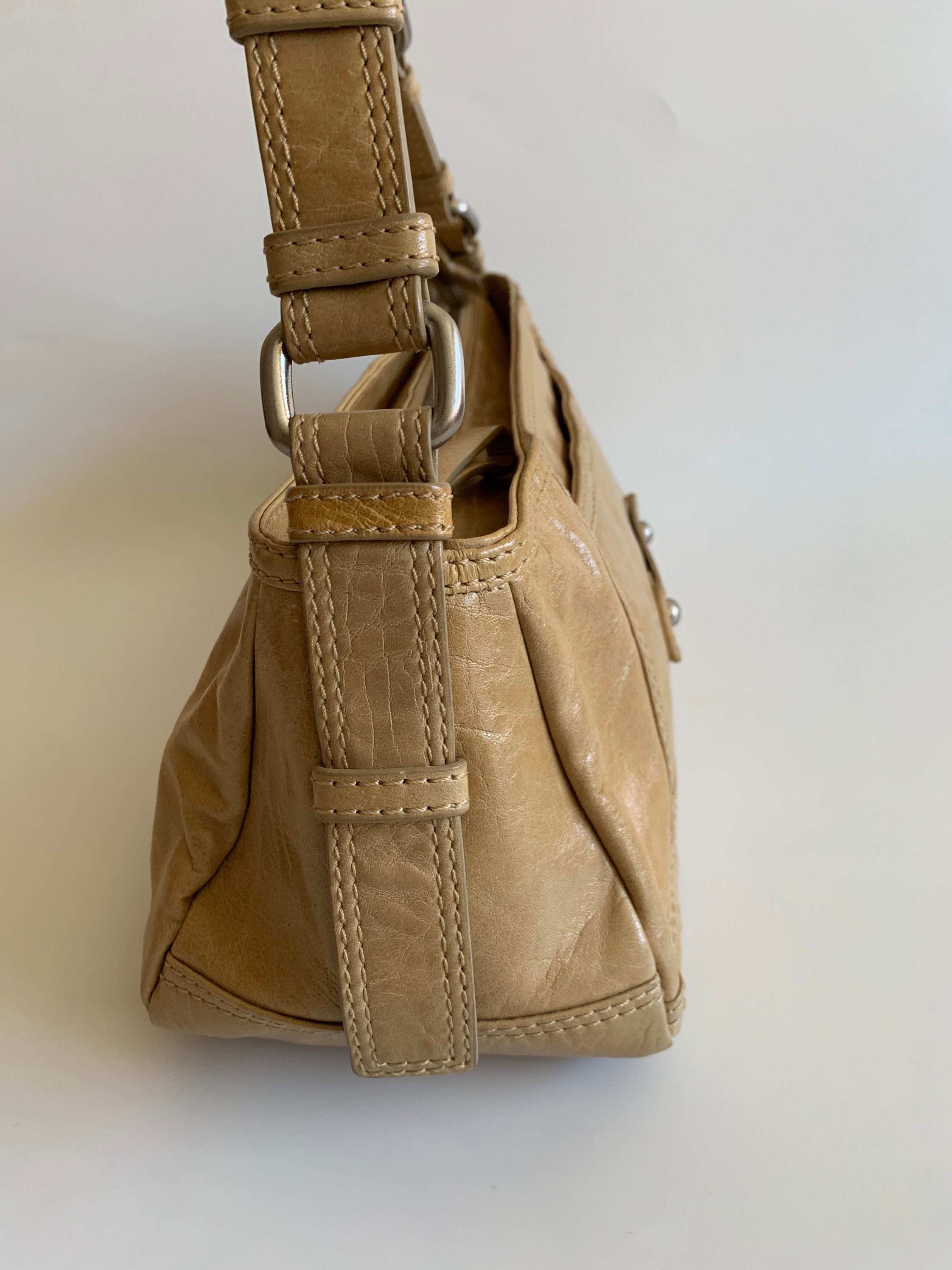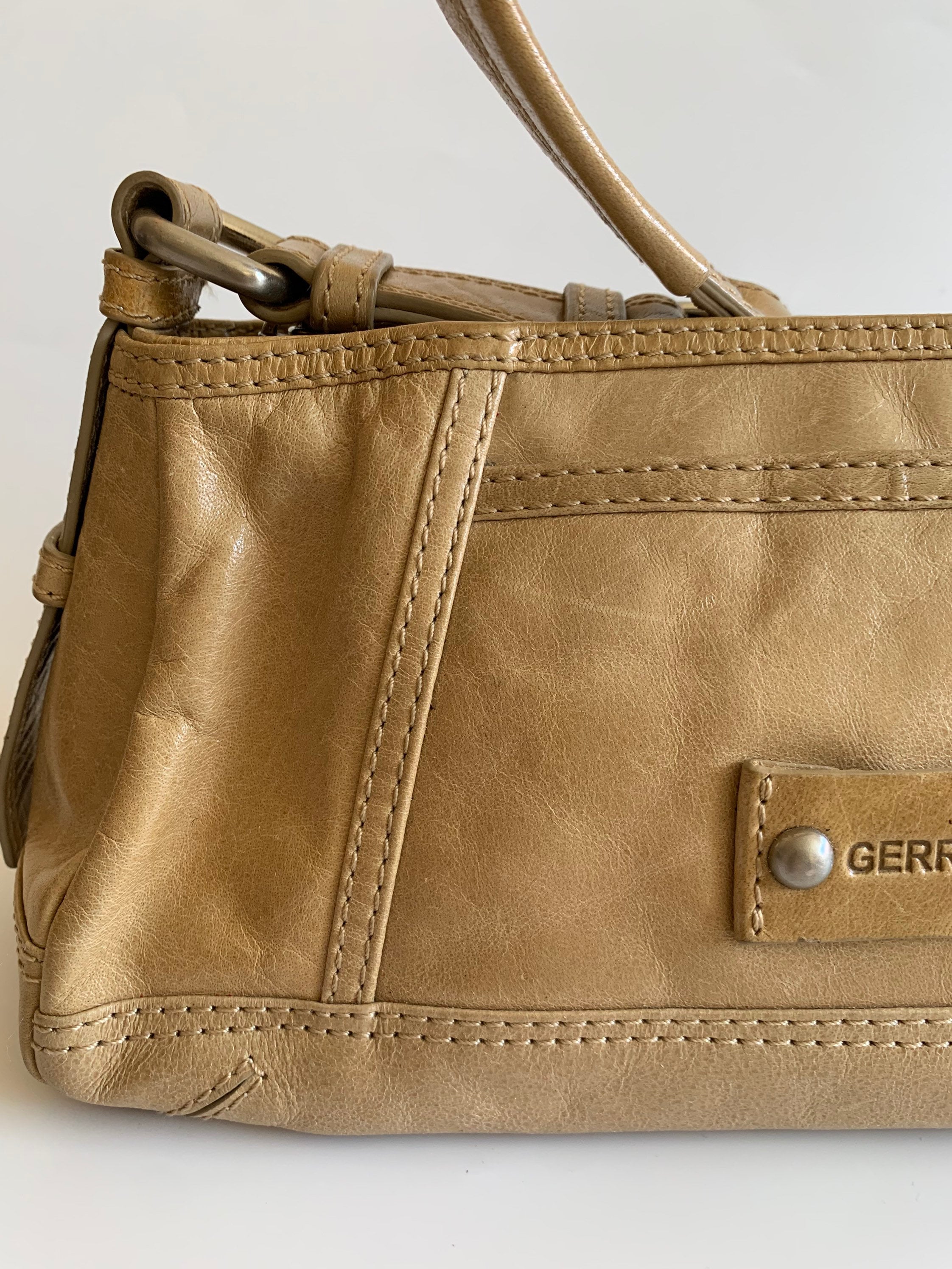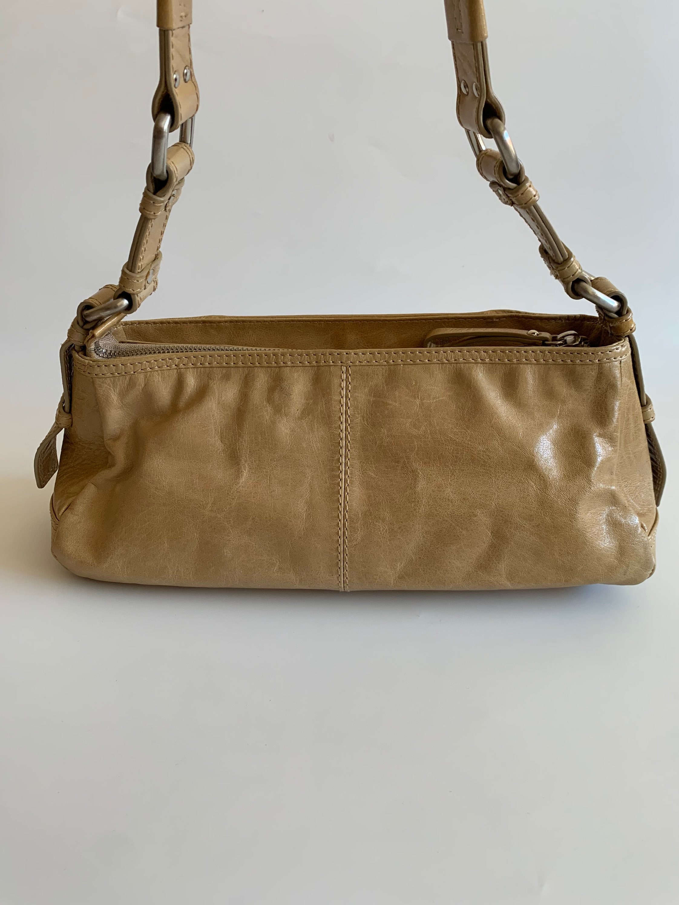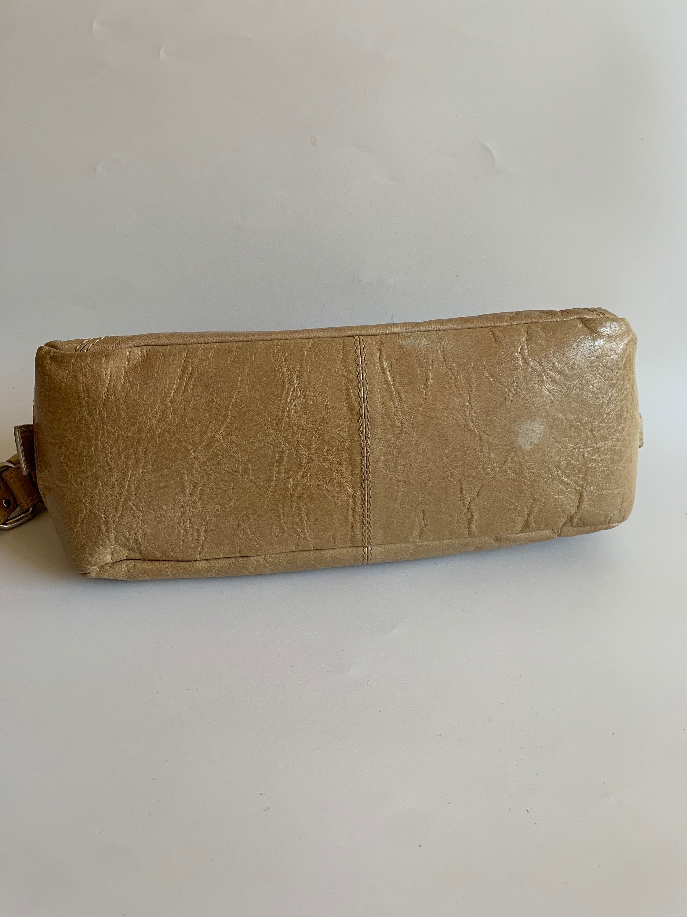 This is a vintage distressed beige leather shoulder bag for women by Garry Weber. It is made of genuine leather in tan beige color. This baguette bag has one slip pocket with magnetic closure at the front. It has top zip closure. The interior is lined in beige cotton fabric. There is one compartment, two slip pockets and one pocket with zip closure inside. Great everyday work purse that will help you neatly organize all your things.