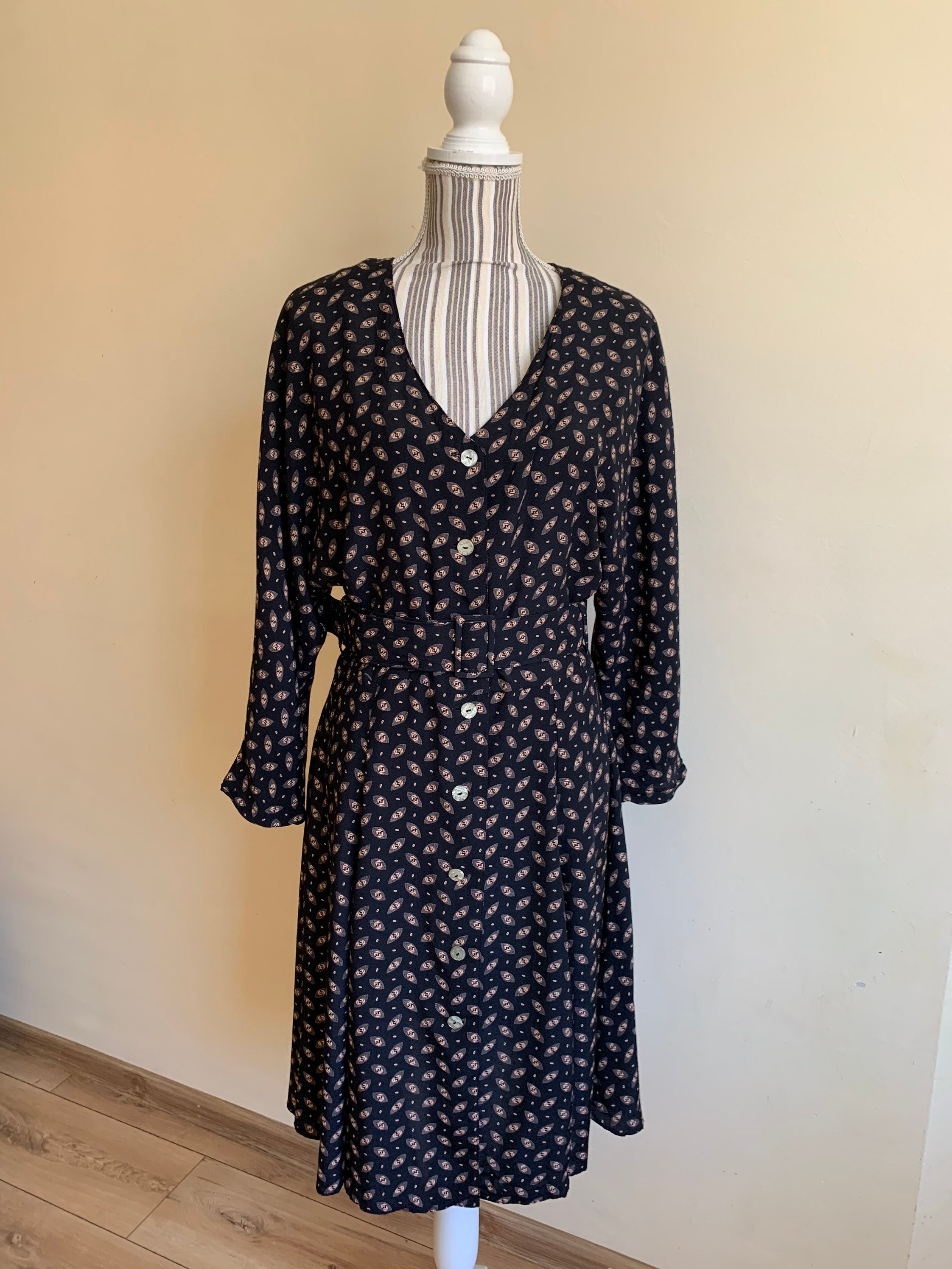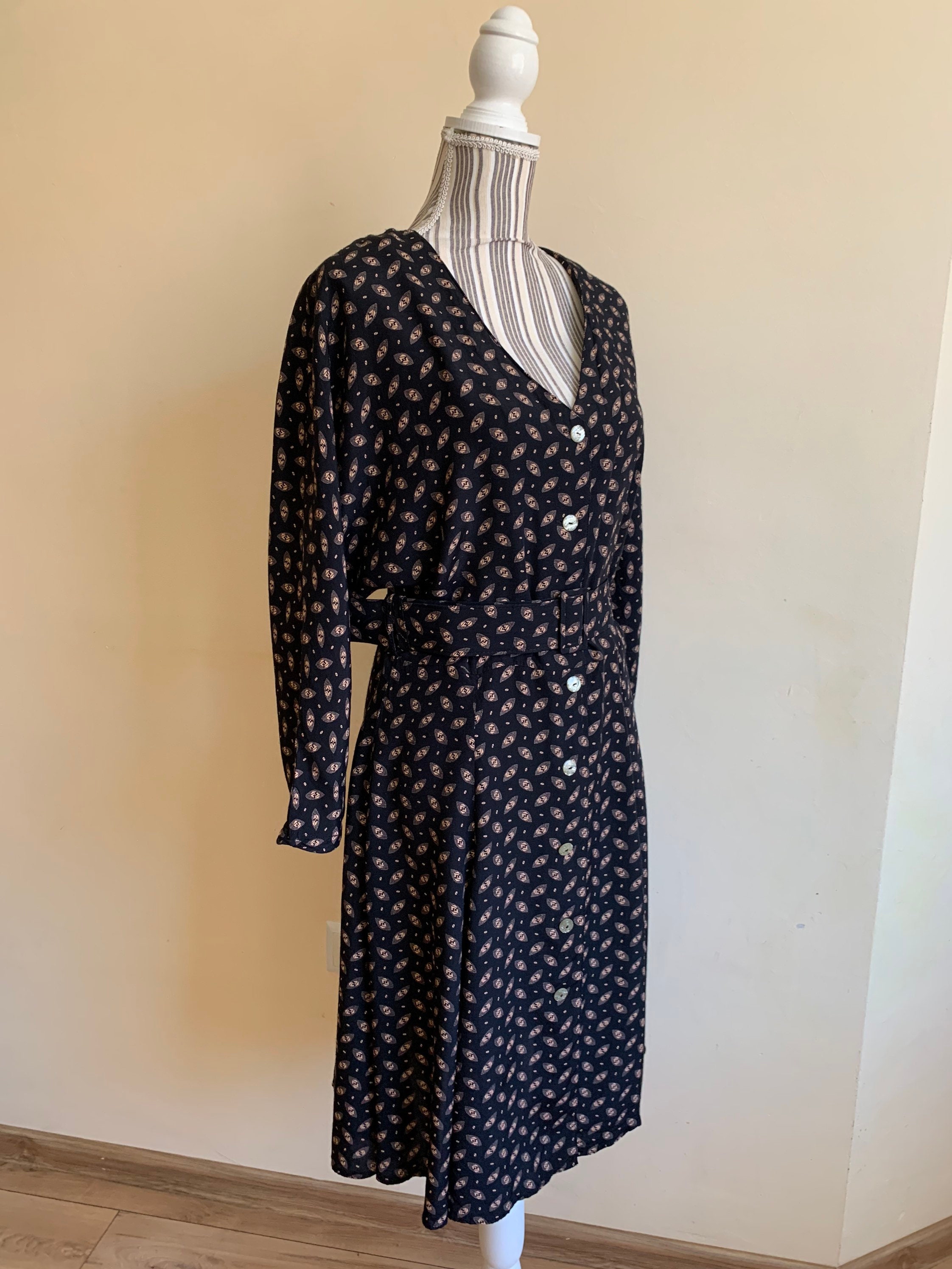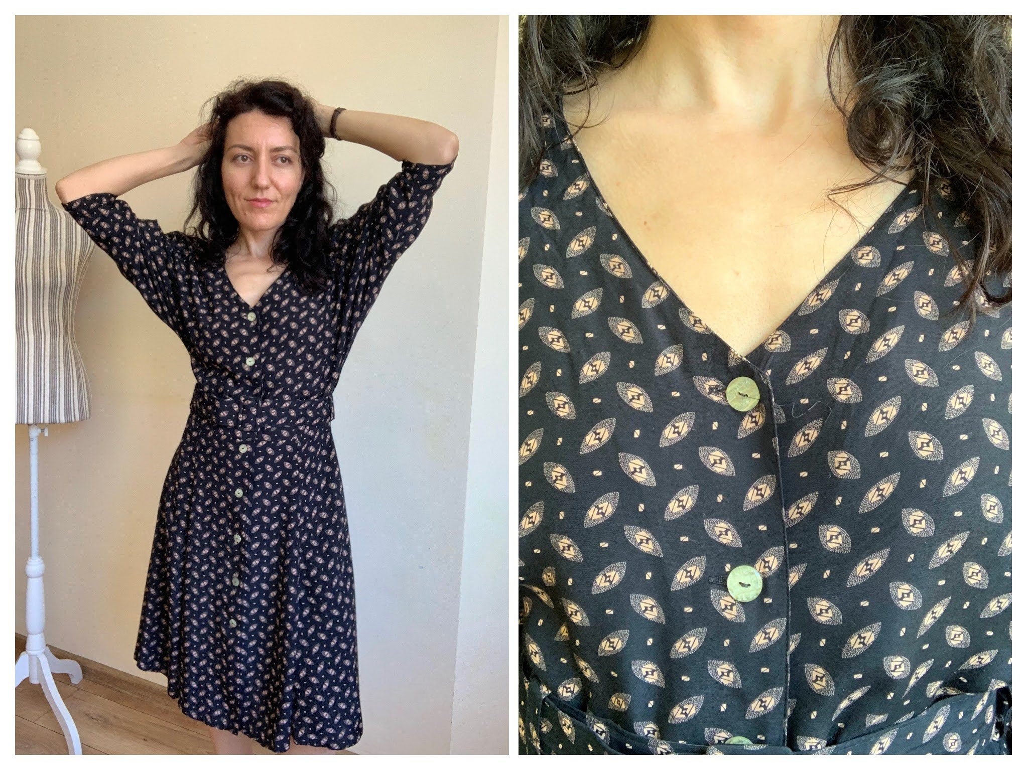 This is a beautiful fit and flare shirt dress for women with v neck and button down closure. This retro black dress has 3/4 length bat sleeves and detachable belt. This midi dress flares beautifully as you walk. It is made of 100% viscose fabric. The size marked on the label is 42. This knee length dress fits like size M. I am modelling this black dress and I wear size S, EUR 36, US 6, UK 10. I am 5' 3" tall. This dress fits me nicely, perhaps a little too loose around the shoulders. Please check the measurements below.