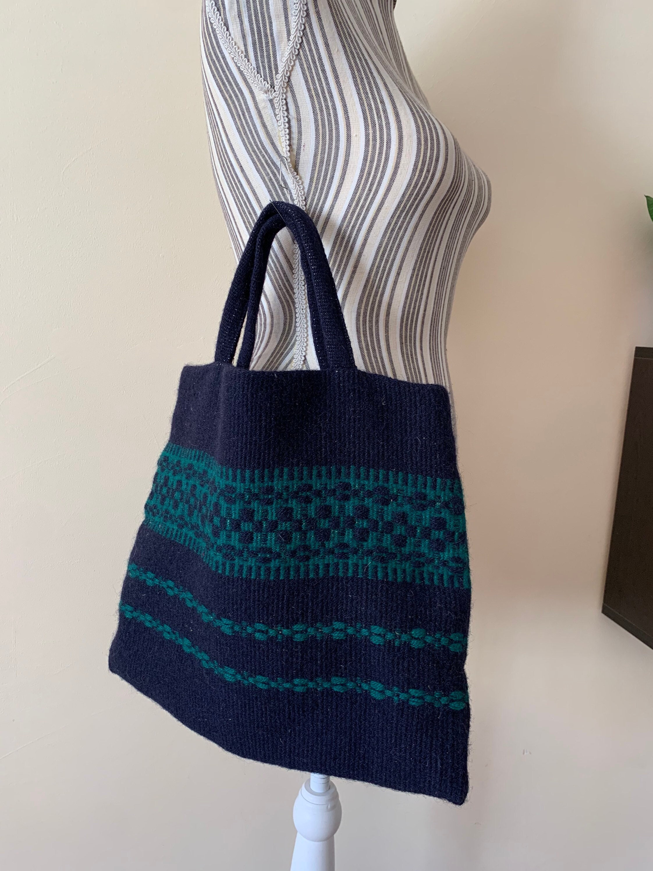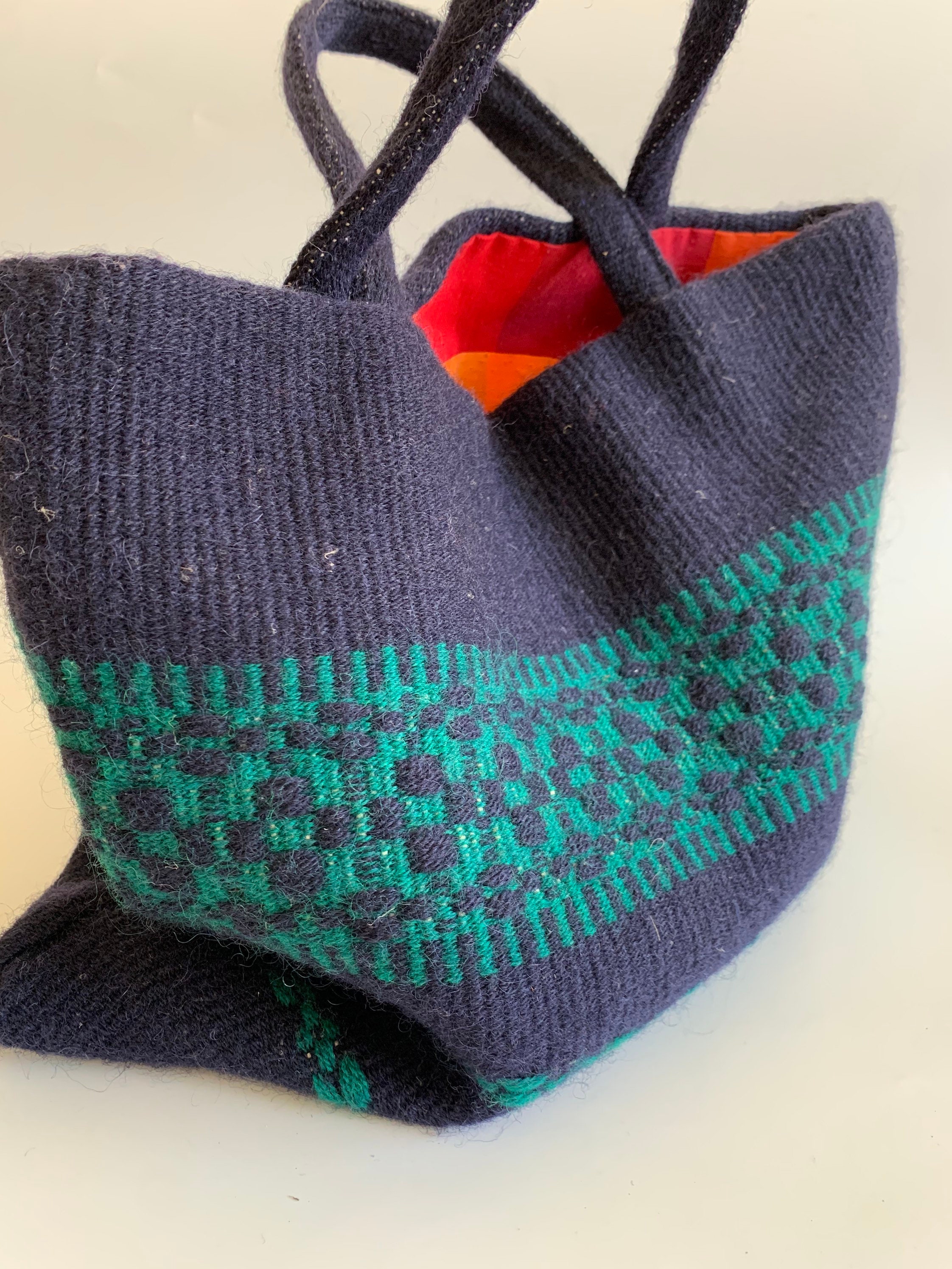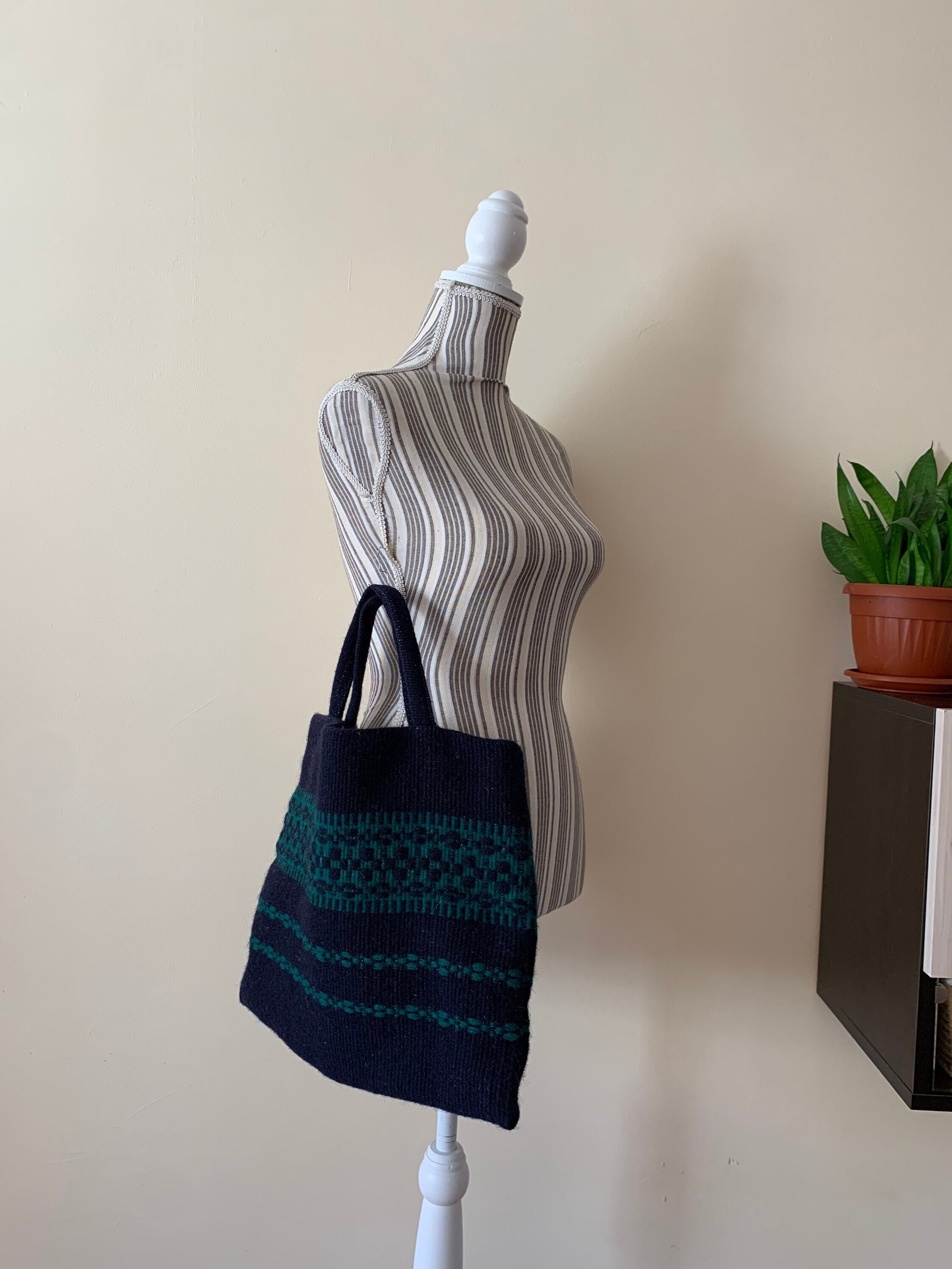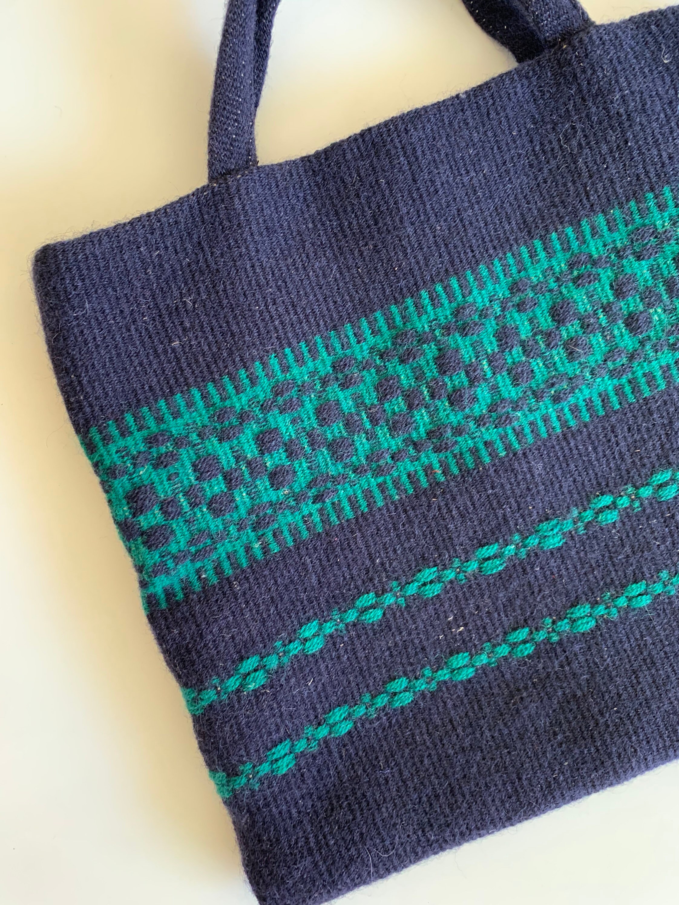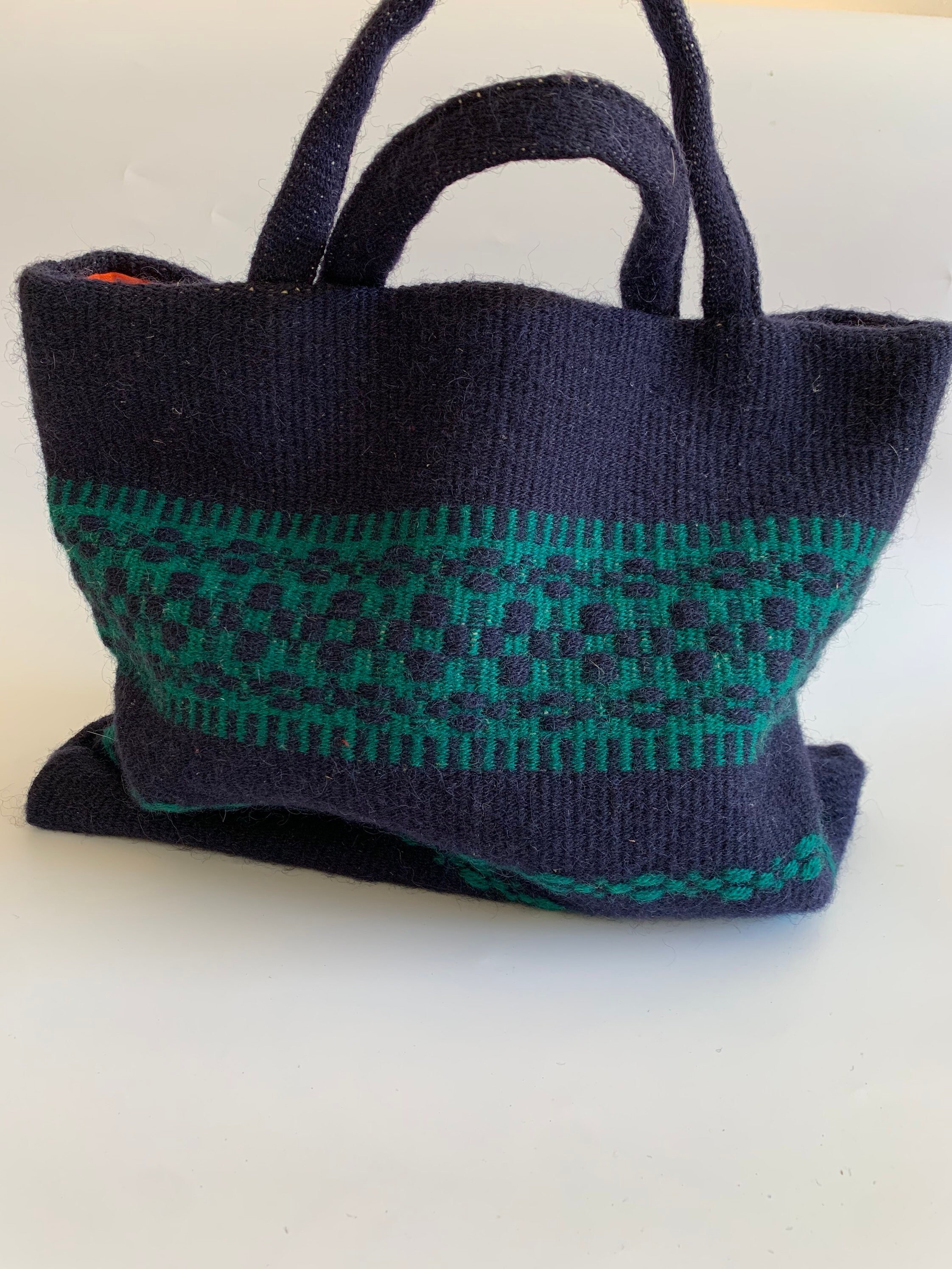 This is a beautiful tribal handwoven handbag, made of wool yarn and cotton lining. This bohemian purse is navy blue color with a hint of green. It has two handles and open top. The interior is lined in red checkered cotton fabric. This woven wool purse has one compartment and one slip pocket.