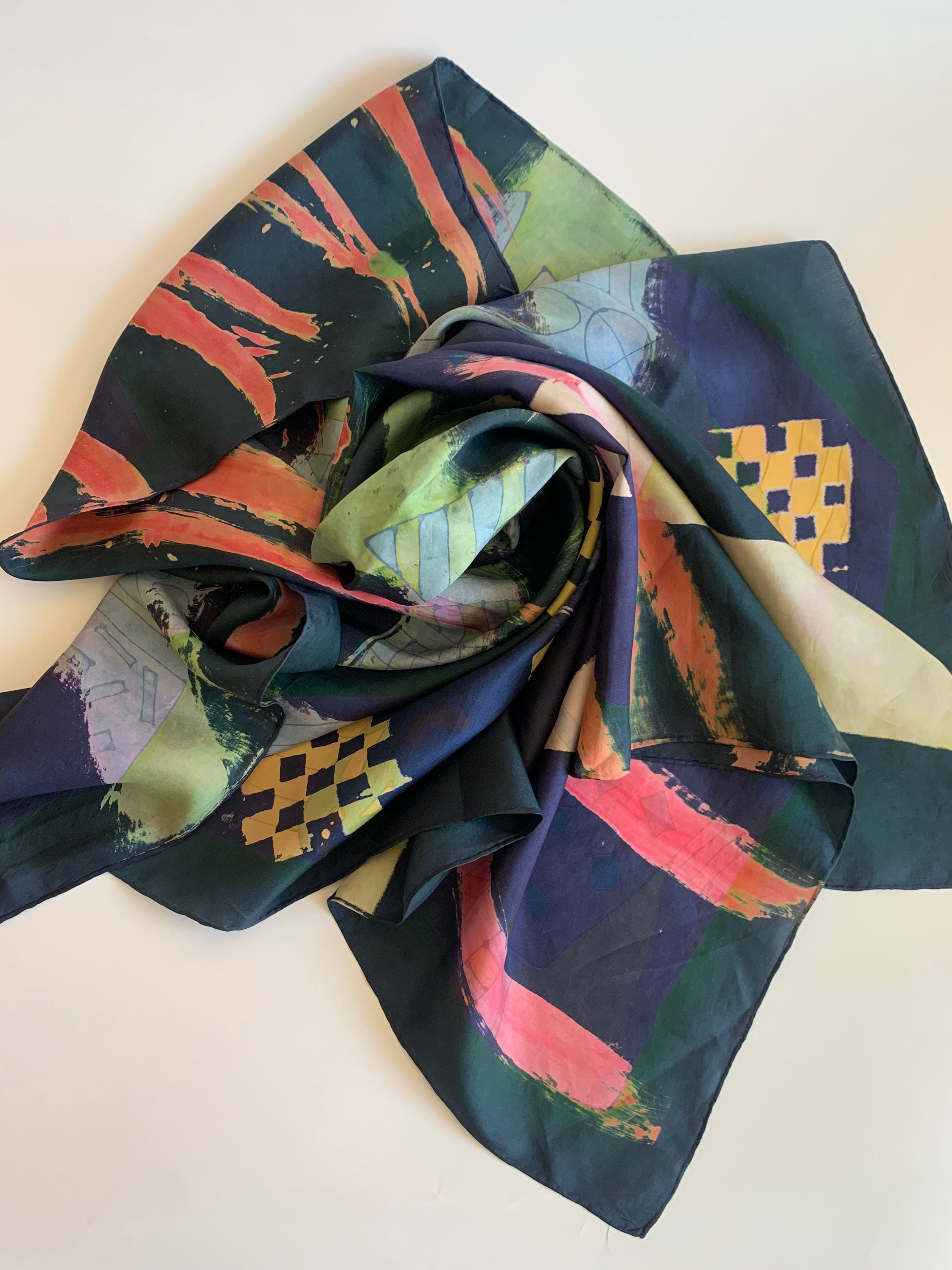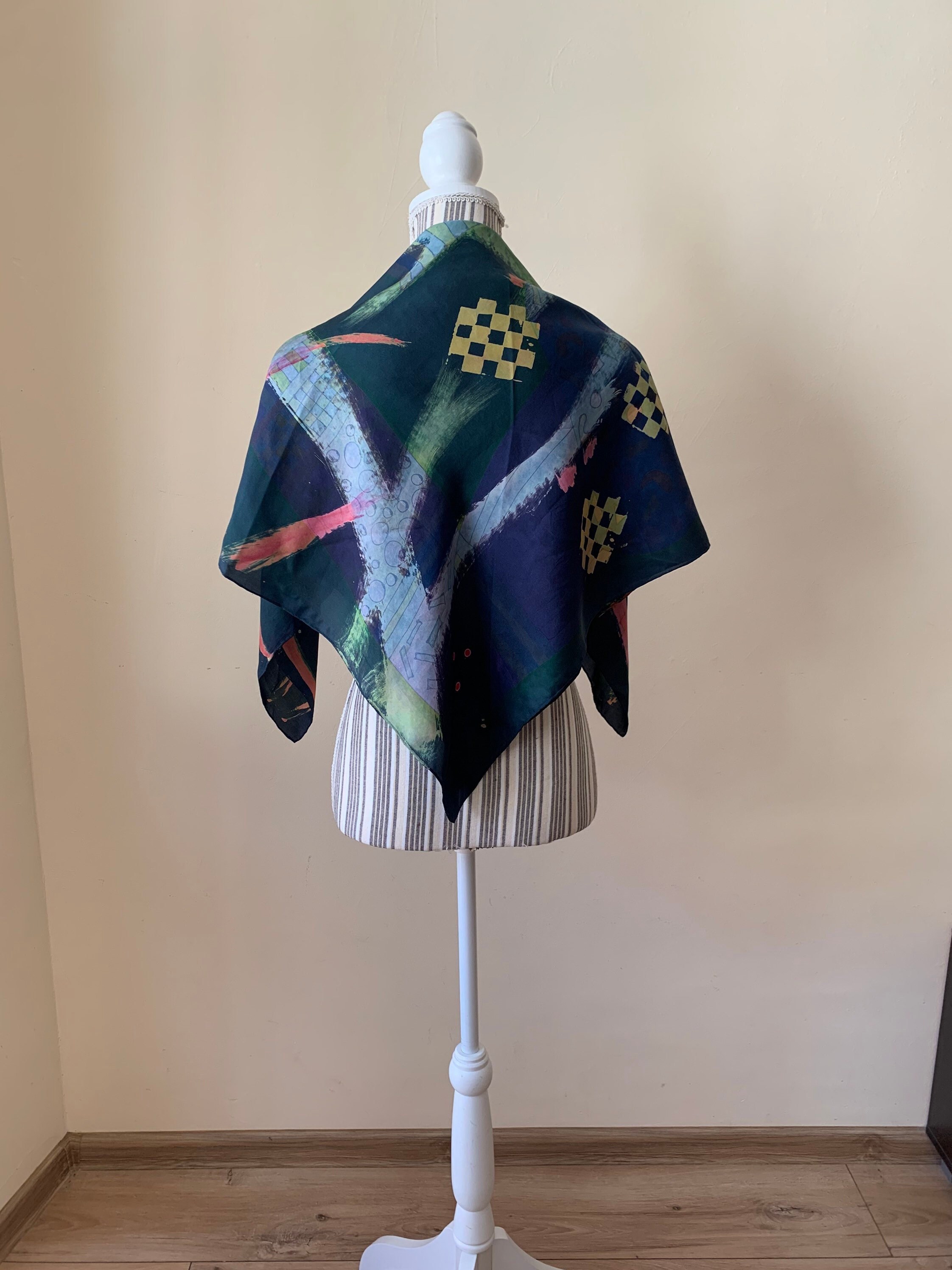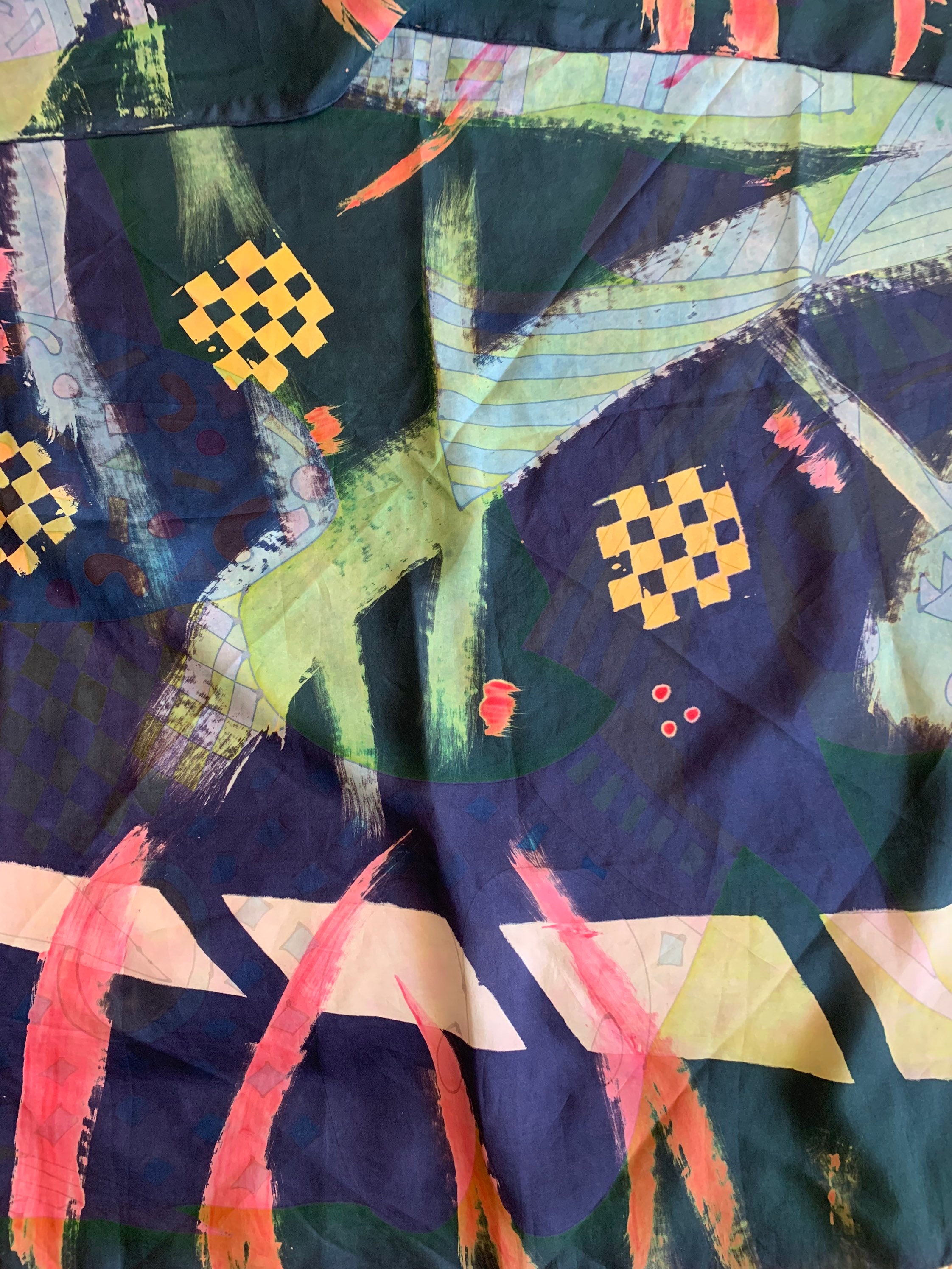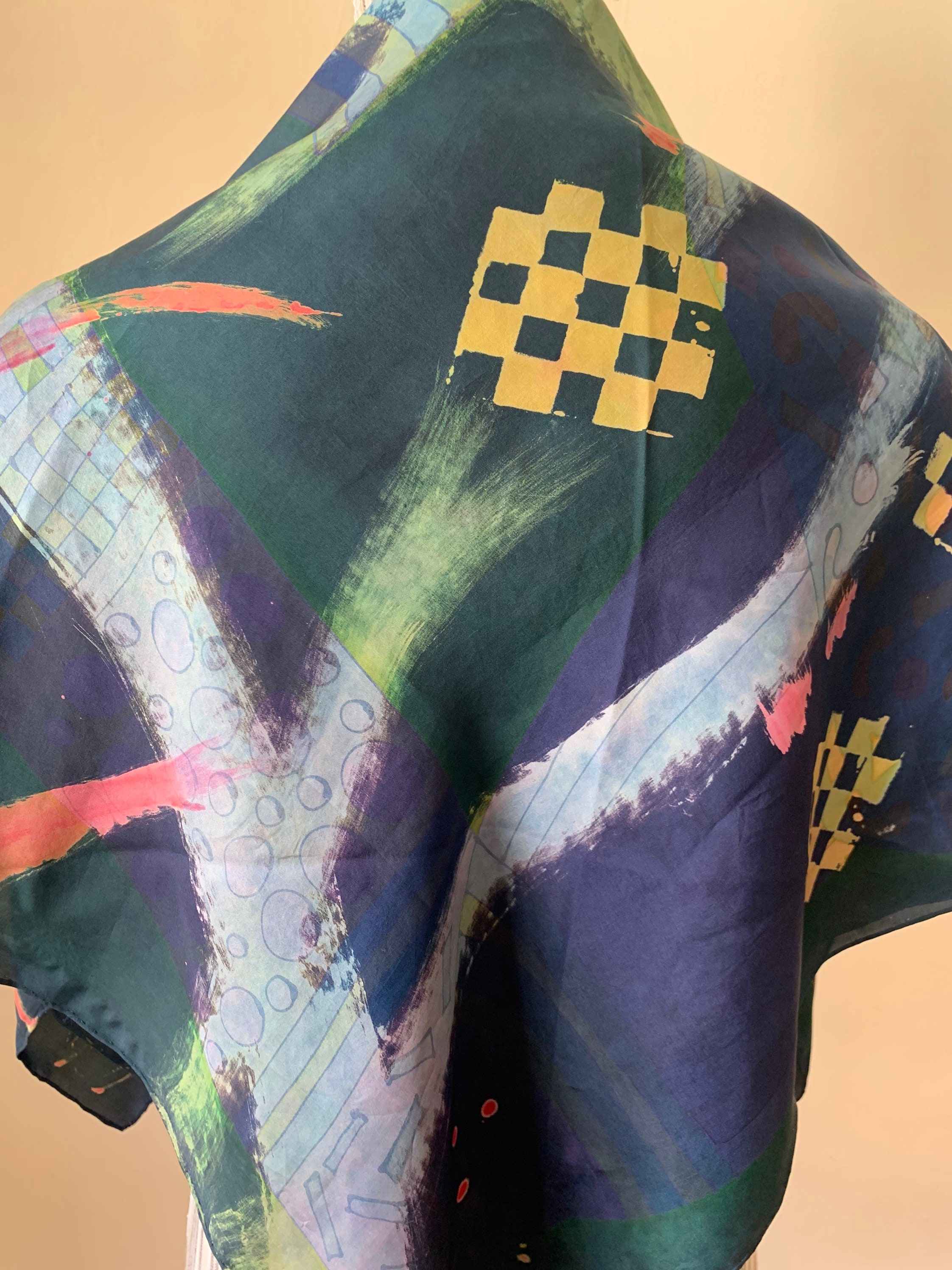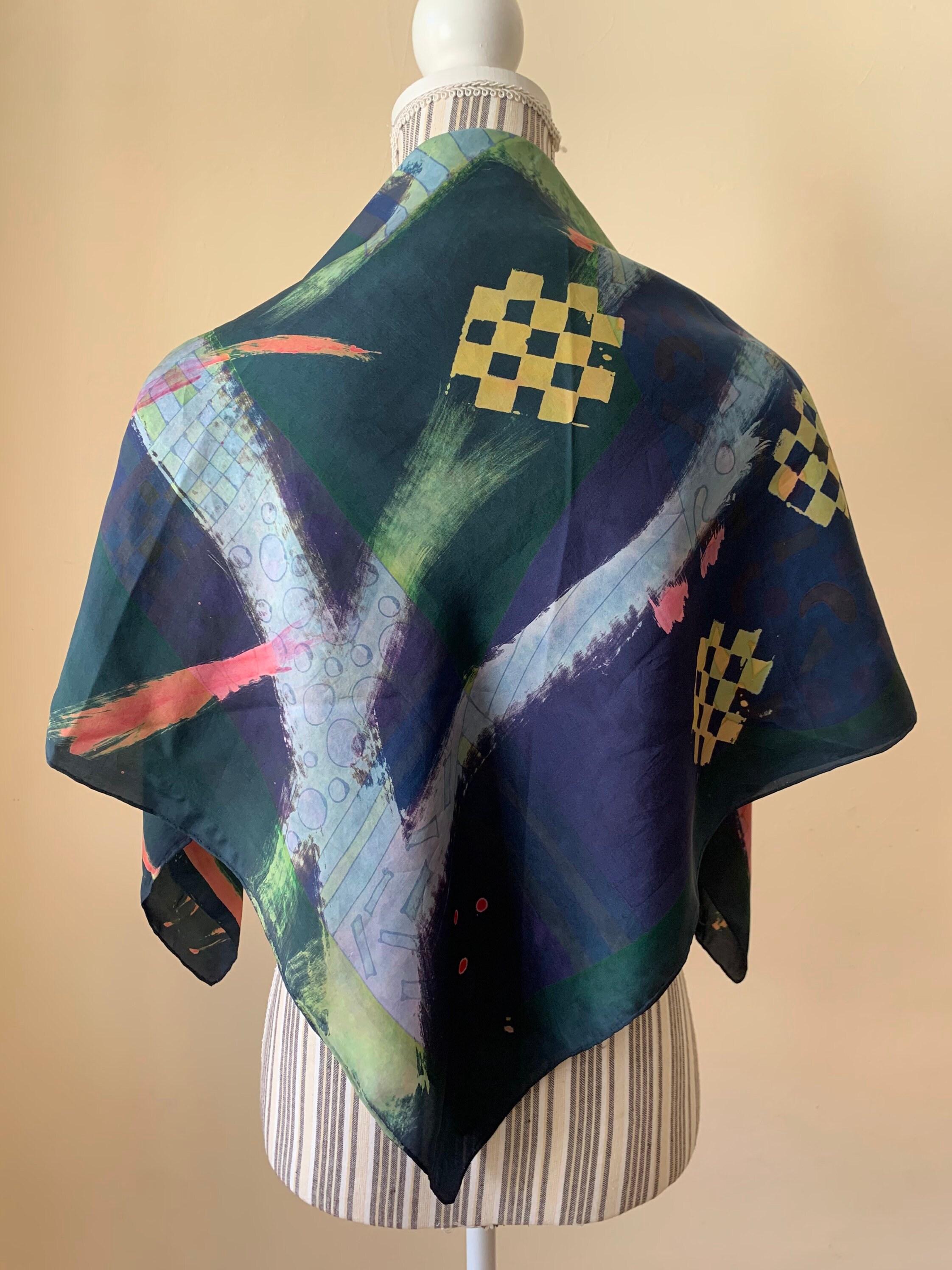 This is an awesome vintage square scarf with abstract geometric print. The psychedelic print is an explosion of colors - blue, green, pink, yellow. This large neck scarf has hand rolled edges. The material feels like very light semi sheer cotton fabric. There is no label on the scarf to show the material though. Lovely statement neck accessory to add a pop of color to your outfit.