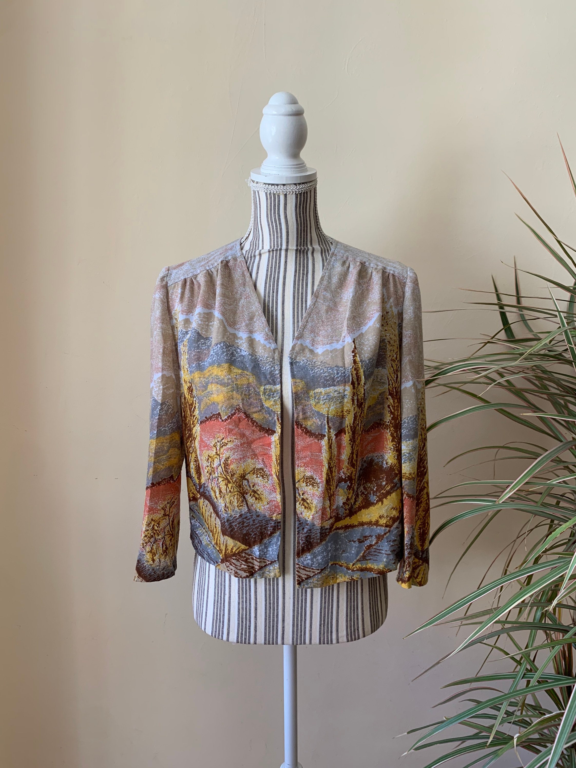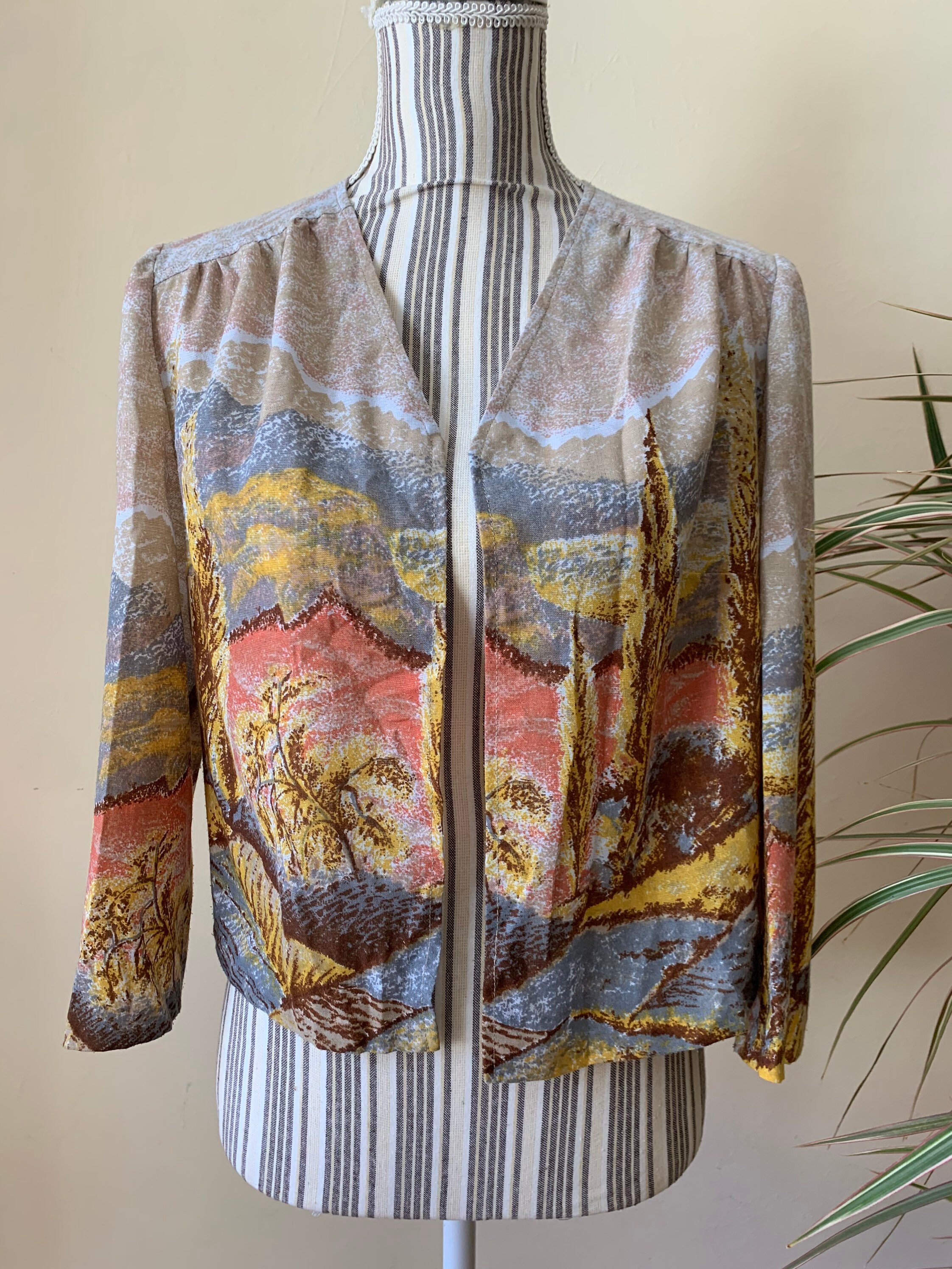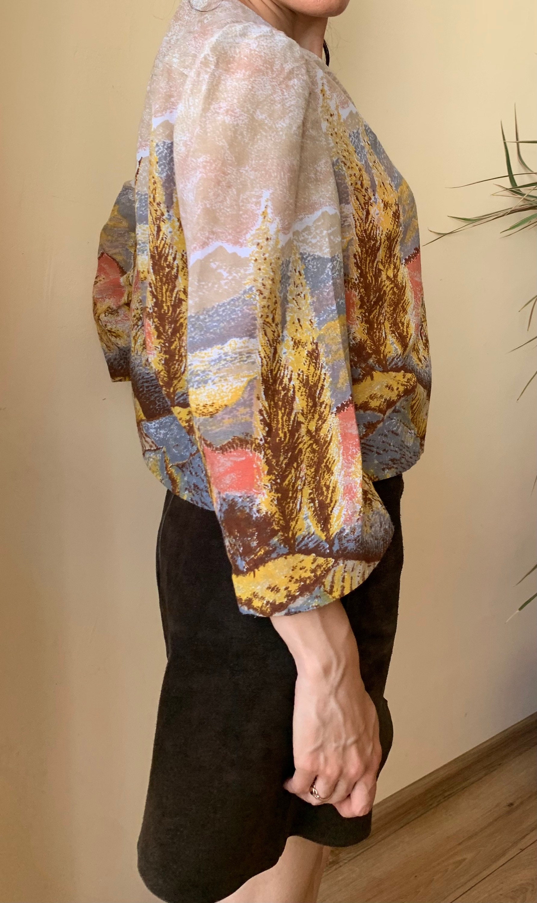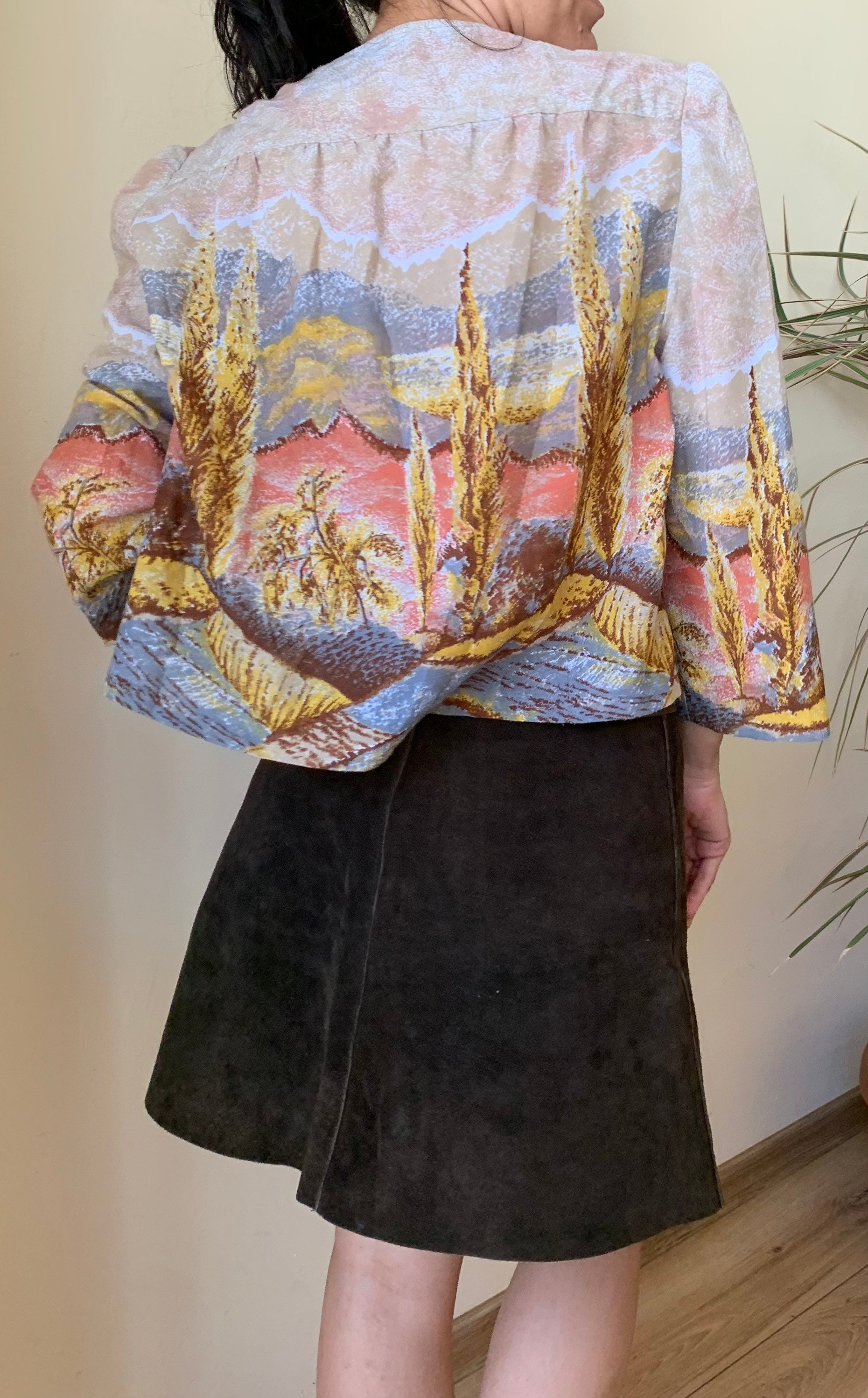 This is a wonderful vintage 80s super light summer coat for women. This unlined cropped blazer is made of thin almost see through fabric. As this vintage coat was handmade there are no labels to show the size or materials. The fabric feels like light cotton. It has no stretch. This open front cardigan fist like size S. I am modelling the garment and I am size US 6, EUR 36, UK 10, 5' 3" tall. The fabric of this short cardie has a beautiful landscape print which looks like a painting. This art print blazer has a loose fit and boxy shape. It has three quarter length sleeves. Beautiful statement summer blazer to pair with your summer dresses or tanks.