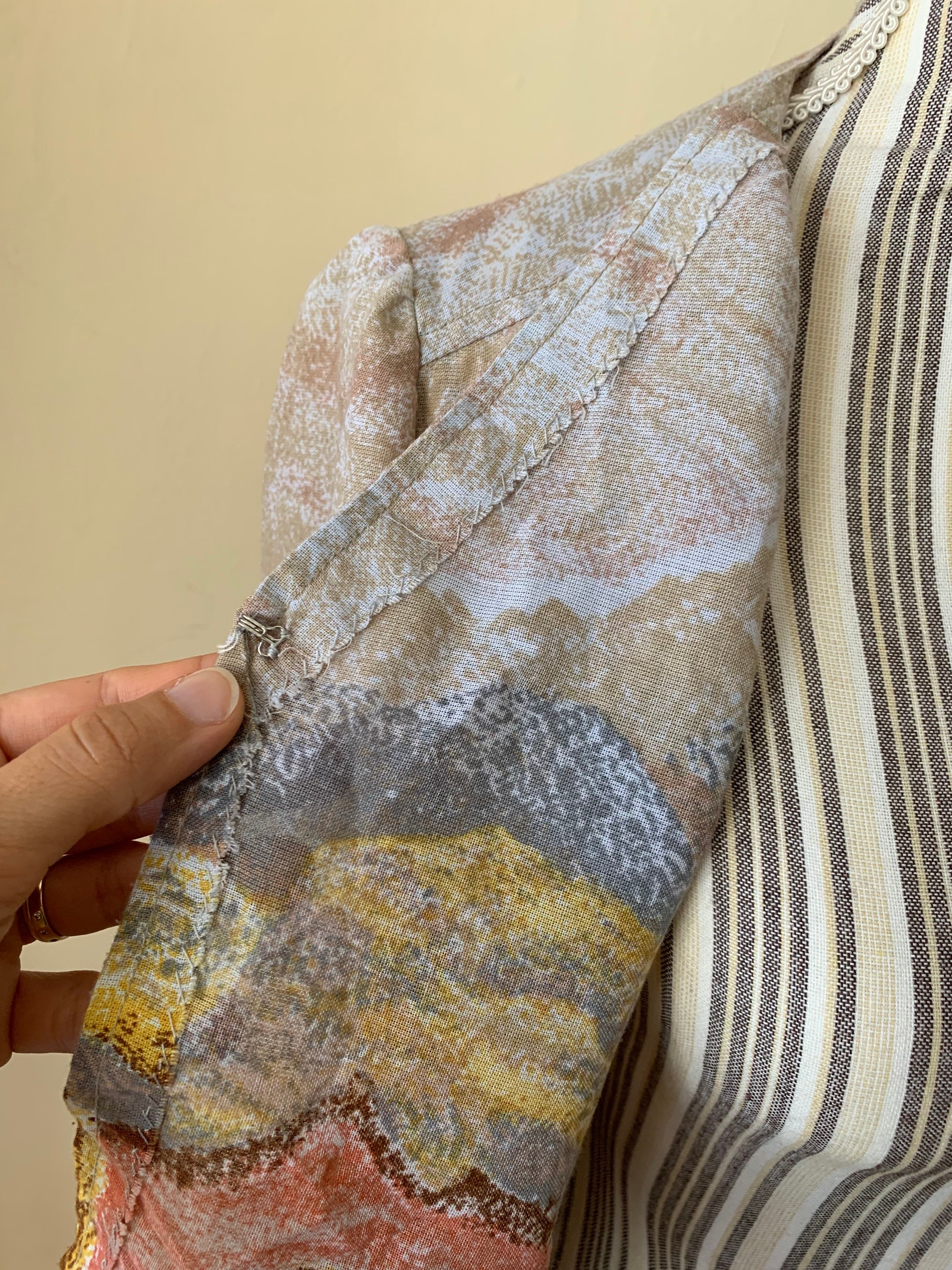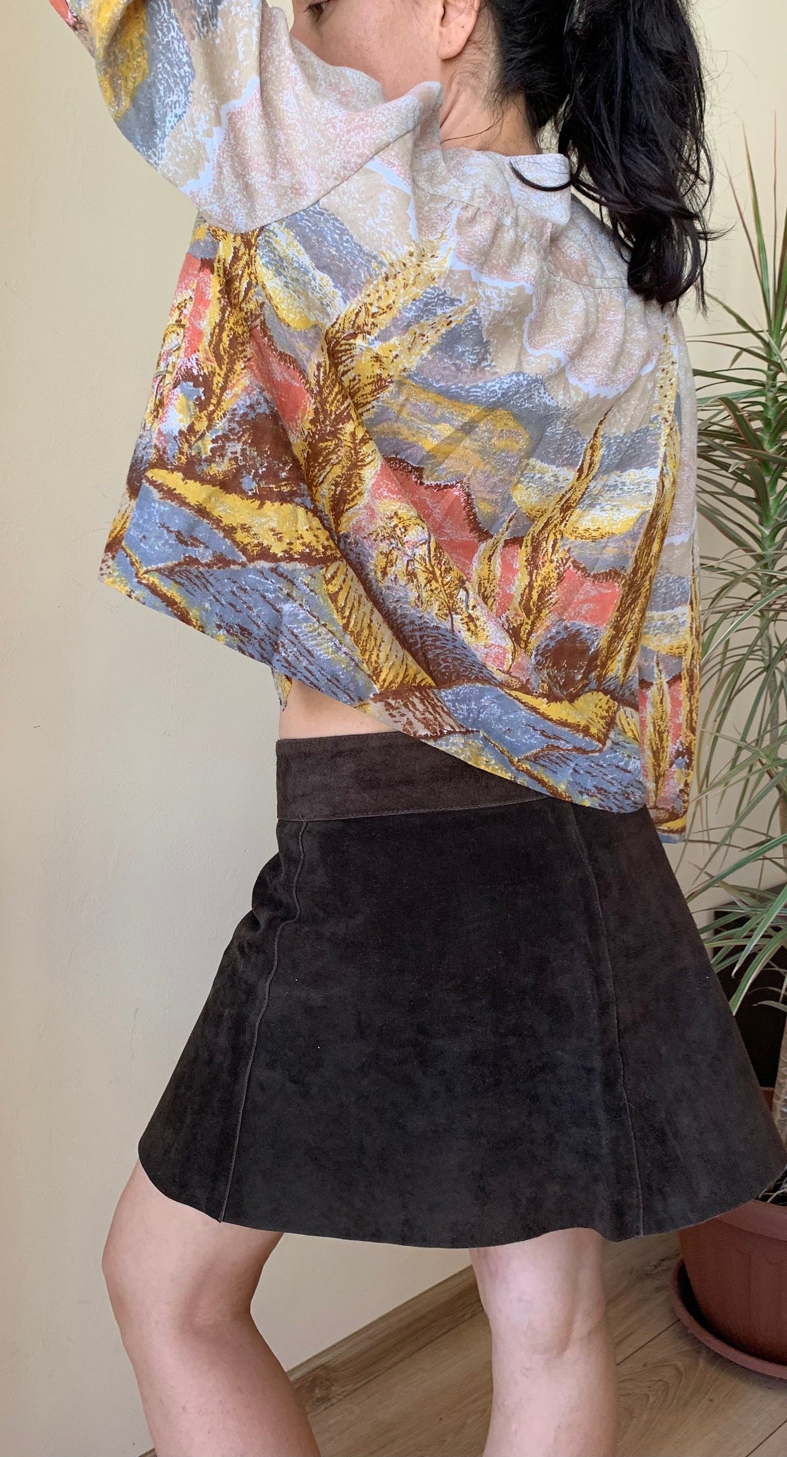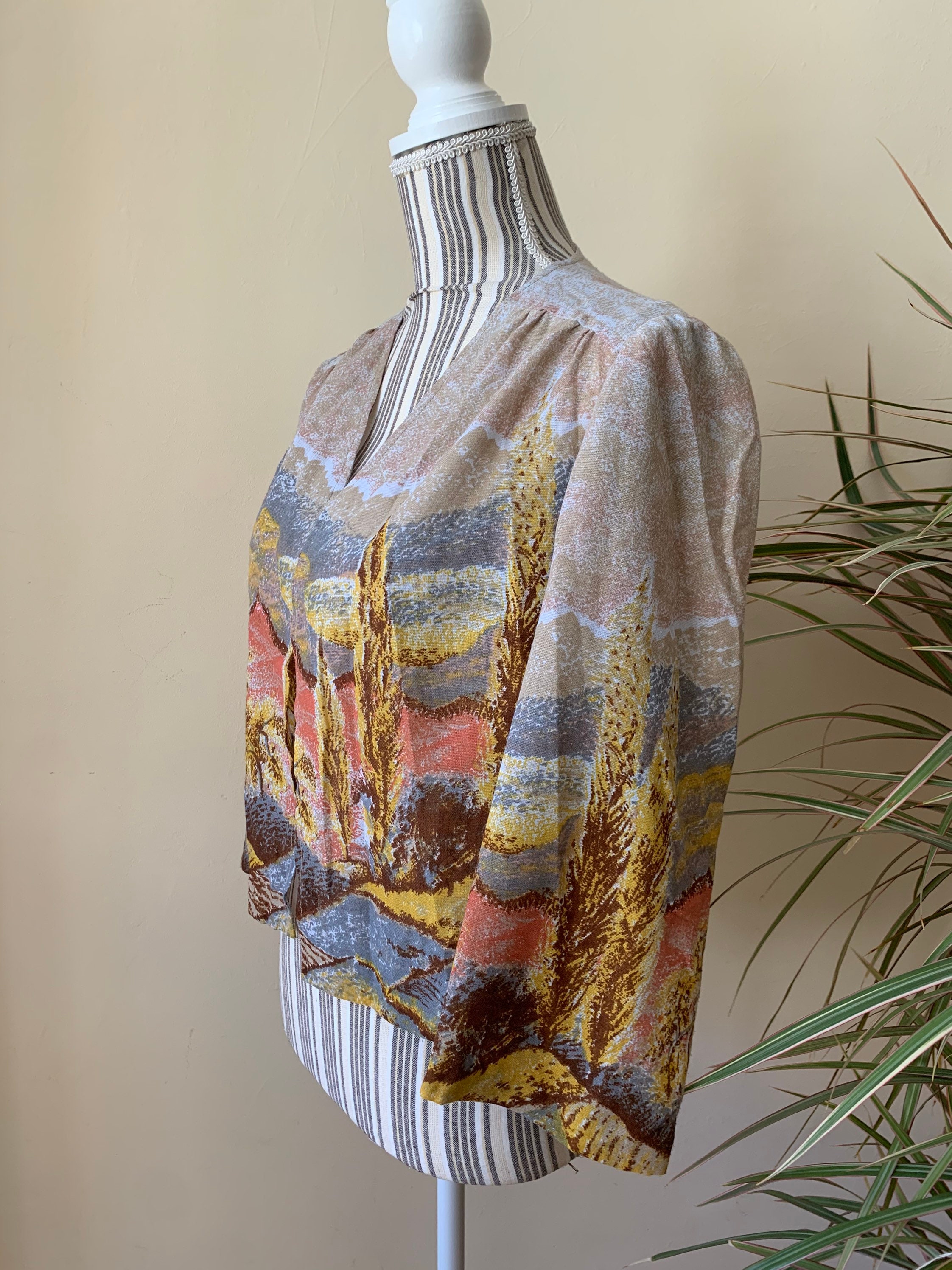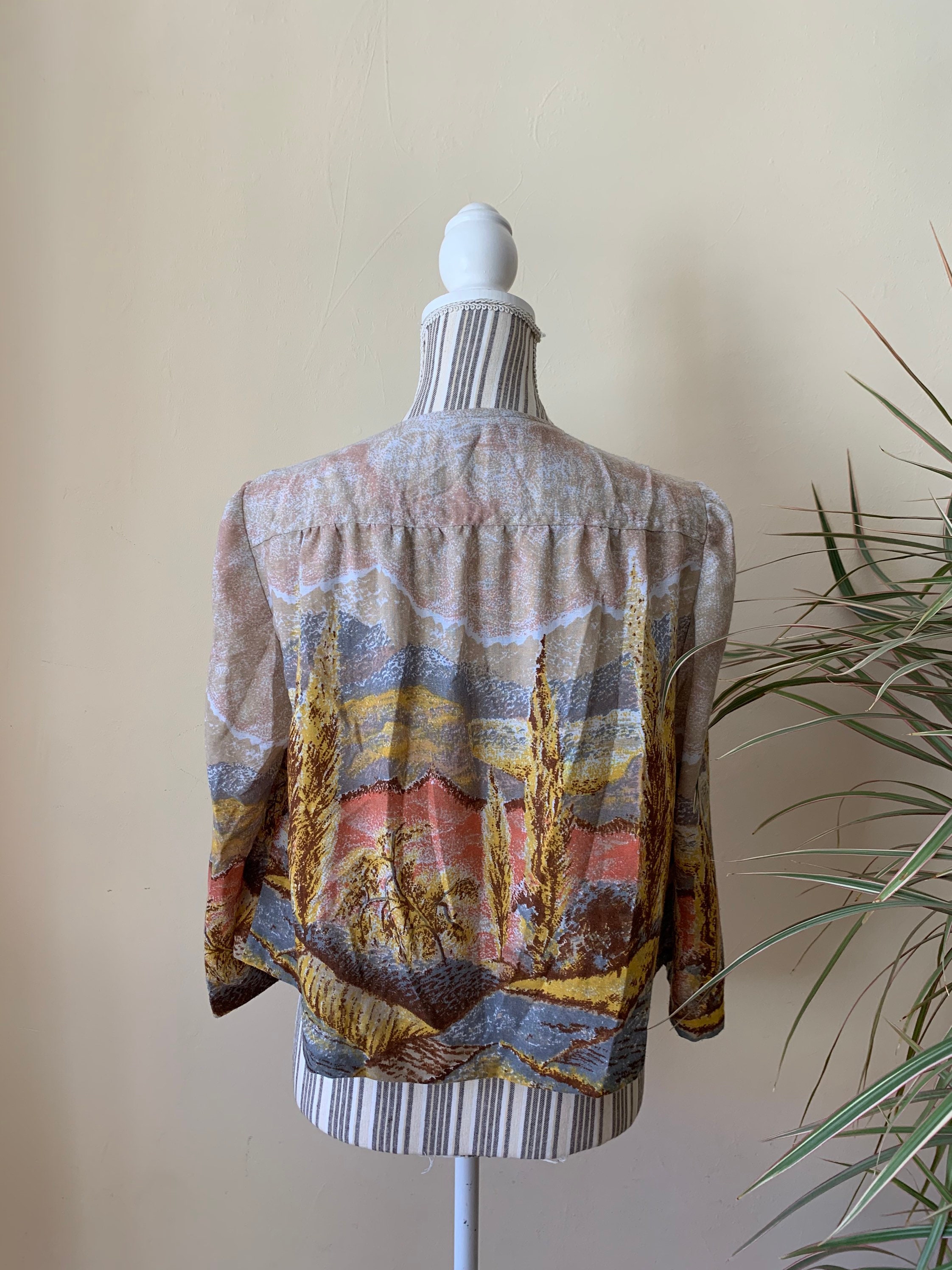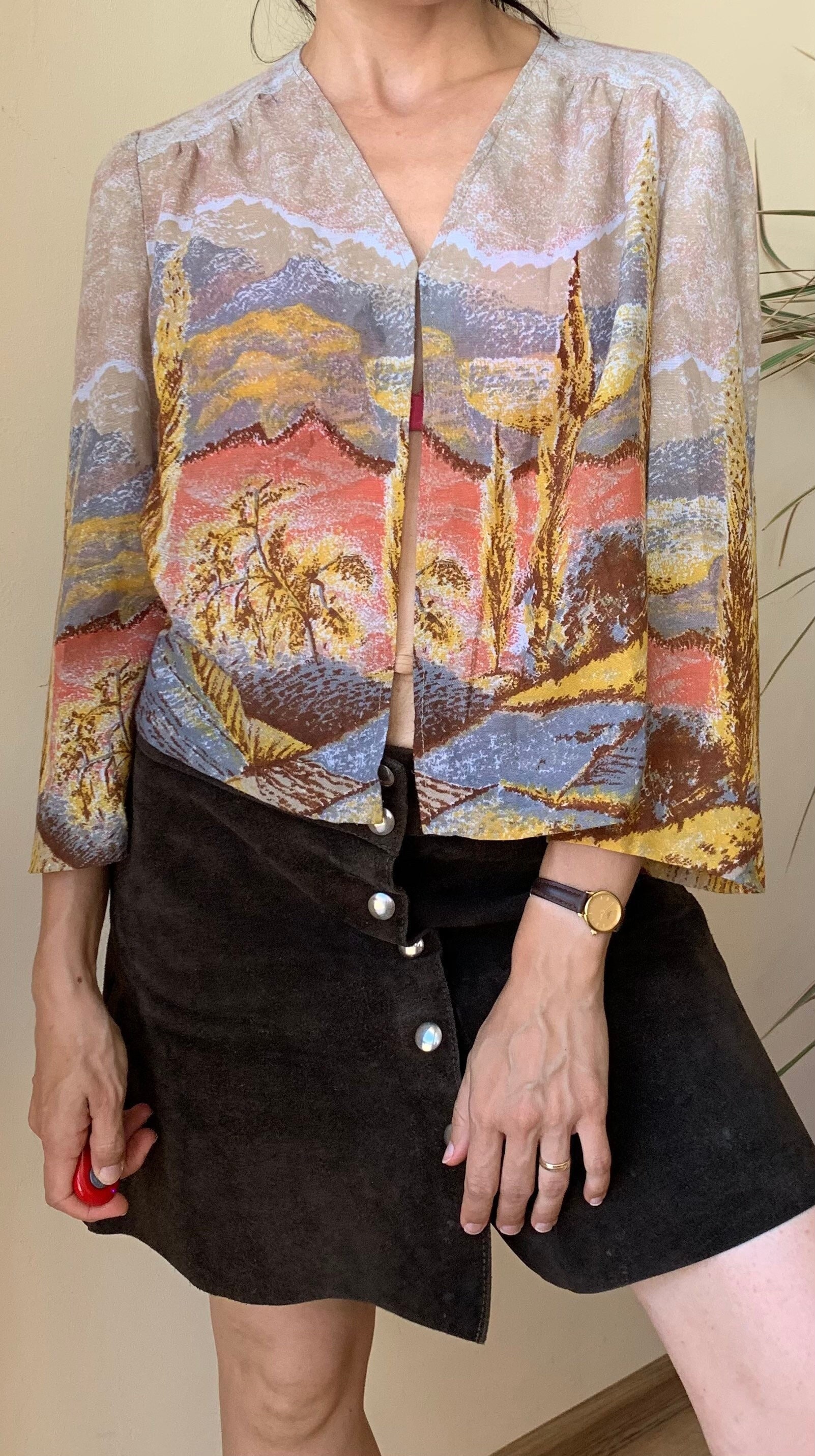 This is a wonderful vintage 80s super light summer coat for women. This unlined cropped blazer is made of thin almost see through fabric. As this vintage coat was handmade there are no labels to show the size or materials. The fabric feels like light cotton. It has no stretch. This open front cardigan fist like size S. I am modelling the garment and I am size US 6, EUR 36, UK 10, 5' 3" tall. The fabric of this short cardie has a beautiful landscape print which looks like a painting. This art print blazer has a loose fit and boxy shape. It has three quarter length sleeves. Beautiful statement summer blazer to pair with your summer dresses or tanks.