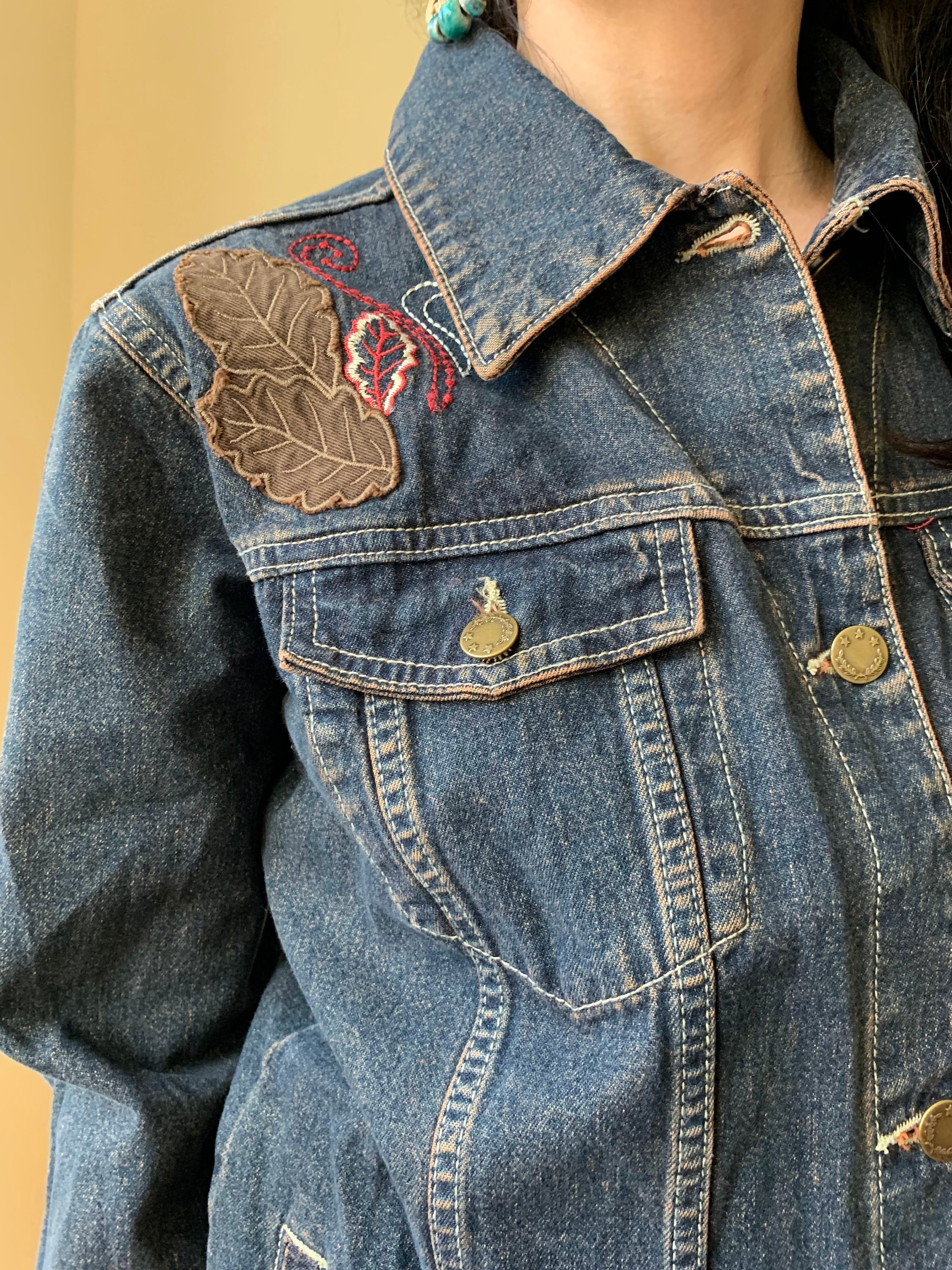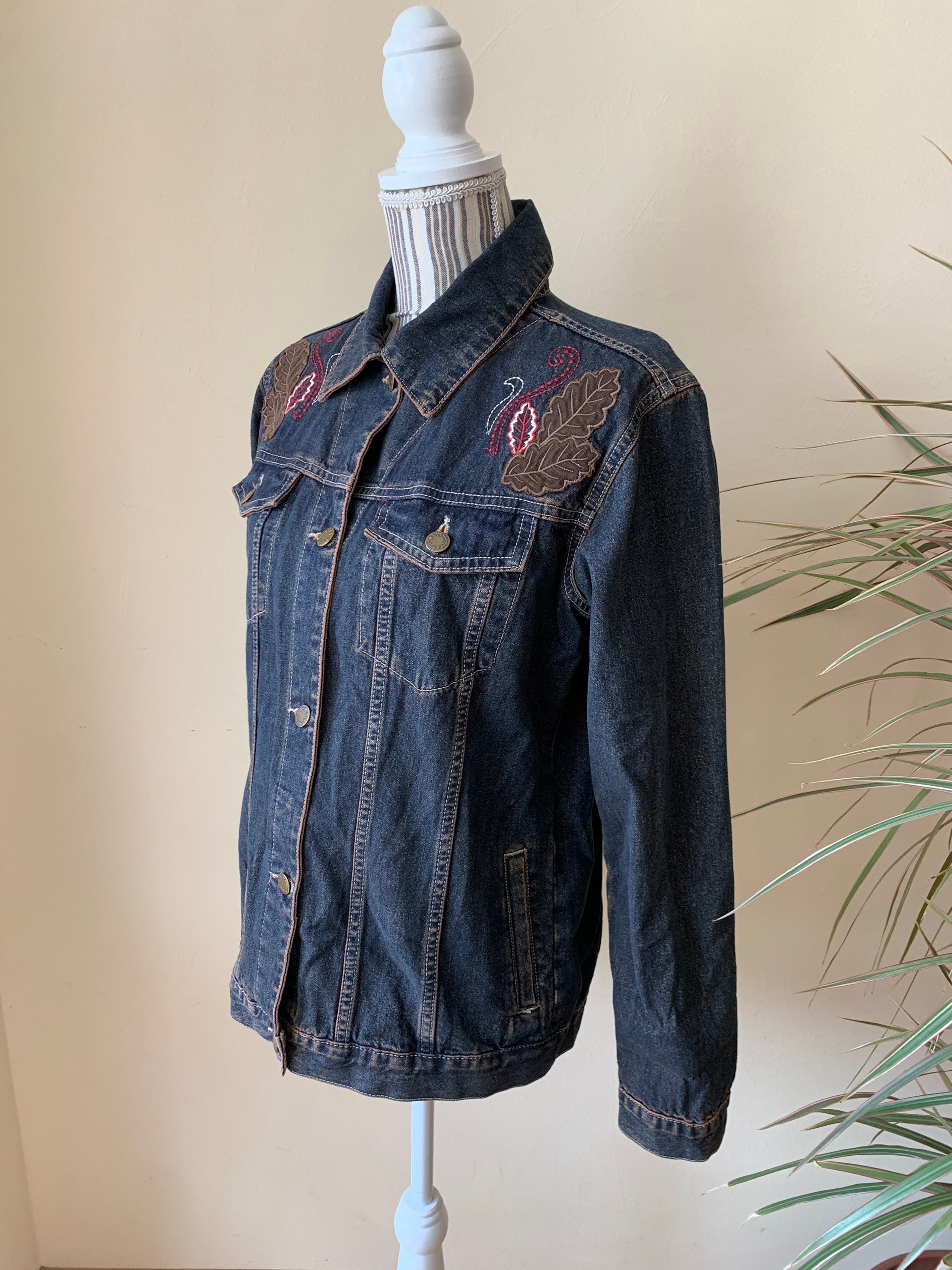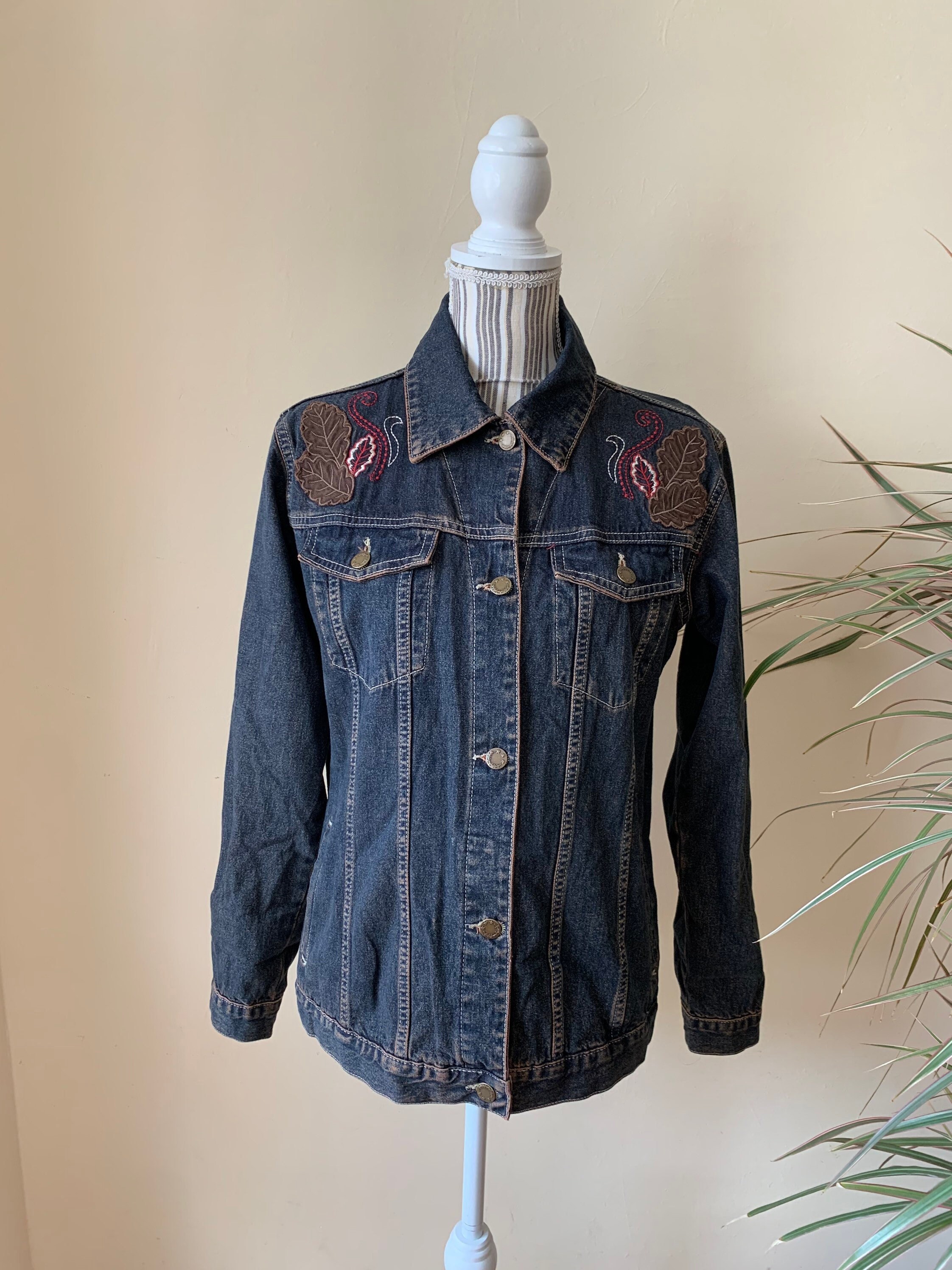 This is a vintage 90s dark blue denim jacket with rust brown detailing. This button down jacket has beautiful leaves embroidery on the shoulders. This vintage jean jacket is made of 100% cotton. There are two front pockets at the bust and two side pockets for your hands. The size marked on this denim jacket is GB 14, France 42, Germany 40, which probably corresponds to US 10-12. It fits like size M/L. I am modelling the garment and I am size S US 6, EUR 36, UK 10, 5' 3" tall. This denim jacket fits a bit too big and too loose, please check the measurements below.