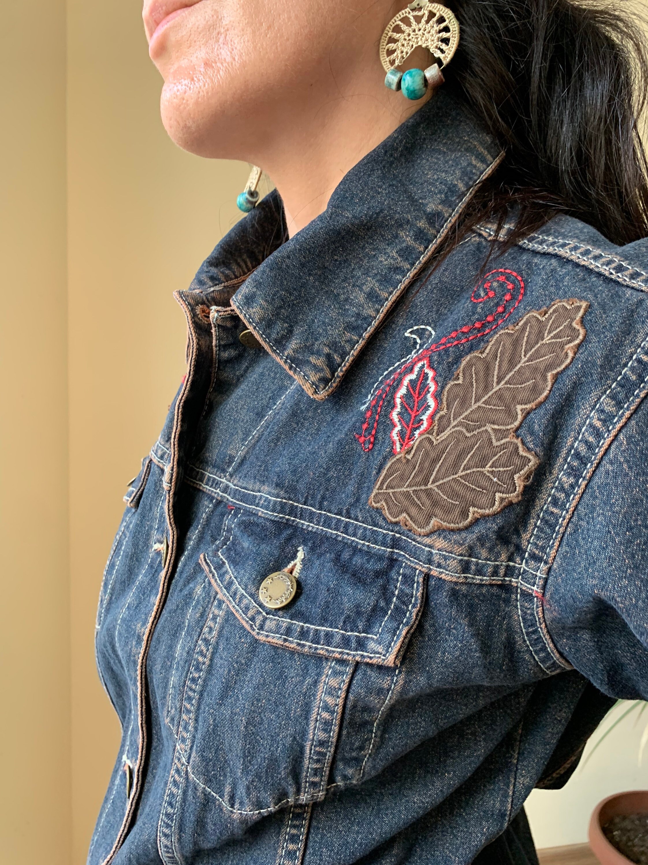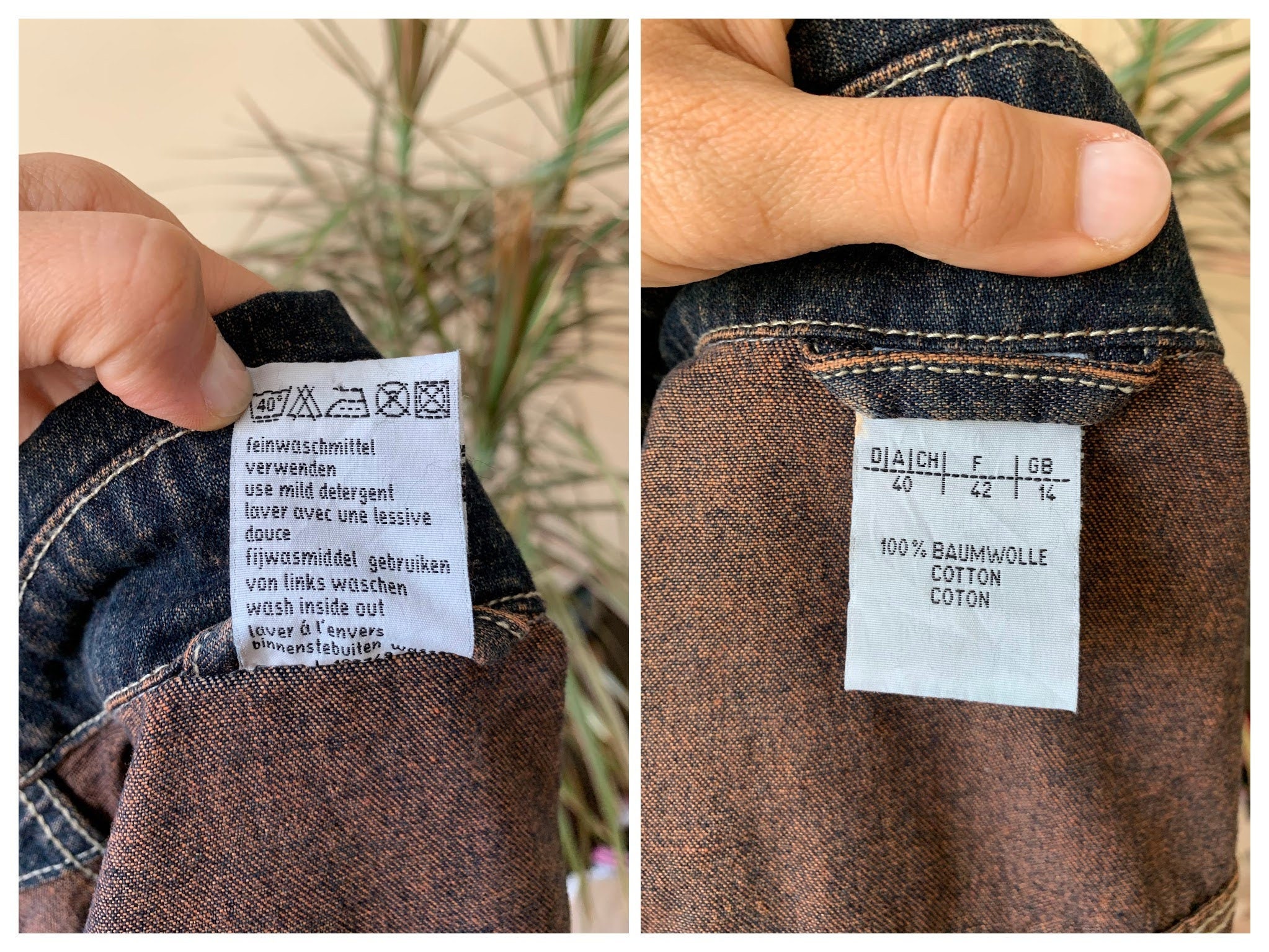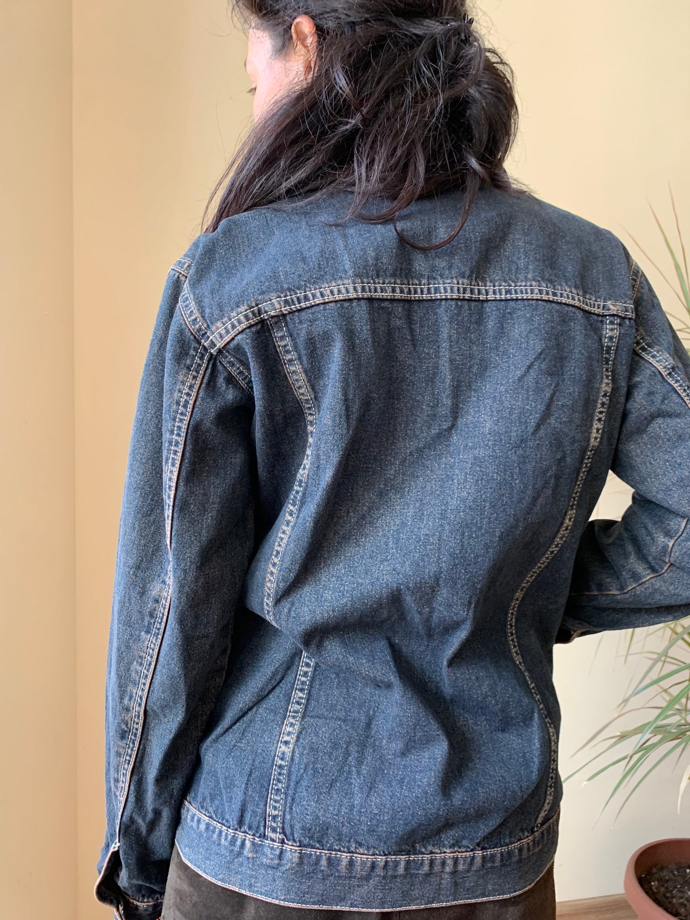 This is a vintage 90s dark blue denim jacket with rust brown detailing. This button down jacket has beautiful leaves embroidery on the shoulders. This vintage jean jacket is made of 100% cotton. There are two front pockets at the bust and two side pockets for your hands. The size marked on this denim jacket is GB 14, France 42, Germany 40, which probably corresponds to US 10-12. It fits like size M/L. I am modelling the garment and I am size S US 6, EUR 36, UK 10, 5' 3" tall. This denim jacket fits a bit too big and too loose, please check the measurements below.