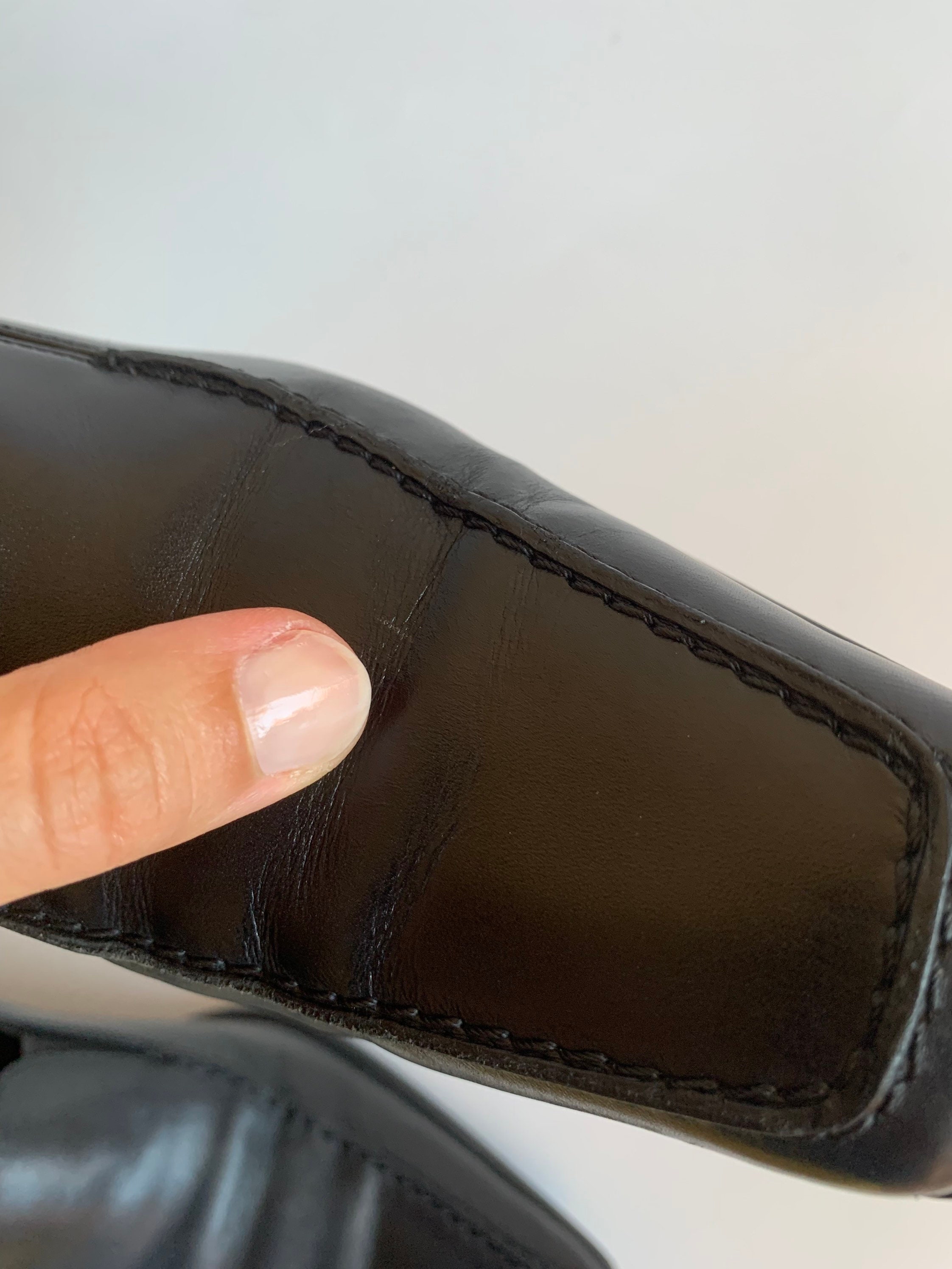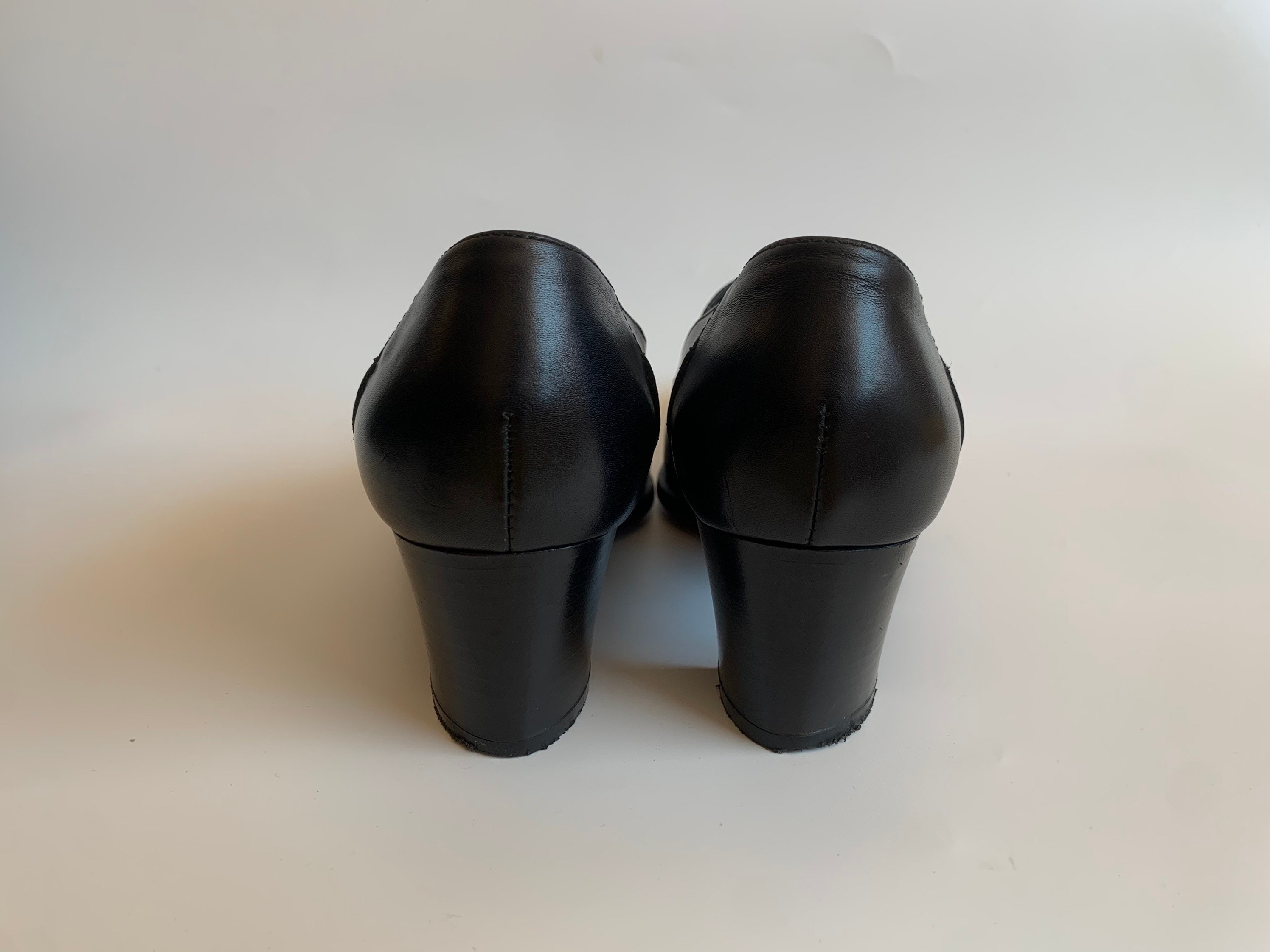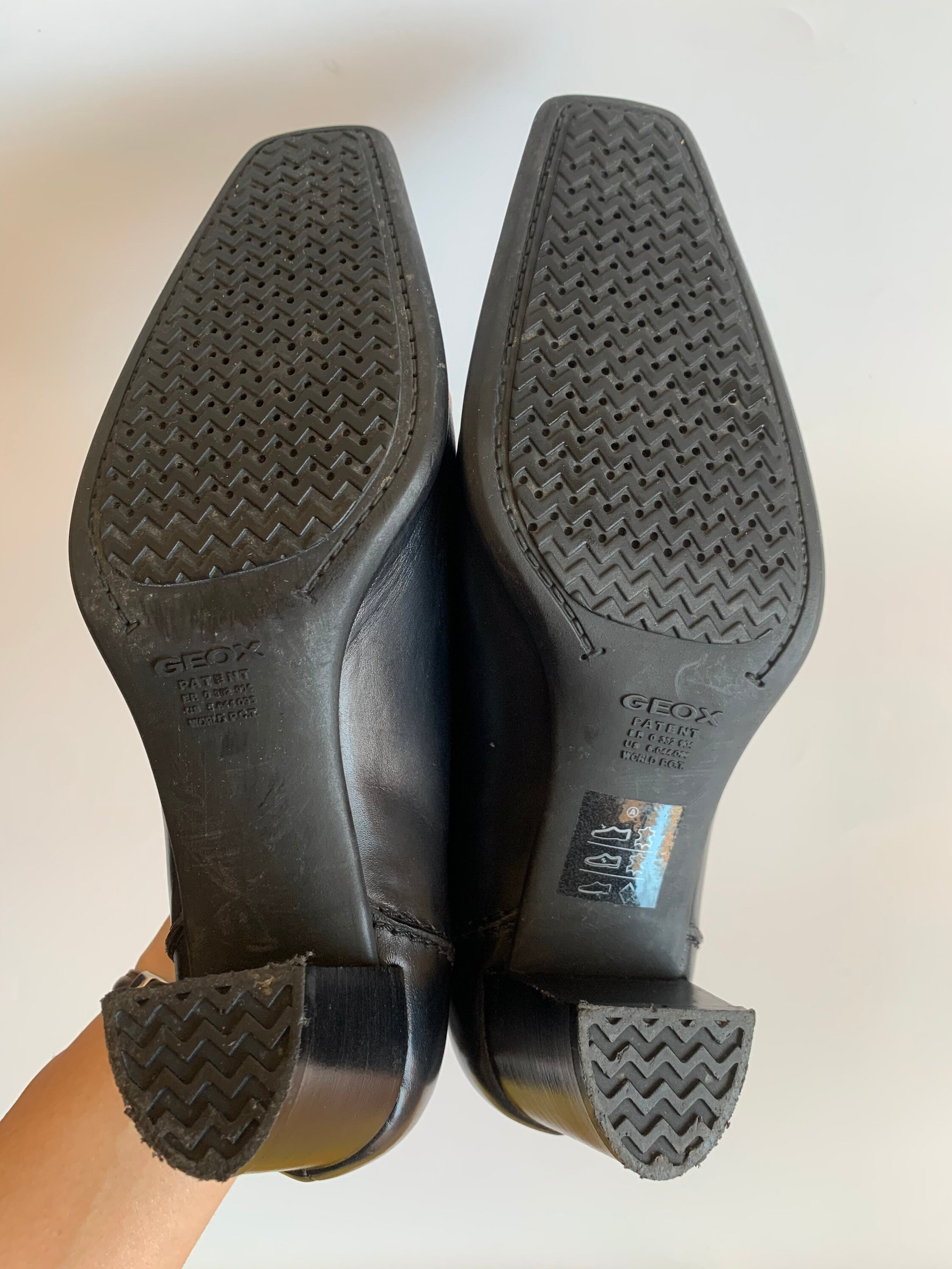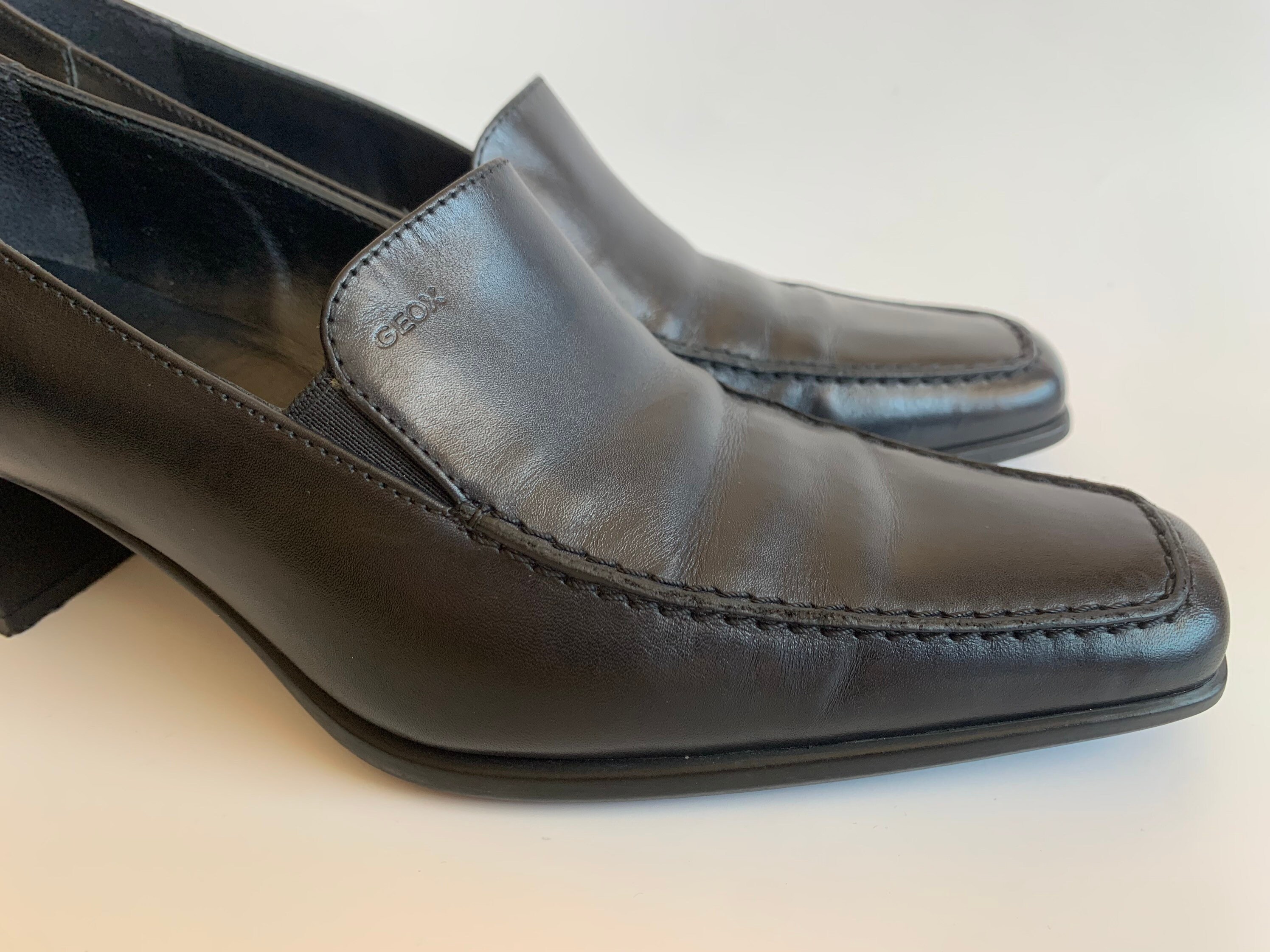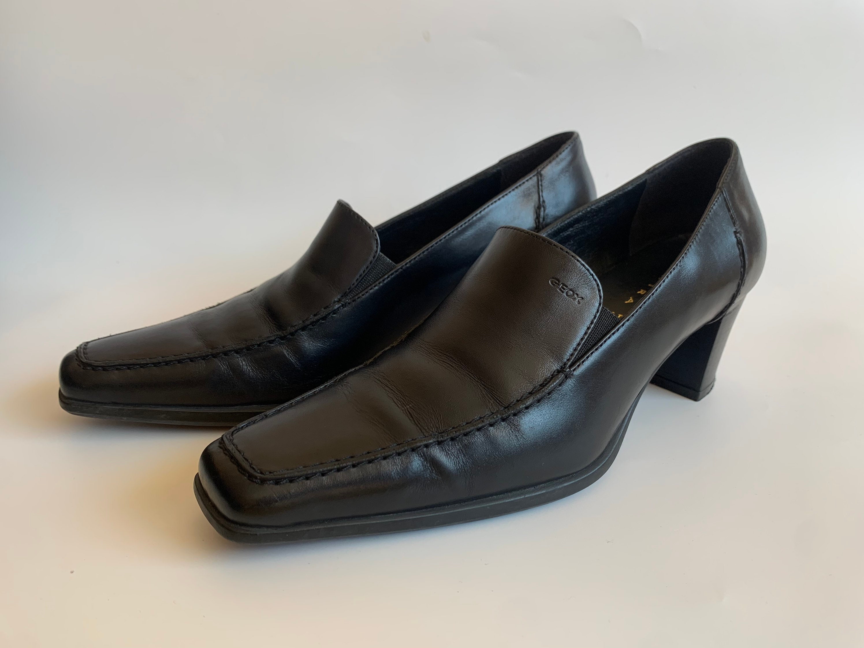 These are classic stylish vintage black leather shoes for women by Geox Respira. These 90s shoes have pointy toes and medium block heels. These slip on loafers have chunky square design. These black pumps are so elegant that you can wear them at the office, business lunches and travels. The size marked on these women's leather shoes is EUR 37, which corresponds to US 6, UK 4. Please check the measurements below.