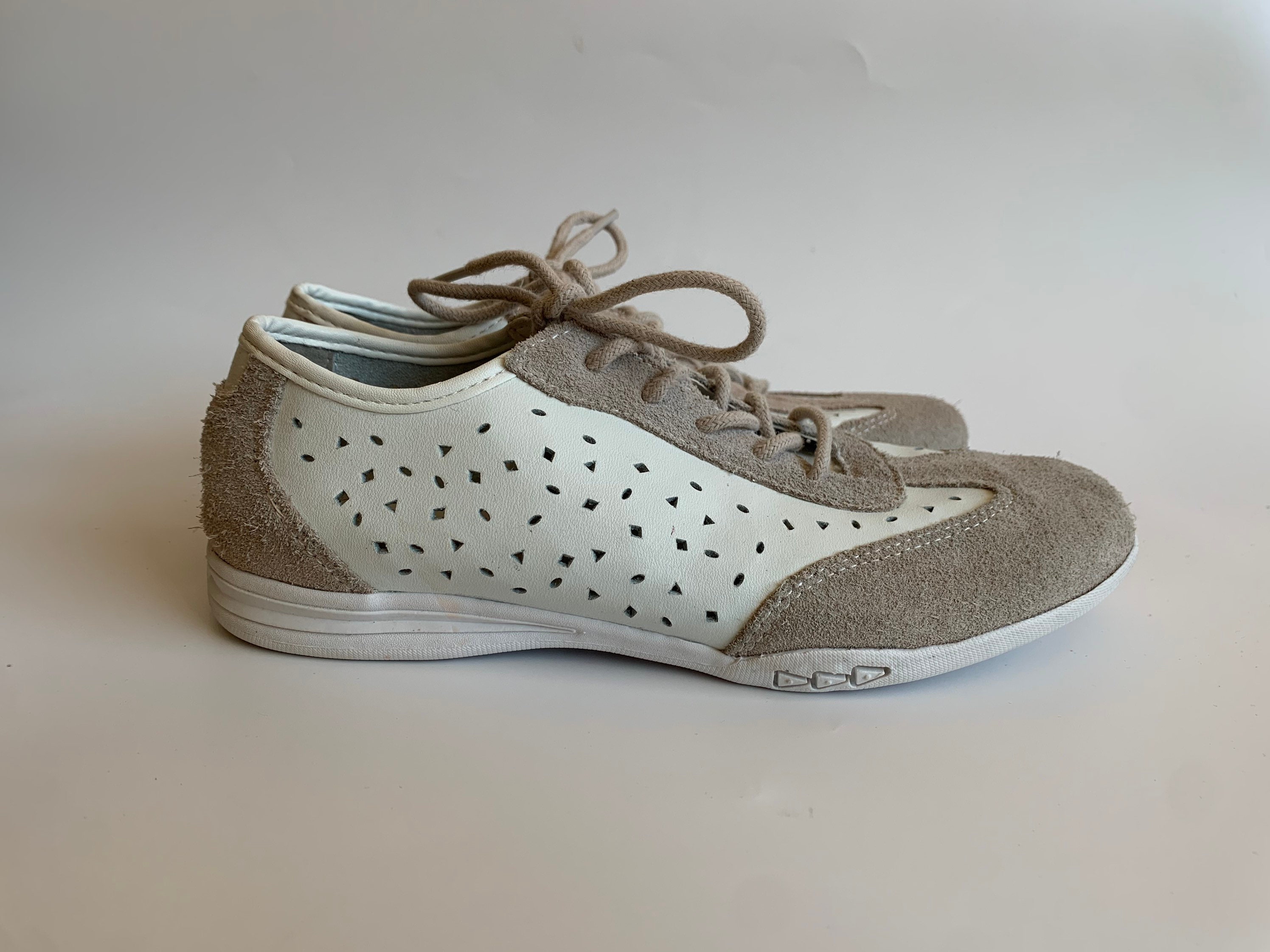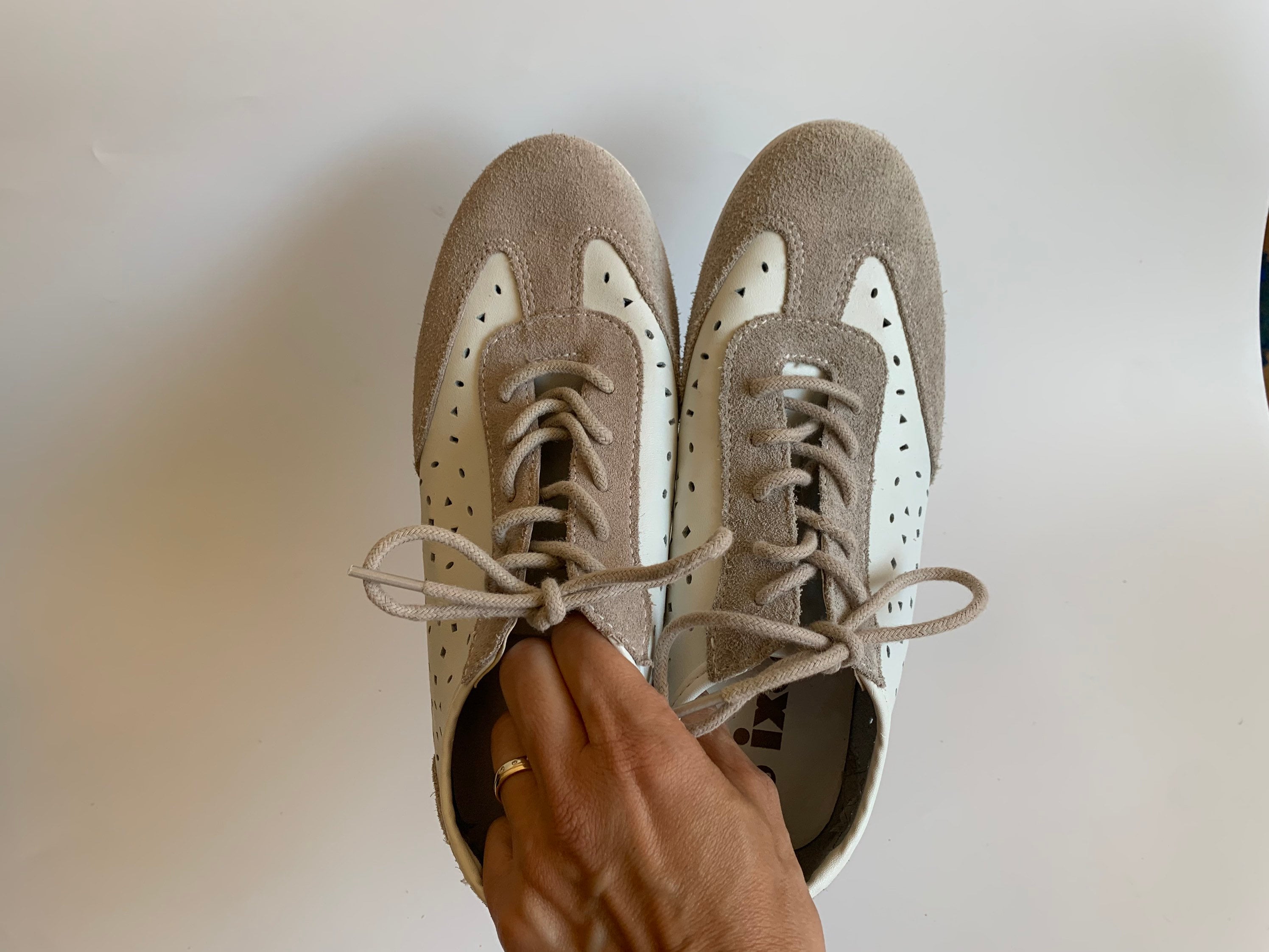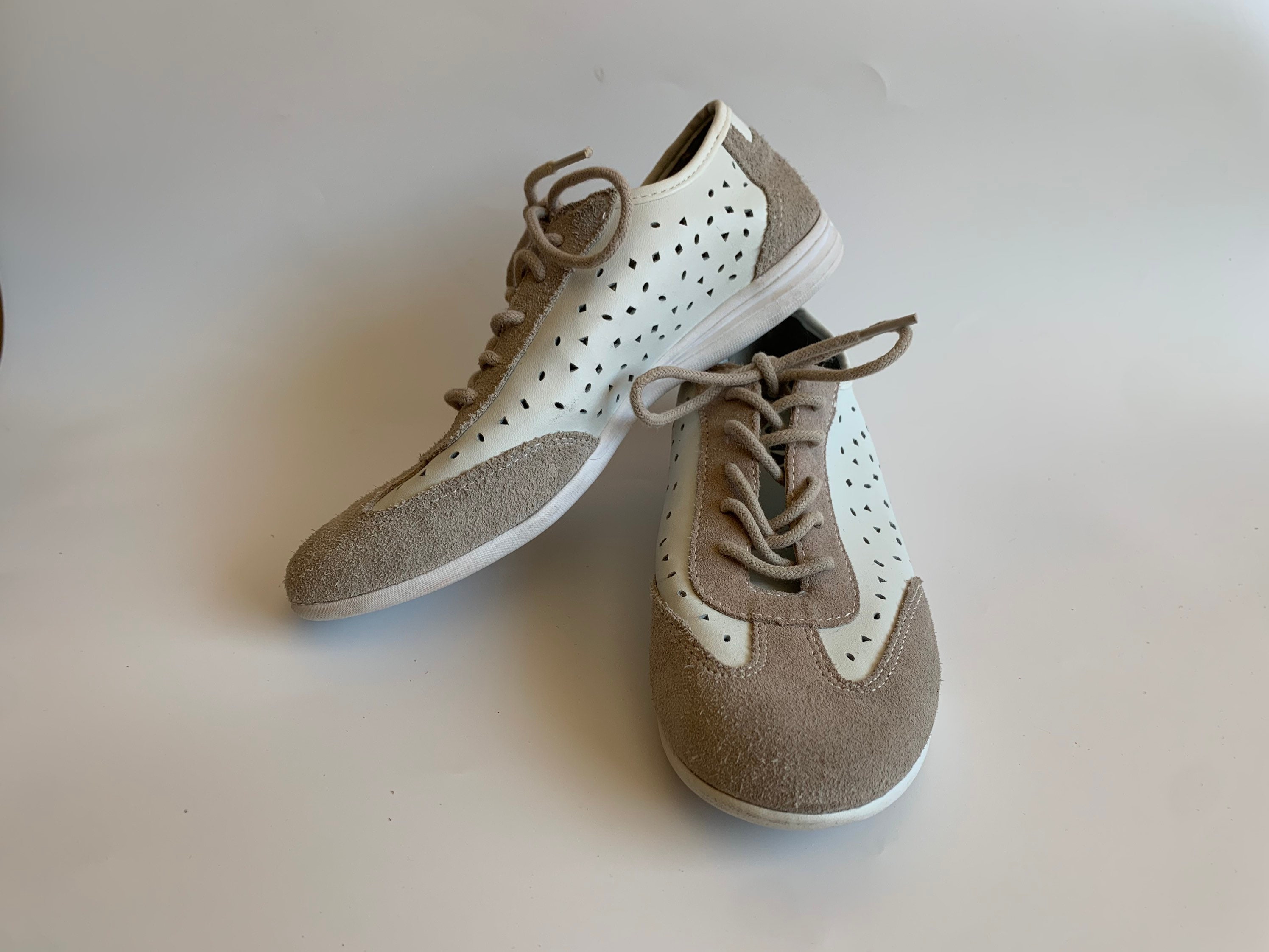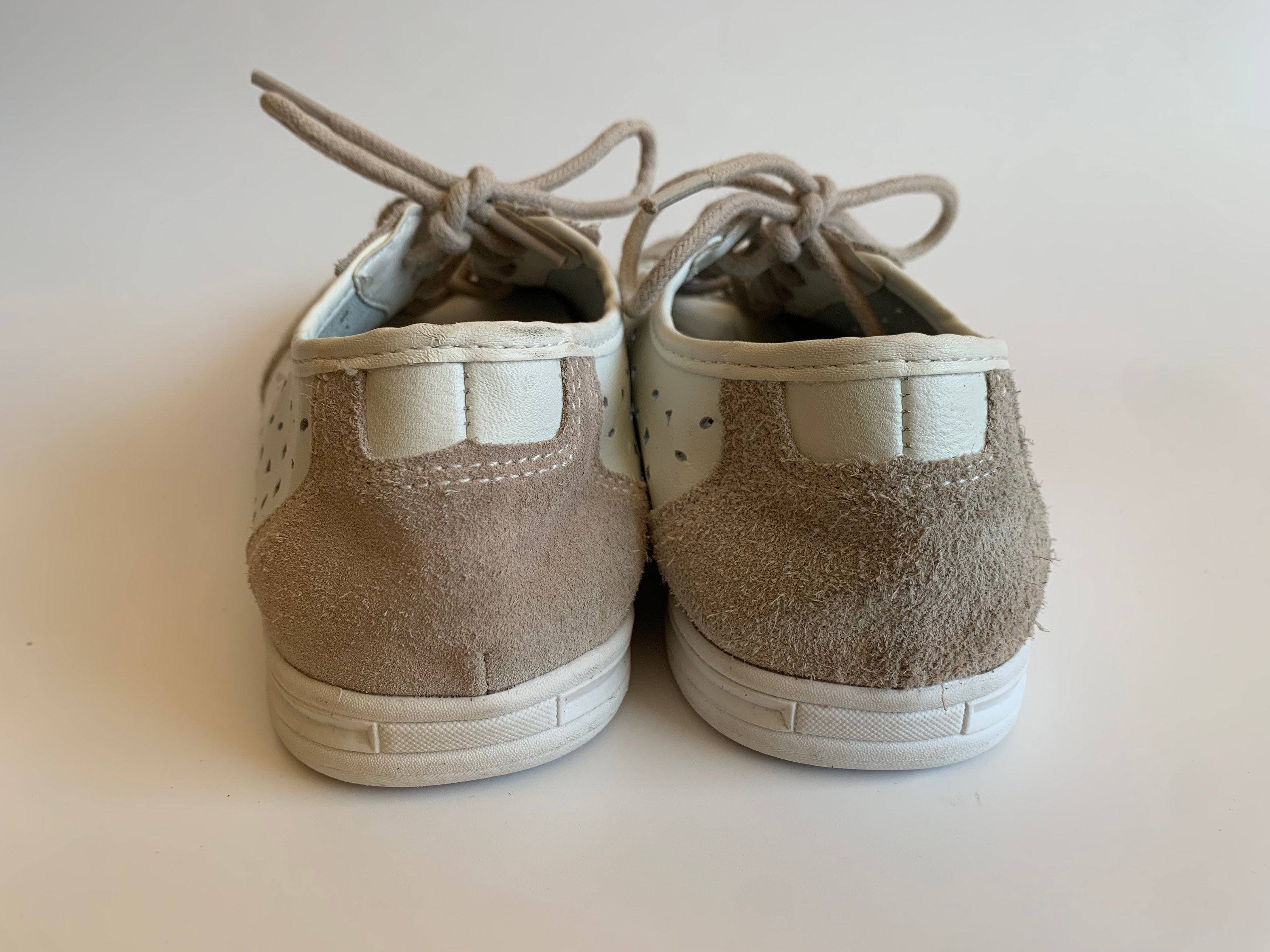 These are vintage white leather lace up shoes for women with cut out leather detailing and suede leather wingtips and heels. These tie up shoes have no lining. They will keep your feet cool and comfortable when you go for walks, when you go traveling or when you have lots of errands to run. These flat leather shoes are ideal for the spring summer season. These casual shoes are made of genuine leather and rubber soles. They are by the brand is IXOO . The size marked is EUR 38, but they fit a little tight. I would say they fit like size EU 37 1/2, UK 4 1/2, US 7. Please check the measurements below.