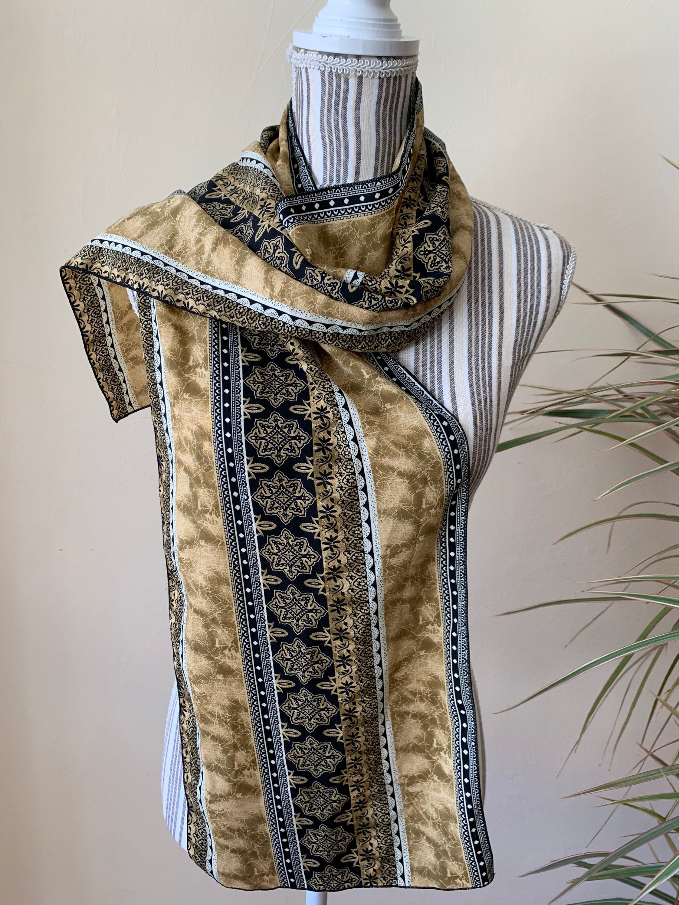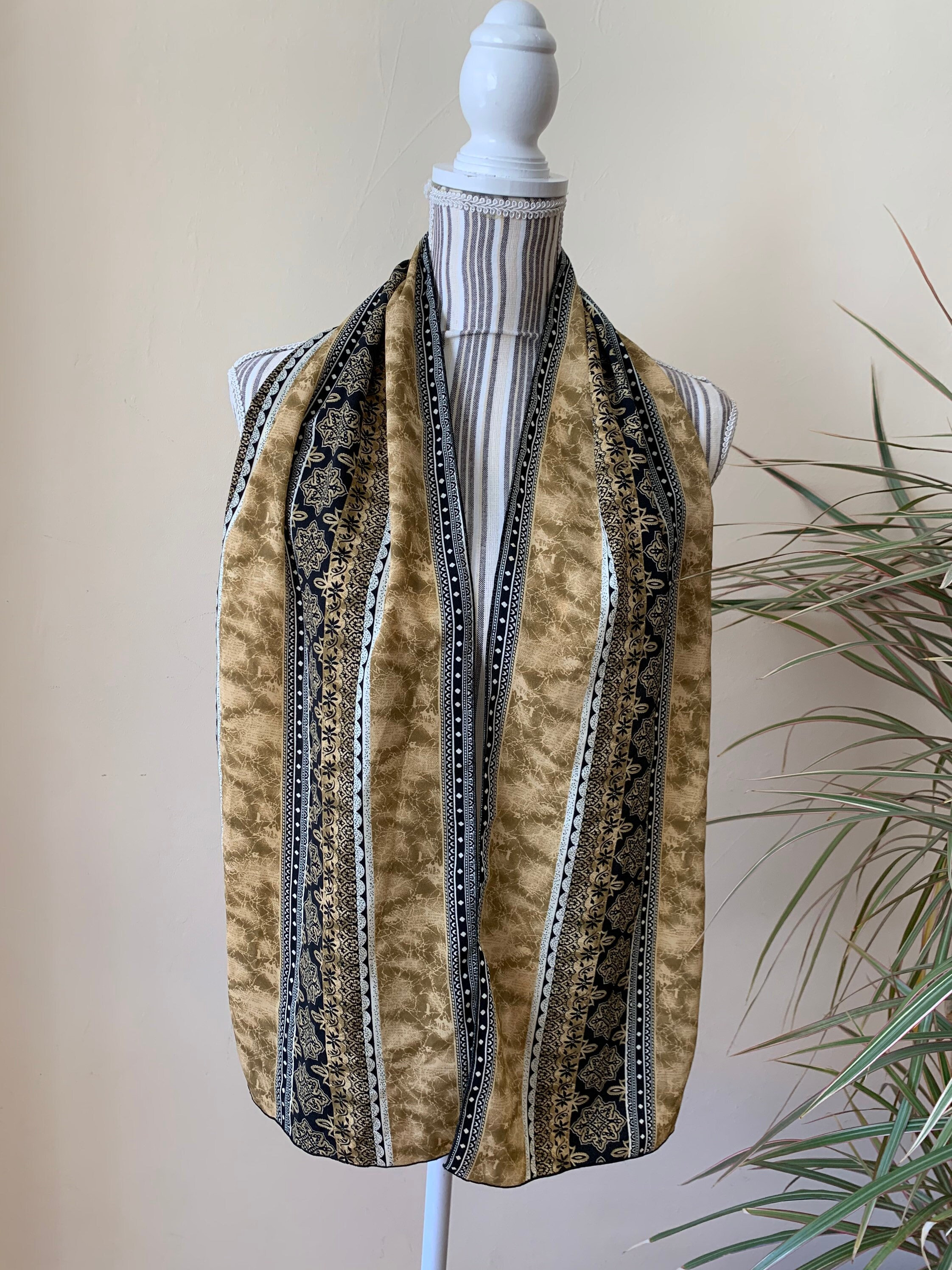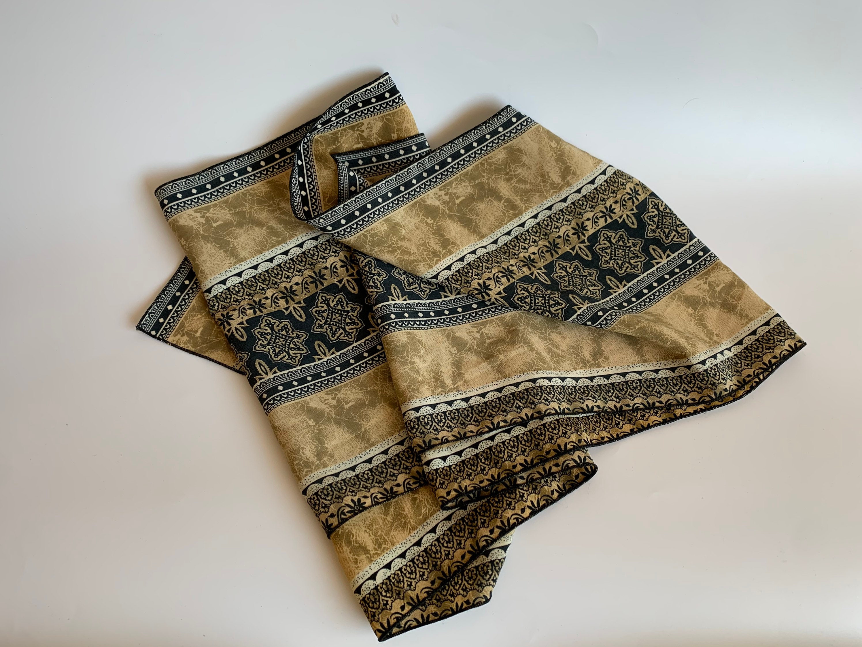 This is a lovely vintage mosaic print neck scarf for women in beige, light olive green and black. This hair scarf has a beautiful Moroccan print. This narrow scarf is perfect to wear as a neck scarf or as a head scarf. This earthy tone scarf has no label. The fabric has some weight, it is probably viscose or polyester.