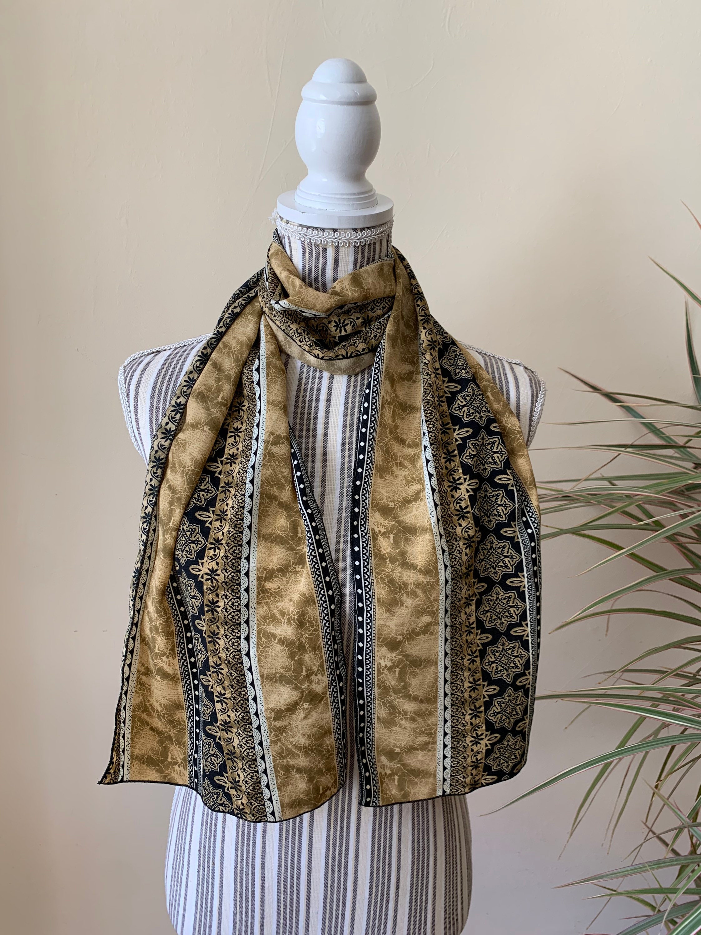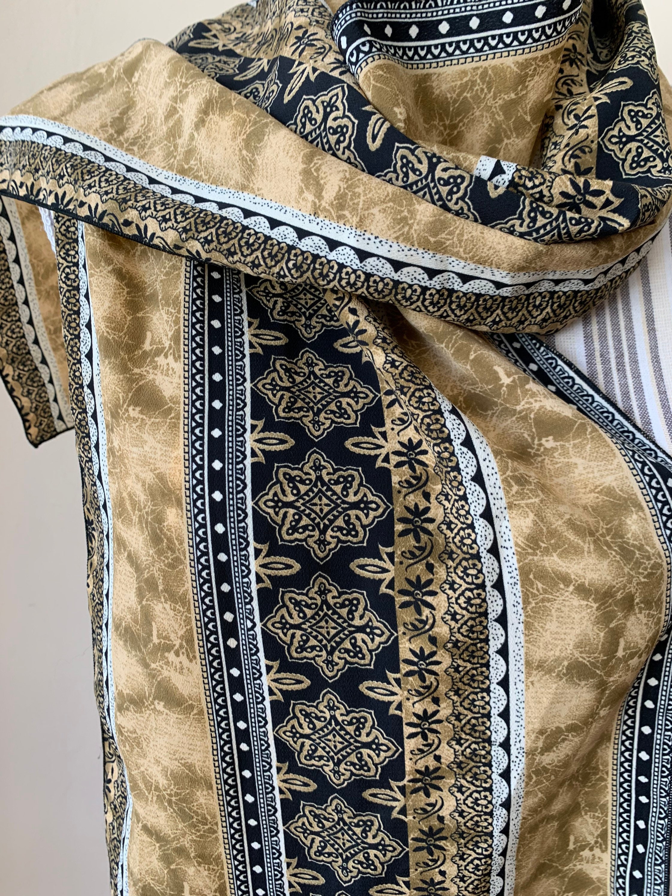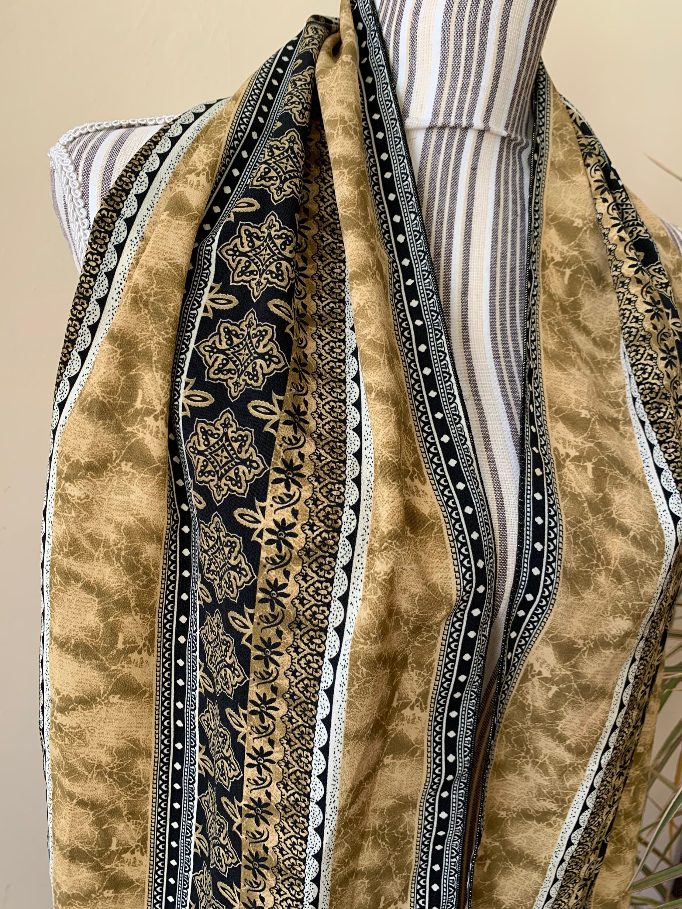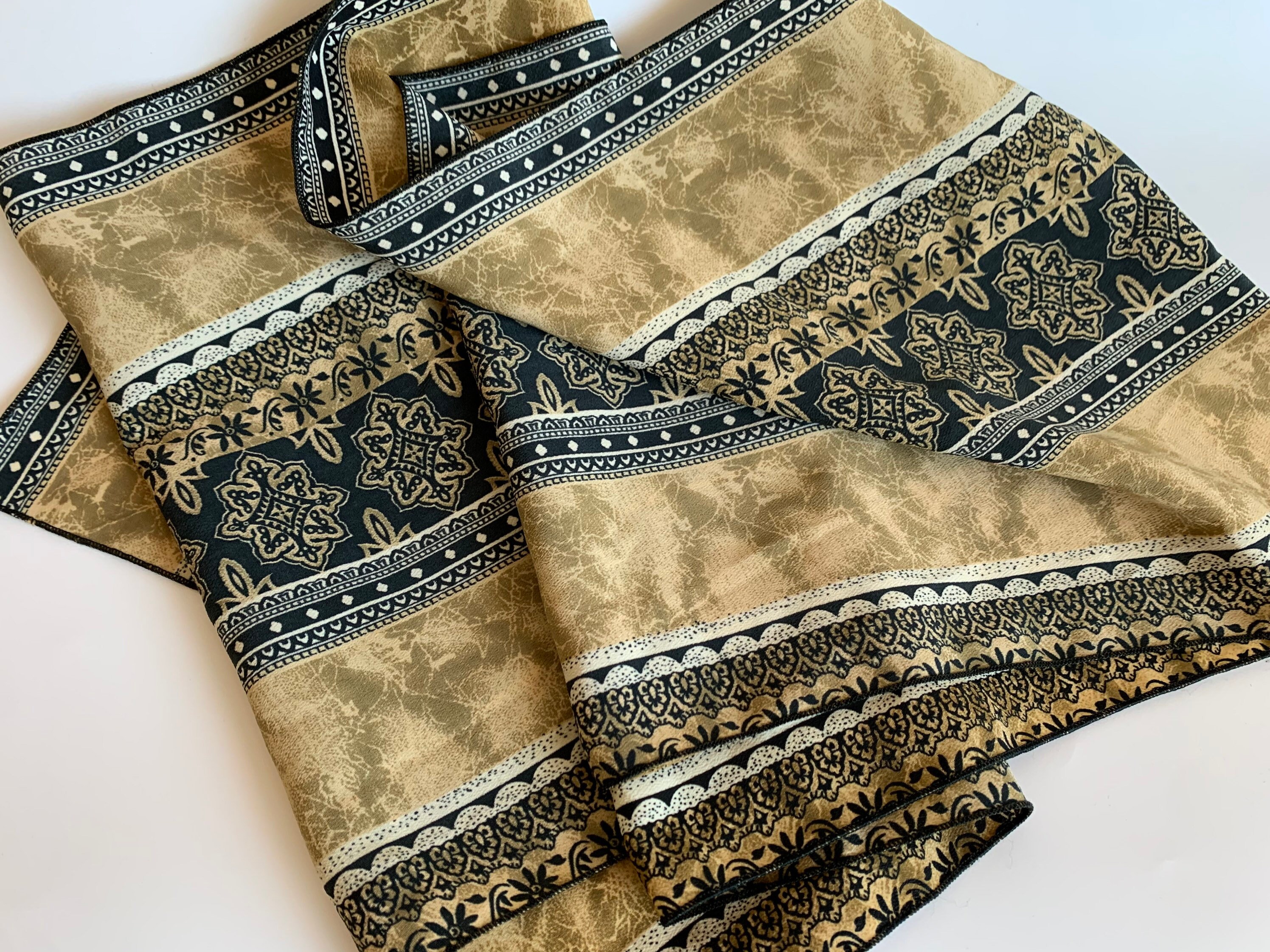 This is a lovely vintage mosaic print neck scarf for women in beige, light olive green and black. This hair scarf has a beautiful Moroccan print. This narrow scarf is perfect to wear as a neck scarf or as a head scarf. This earthy tone scarf has no label. The fabric has some weight, it is probably viscose or polyester.