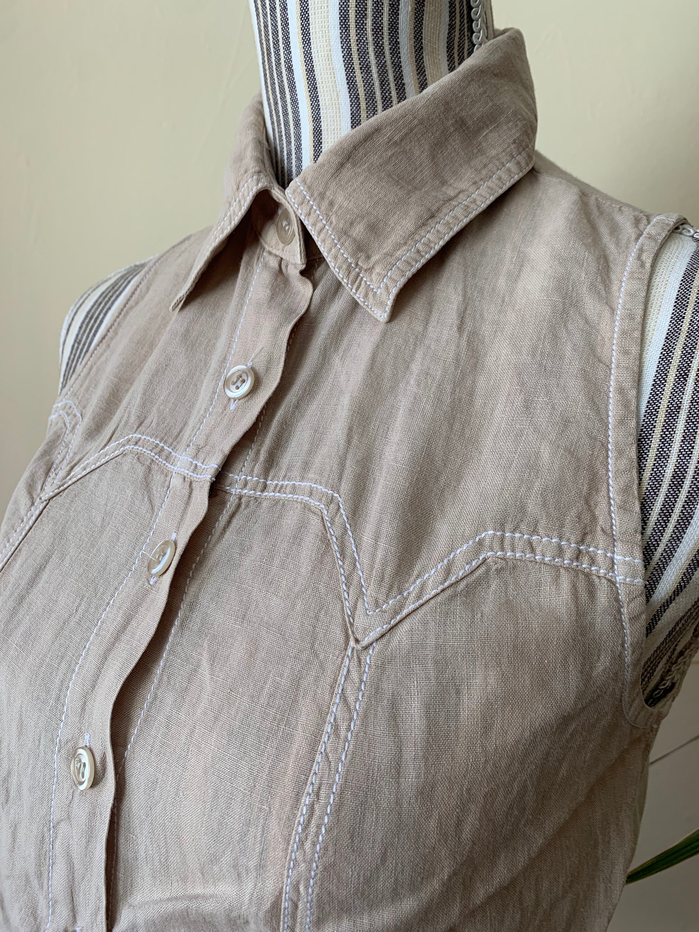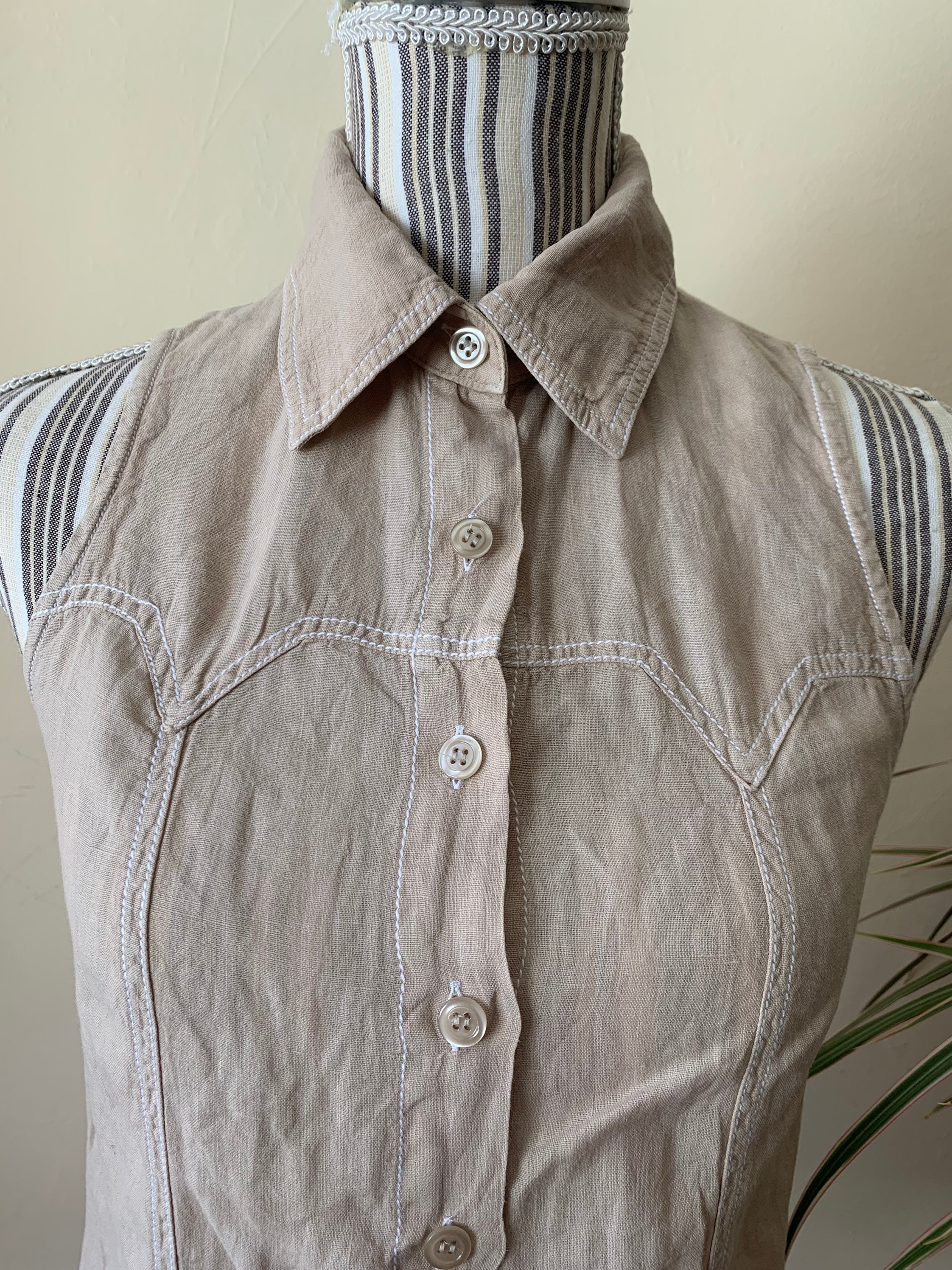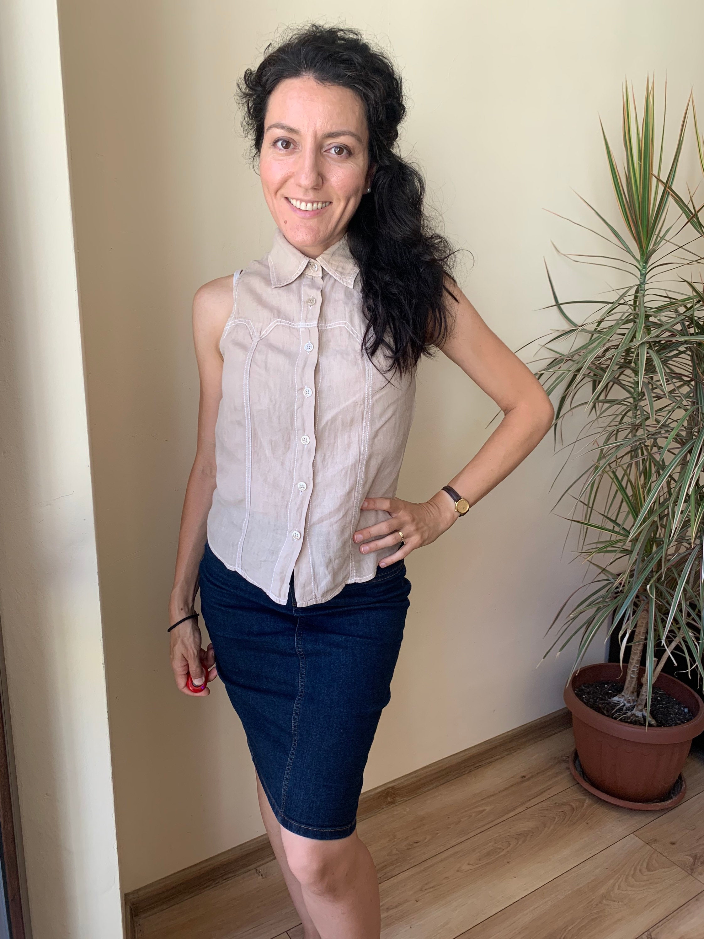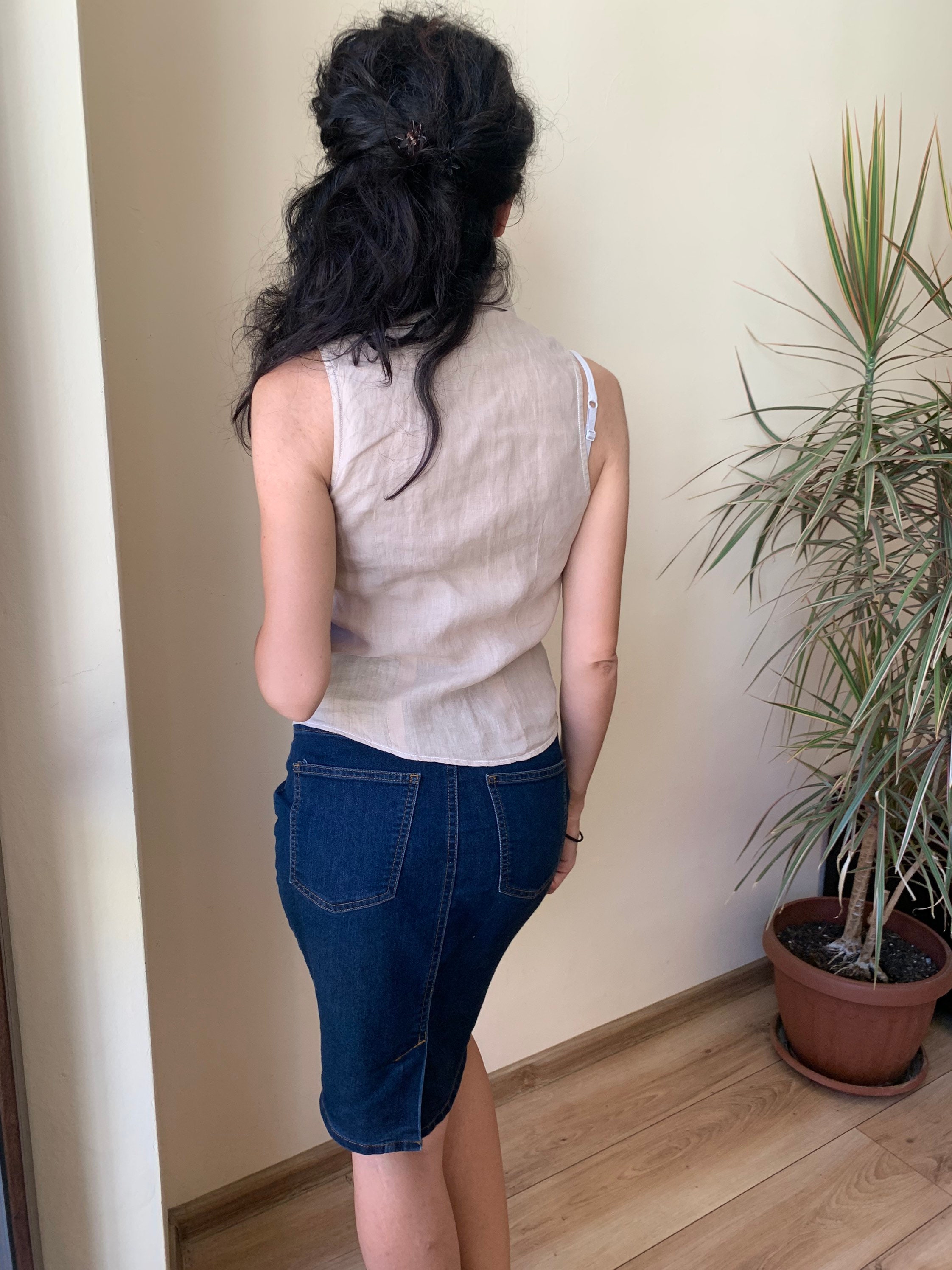 This is a vintage 90s cream beige pure linen top for women with front button closure. This summer linen blouse has classic timeless silhouette. This linen shirt has a collar which gives it an elegant look, perfect to wear at the office. This beige linen waistcoat fits like size XS/S. The size marked on the label is Italy/ Japan 40, GB 8, F 38, D 36, USA 6. I am modelling the garment and I wear size S, USA 6, EUR 36, UK 10, I am 5' 3" tall. This simple linen shirt fits me perfectly. Please check the measurements below.
