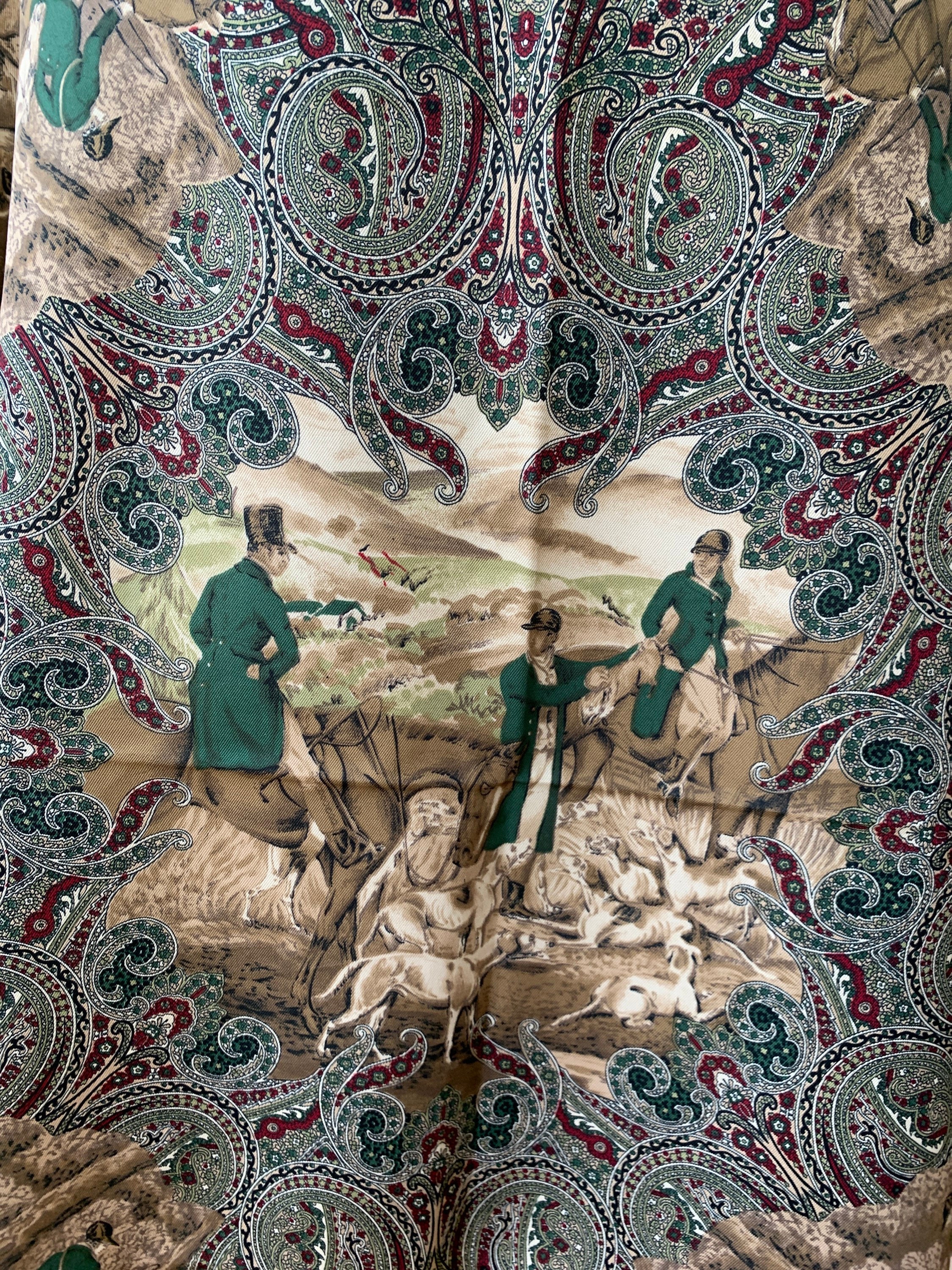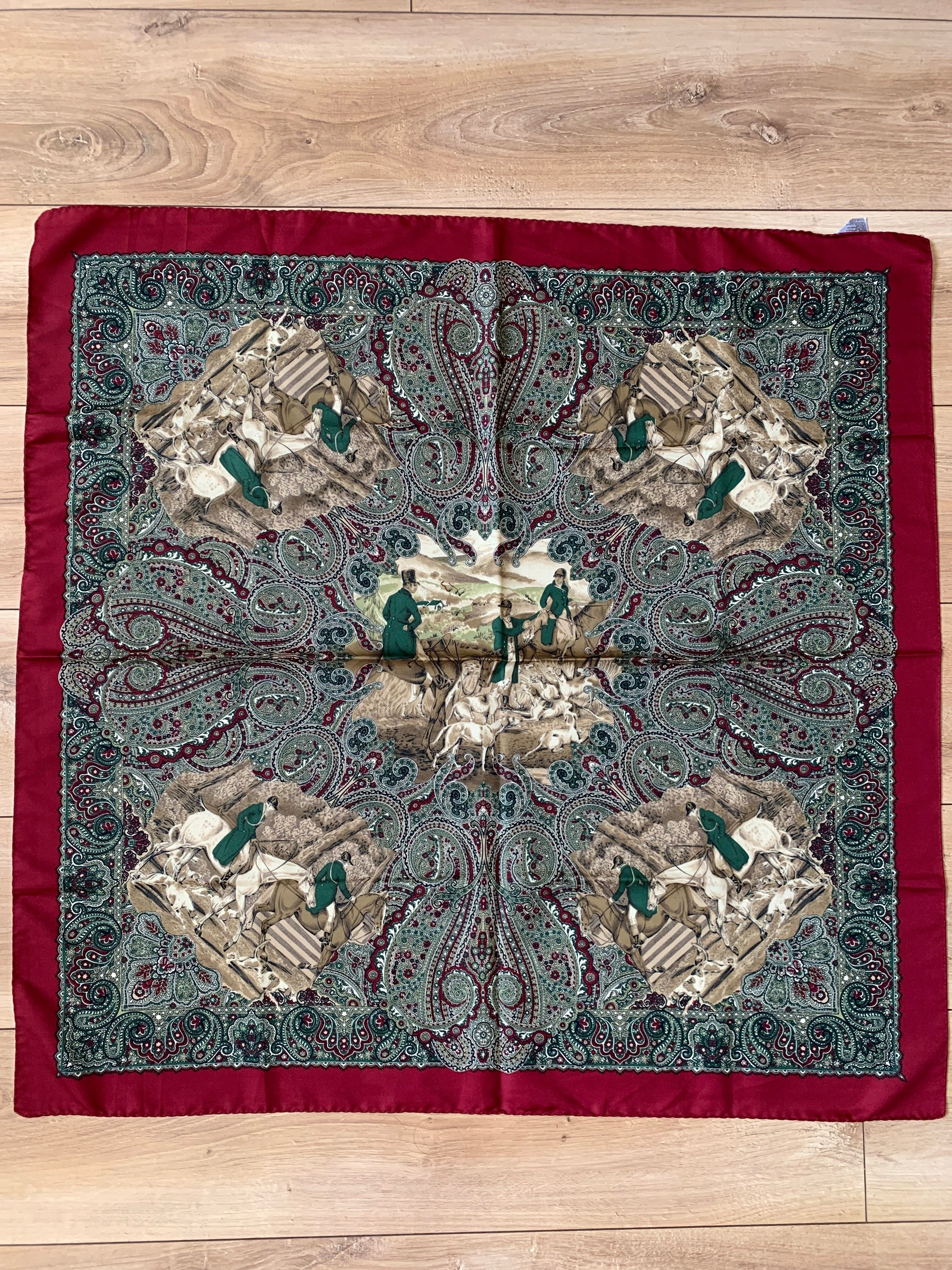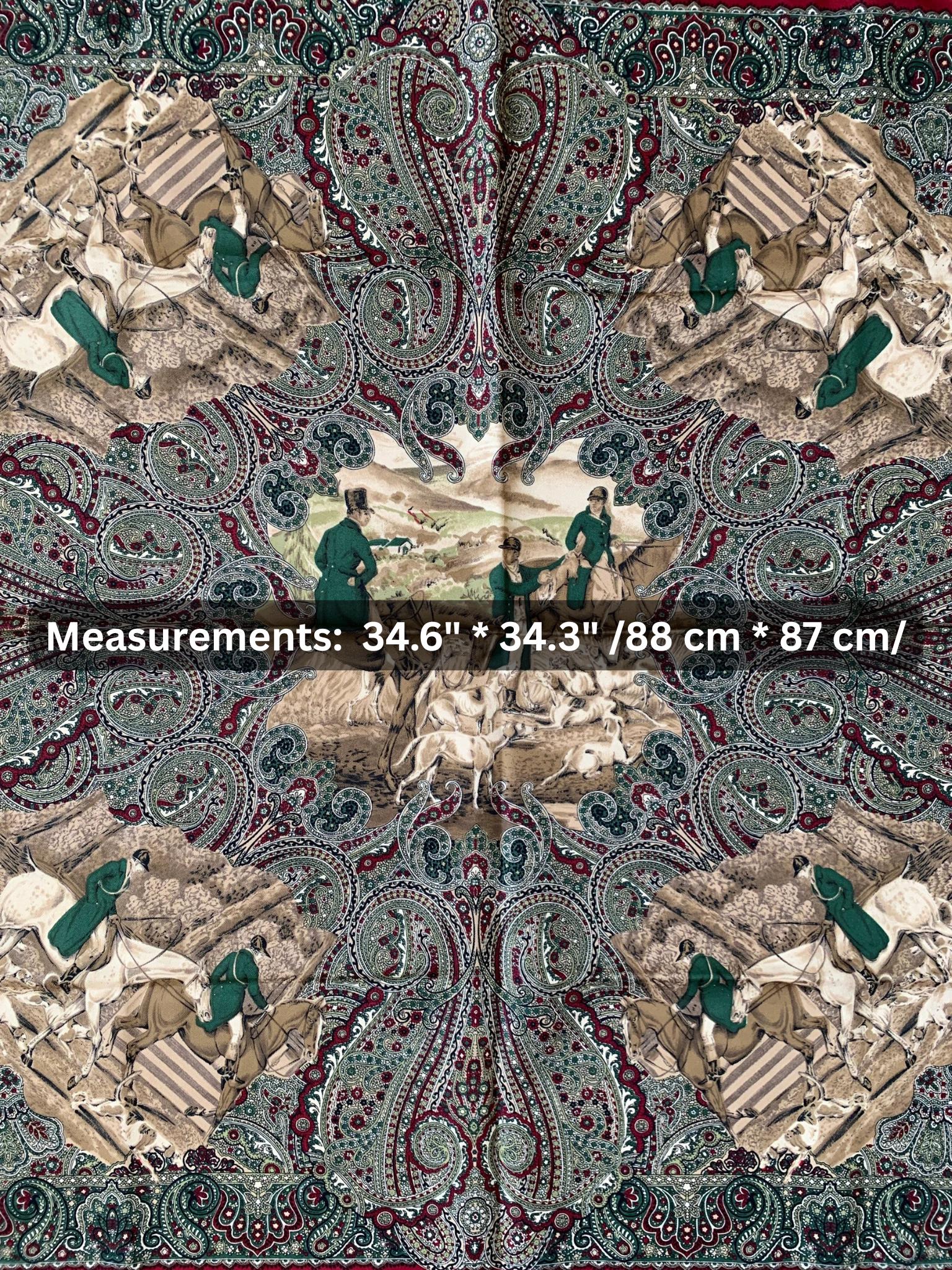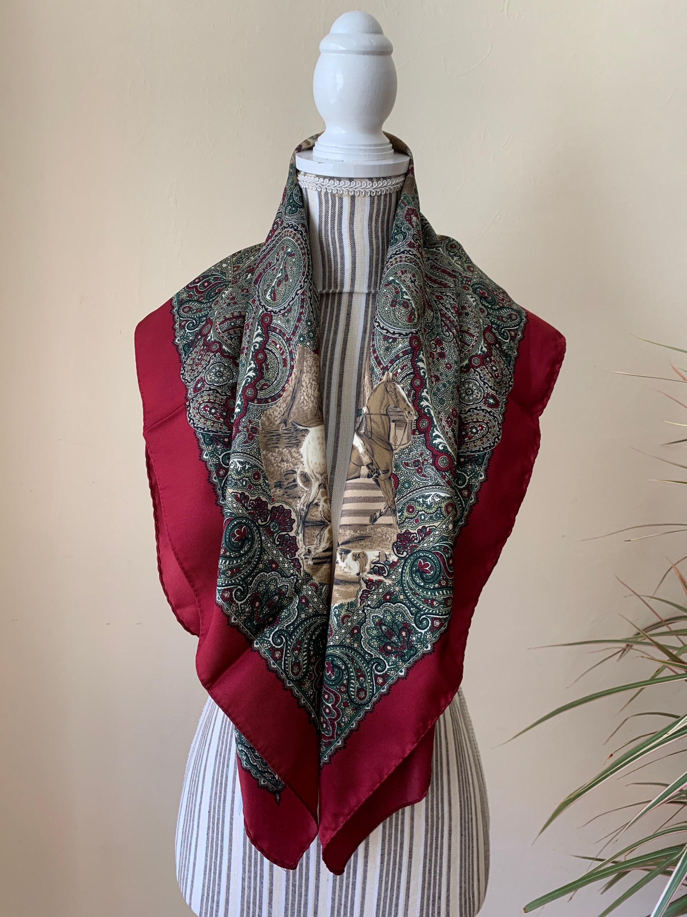 This is a beautiful vintage 80s Italian square scarf hunting scene print. This hunting scarf has a horses and dogs print in sage green and burgundy red. This large square scarf can be used as a neck scarf or as a head scarf. There are so many different ways to wear it. This vintage 80s scarf is made of polyester fabric. It was made in Italy.