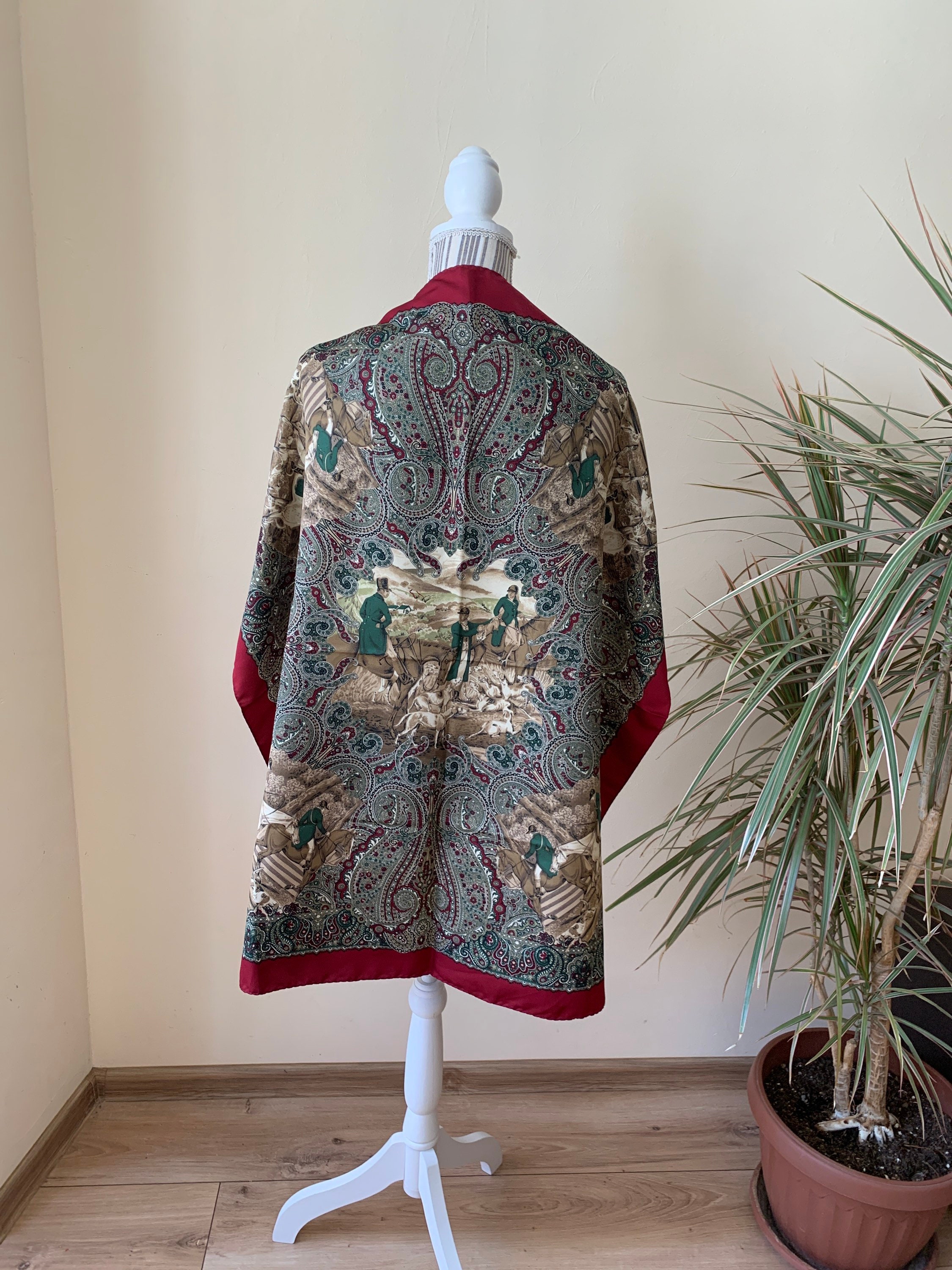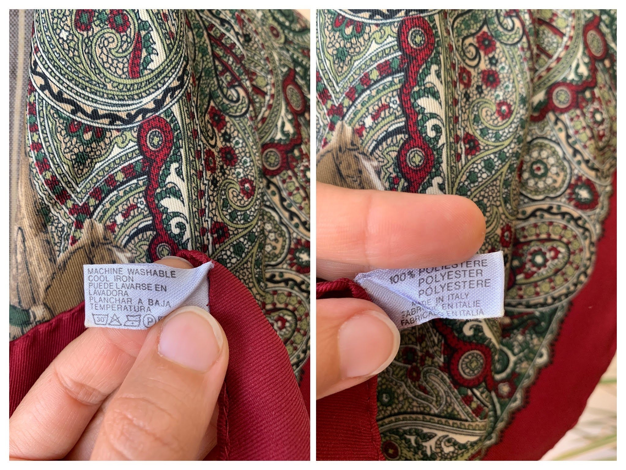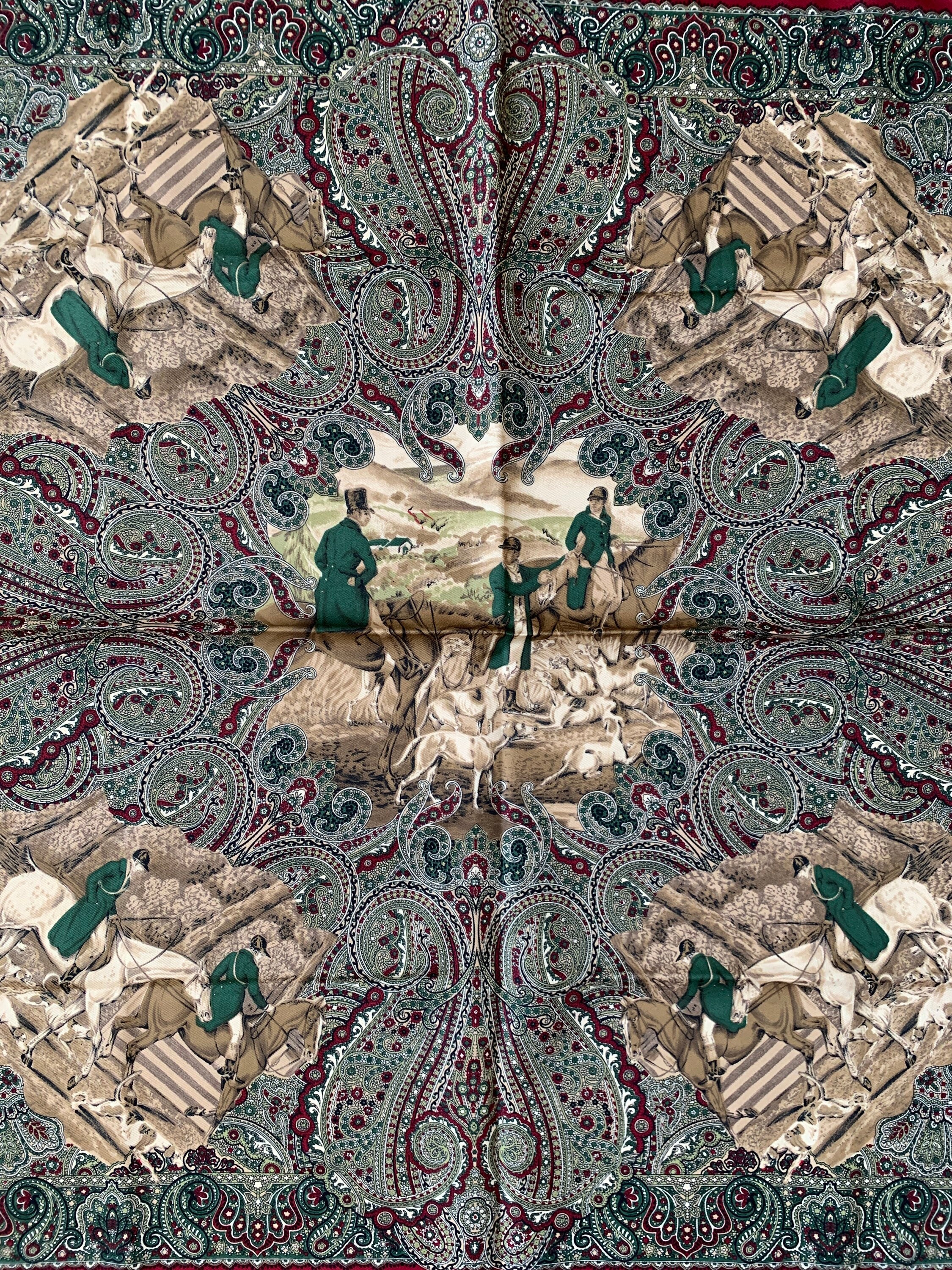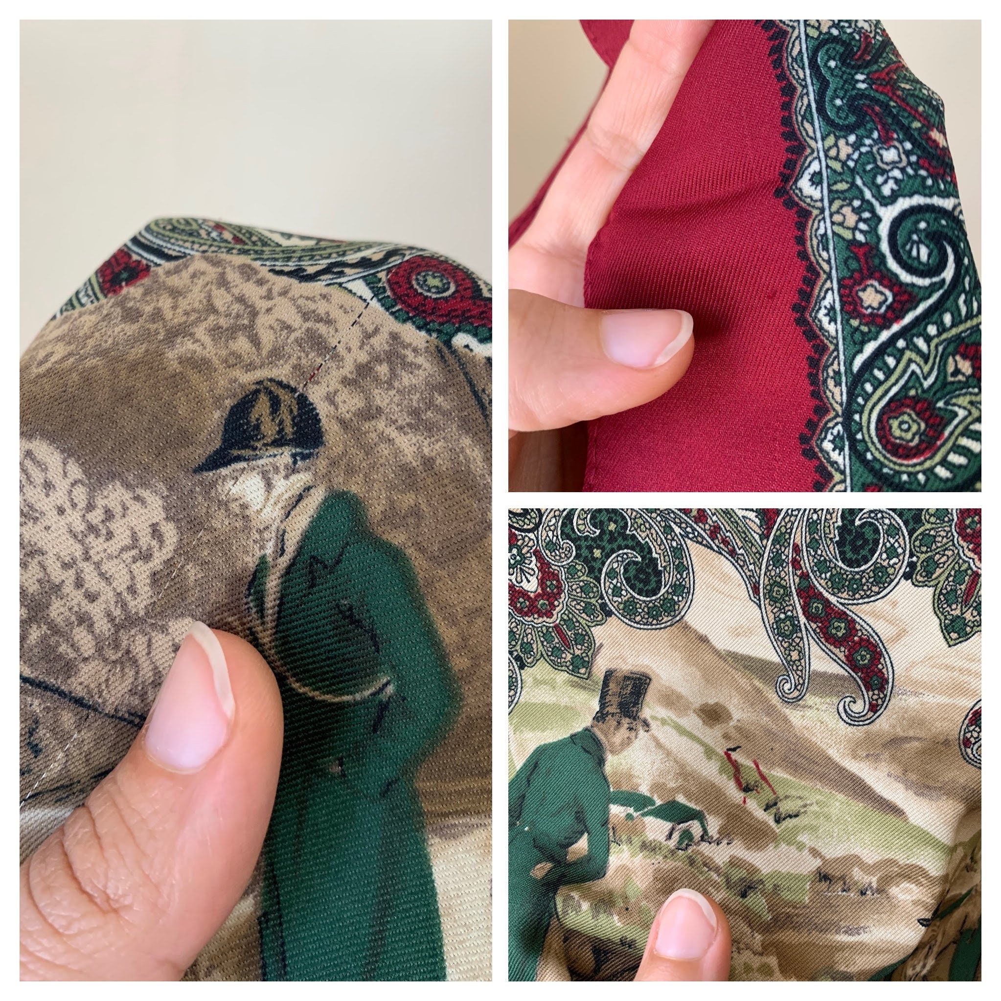 This is a beautiful vintage 80s Italian square scarf hunting scene print. This hunting scarf has a horses and dogs print in sage green and burgundy red. This large square scarf can be used as a neck scarf or as a head scarf. There are so many different ways to wear it. This vintage 80s scarf is made of polyester fabric. It was made in Italy.