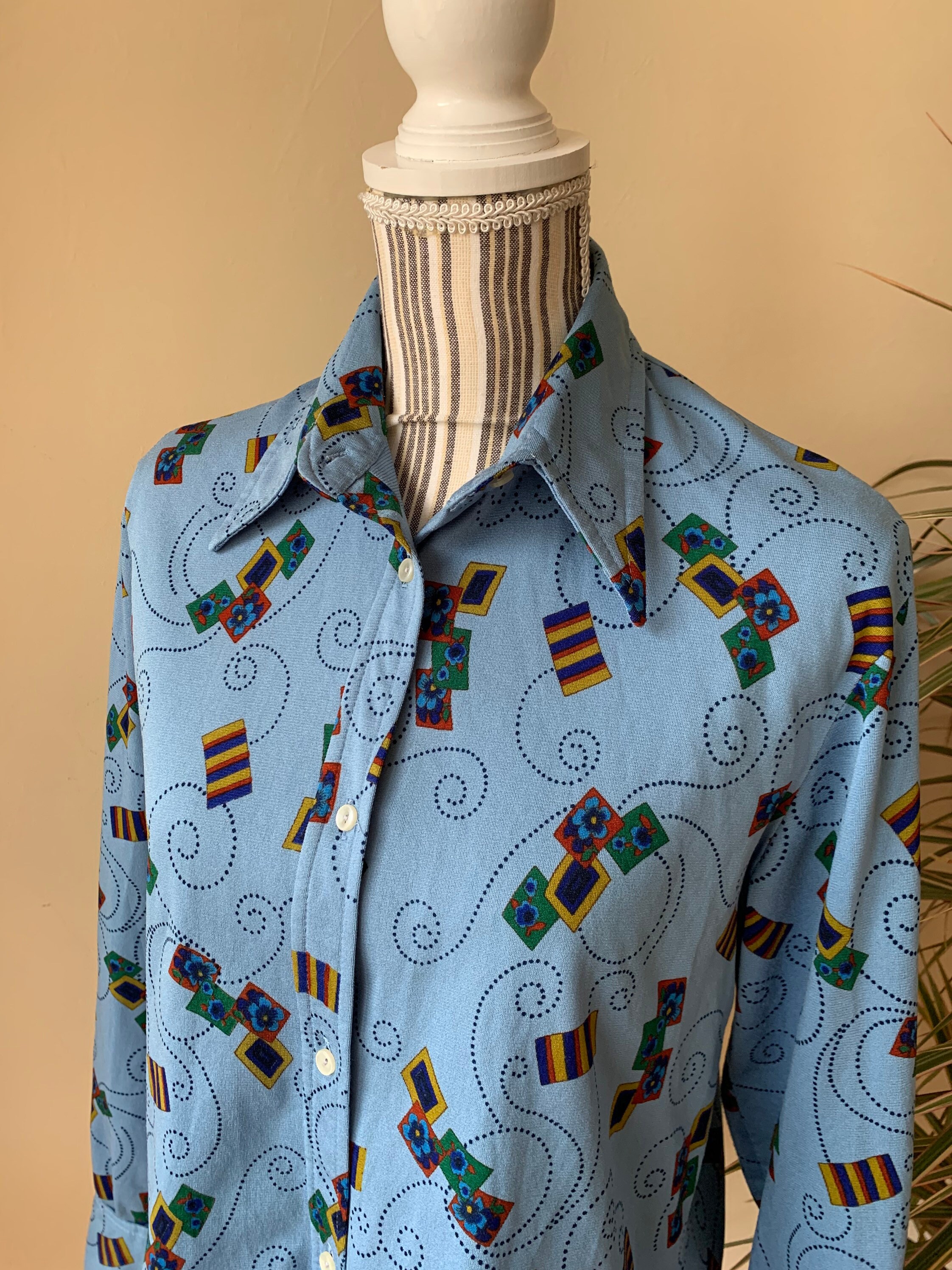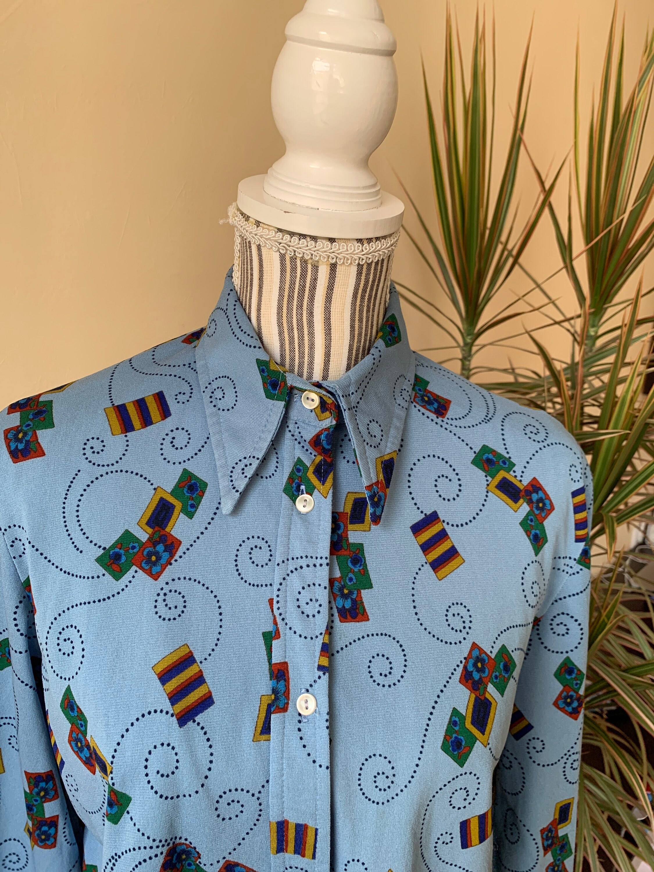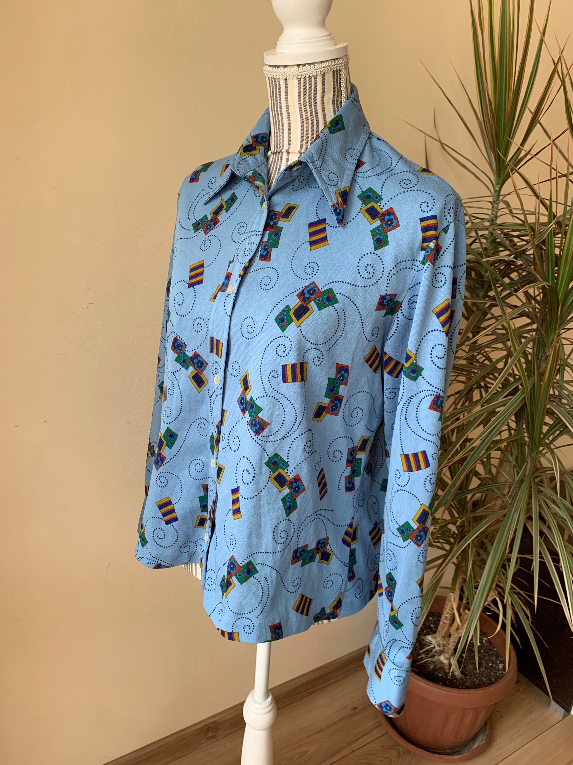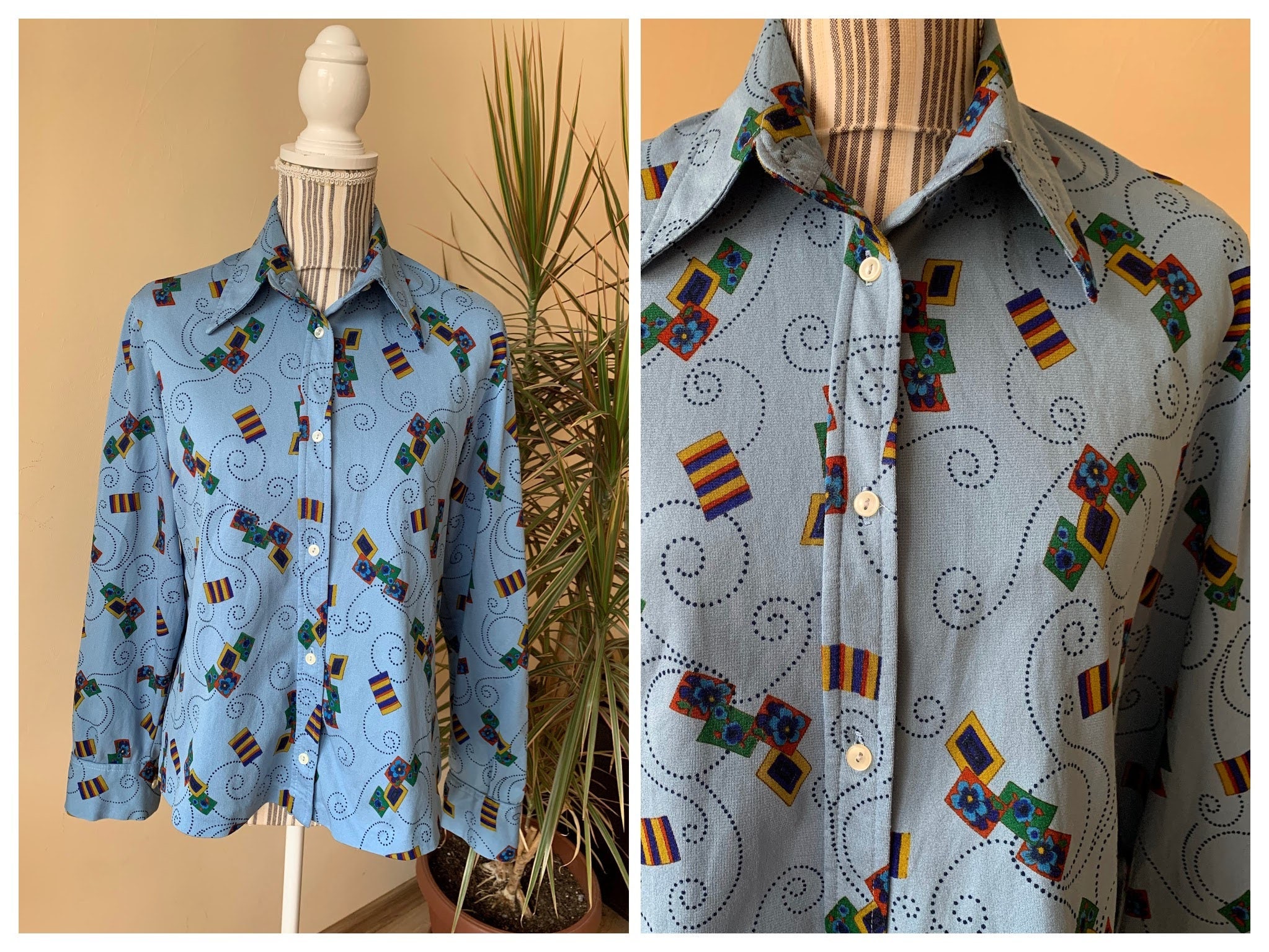 This is vintage 70s button down collared shirt for women with spiral floral novelty print. This retro shirt has is made of stretchy synthetic fabric. There is no label on the garment, I believe it’s made of polyester. This pop art collared shirt fits like size L, please check the measurements below.