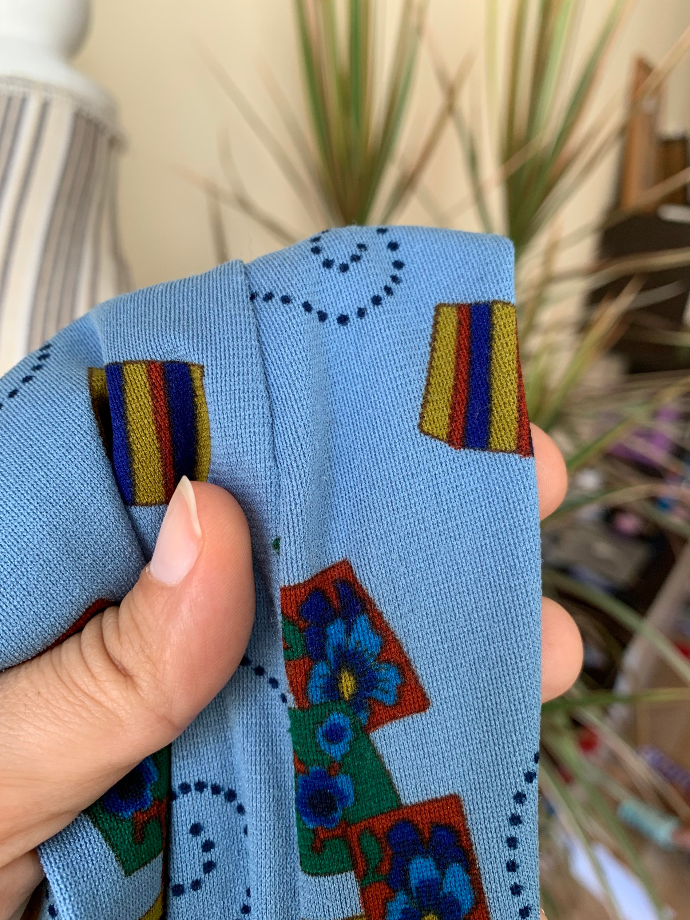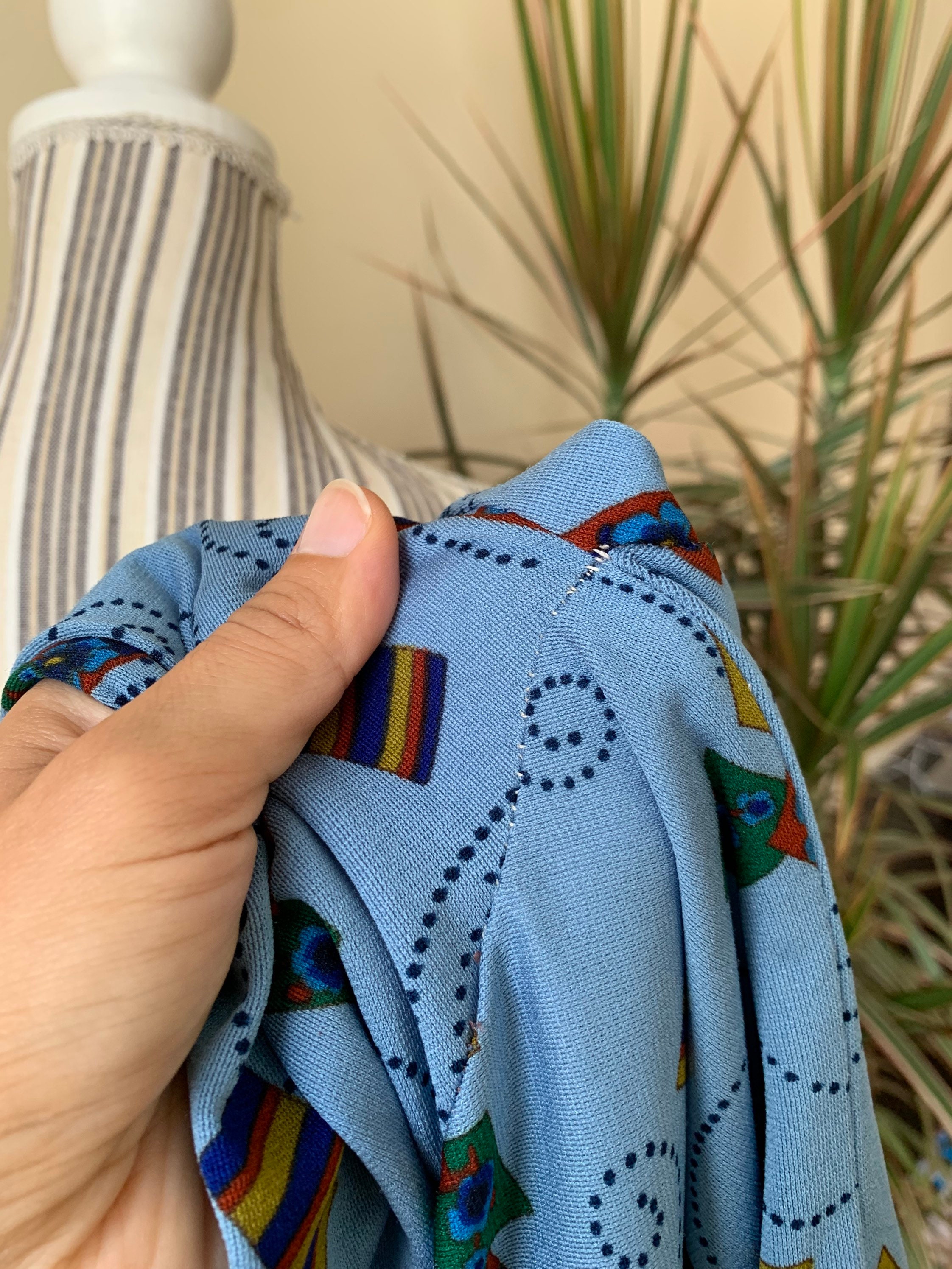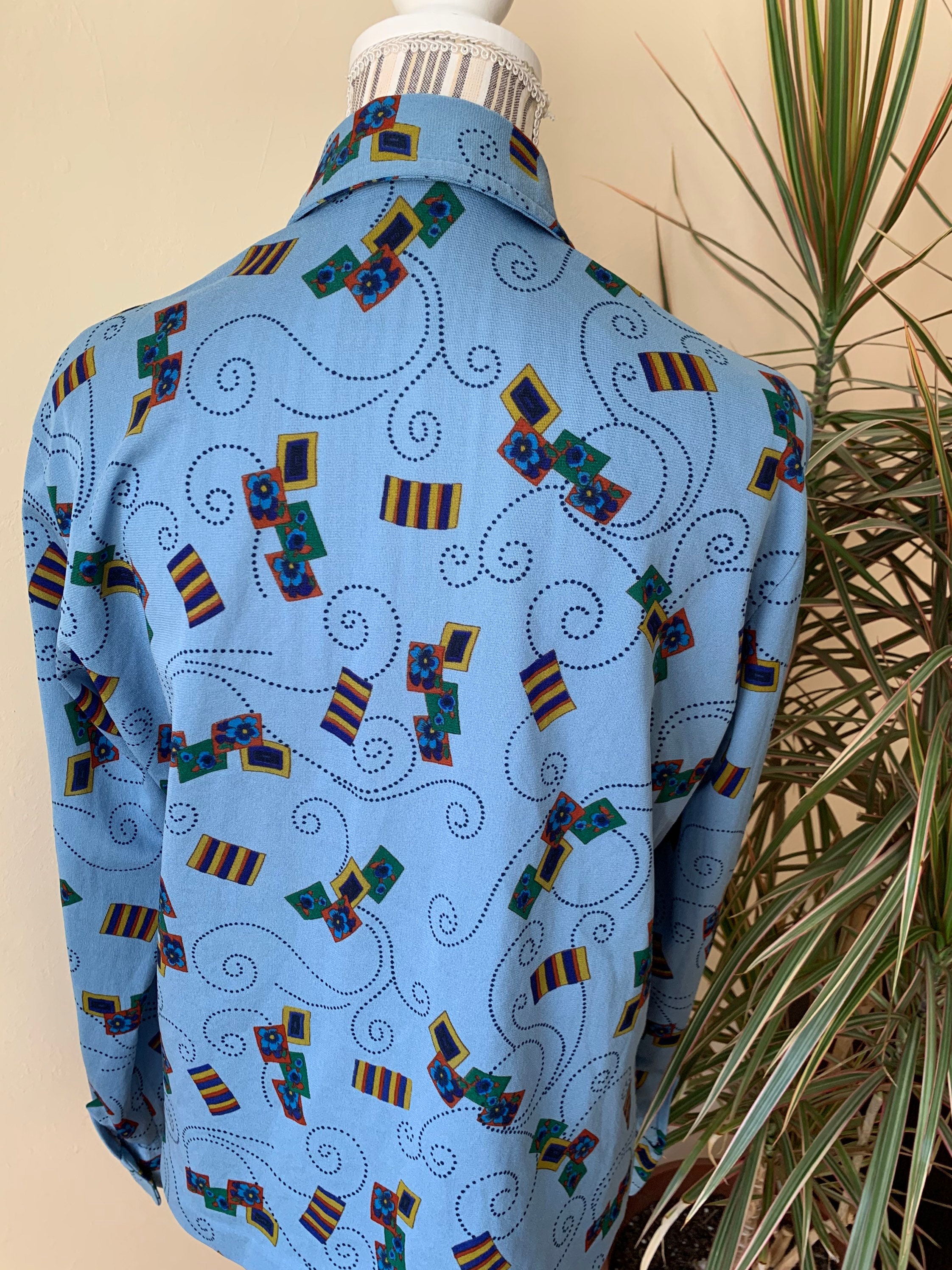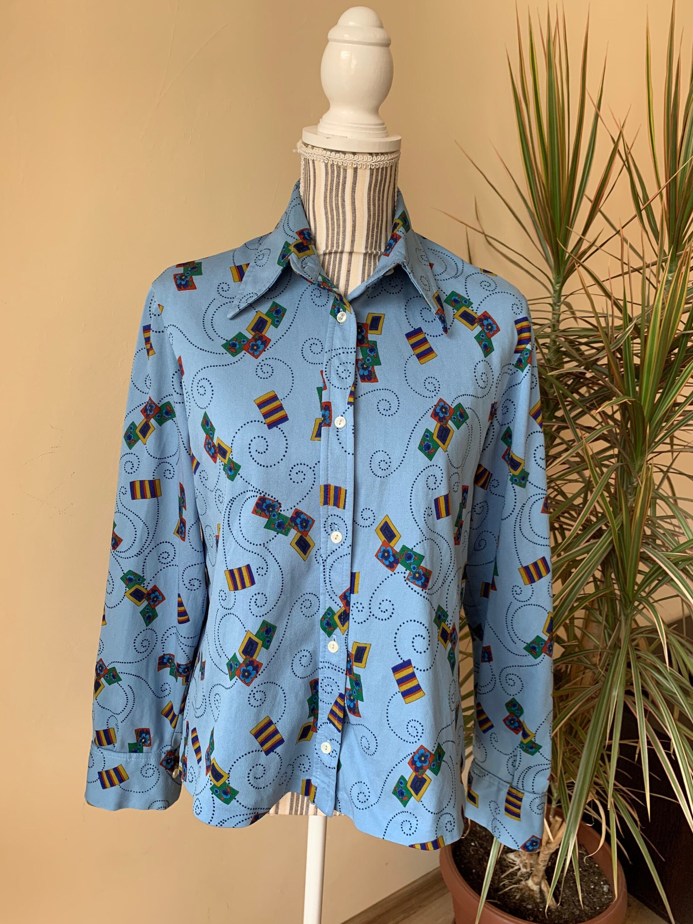 This is vintage 70s button down collared shirt for women with spiral floral novelty print. This retro shirt has is made of stretchy synthetic fabric. There is no label on the garment, I believe it’s made of polyester. This pop art collared shirt fits like size L, please check the measurements below.