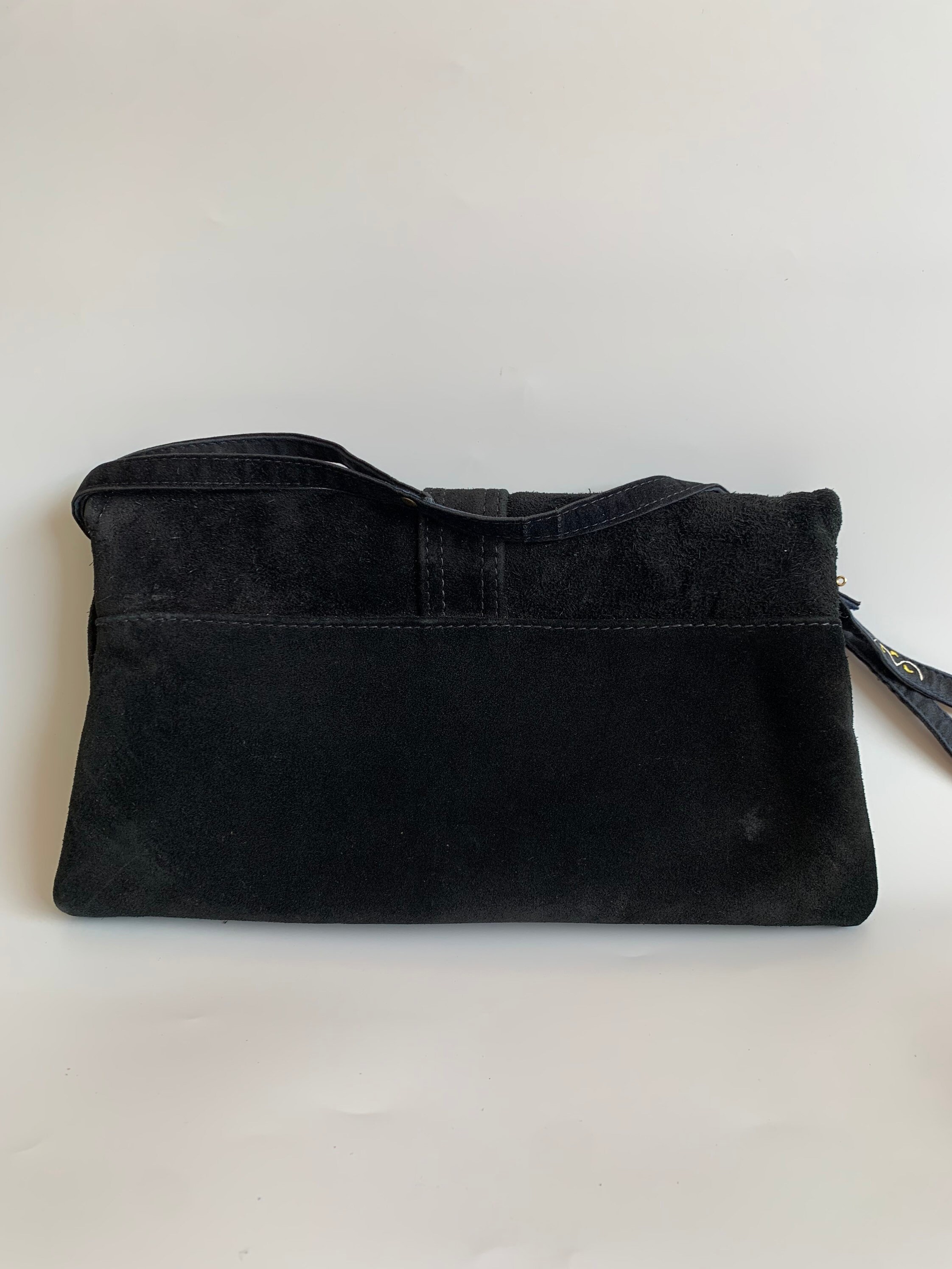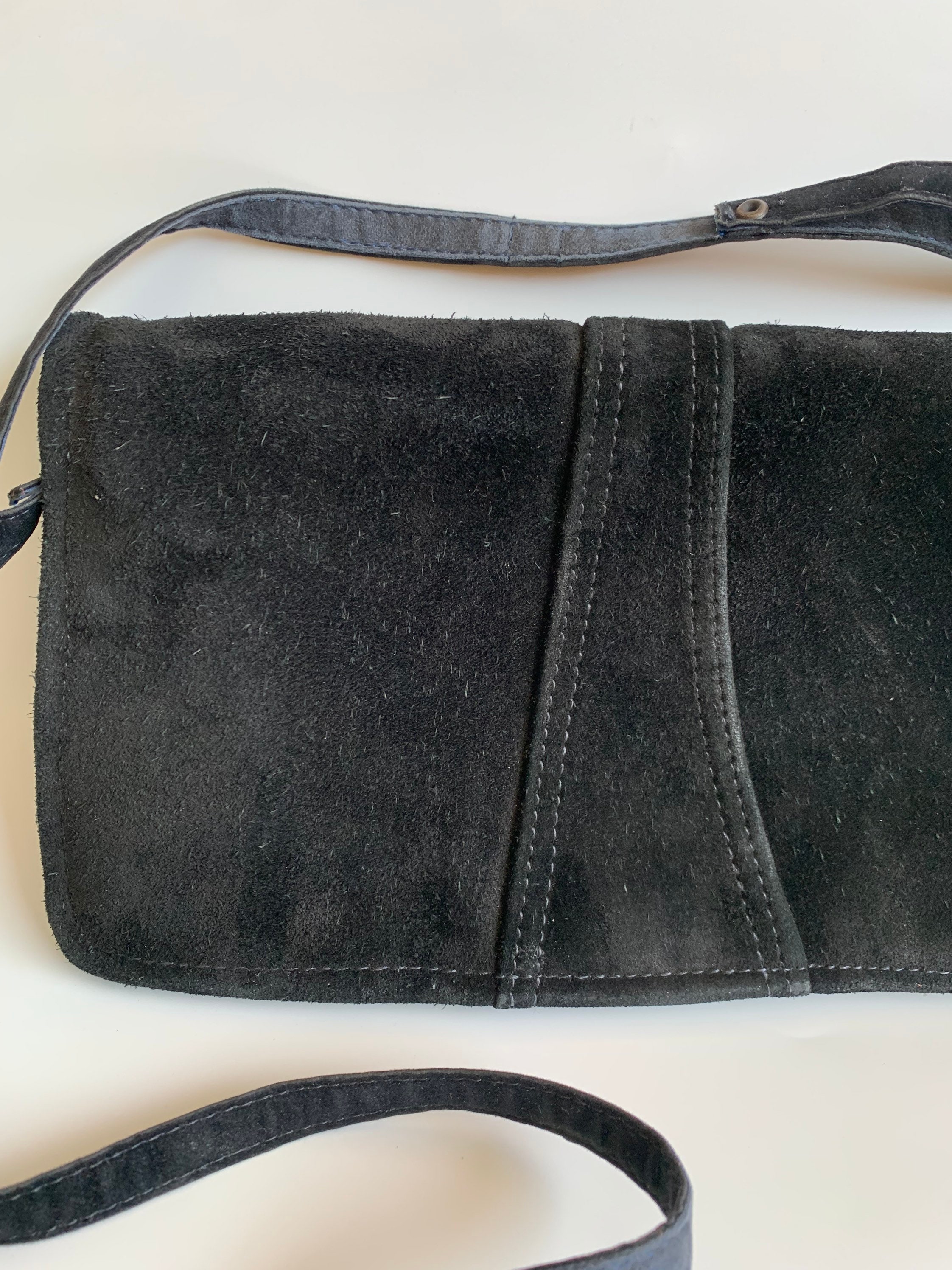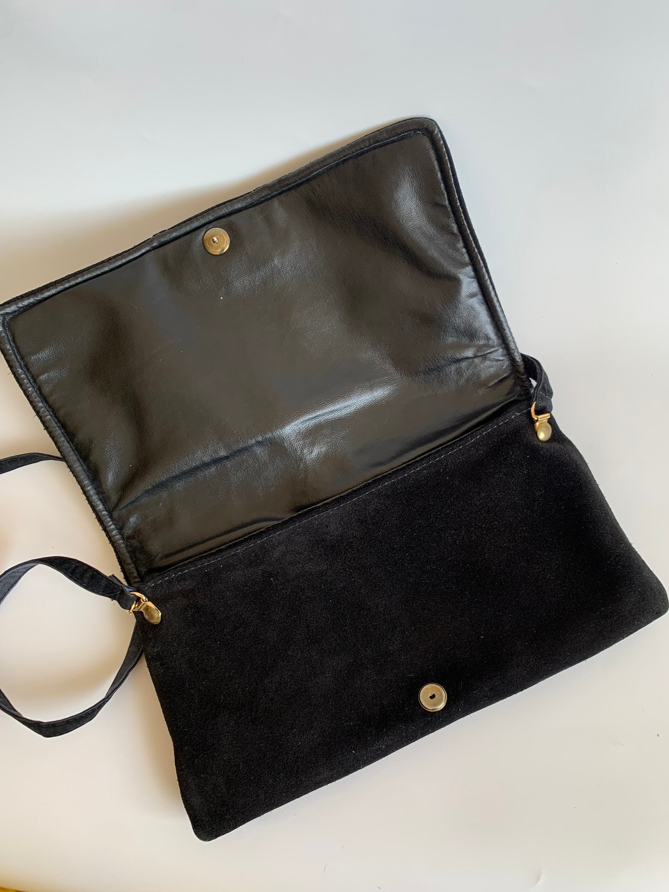 This is a vintage 80s envelope clutch purse with long shoulder strap. You can wear this purse as a shoulder bag, or you can tuck the strap inside and wear it as a clutch wallet. This lovely purse is made of genuine suede leather in black color which has a distressed look. It has click clasp closure. The interior is lined in black vinyl. There is one compartment inside.