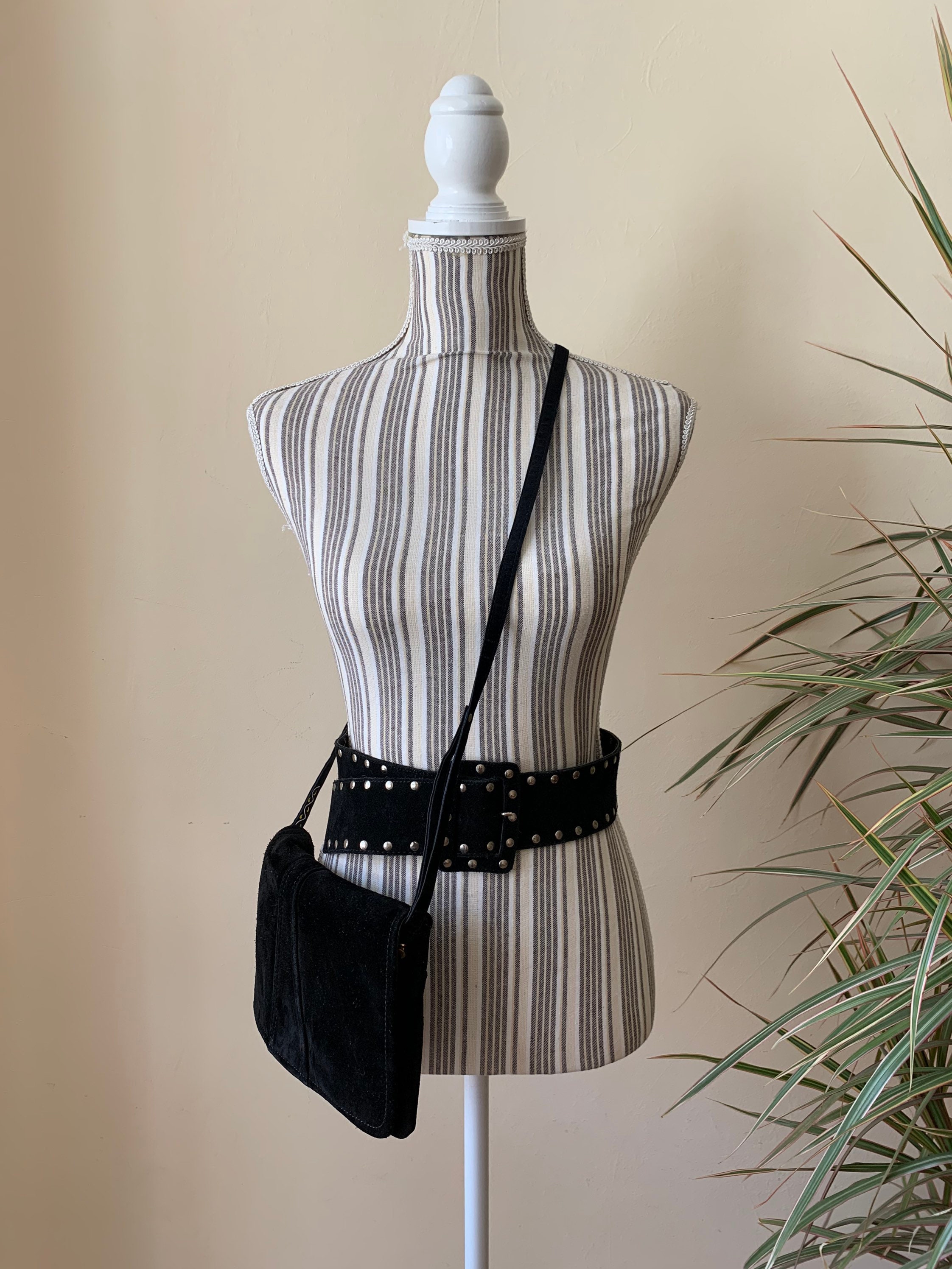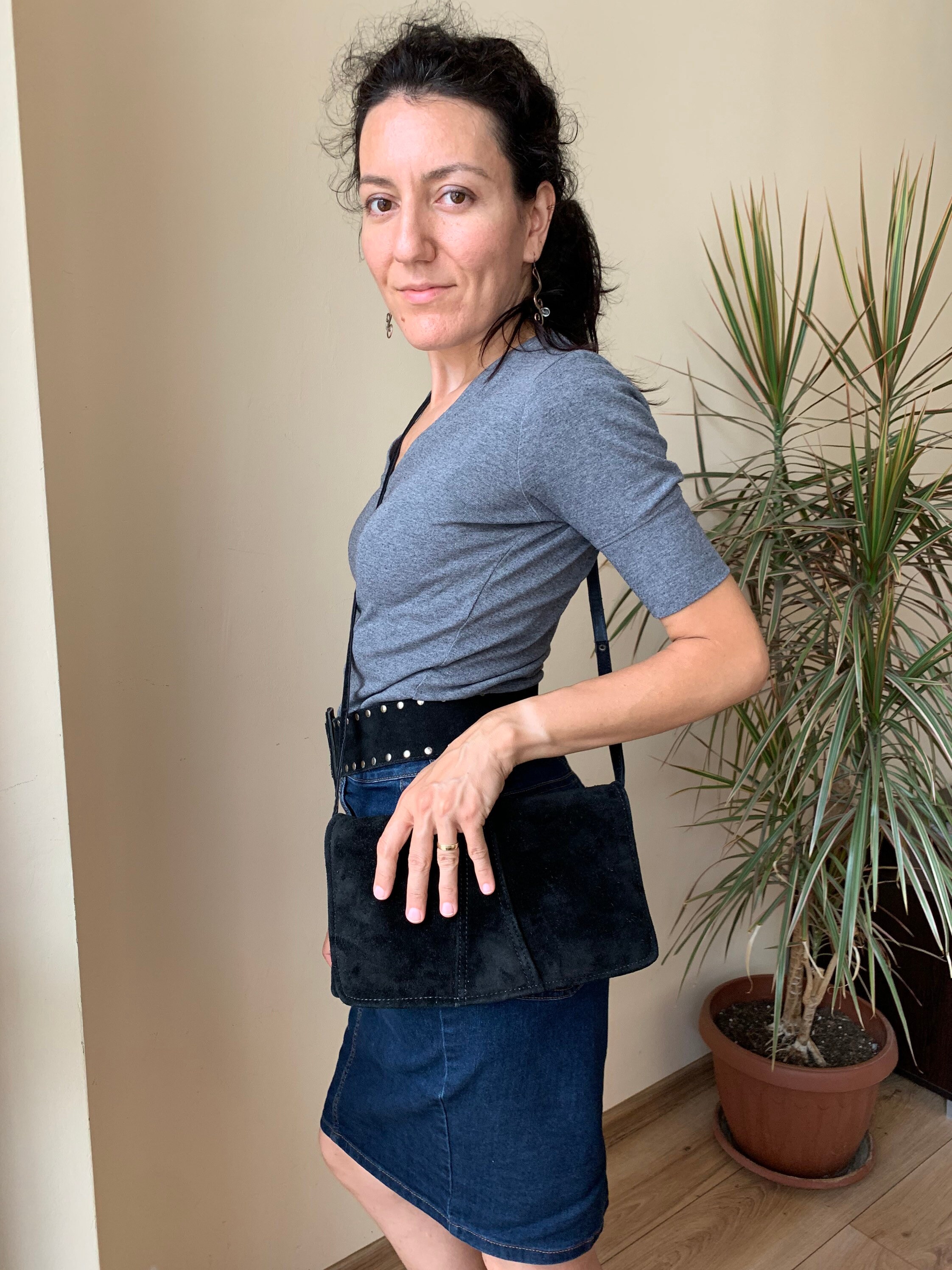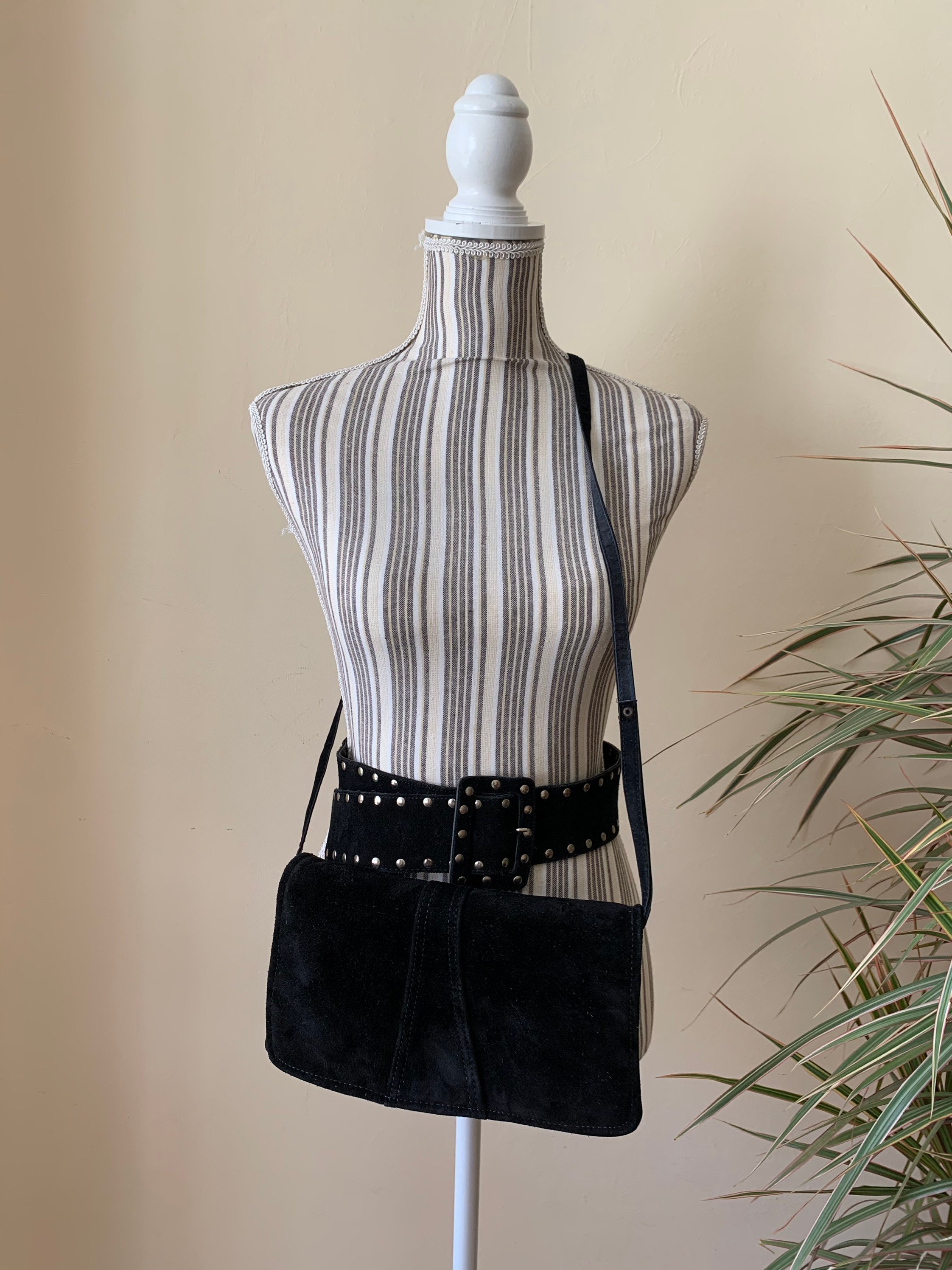 This is a vintage 80s envelope clutch purse with long shoulder strap. You can wear this purse as a shoulder bag, or you can tuck the strap inside and wear it as a clutch wallet. This lovely purse is made of genuine suede leather in black color which has a distressed look. It has click clasp closure. The interior is lined in black vinyl. There is one compartment inside.