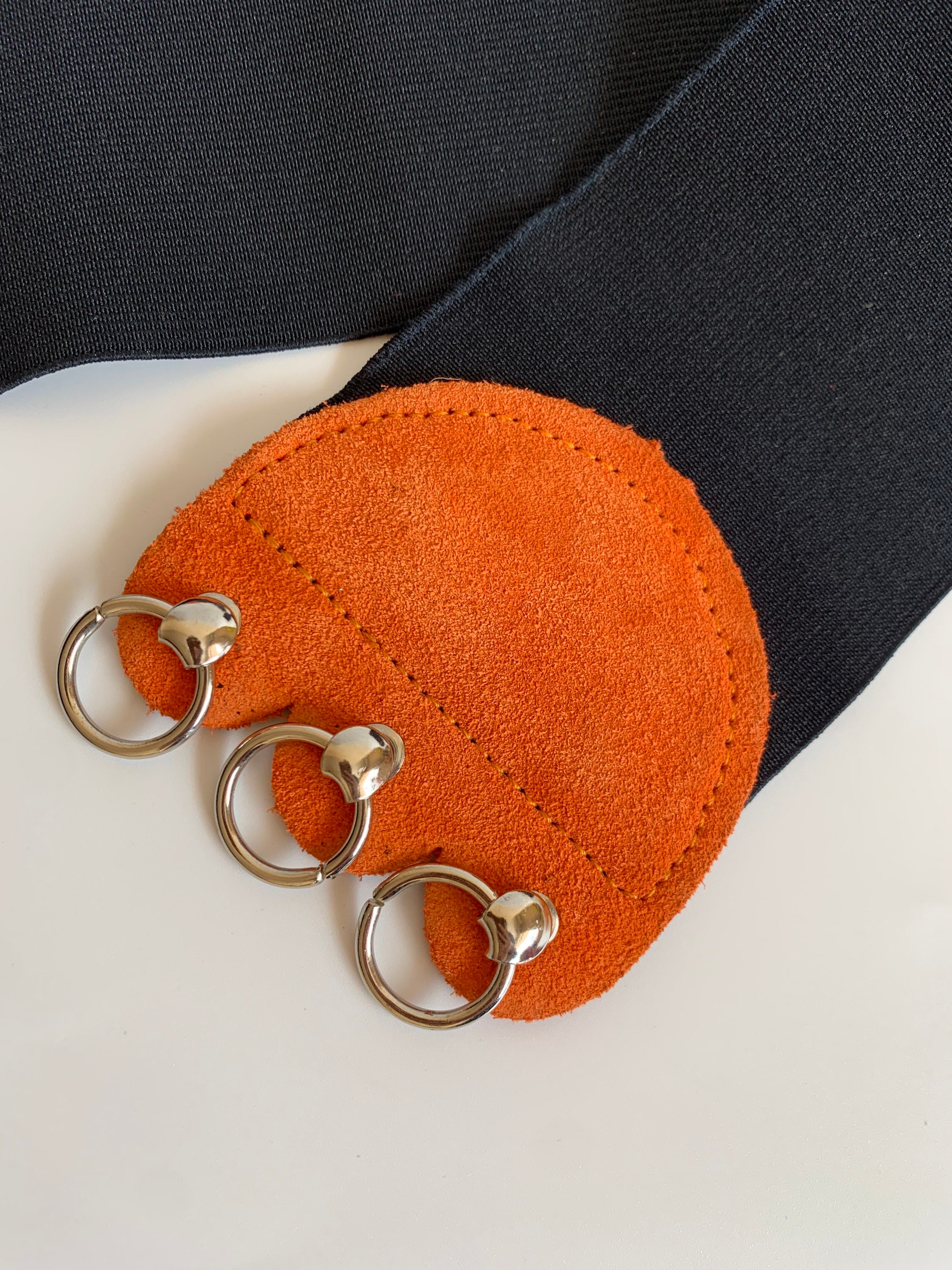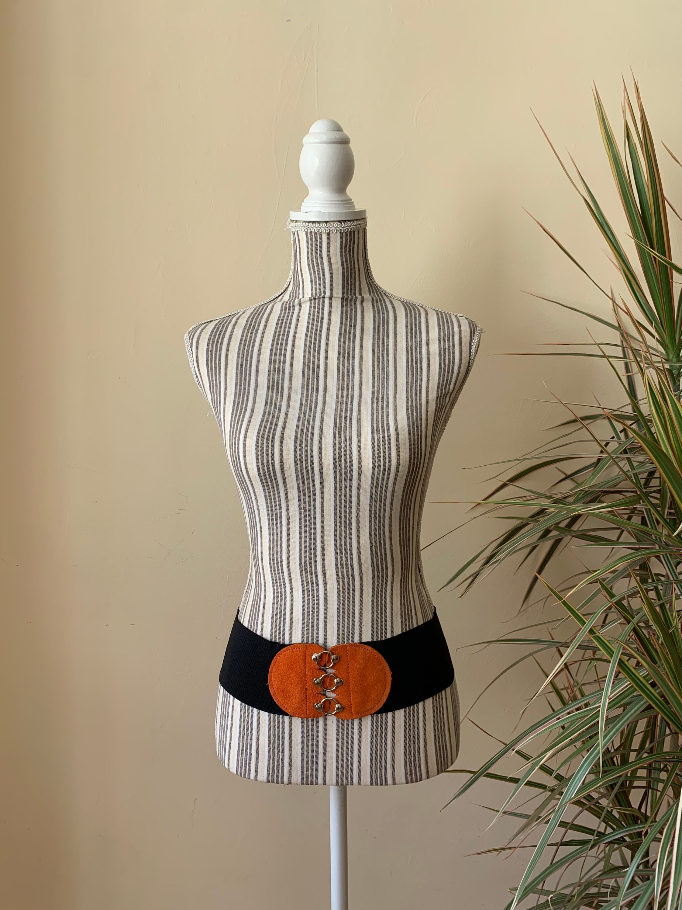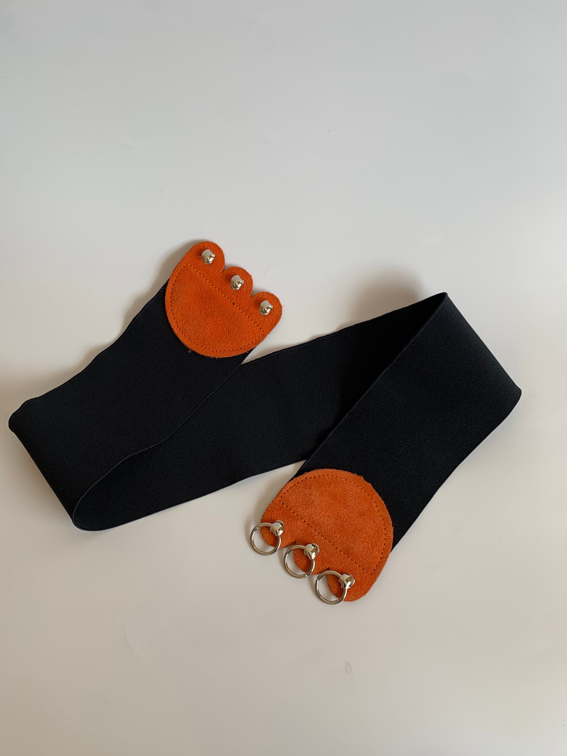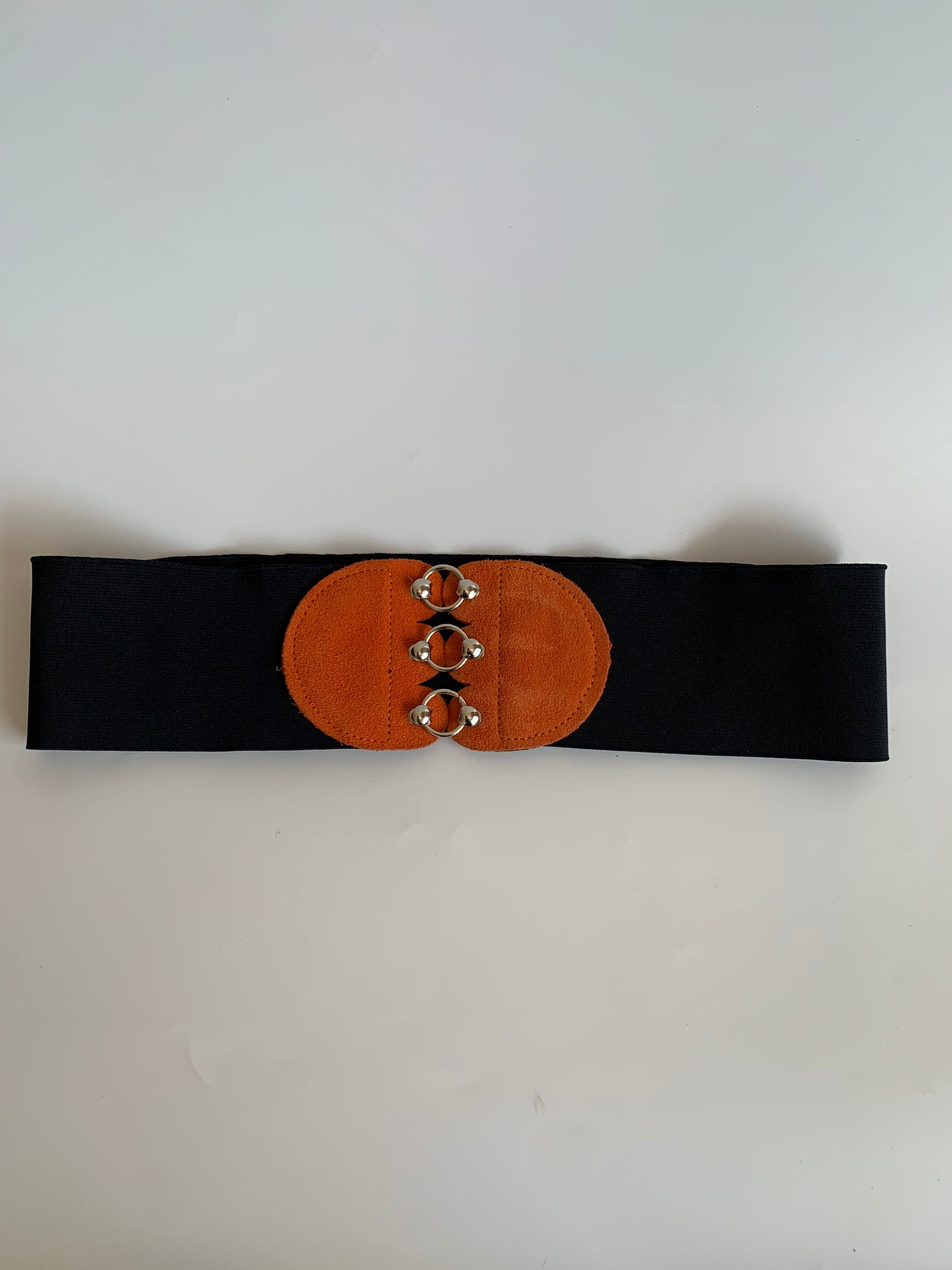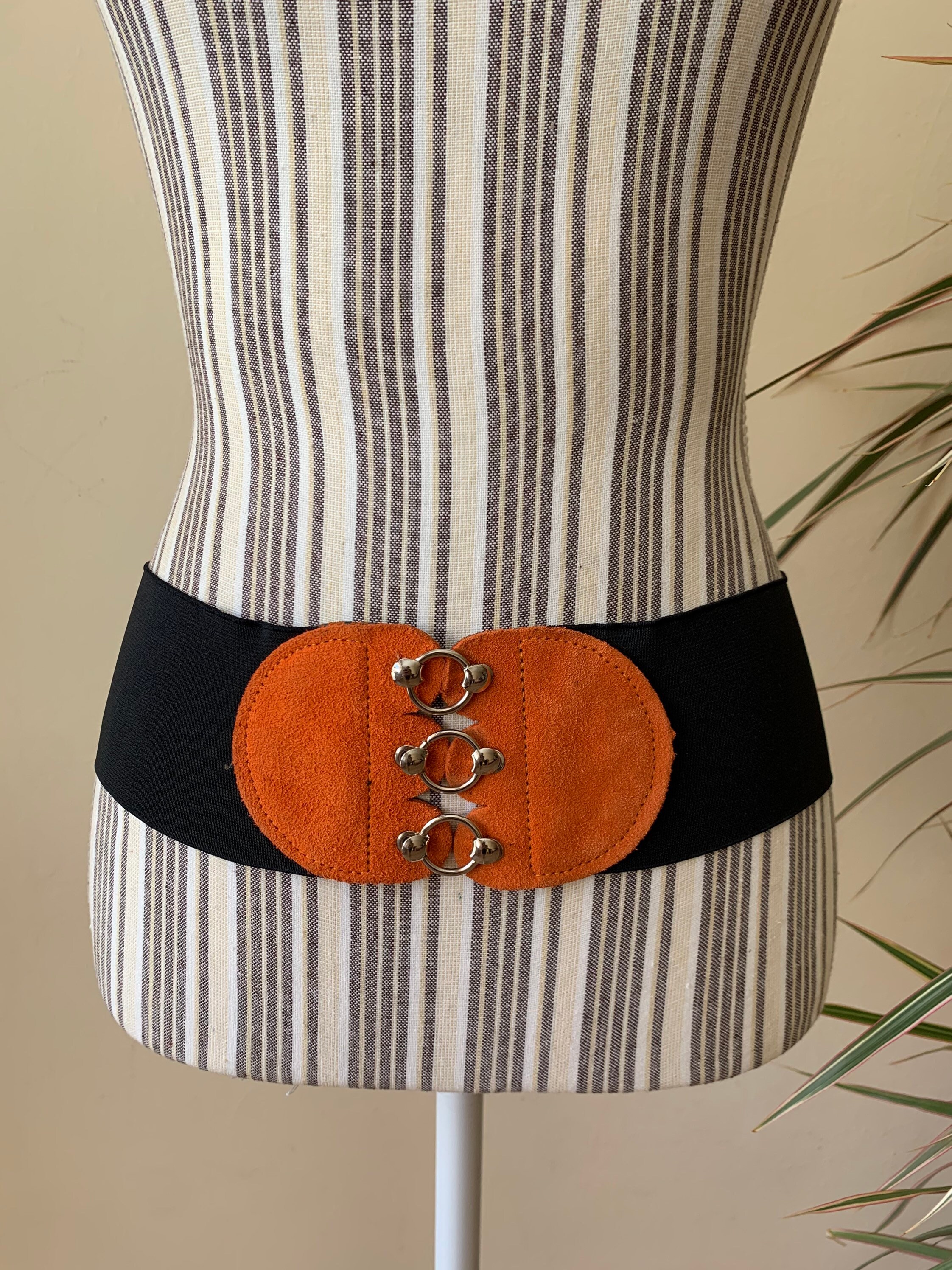 This is a black elastic belt for women with silver tone metal interlocking clasp and suede leather accents in bright orange color. There is no size marked on this stretch belt, it fits like S/ M. Please check the measurements below