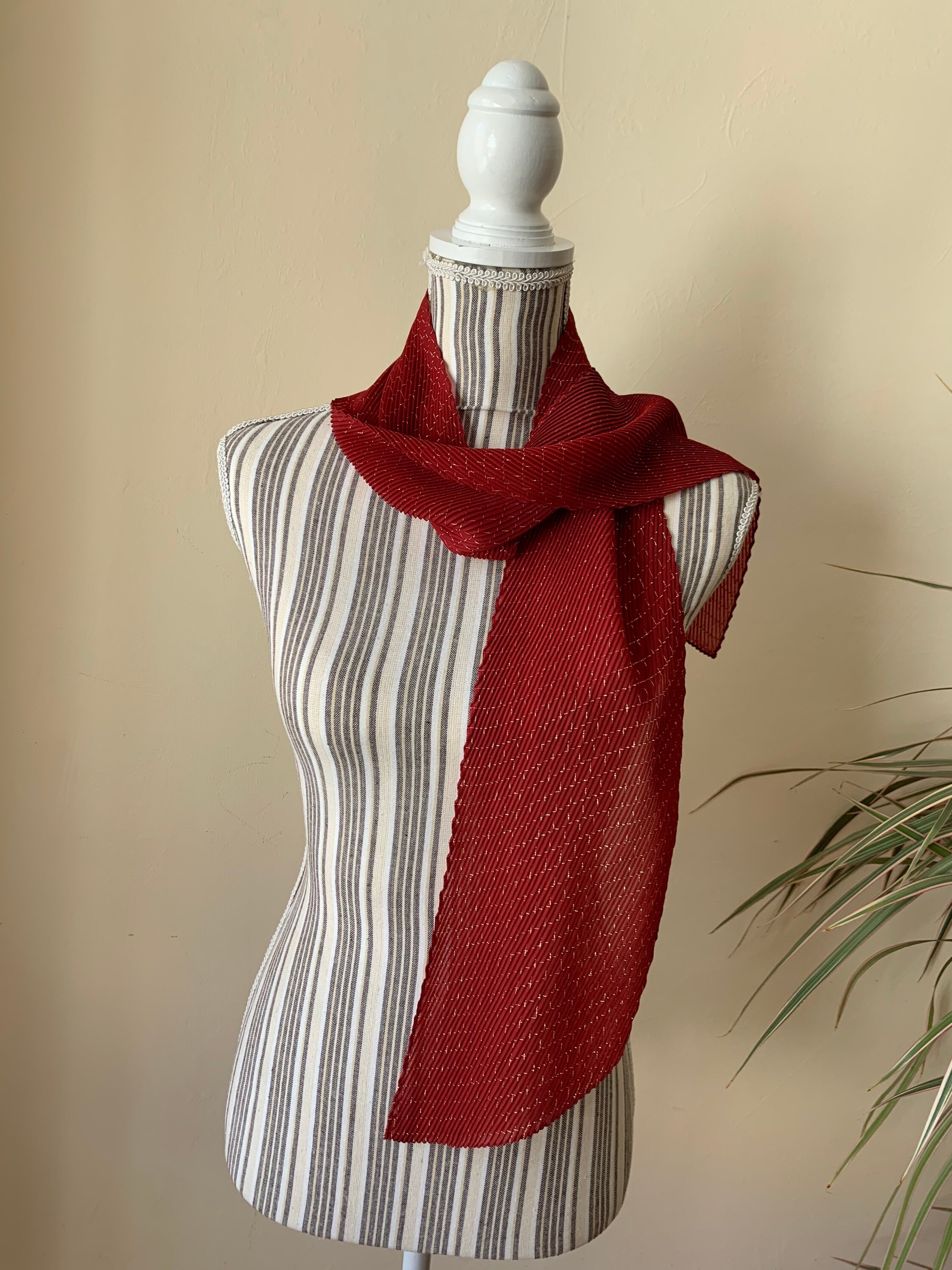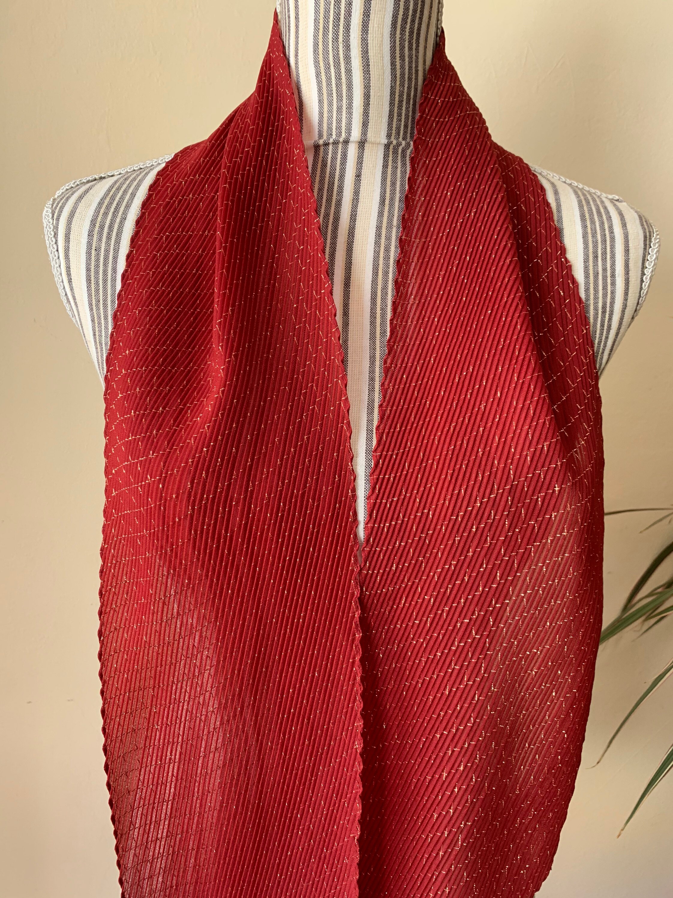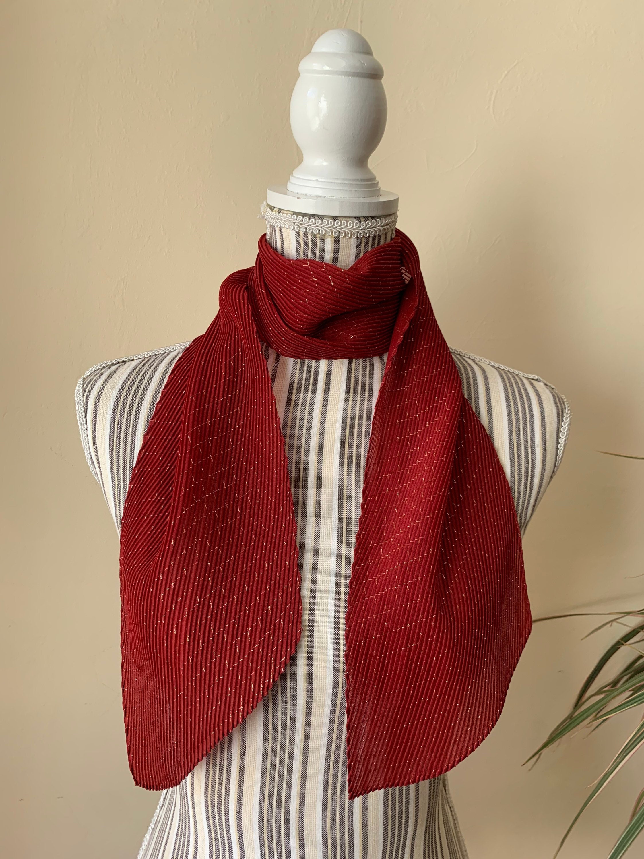 This is a vintage 80s Italian plisse scarf made of thin red polyester fabric and gold lame fibers which beautifully reflect the light. The fabric is 95% polyester and 5% lame. This retro pleated scarf is so versatile and can be worn in so many different ways. You can wear it around your neck, wear it as a head scarf or as a handbag scarf. This pretty accordion scarf was made in Italy. Wonderful vintage accessory that will make even the simplest outfit pop.