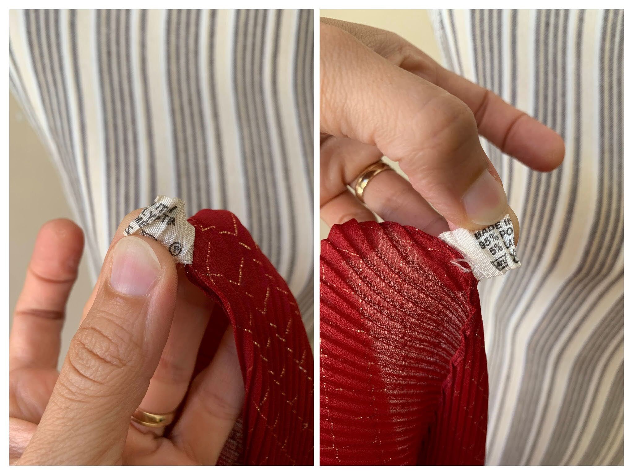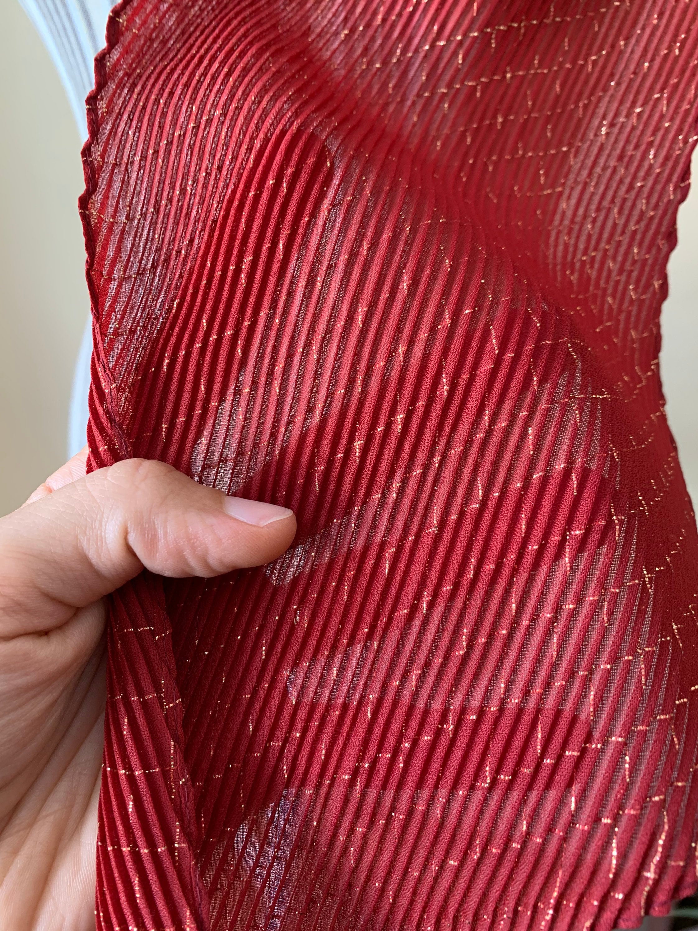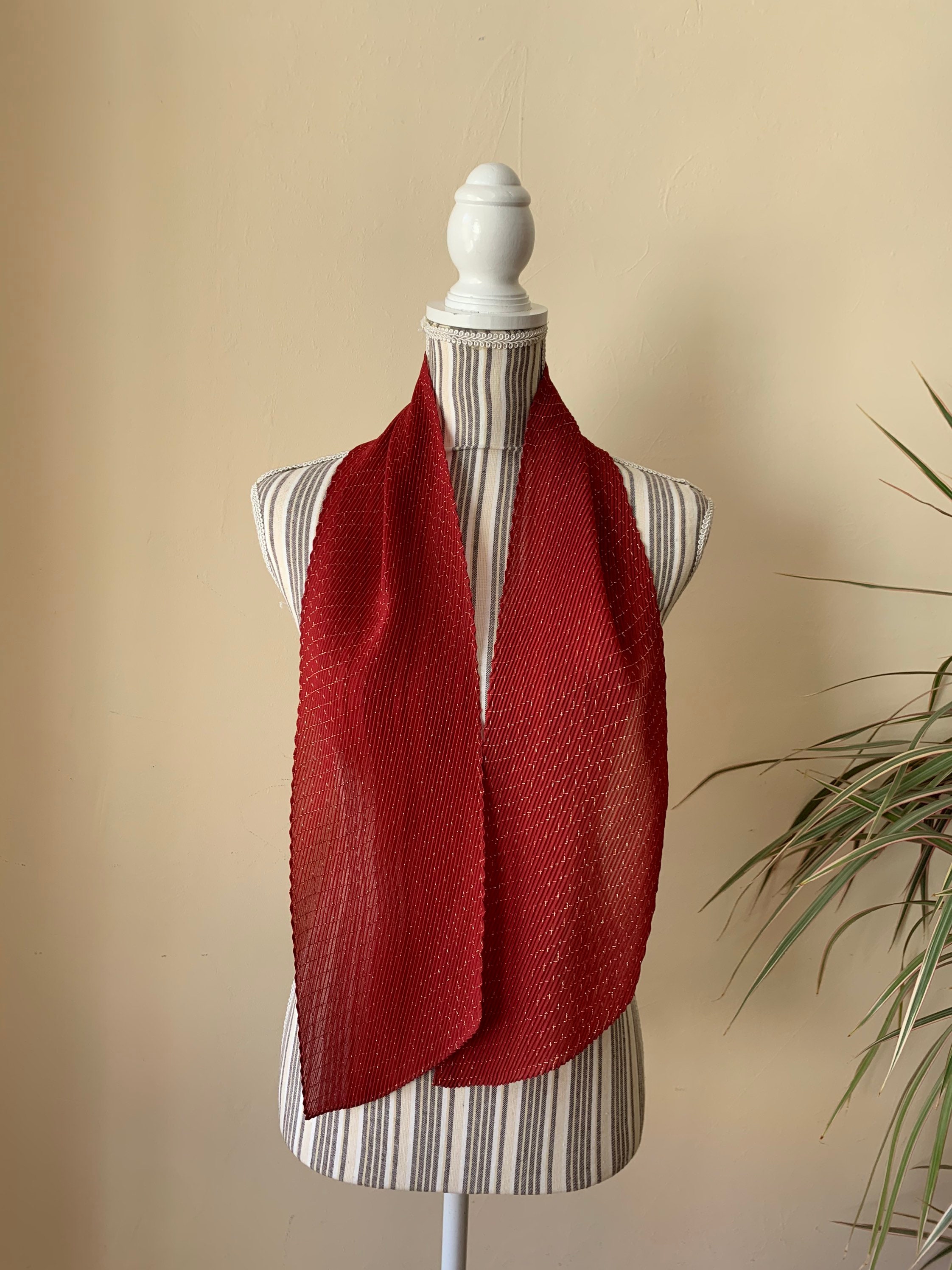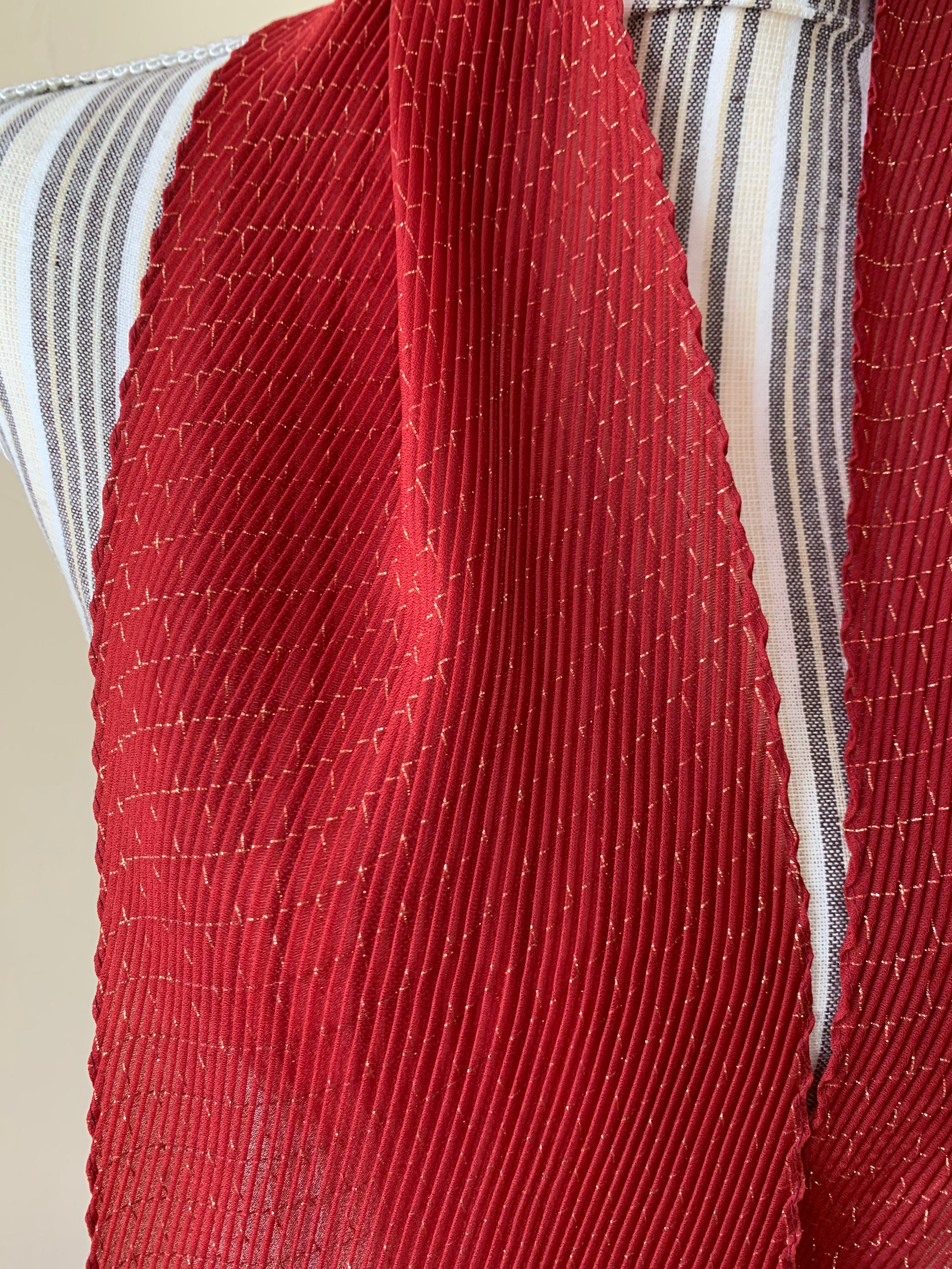 This is a vintage 80s Italian plisse scarf made of thin red polyester fabric and gold lame fibers which beautifully reflect the light. The fabric is 95% polyester and 5% lame. This retro pleated scarf is so versatile and can be worn in so many different ways. You can wear it around your neck, wear it as a head scarf or as a handbag scarf. This pretty accordion scarf was made in Italy. Wonderful vintage accessory that will make even the simplest outfit pop.