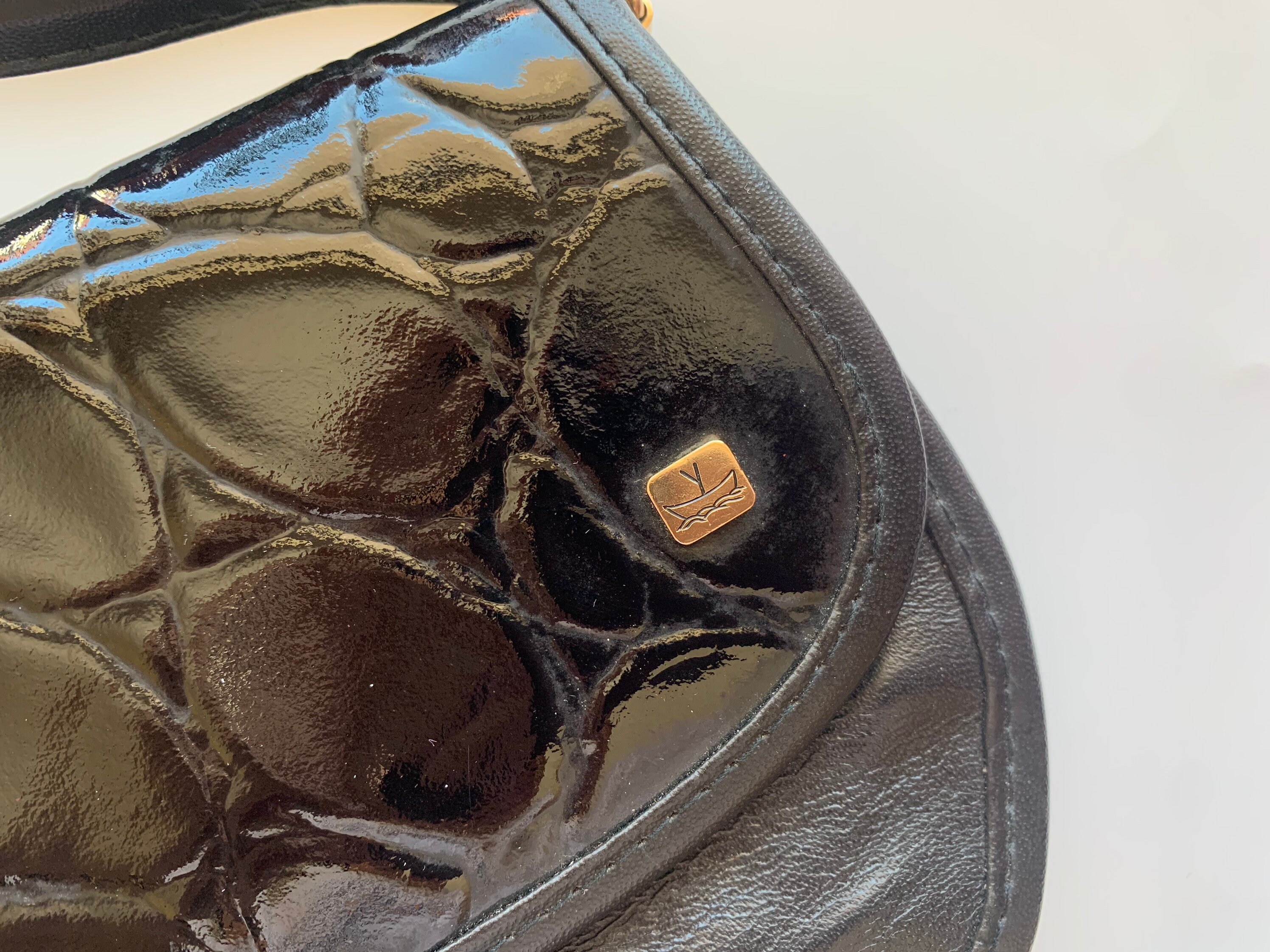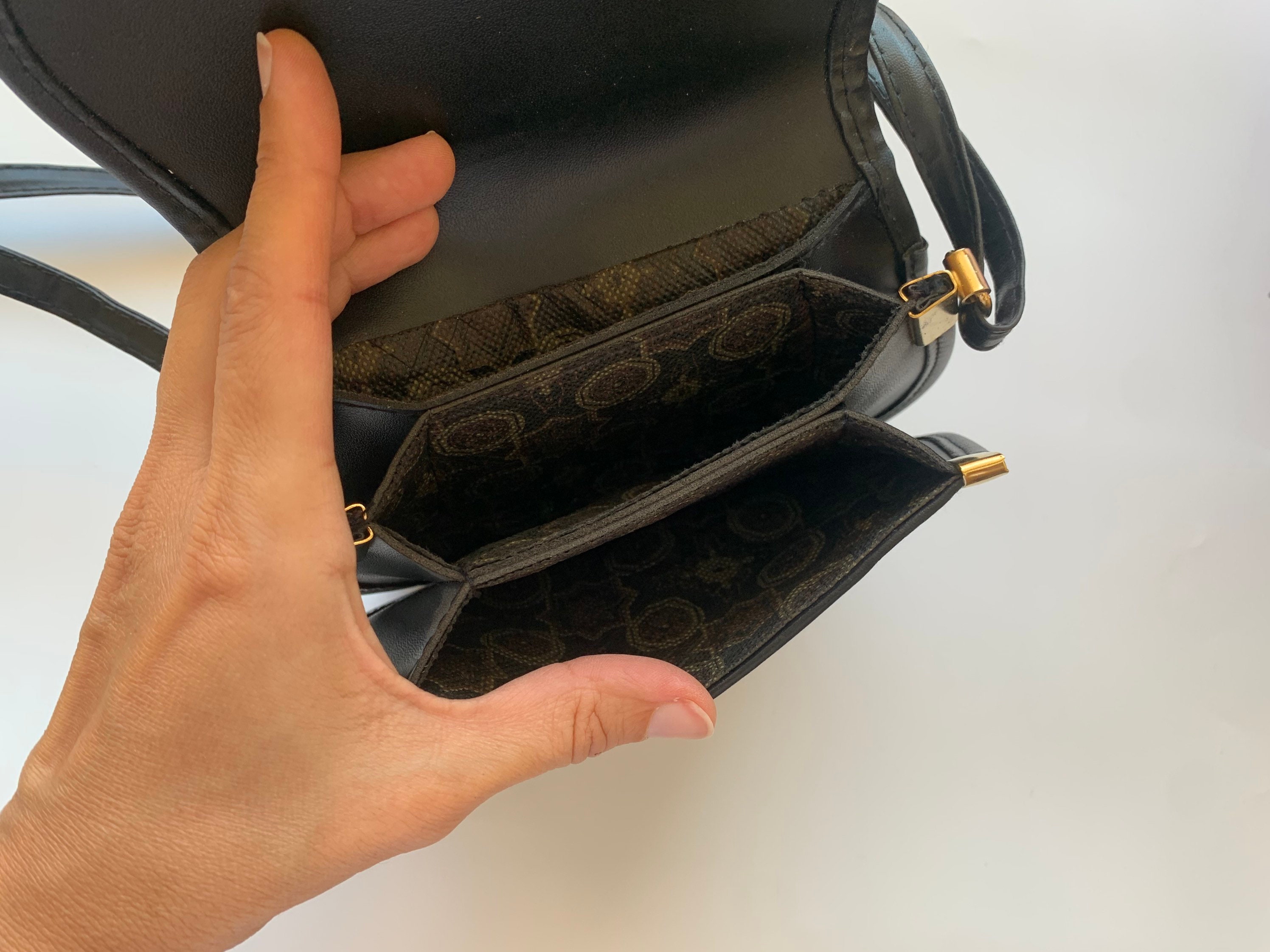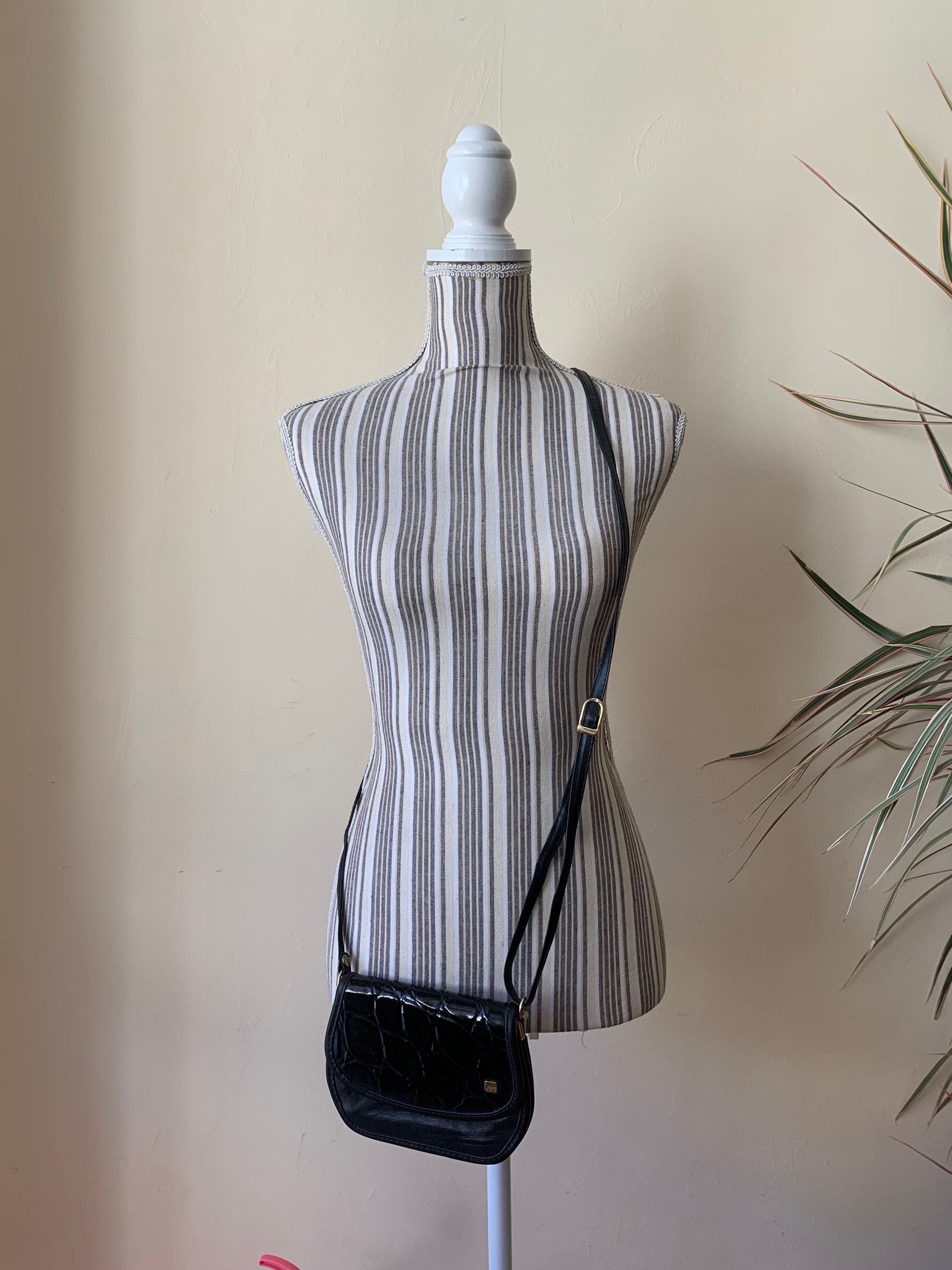 Magnetic closure, three compartments. This is small black crossbody bag for women from the 80s. Thisvintage shoulder purse is made of genuine leather in black color with patent leather reptile print detailing on the front. This leather cross over bag has a magnetic closure. The interior is lined in mosaic print fabric. This crossbody purse has three compartments and two small slip pockets in-between. Beautiful tiny crossbody purse that you can wear everyday.